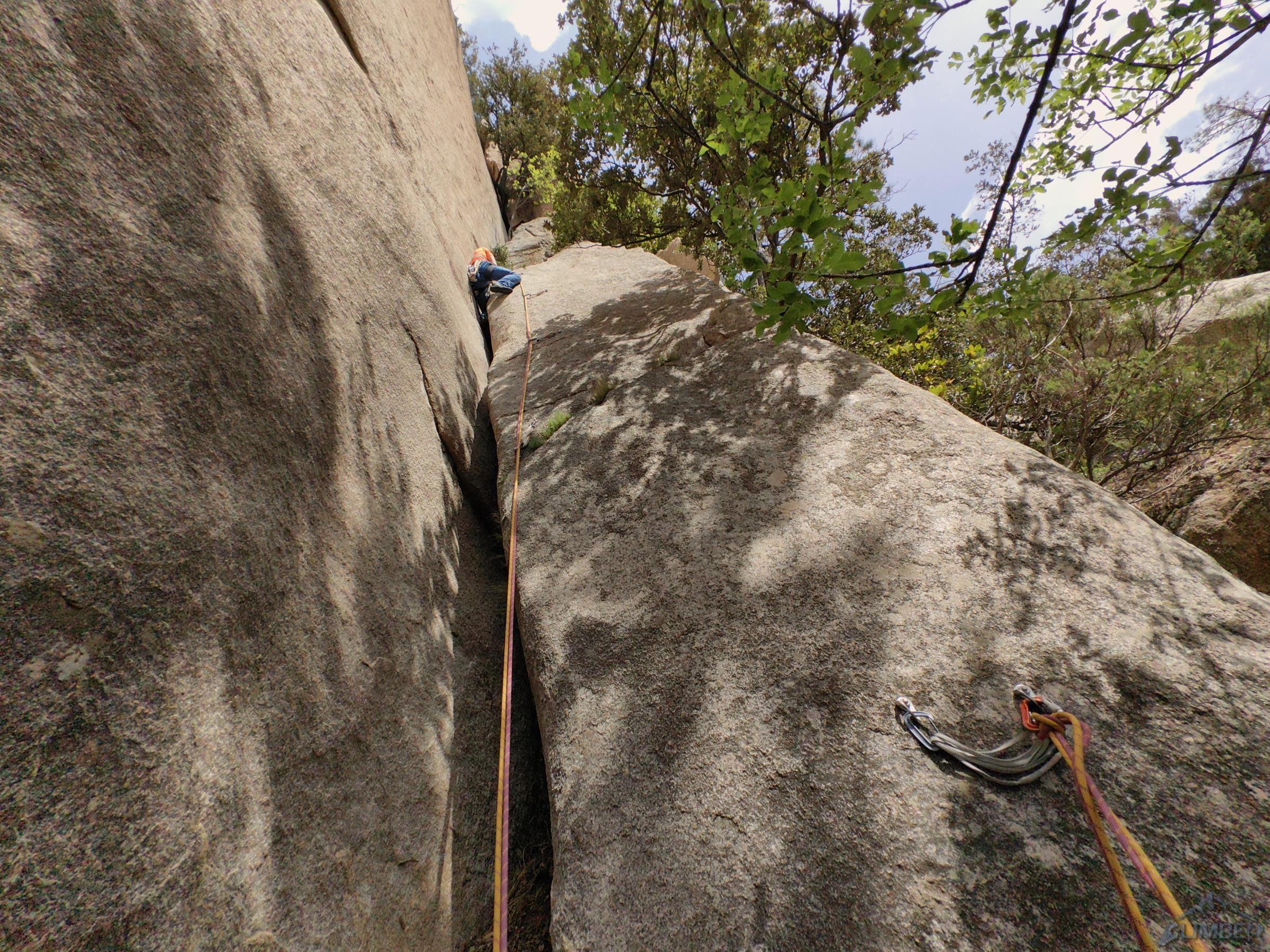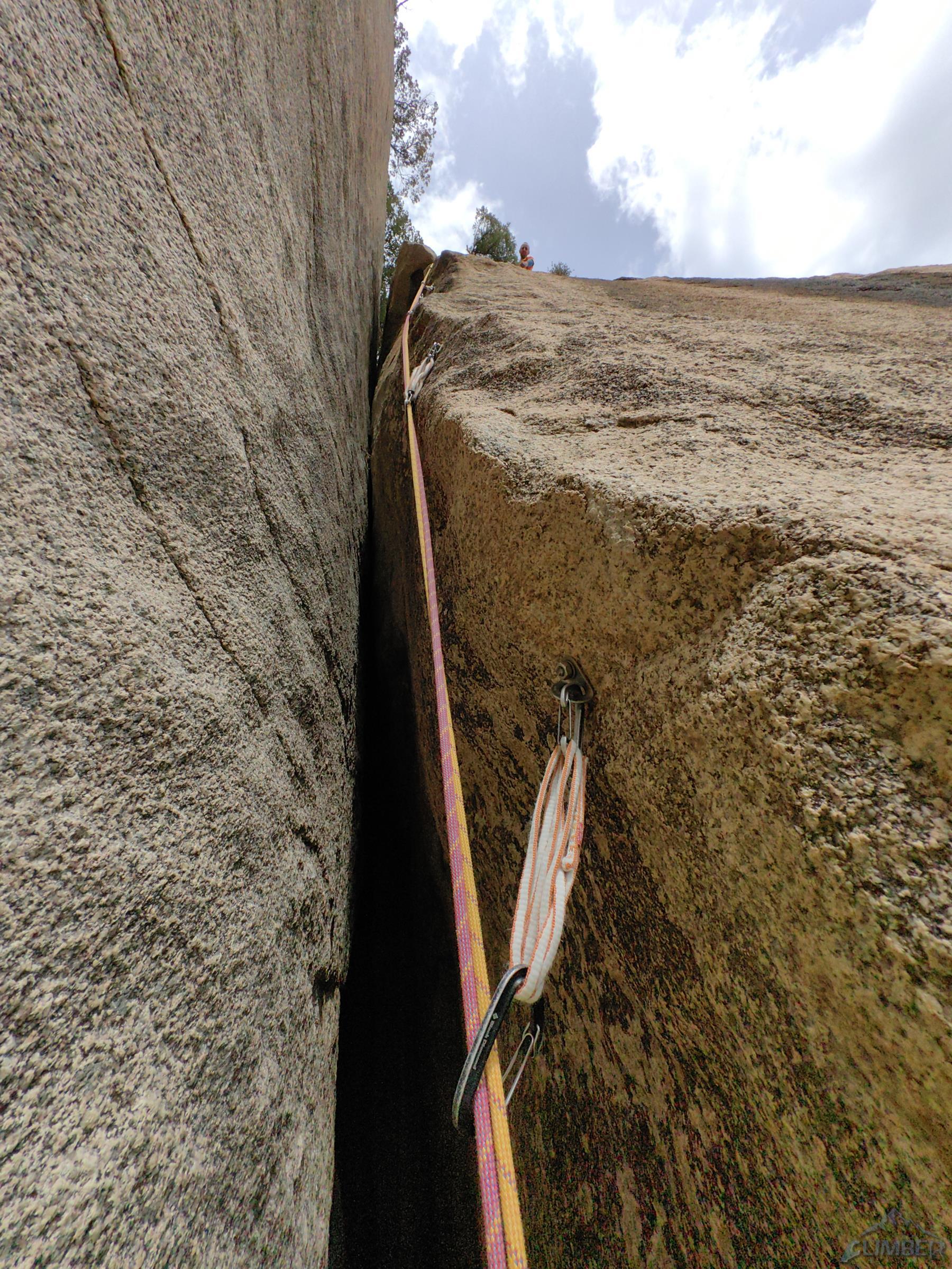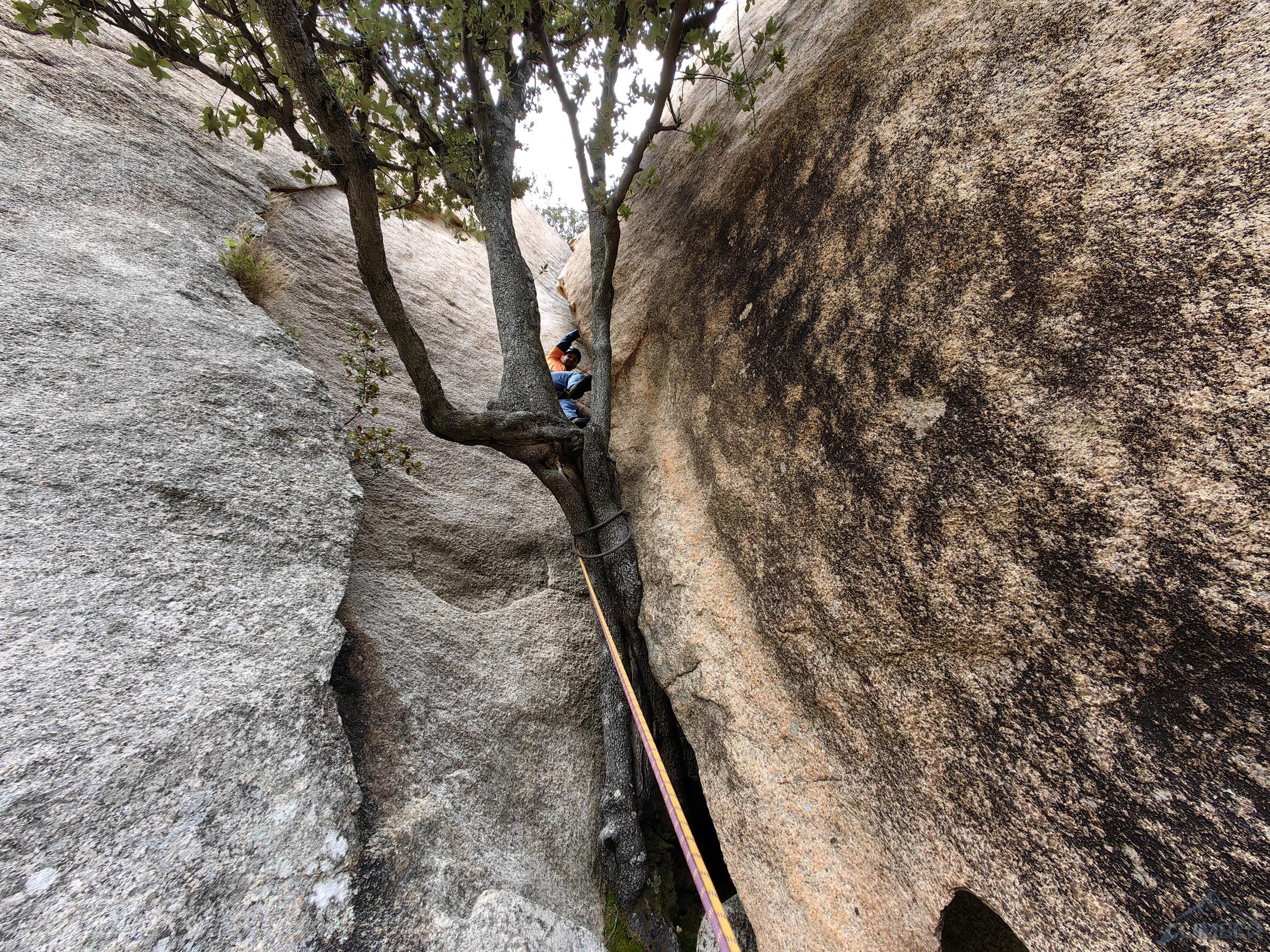 Pierwszy odcinek (6b+/6c) z dołu wygląda całkiem przystępnie, nie dajcie się jednak zwieść – jeżeli nie jesteście wprawieni w przerysach (u mnie z tym kiepsko) to czeka was mała bitwa (na dużą przyjdzie czas na kolejnym wyciągu). Gdy okazuje się, że główne trudności czekają tuż pod stanowiskiem i utykam udem w rysie, jestem zrozpaczony – w końcu jednak udaje się wyszarpać! Wyciąg szósty (6c/c+) zgodnie z relacjami jest jednak daniem głównym drogi i uczy pokory – po minięciu drzewka zaczyna się 20-metrowa walka o każdy centymetr w przerysie zmieniając się wyżej w przewieszony komin, w którym nie da się oszukać wspinaniem na zewnątrz i trzeba go żmudnie przeczołgać. Po 40-minutowym maglowaniu i kilku ciężkich chwilach udaje mi się dotrzeć do stanowiska klasycznie, na drugą próbę na pewno bym się nie zdecydował. Widząc jak poniewiera mnie ten wyciąg idący za nami zespół rezygnuje, możliwe że zrobilibyśmy to samo na ich miejscu 😊.