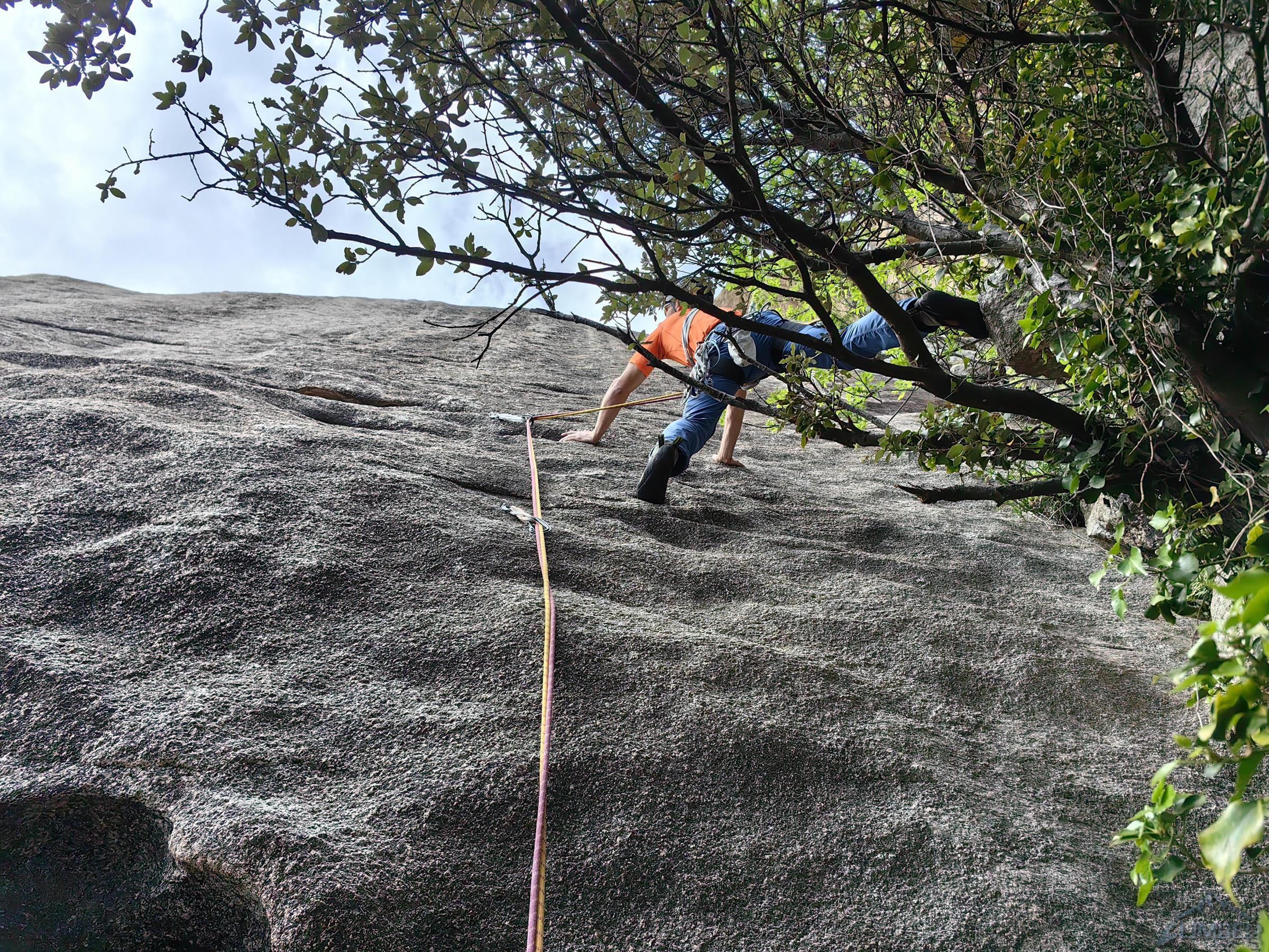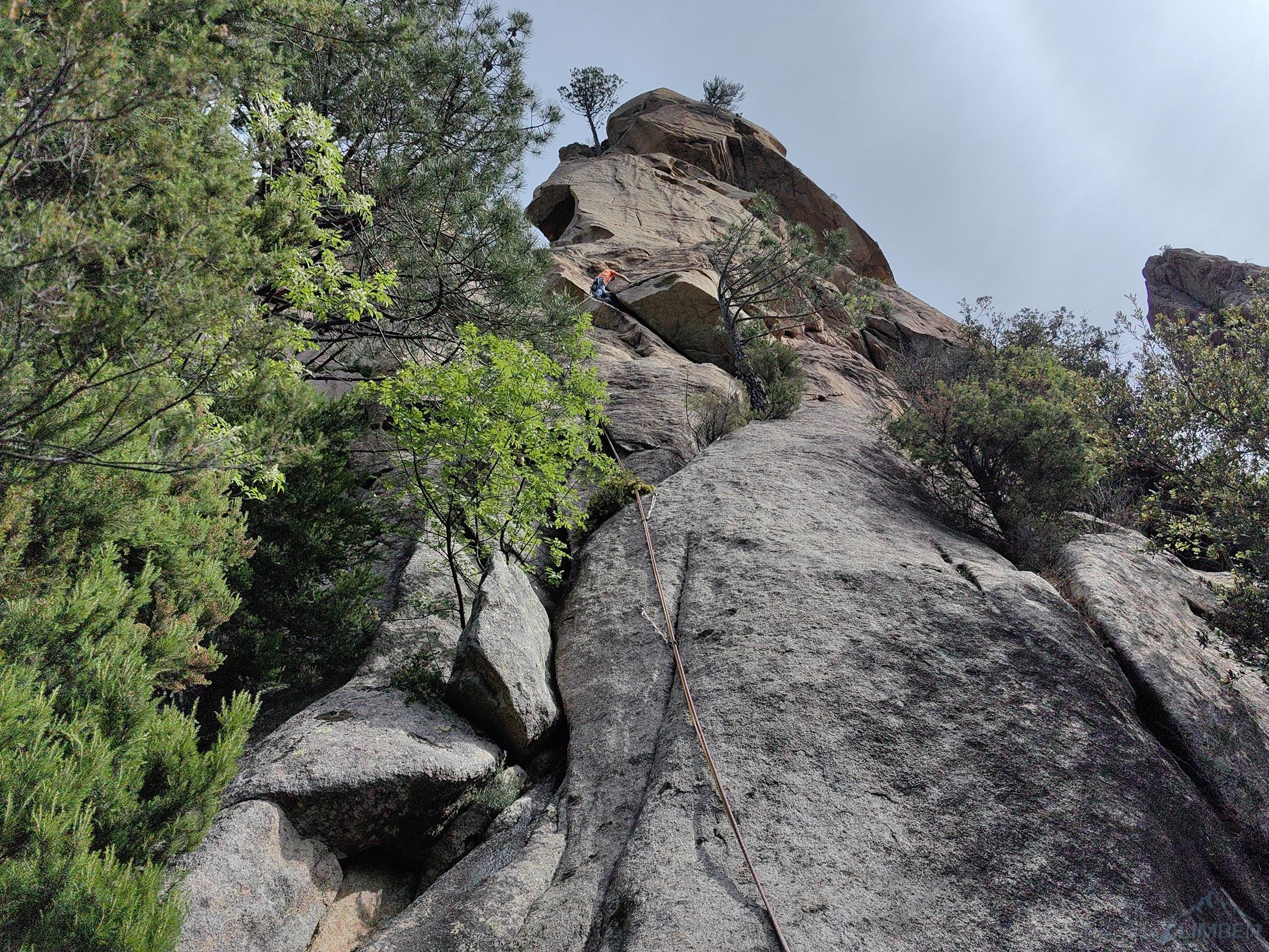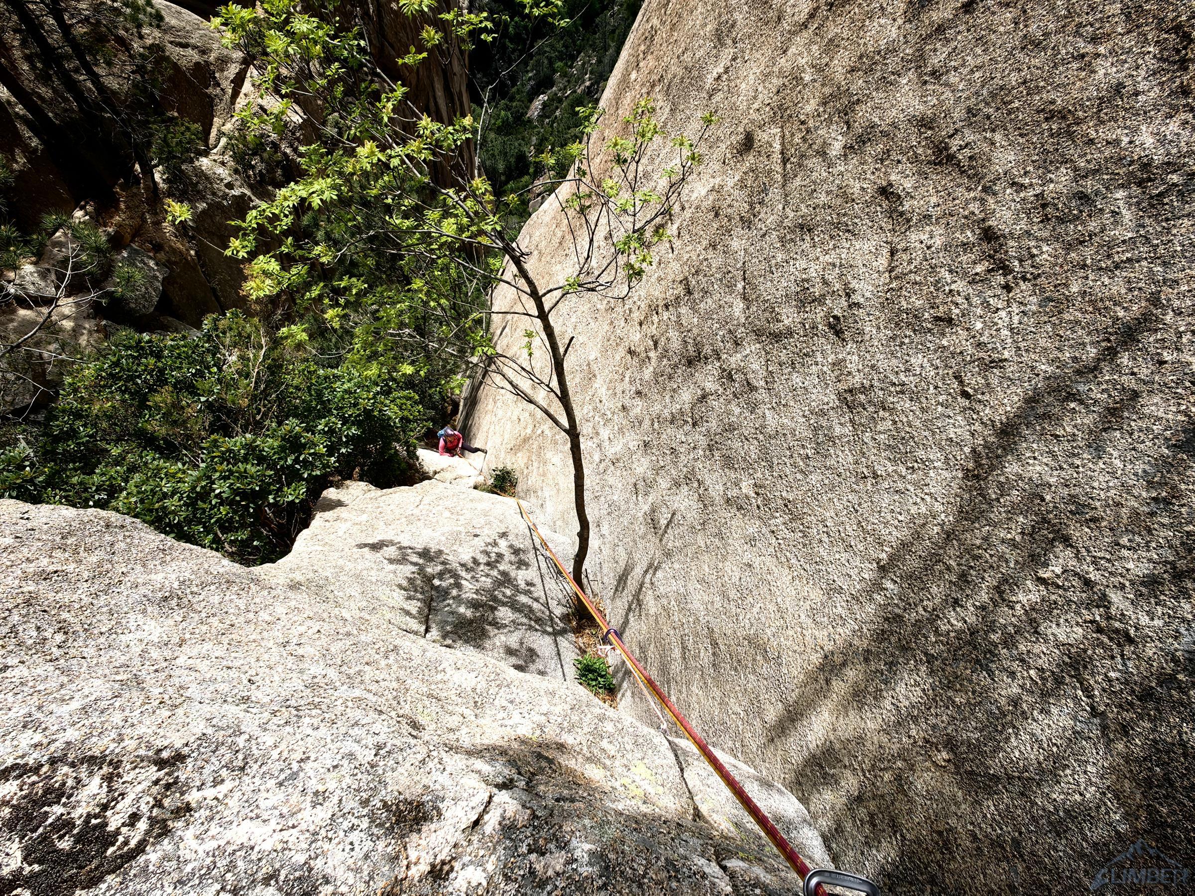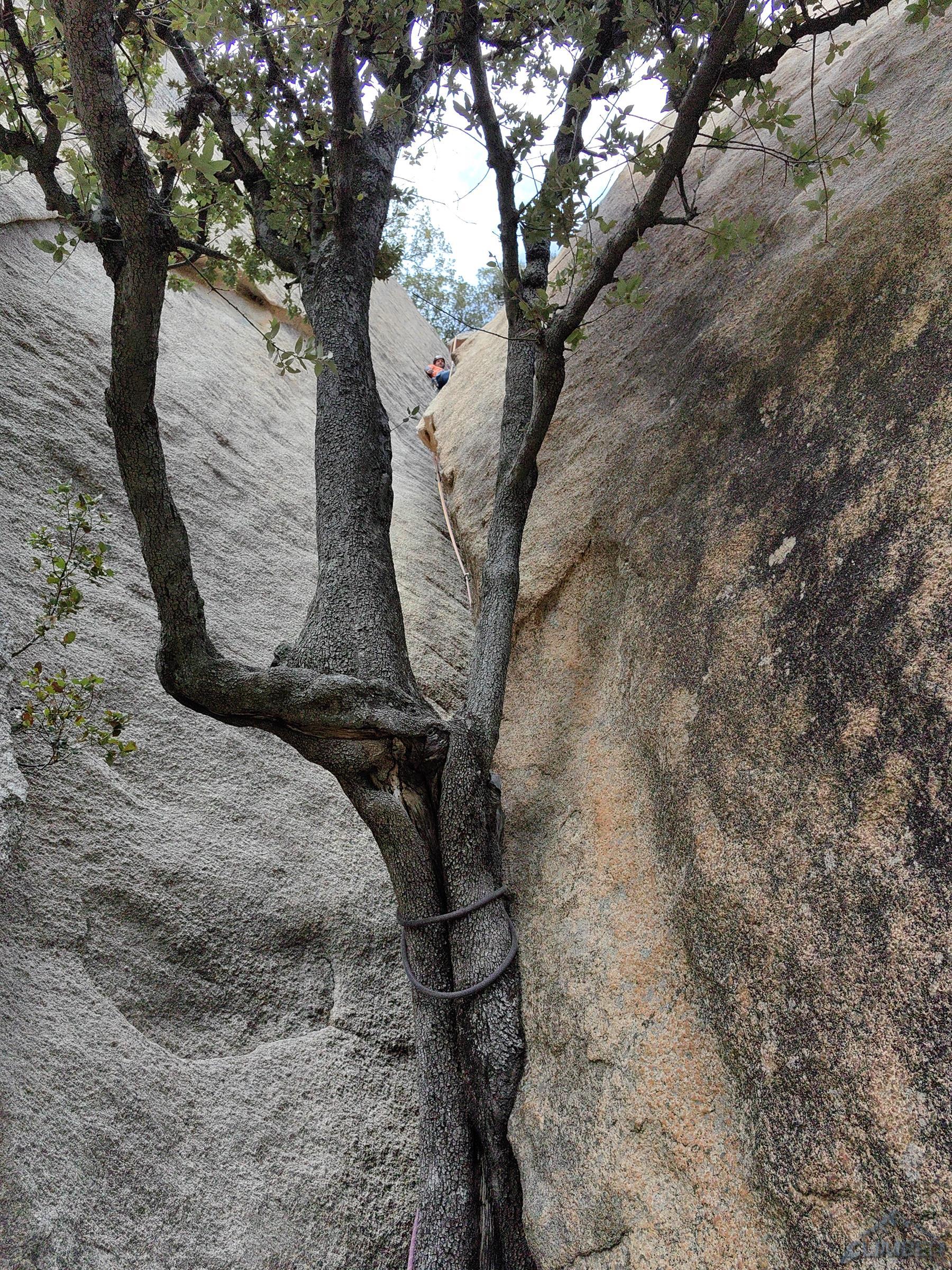 Pierwszy odcinek (6b+/6c) z dołu wygląda całkiem przystępnie, nie dajcie się jednak zwieść – jeżeli nie jesteście wprawieni w przerysach (u mnie z tym kiepsko) to czeka was mała bitwa (na dużą przyjdzie czas na kolejnym wyciągu). Gdy okazuje się, że główne trudności czekają tuż pod stanowiskiem i utykam udem w rysie, jestem zrozpaczony – w końcu jednak udaje się wyszarpać! Wyciąg szósty (6c/c+) zgodnie z relacjami jest jednak daniem głównym drogi i uczy pokory – po minięciu drzewka zaczyna się 20-metrowa walka o każdy centymetr w przerysie zmieniając się wyżej w przewieszony komin, w którym nie da się oszukać wspinaniem na zewnątrz i trzeba go żmudnie przeczołgać. Po 40-minutowym maglowaniu i kilku ciężkich chwilach udaje mi się dotrzeć do stanowiska klasycznie, na drugą próbę na pewno bym się nie zdecydował. Widząc jak poniewiera mnie ten wyciąg idący za nami zespół rezygnuje, możliwe że zrobilibyśmy to samo na ich miejscu 😊.