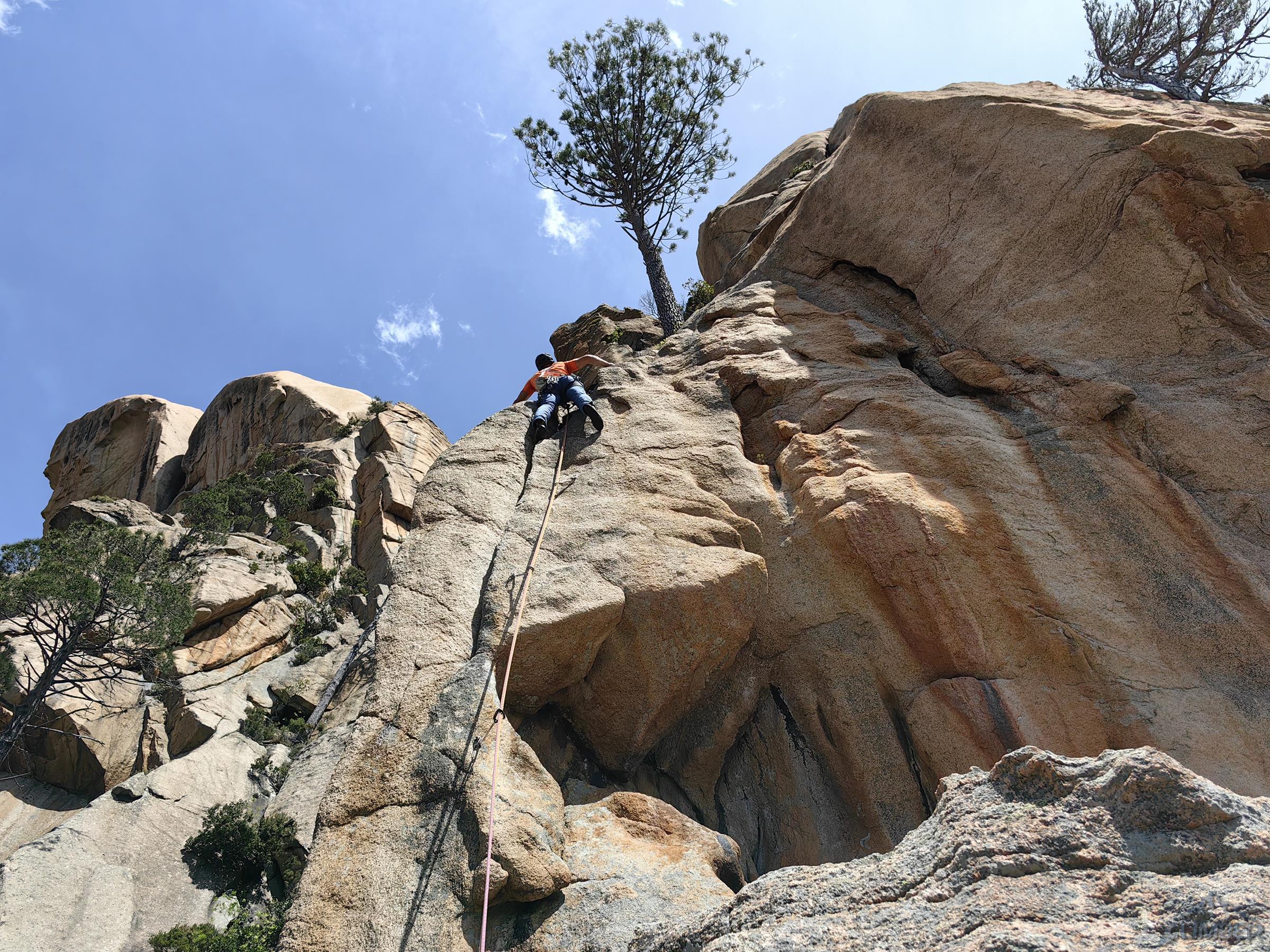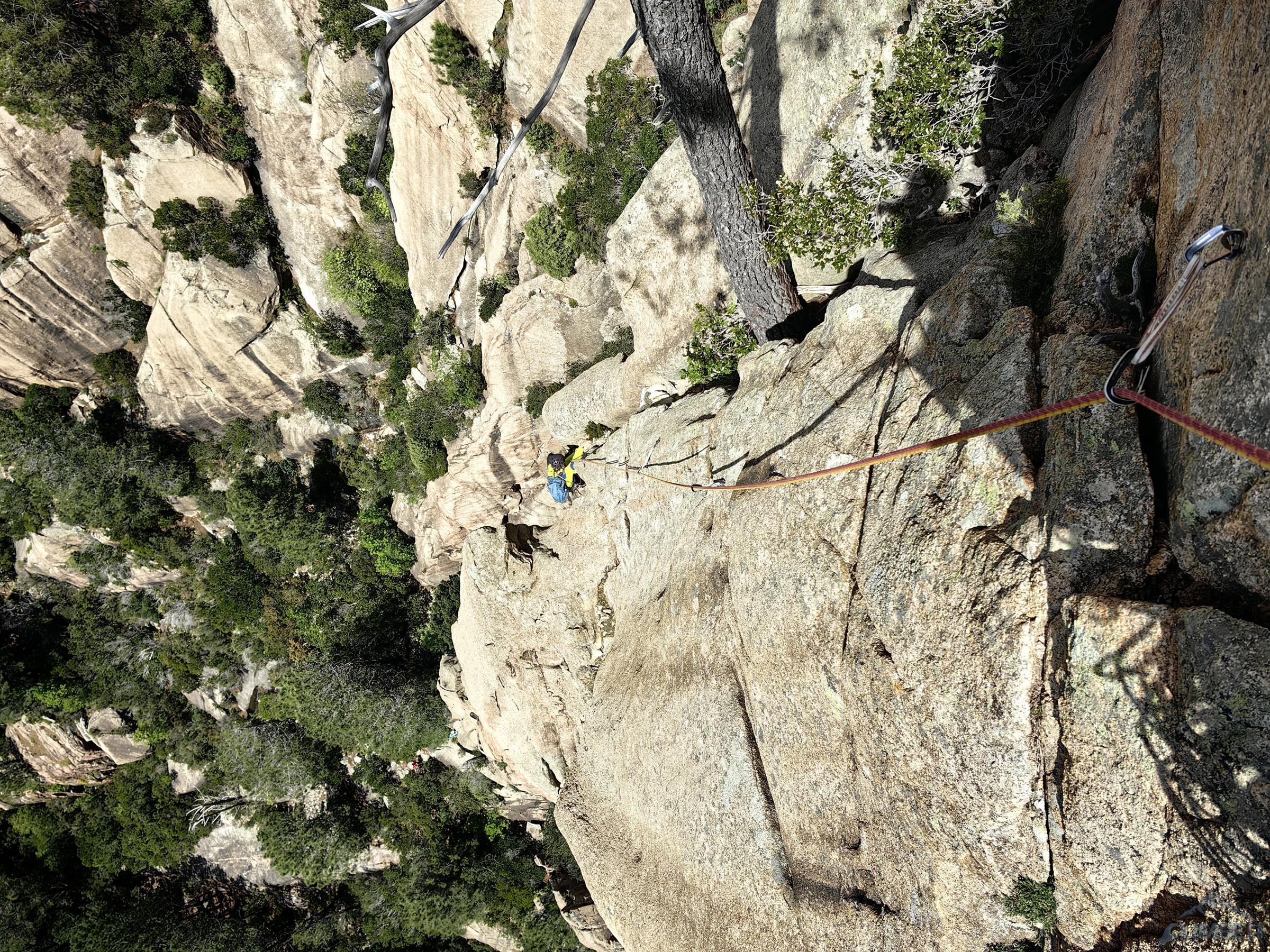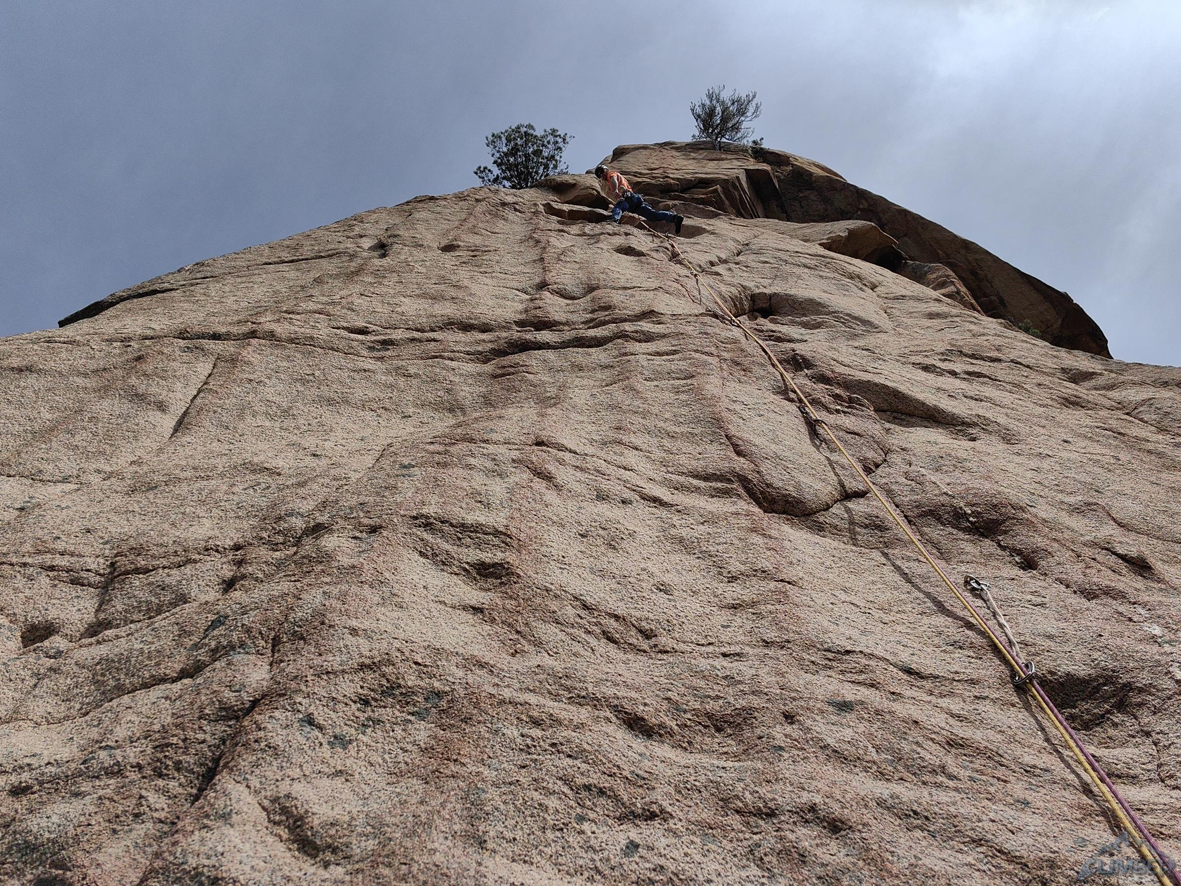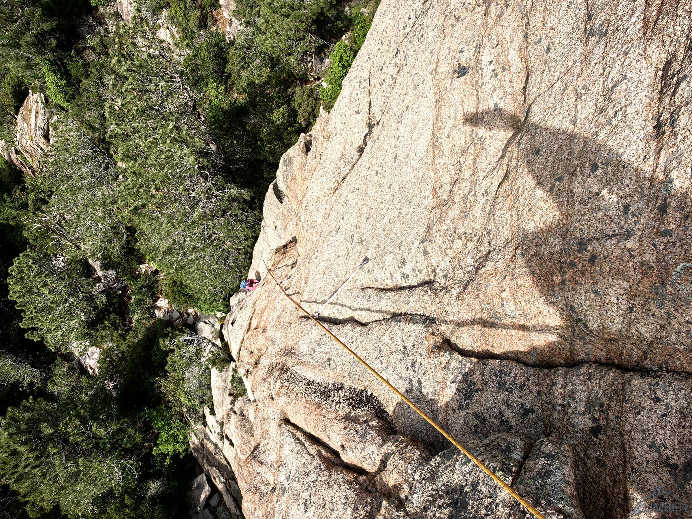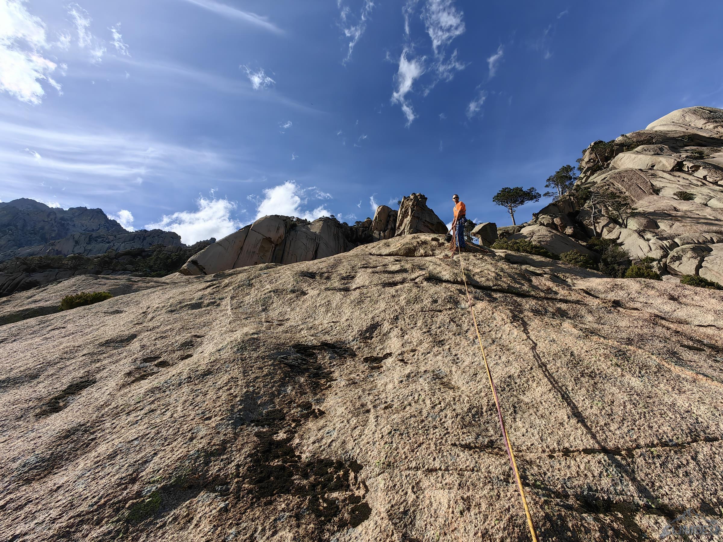 Na szczęście płyta na kolejnym wyciągu mimo rzadkiego obicia jest już dużo lepiej urzeźbiona i mniej stroma (6a), a odcinek ostatni to deserek z bulderkiem na starcie (6a) i miłym połogiem doprowadzającym do zwieńczenia filara. Stąd jeżeli ktoś ma ochotę można iść dalej szeroką granią na szczyt ok. 150 metrów (5c trad), w tym przypadku trzeba zabrać jednak buty i wszystkie rzeczy bo wylądujemy w kompletnie innym miejscu. Oryginalna opcja to zjazd wzdłuż linii drogi i ją też wybieramy – idzie sprawnie i po godzinie meldujemy się pod ścianą. Cel osiągnięty, sponiewierało mnie tak jak chciałem 😊, a przede wszystkim świetnie się powspinaliśmy!