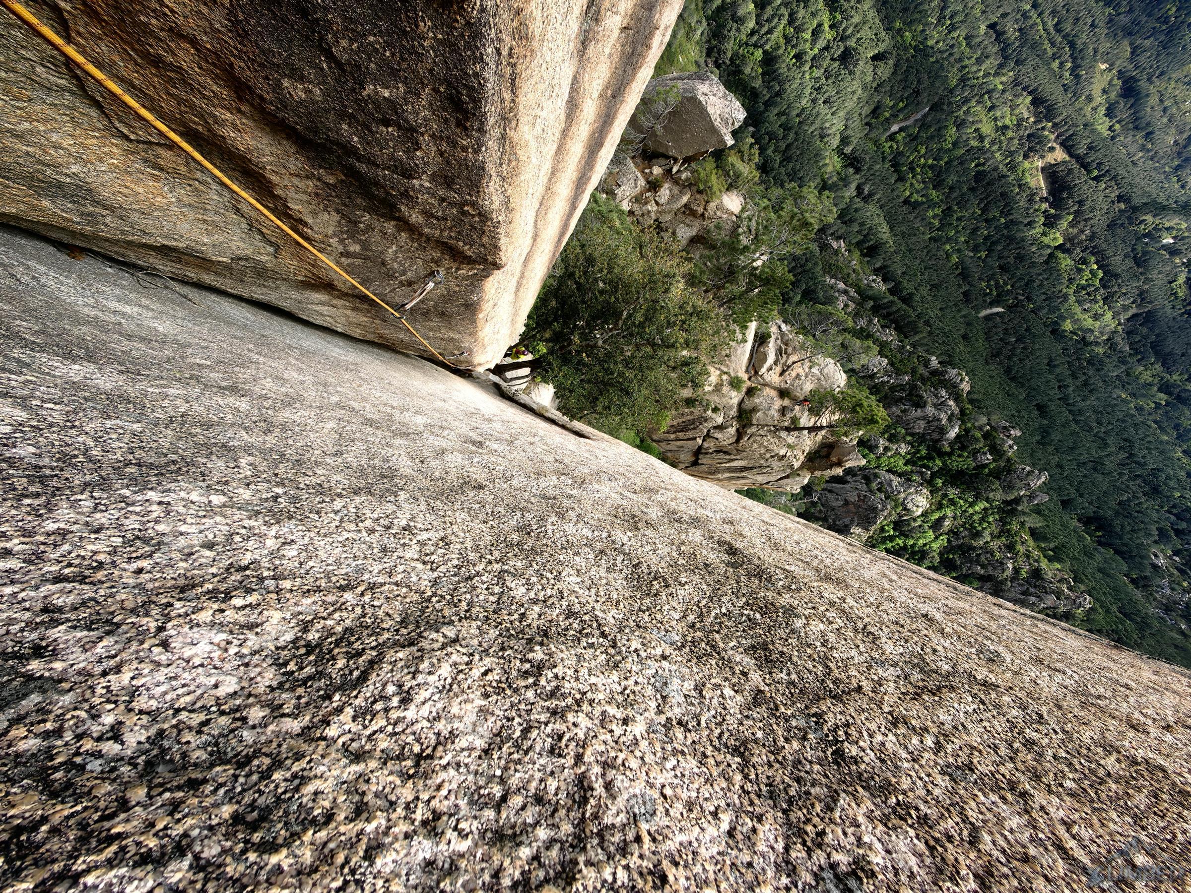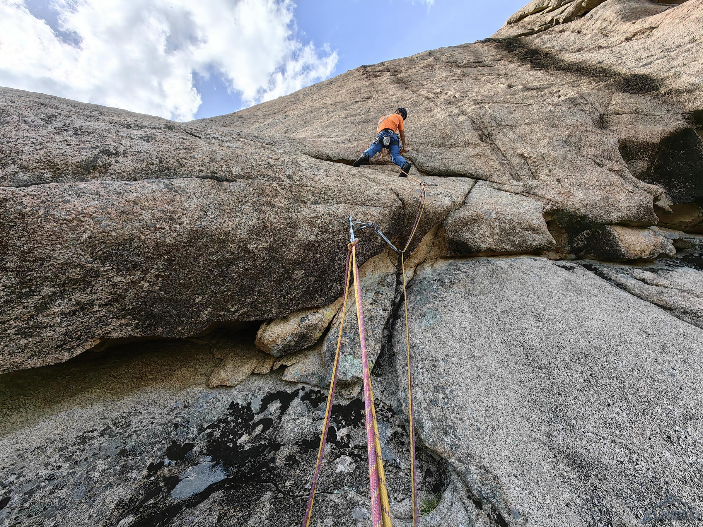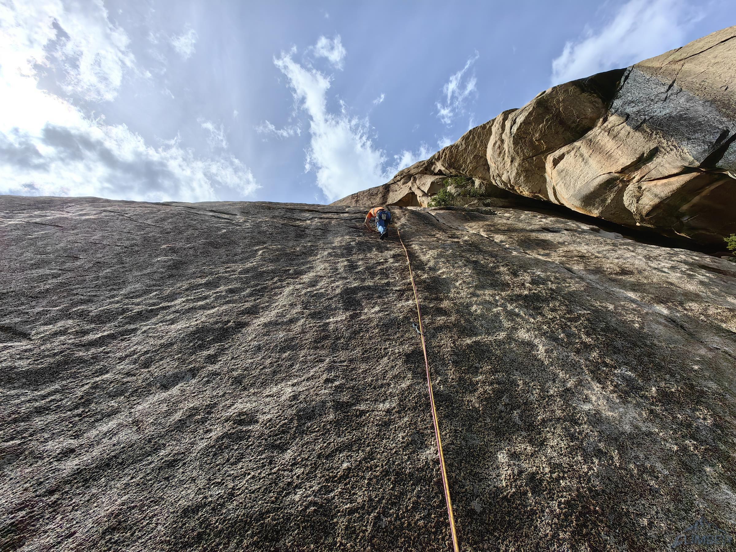 Pierwszy wyciąg to dobra rozgrzewka (6a), stroma płyta pocięta różnej szerokości rysami w kapitalnej jakości granicie – taki zresztą będzie towarzyszył nam do końca! Kluczowy odcinek to marzenie dla miłośników pionu z małymi chwytami – po pierwszych metrach (ok. 6b) czeka kluczowa sekwencja (gęsto obite 7a), gdzie nie zauważam ważnej krawądki. Druga próba jest już skuteczna i po wyjściu z trudności pozostaje łatwiej już przewinąć się przez dużego tafonisa do stanowiska. Trzeci odcinek zaczyna się pięknym dilferkiem w pionowej rysie (6b+) po którym kontynuujemy przyjemnym skośnym trawersem w prawo do stanowiska. Ostatni wyciąg w dolnej części to zaskakująco przystępna jak na 6c przerysa i ładna płytka powyżej. Dalej przyjemności się już kończą i czeka egzamin ze wspinania rysowego i płytowego. Najpierw jednak trzeba przewinąć się za grańkę i zejść w dół ok. 50 metrów do podstawy górnej części ściany.
