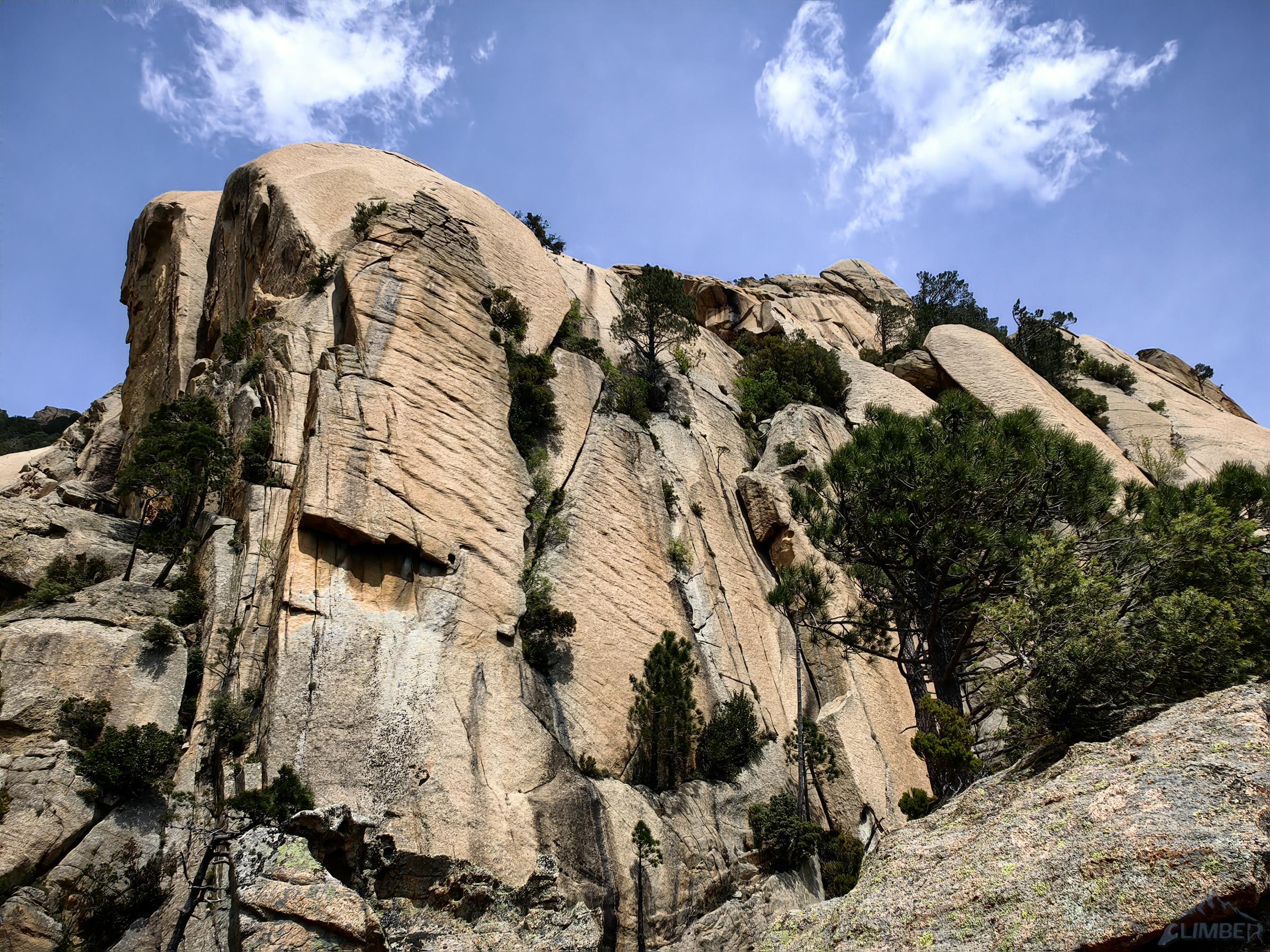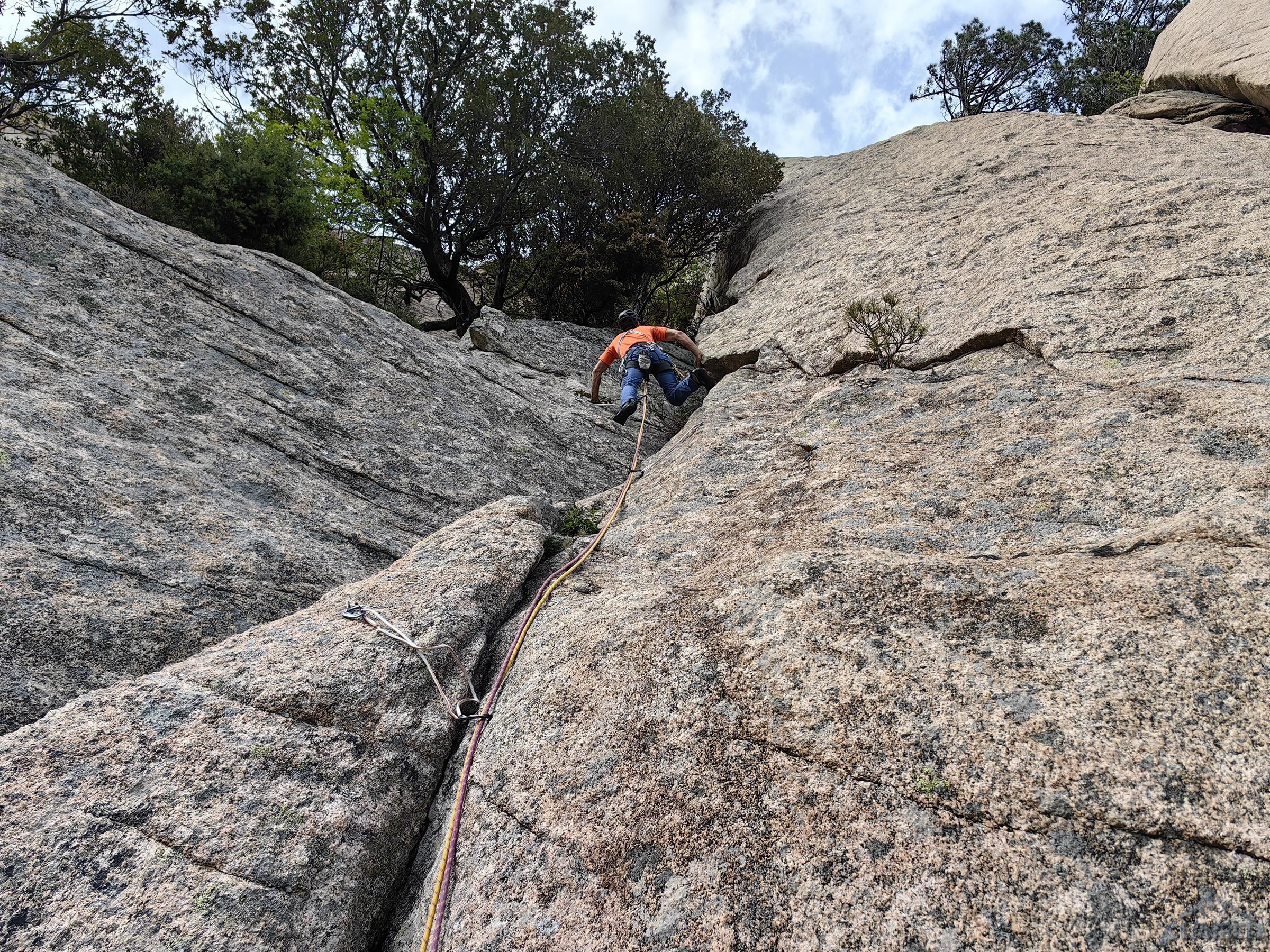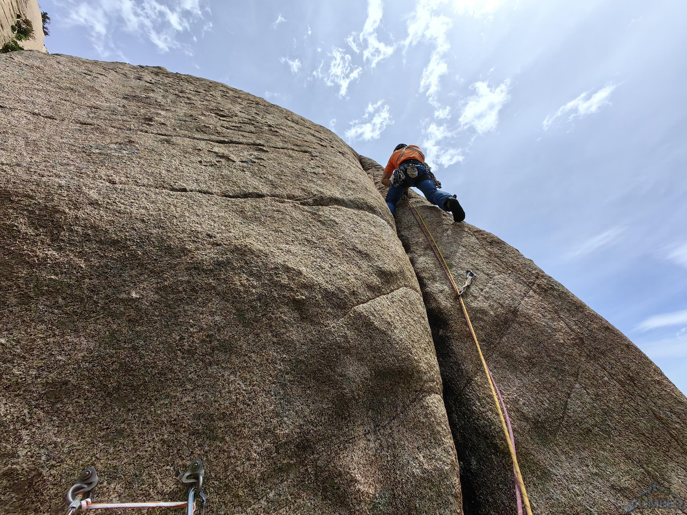 Pierwszy wyciąg to dobra rozgrzewka (6a), stroma płyta pocięta różnej szerokości rysami w kapitalnej jakości granicie – taki zresztą będzie towarzyszył nam do końca! Kluczowy odcinek to marzenie dla miłośników pionu z małymi chwytami – po pierwszych metrach (ok. 6b) czeka kluczowa sekwencja (gęsto obite 7a), gdzie nie zauważam ważnej krawądki. Druga próba jest już skuteczna i po wyjściu z trudności pozostaje łatwiej już przewinąć się przez dużego tafonisa do stanowiska. Trzeci odcinek zaczyna się pięknym dilferkiem w pionowej rysie (6b+) po którym kontynuujemy przyjemnym skośnym trawersem w prawo do stanowiska. Ostatni wyciąg w dolnej części to zaskakująco przystępna jak na 6c przerysa i ładna płytka powyżej. Dalej przyjemności się już kończą i czeka egzamin ze wspinania rysowego i płytowego. Najpierw jednak trzeba przewinąć się za grańkę i zejść w dół ok. 50 metrów do podstawy górnej części ściany.