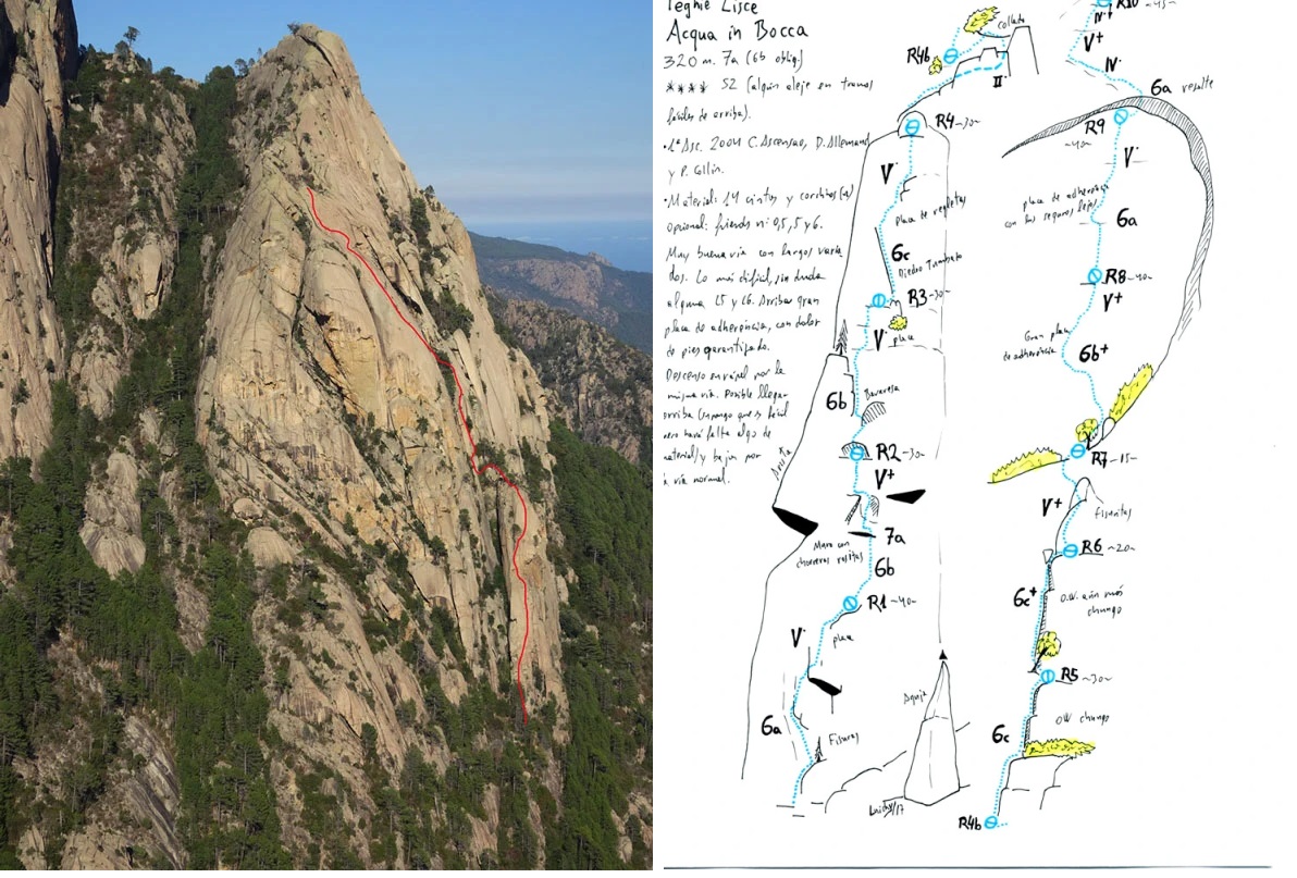 Podczas tego wyjazdu do Bavelli z powodu rehabilitowanego barku miałem nie interesować się trudniejszymi drogami, pod koniec pobytu stwierdzam jednak, że brakuje mi zwyczajowego sponiewierania 😉. Dzielna Ania jak zwykle godzi się na towarzystwo, pozostaje więc wybrać cel. Naturalnym wydaje się pretendujący do miana najlepszej drogi na wyspie Jeef (7b) na Punta Corbu, ponieważ jednak ledwo co robiliśmy tam Dos de l'Elephant (RELACJA), postanawiamy odwiedzić drugą ze słynnych ścian – Teghie Lisce i linię Acqua in bocca (7a 350m). Czytając opis w przewodniku i zagraniczne relacje obawiam się czy moja próba prowadzenia całości nie skończy się wycofem – droga mimo niższej wyceny uchodzi za poważniejszą od Jeefa, głównie z powodu wymagających przerys. Są jednak spity więc trzeba spróbować 😊.