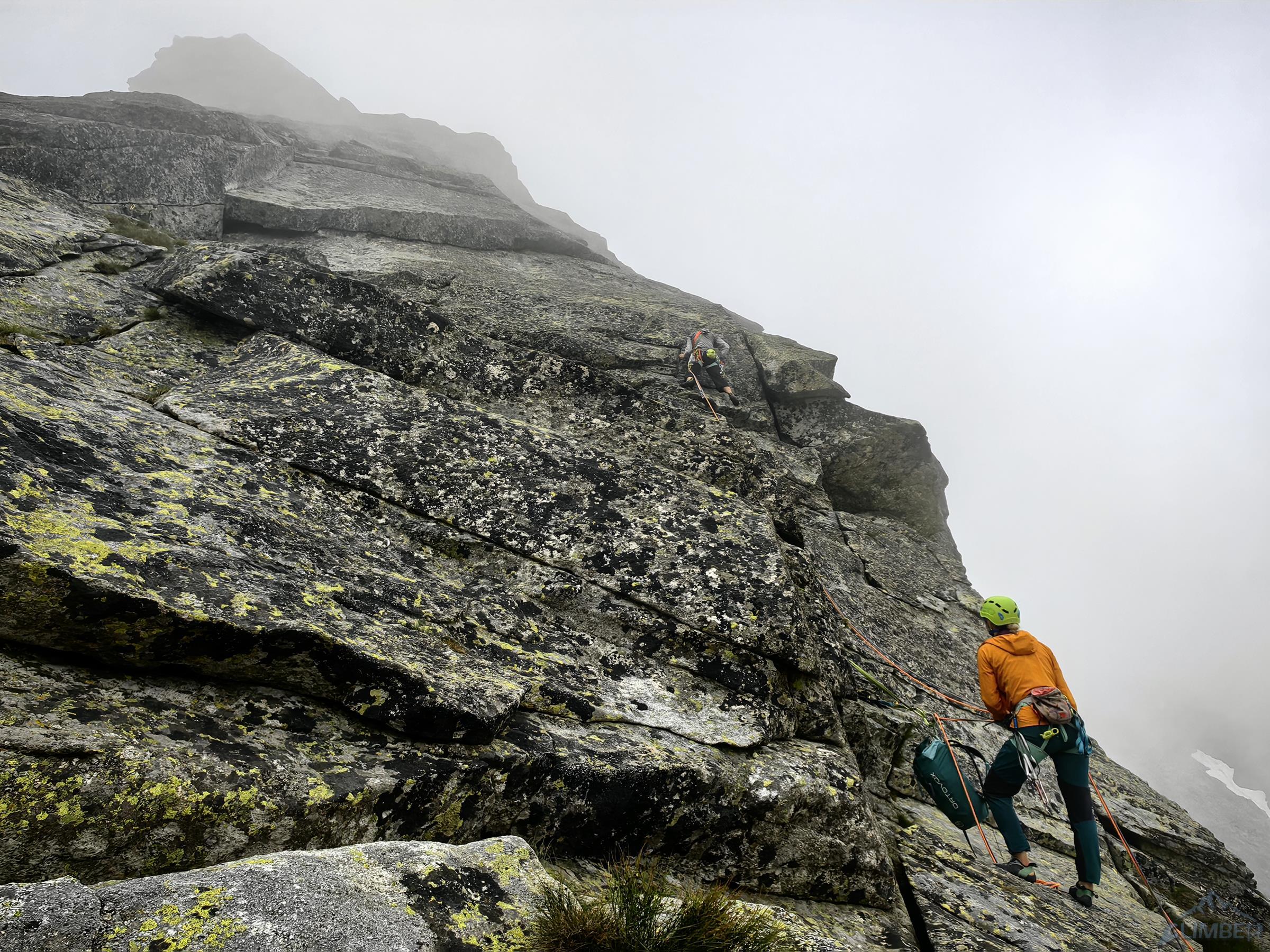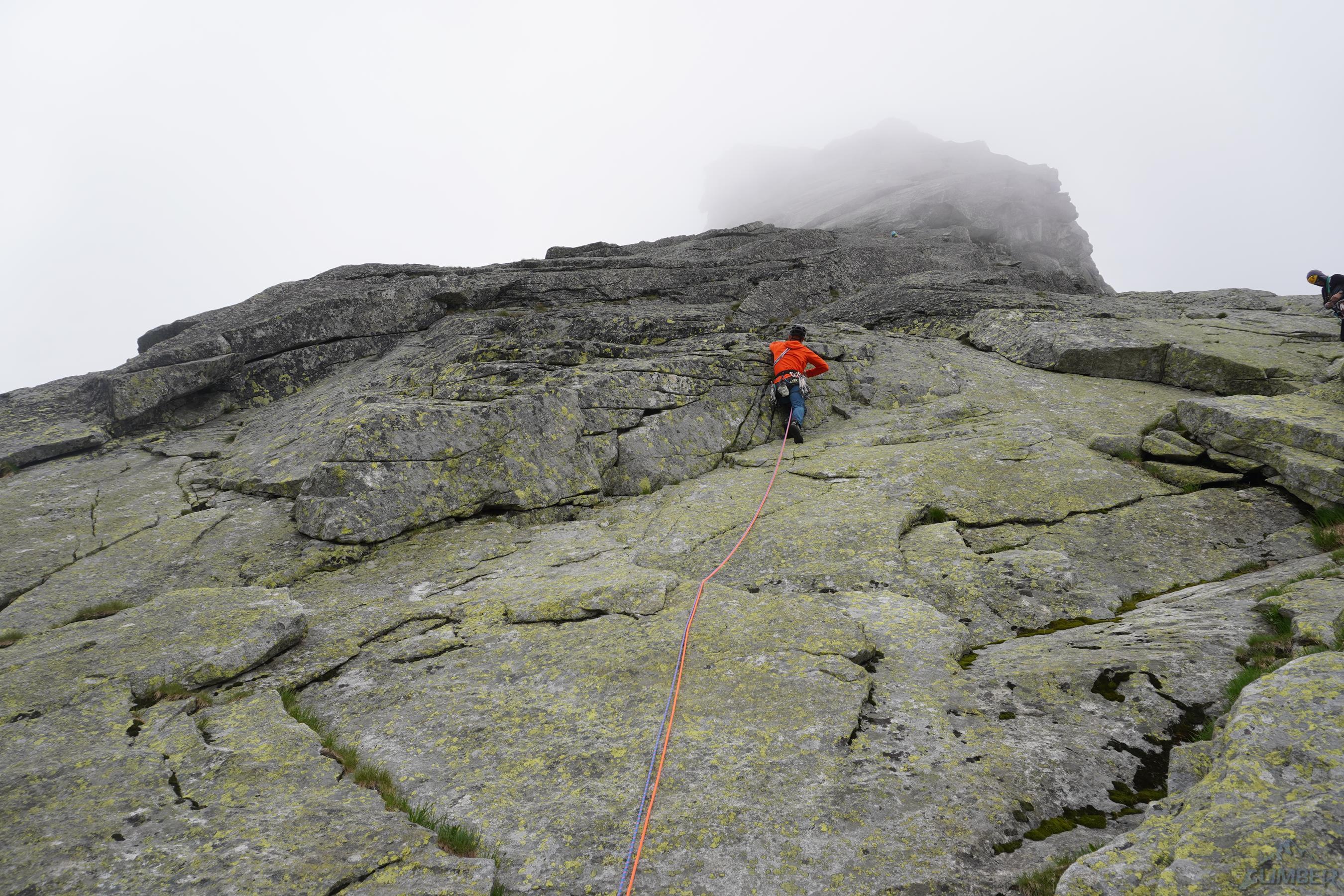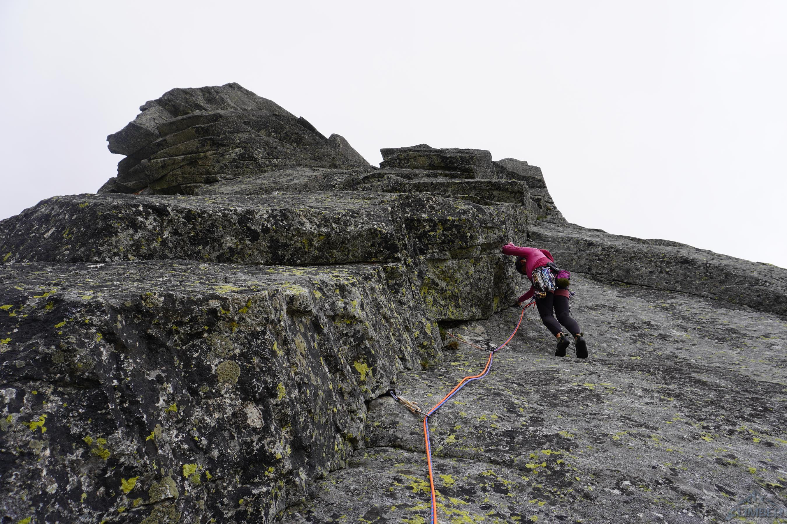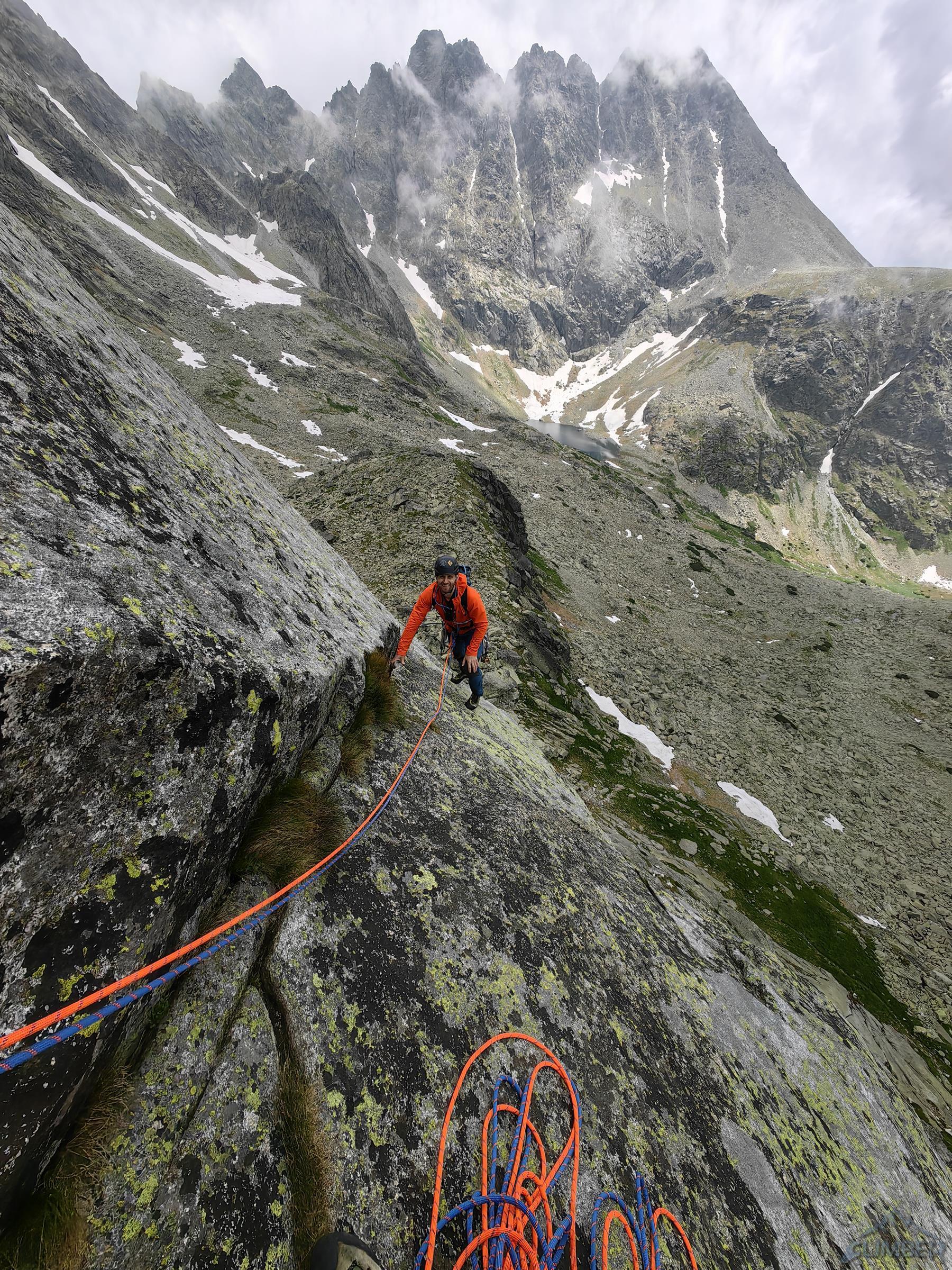 Ostatni odcinek zaczyna się czujnym wspinaniem (V+, haki) wzdłuż pęknięcia wchodzącego w zacięcie, zamknięte u góry przewieszką z jasną ryską – dobre ustawienie w tym miejscu jest kluczowe (VI-), wyżej czeka już piękna klamka. Niestety idąca do tej pory OS-em Ania na dojściu pod trudności wyjeżdża z mokrego stopnia i musi powtórzyć wyciąg, co też po chwili robi. Po przewinięciu idziemy wzdłuż łatwego pęknięcia skośnie w lewo i docieramy wprost do łańucha nad wylotem Komina Komarnickich. Do podstawy zachodniej ściany jest 60m, polecam jednak zjazd na dwa razy (po drodze kolejny łańcuch) – inaczej może czekać wycieczka po zaklinowaną linę 😉.