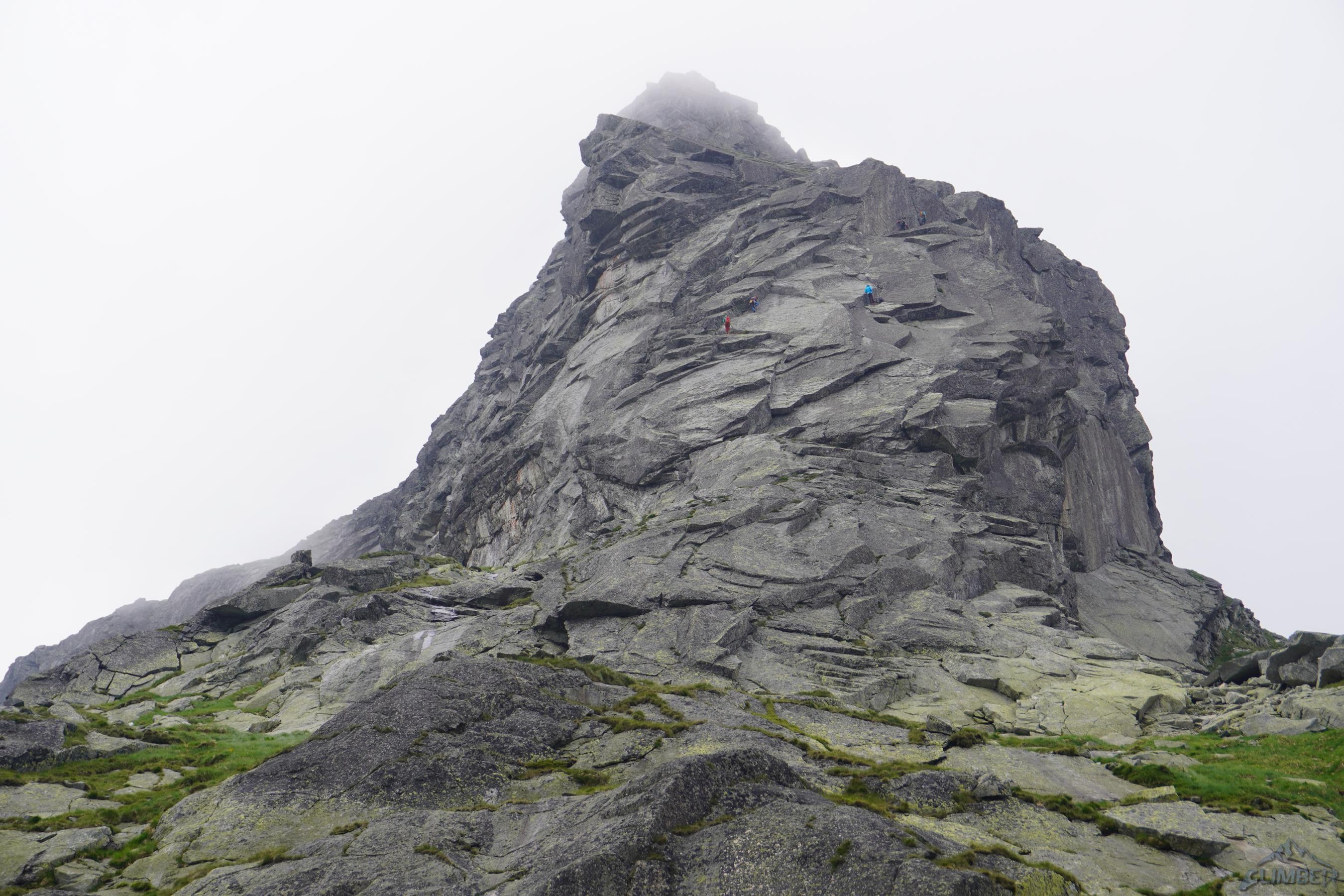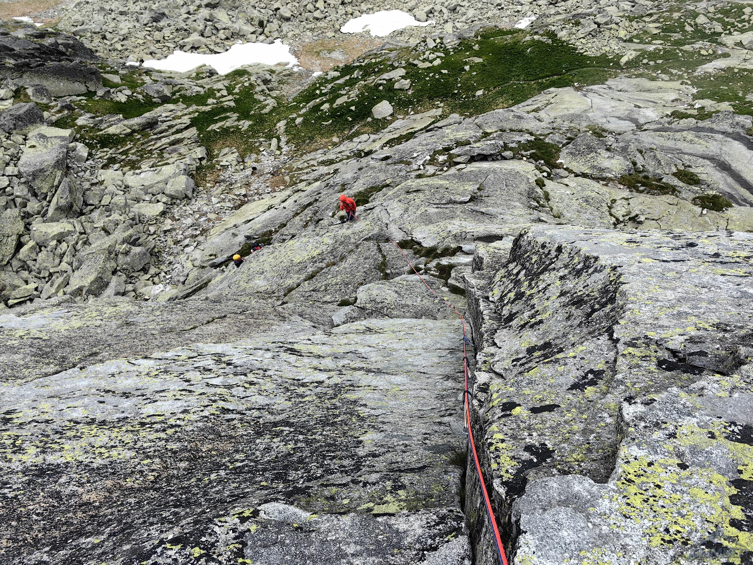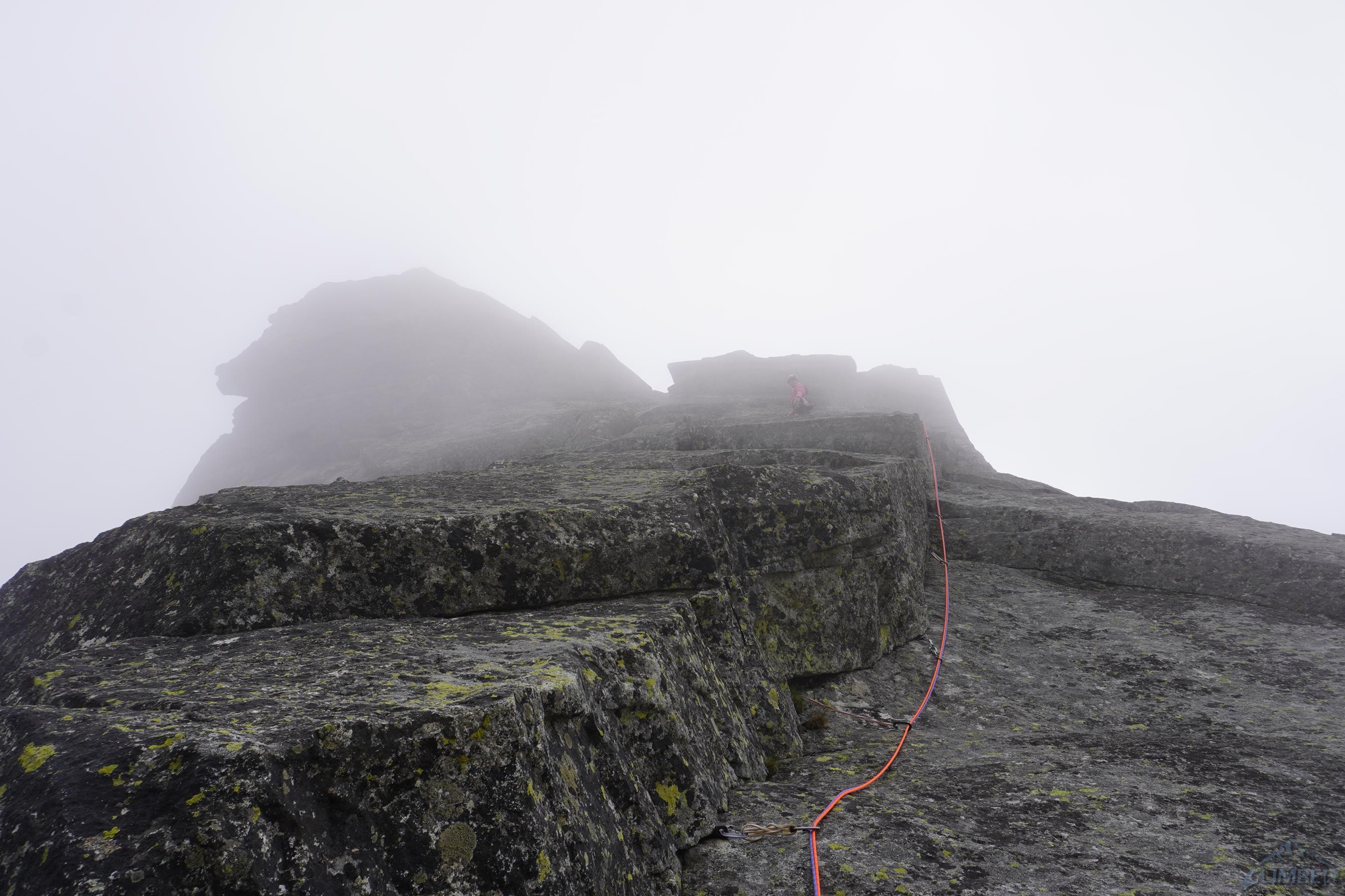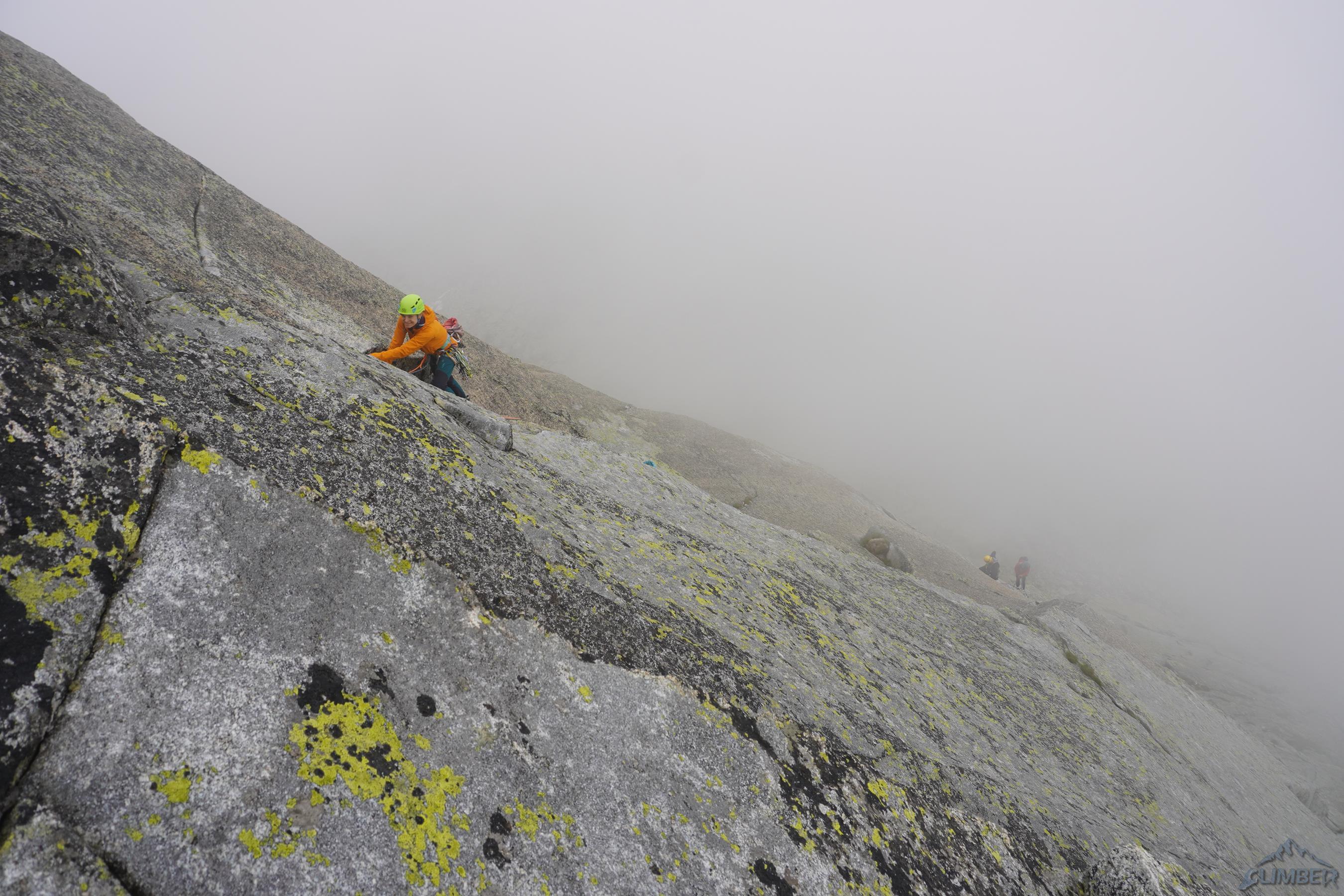 Ostatni odcinek zaczyna się czujnym wspinaniem (V+, haki) wzdłuż pęknięcia wchodzącego w zacięcie, zamknięte u góry przewieszką z jasną ryską – dobre ustawienie w tym miejscu jest kluczowe (VI-), wyżej czeka już piękna klamka. Niestety idąca do tej pory OS-em Ania na dojściu pod trudności wyjeżdża z mokrego stopnia i musi powtórzyć wyciąg, co też po chwili robi. Po przewinięciu idziemy wzdłuż łatwego pęknięcia skośnie w lewo i docieramy wprost do łańucha nad wylotem Komina Komarnickich. Do podstawy zachodniej ściany jest 60m, polecam jednak zjazd na dwa razy (po drodze kolejny łańcuch) – inaczej może czekać wycieczka po zaklinowaną linę 😉.