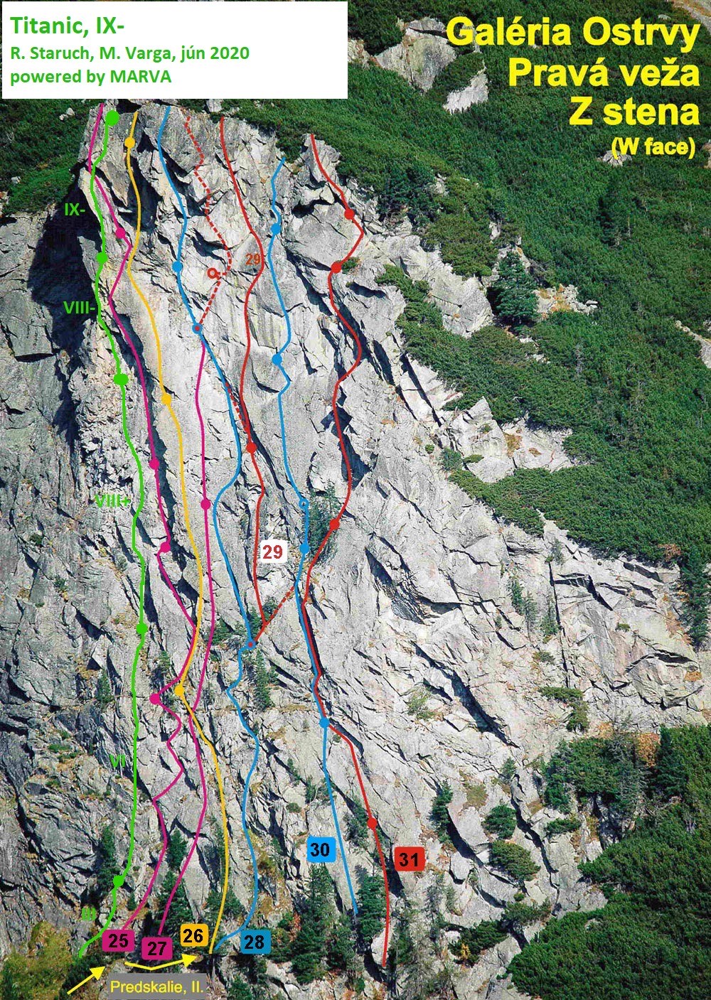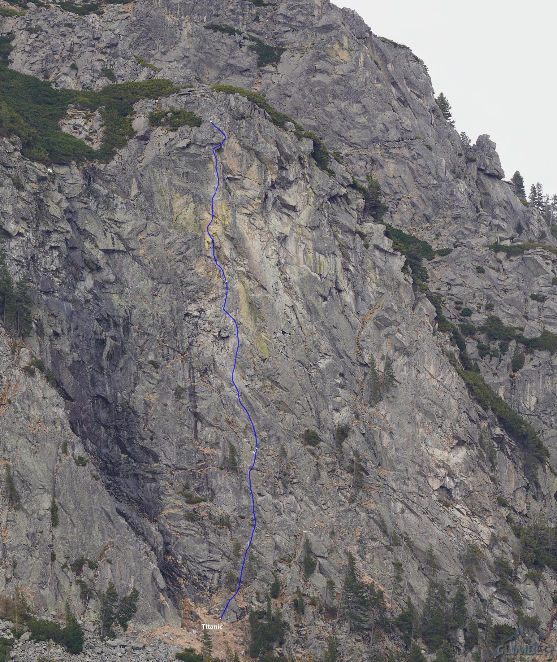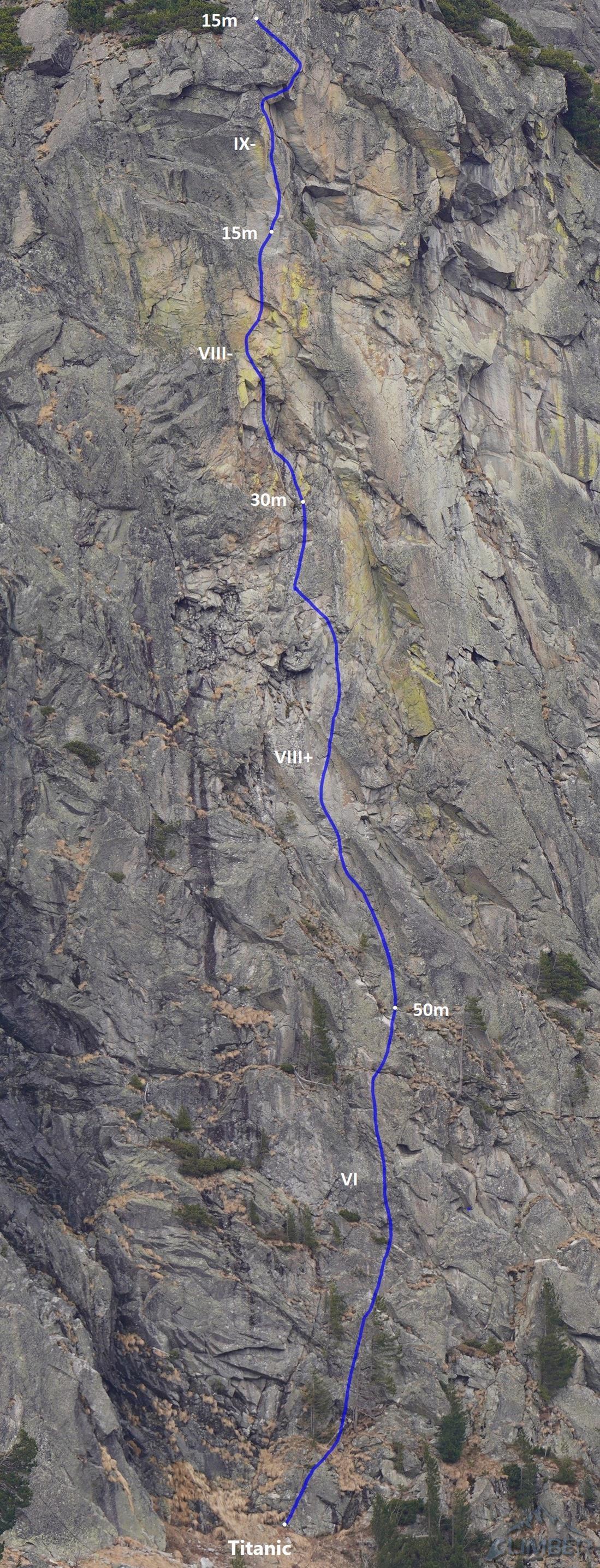 Titanic zlokalizowany jest na Prawej Baszcie – znajdziemy tutaj tylko kilka dróg, każda z nich charakteryzuje się jednak dość wysoką cyfrą (od VIII do IX+). Startujemy z lewego skraju sektora, nad głowami mając wielkie przewieszone zacięcie z drogi Žltý kút – będziemy się zresztą wzdłuż niego wspinać przez większość drogi. Na początek czeka łatwe podejście na półkę znajdującą się kilka metrów nad ziemią, gdzie zaczynają się właściwe trudności pierwszego wyciągu (VI 50m). Mimo iż z dołu nie wygląda on za ciekawie, oferuje ładne wspinanie różnorodnymi formacjami z jednym całkiem niebanalnym miejscem. Spity rozmieszczone są rzadziej niż na kolejnych wyciągach, jest jednak całkiem bezpiecznie i dodatkowy własny sprzęt nie jest konieczny.