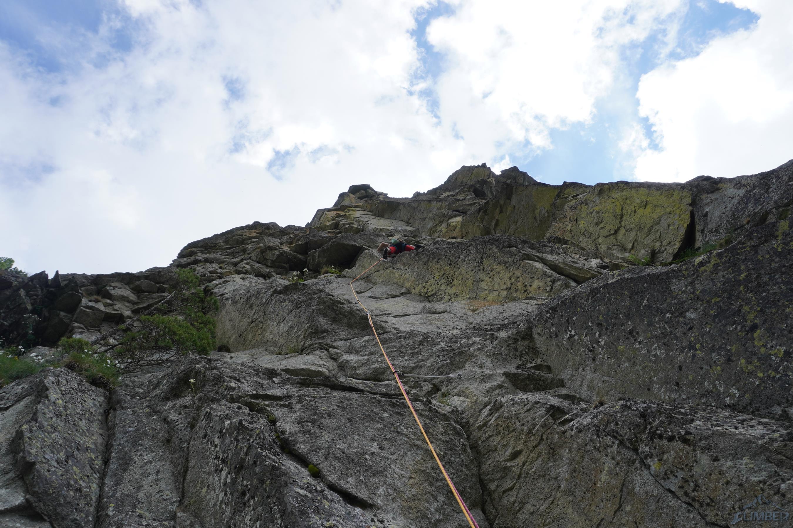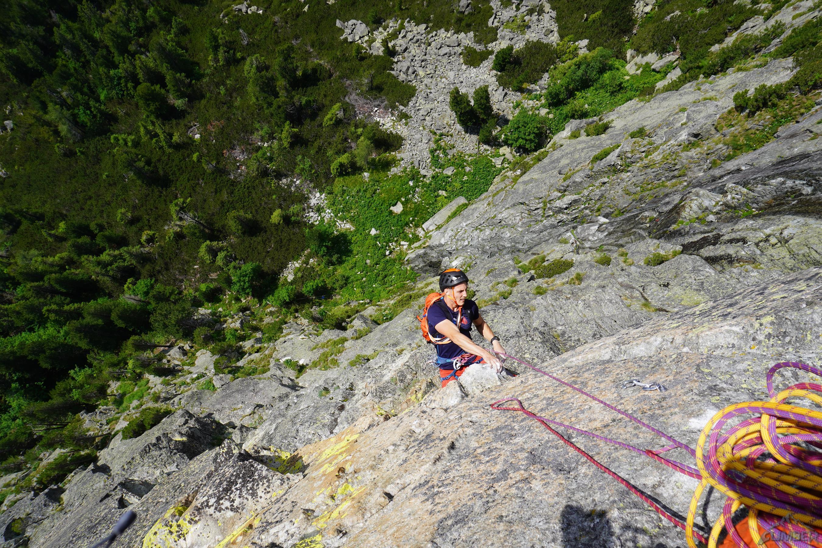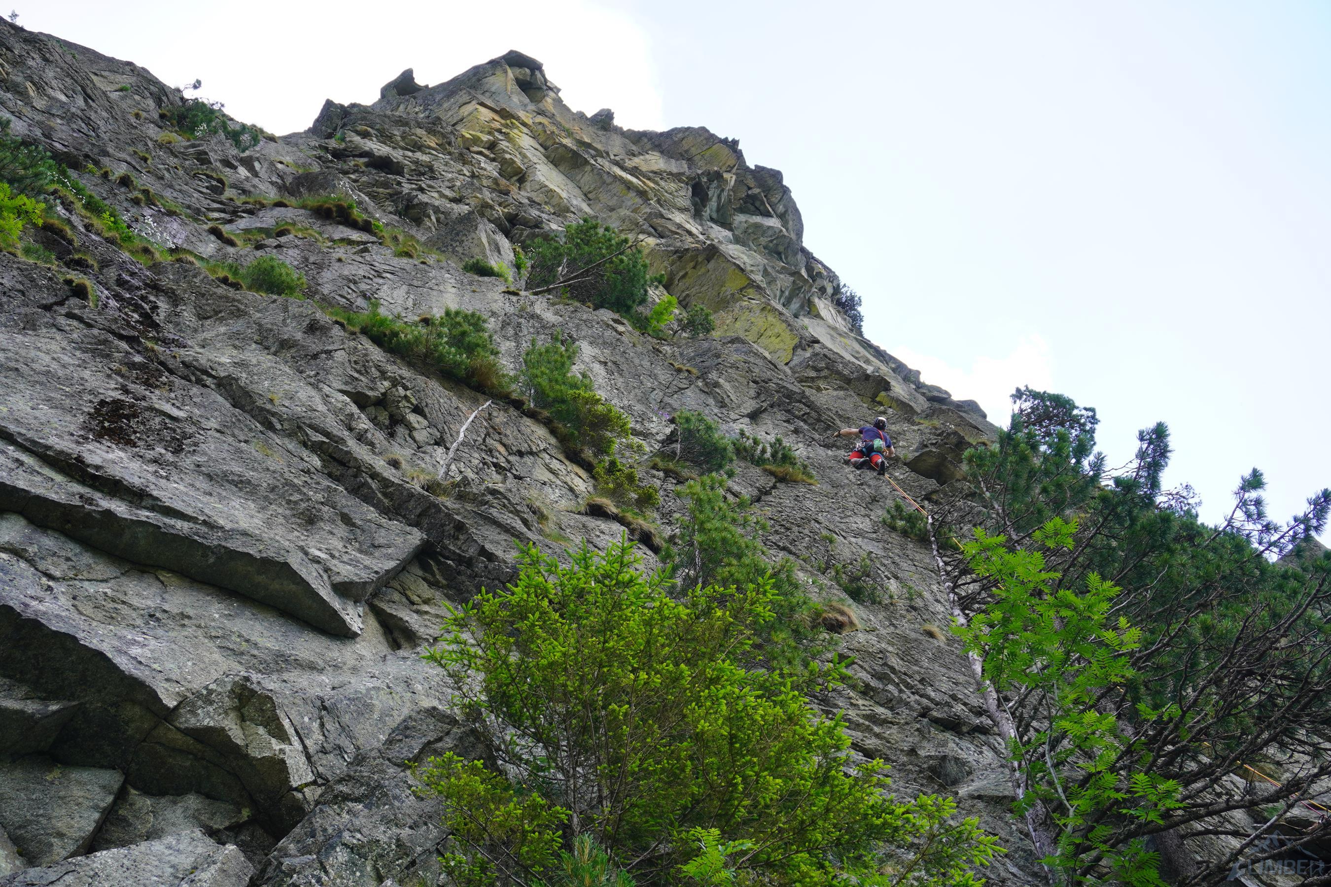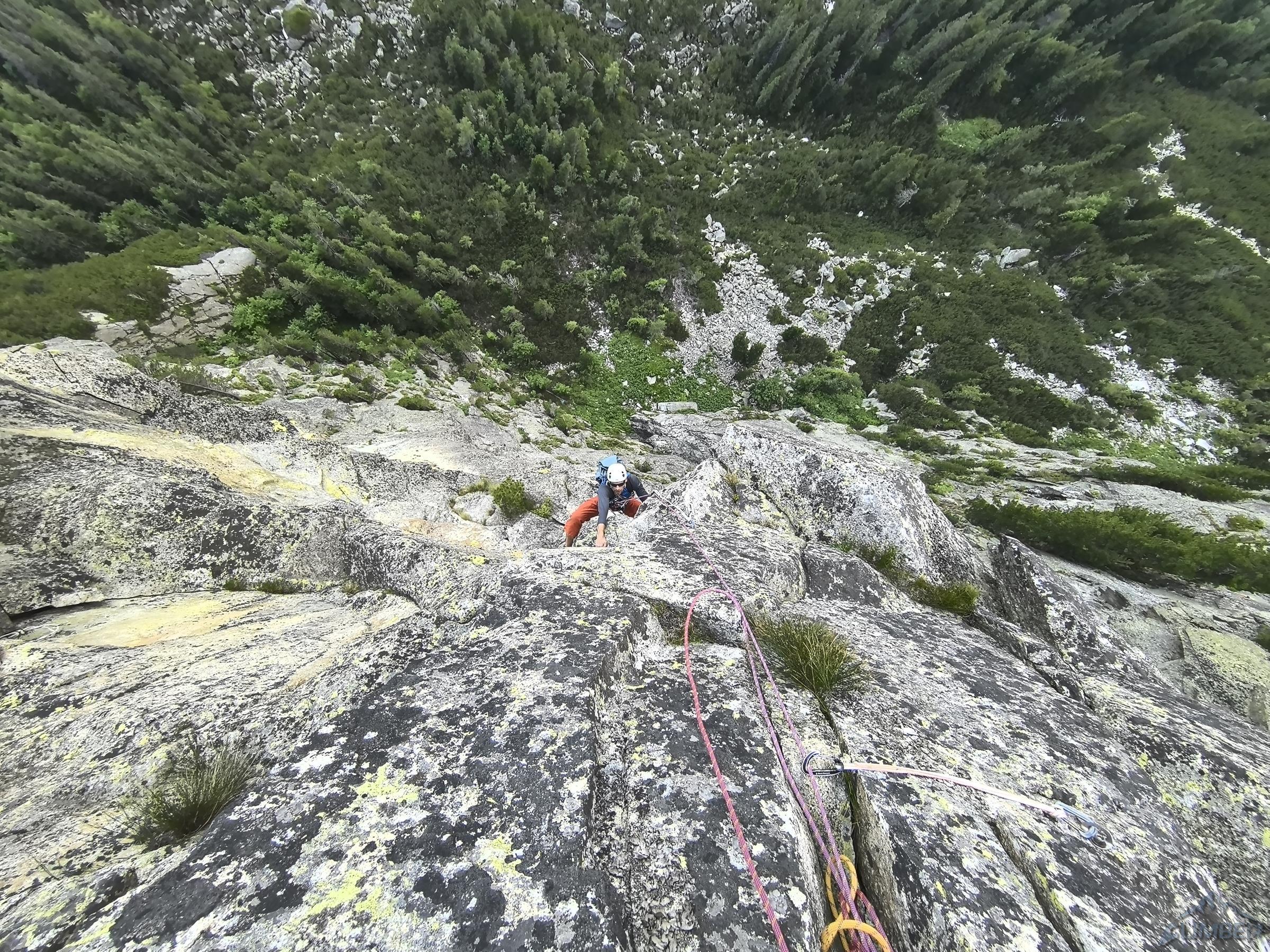 Po odpoczynku robię drugą wstawkę, przechodzę cruxa i zgodnie z obawami zawisam w okapie. Gdy na trzecią próbę poświęcam wszystkie siły i kończę dwa metry pod stanowiskiem wydaje się, że trzeba będzie wrócić na drogę. Po chwili namysłu postanawiam jednak ostatni raz spróbować – tym razem dość rozpaczliwie ale jednak skutecznie pokonuję okap i dociągam do stanowiska 😊. Po ściągnięciu kolegów do stanowiska pozostają dwa szybkie zjazdy - do pierwszego stanowiska jest równo 60m, dalej do ziemi 40m. Schodzimy późno ale tym razem zostajemy pod Tatrami - następnego dnia wybieramy się na Łomnicką Basztę.