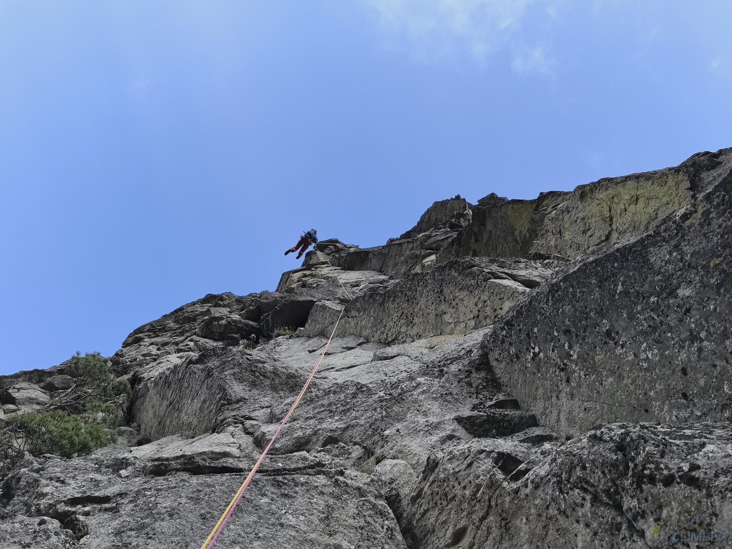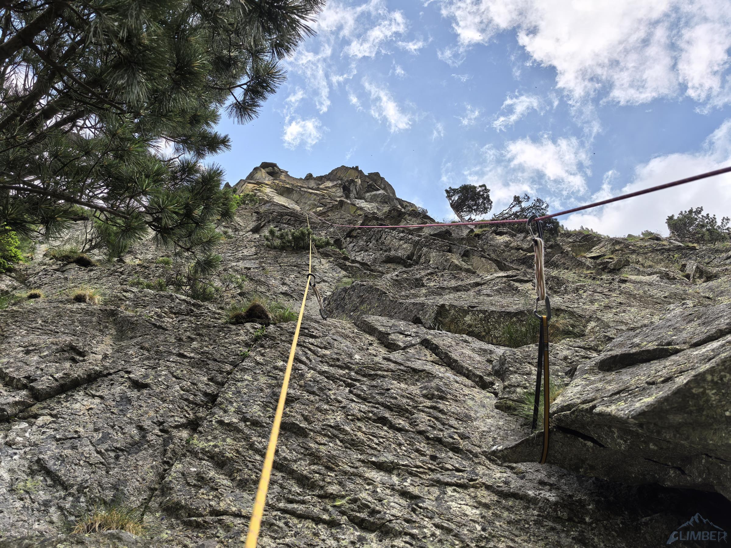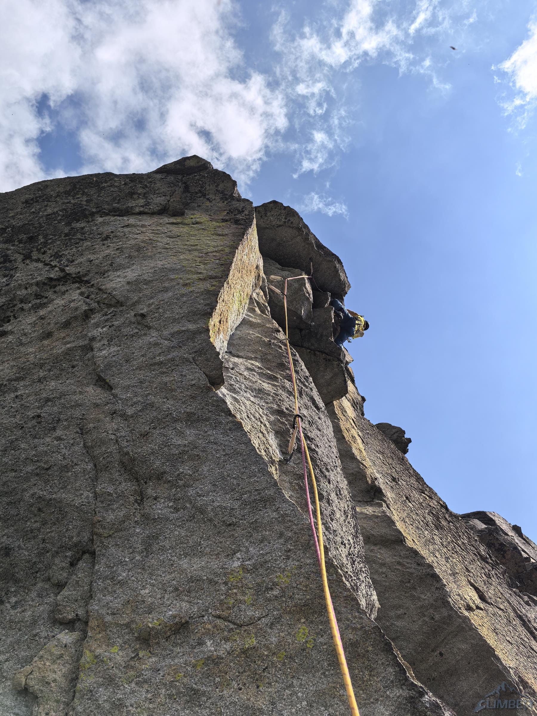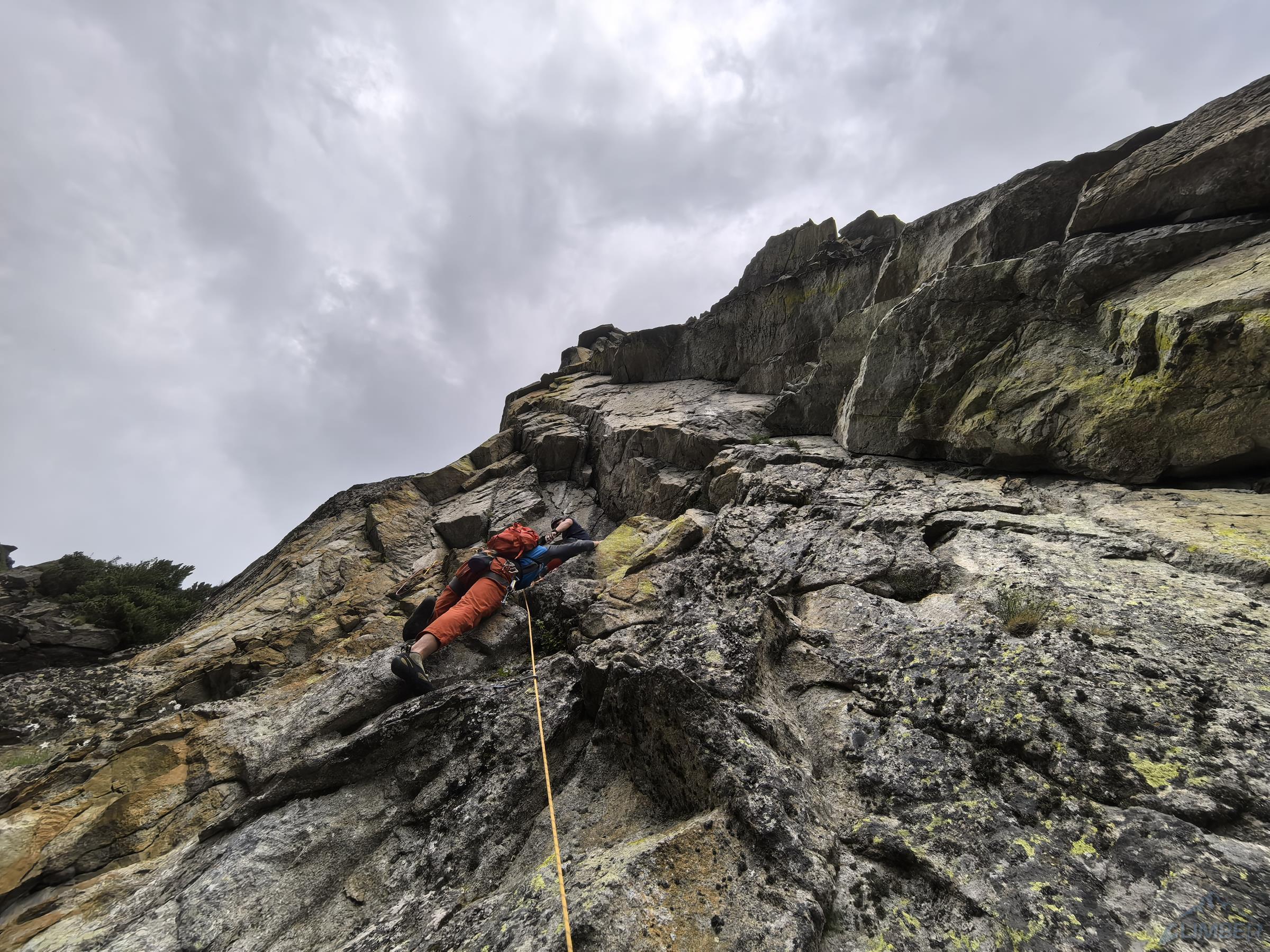 Po tej krótkiej rozgrzewce czas na poważniejsze wspinanie, które czeka na drugim odcinku (VIII+ 30m). Zaczynamy od technicznego filarka, z którego trawersujemy ciekawym bulderem do zacięcia – przewinięcie z niego przez kancik to crux tego wyciągu, wg niektórych zasługujący na IX-. Dalej trudności odpuszczają (ok. VII), nadal czeka jednak sporo zajmującego wspinania do kolejnego stanowiska. Podczas pierwszego podejścia Marcin dochodzi do kluczowego miejsca, patentuje je i rozwiesza ekspresy do końca. Moja próba również kończy się w trudnościach i po chwili znajduję sposób jak je pokonać – nie dane będzie mi jednak spróbować bo kolega rozprawia się z wyciągiem przy drugim podejściu, zaliczając przy okazji swoją życiówkę na prowadzeniu 😊. W międzyczasie nawet nie zauważamy, że za naszymi plecami pojawia się ściana deszczu – z innych sektorów wspinacze uciekają, a u nas skała nie łapie nawet kropli!