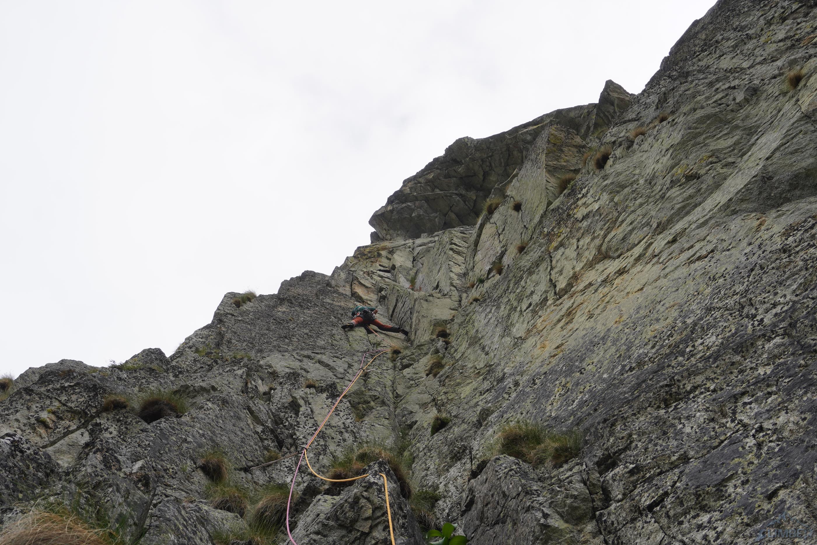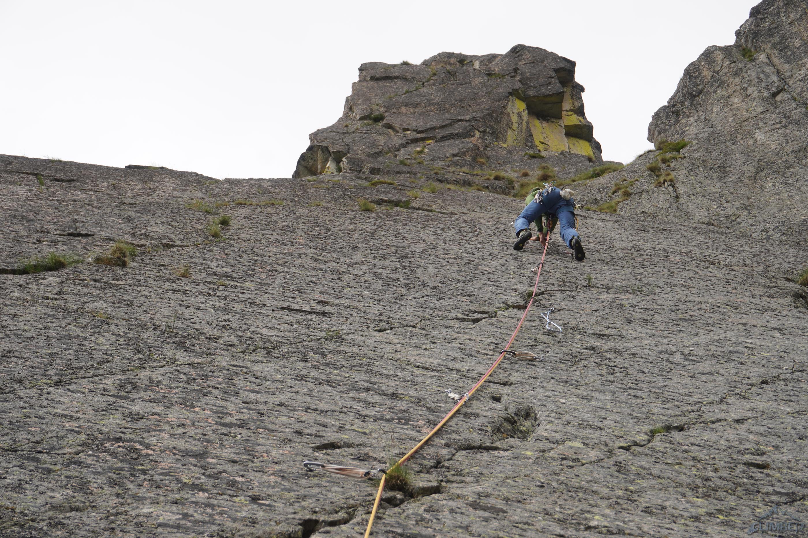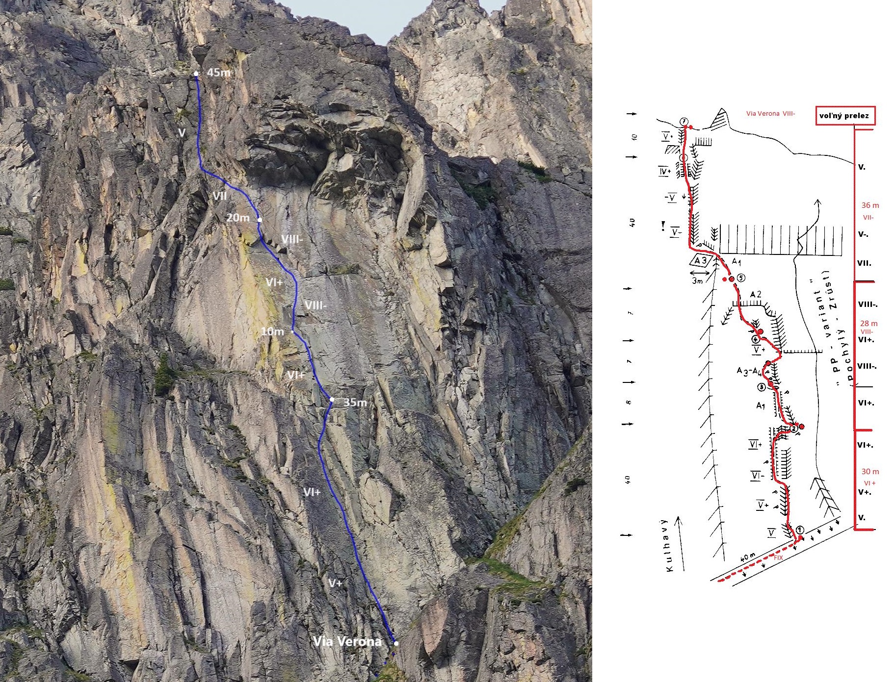By dostać się pod start Verony konieczne jest przejście ok. 50 metrów skośną trawiastą rampą oddzielającą prawą podstawę ściany od jej właściwego spiętrzenia – robimy to za pomocą zamocowanej poręczówki. Pierwszy wyciąg to ponad 30 metrów wspinania wzdłuż rys i zacięć, stopniowo robi się coraz trudniej (solidne V do VI+) i konieczna jest własna asekuracja – jest tylko kilka starych haków, własne nie są potrzebne ale kompletny zestaw friendów i kostek już tak. Na koniec czeka czujny trawers w prawo za filarek, gdzie znajdziemy dwa nowe ringi – niedawno wymieniono stanowiska oraz trzy stare spity w trudnościach.