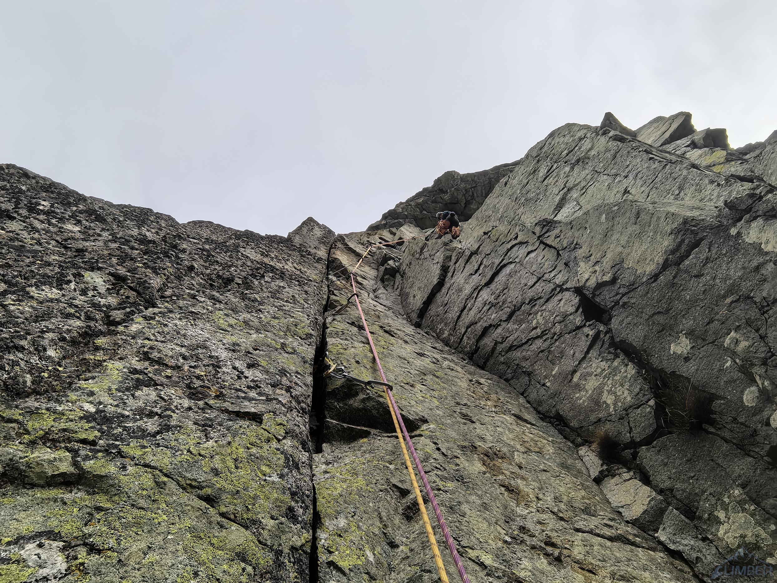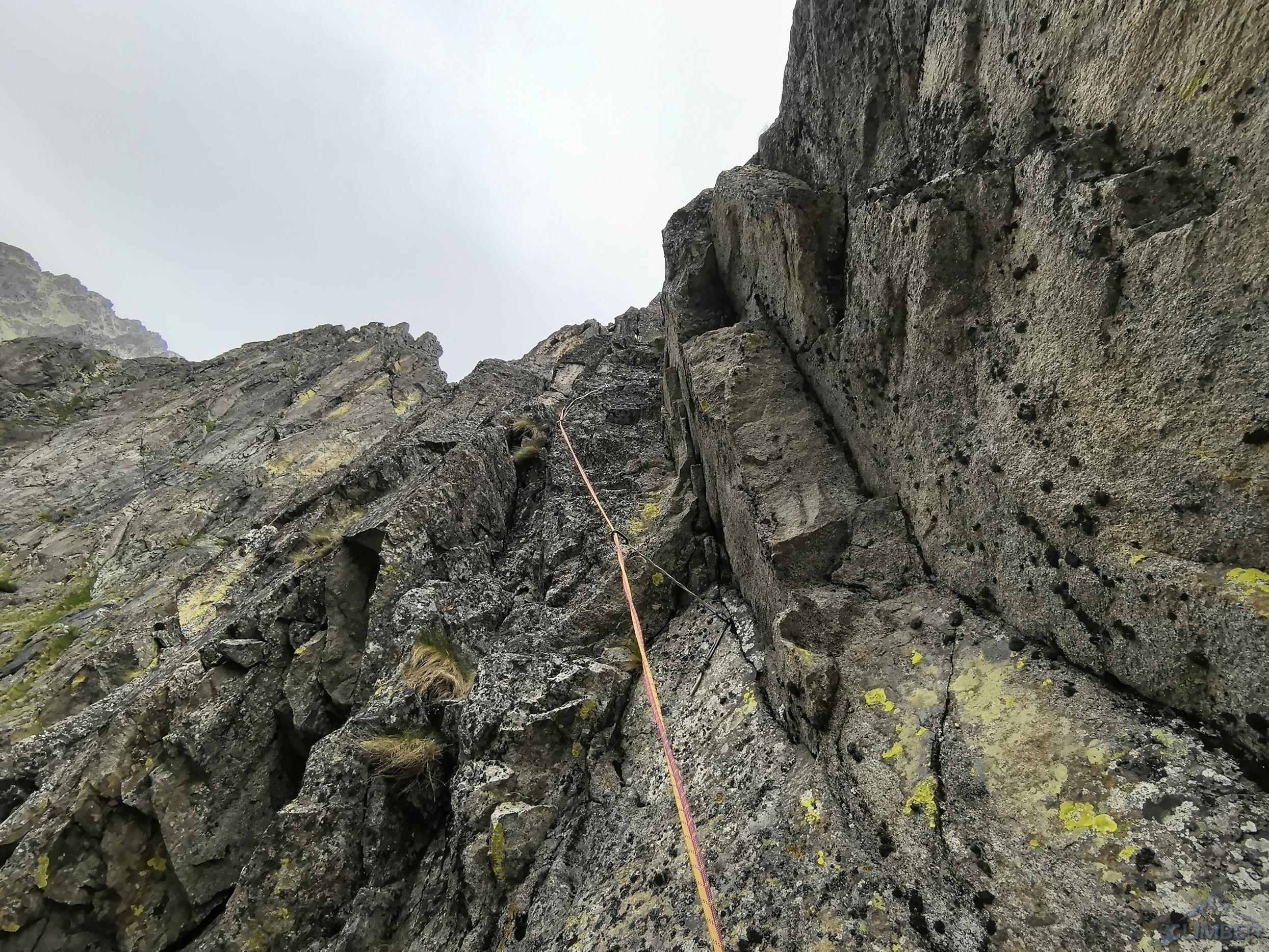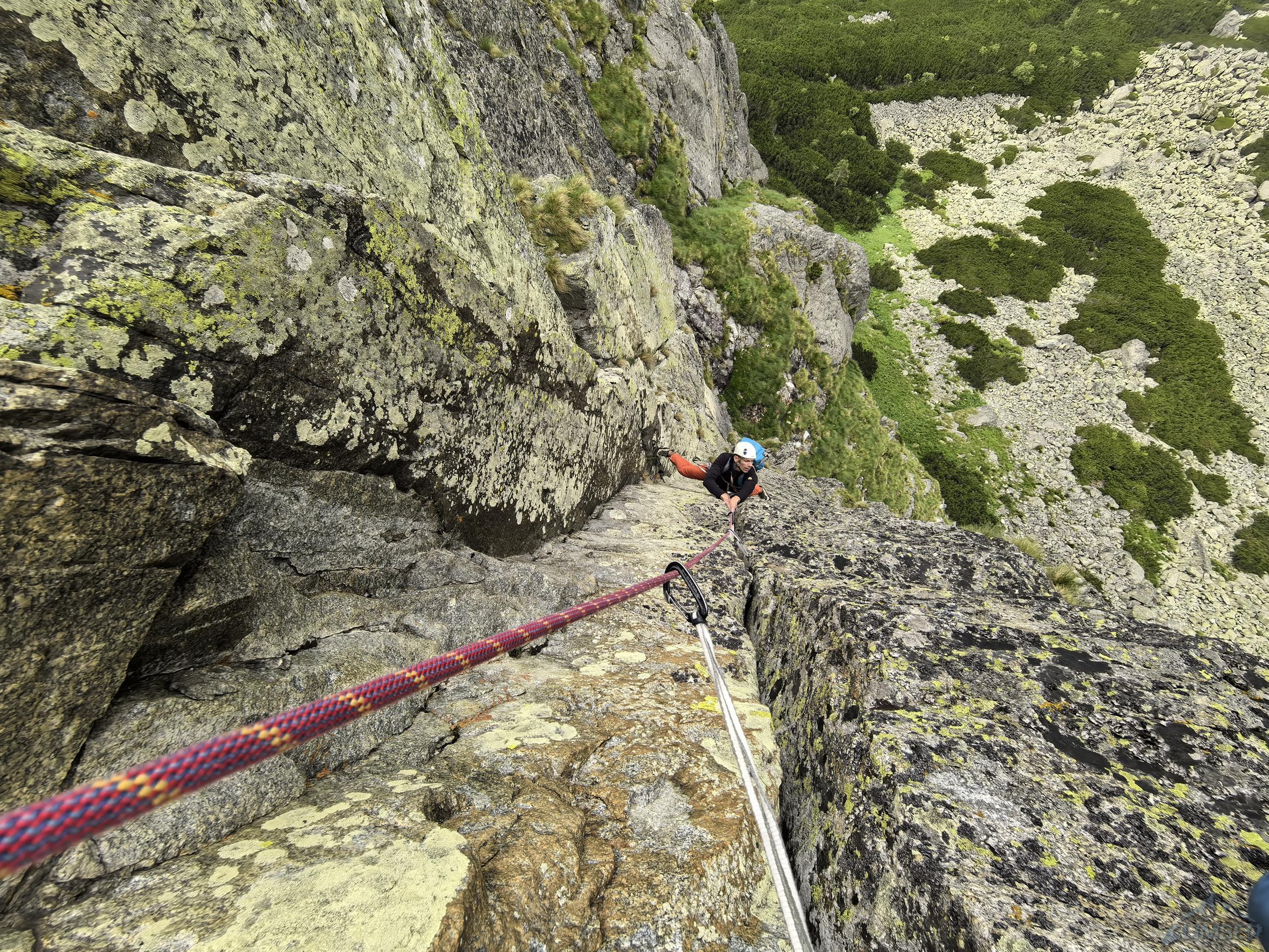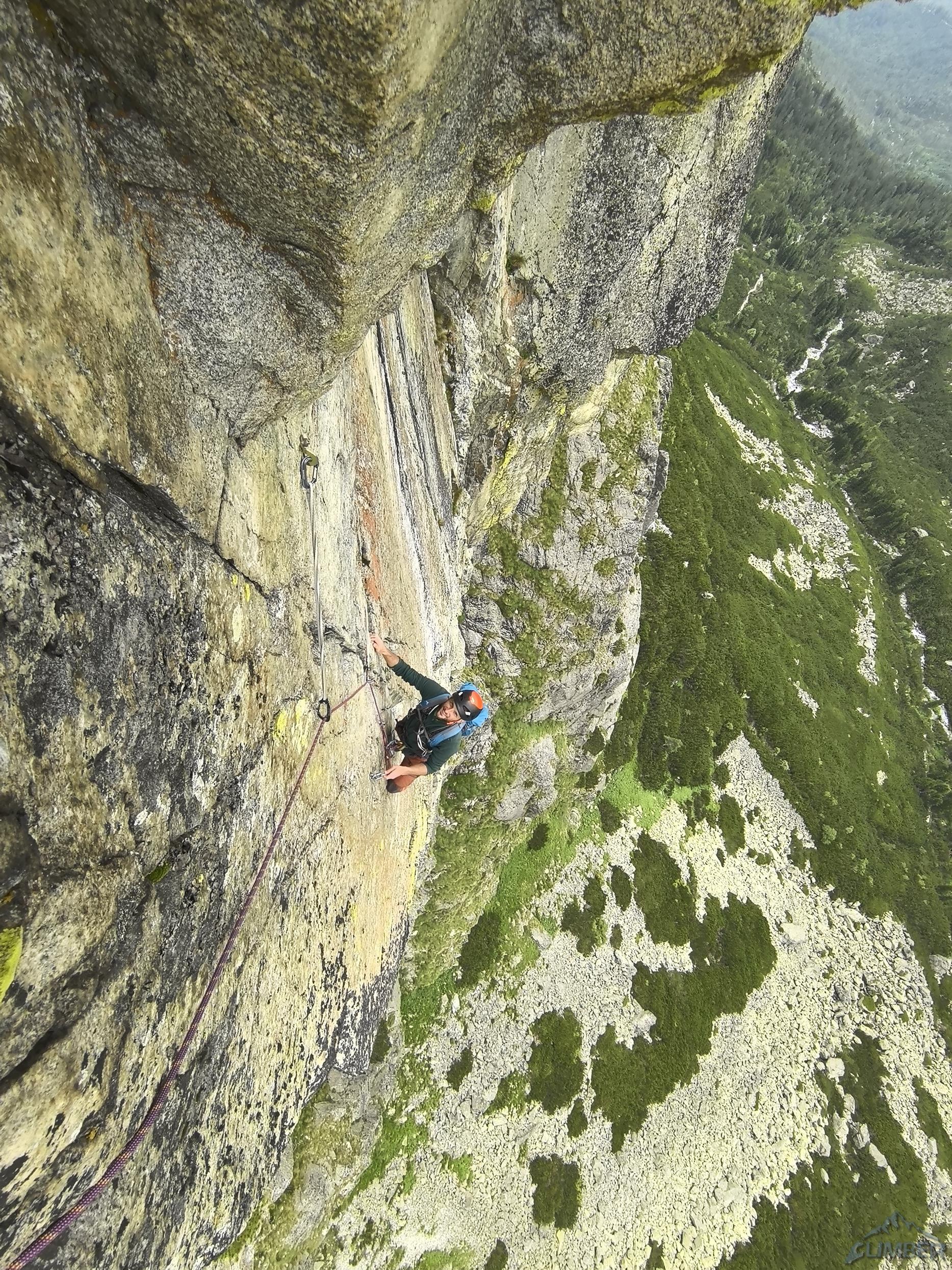 Po re-ekipacji jej autorzy sugerują połączenie kolejnych wyciągów w jeden, zdecydowanie lepiej jednak wspinać się zgodnie z pierwszym przejściem klasycznym. Nad stanowiskiem czeka bowiem wymagająca („słowackie” VI+) szeroka rysa na własnej, a tuż po niej wygodna półka ze spitem i hakiem, z której startujemy w główne trudności drogi. Choć ostrzę sobie zęby na kluczowy wyciąg, widząc iż Bartek świetnie radzi sobie z początkiem drogi namawiam go by spróbował – i w ten sposób kolega zalicza piękną tatrzańską życiówkę 😊. Zaczynamy od buldera po krawądkach (VIII-, hak i spit), po którym czeka spory run-out do drugiego stałego punktu (VI+) i podejście wzdłuż zacięcia do drugiego cruxa – wąskiego okapiku z ryską (VIII-, hak pod nim). Po wyjściu z trudności pozostają 2-3 metry do wiszącego stanowiska. Warto wspomnieć że pod okapikiem z lewej strony dochodzi inna piękna, ale trudniejsza już (VIII+) droga P.S. Hrana.