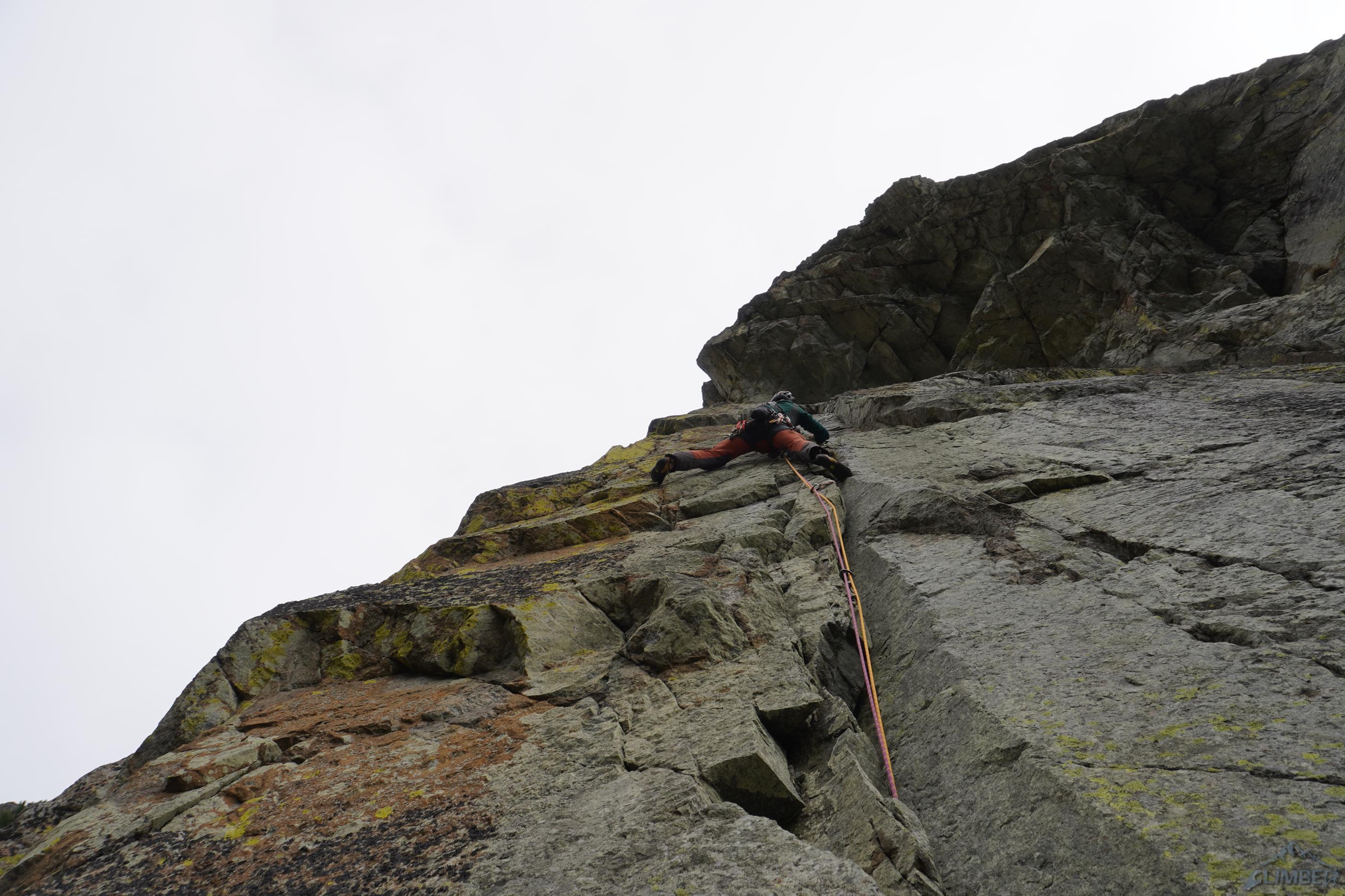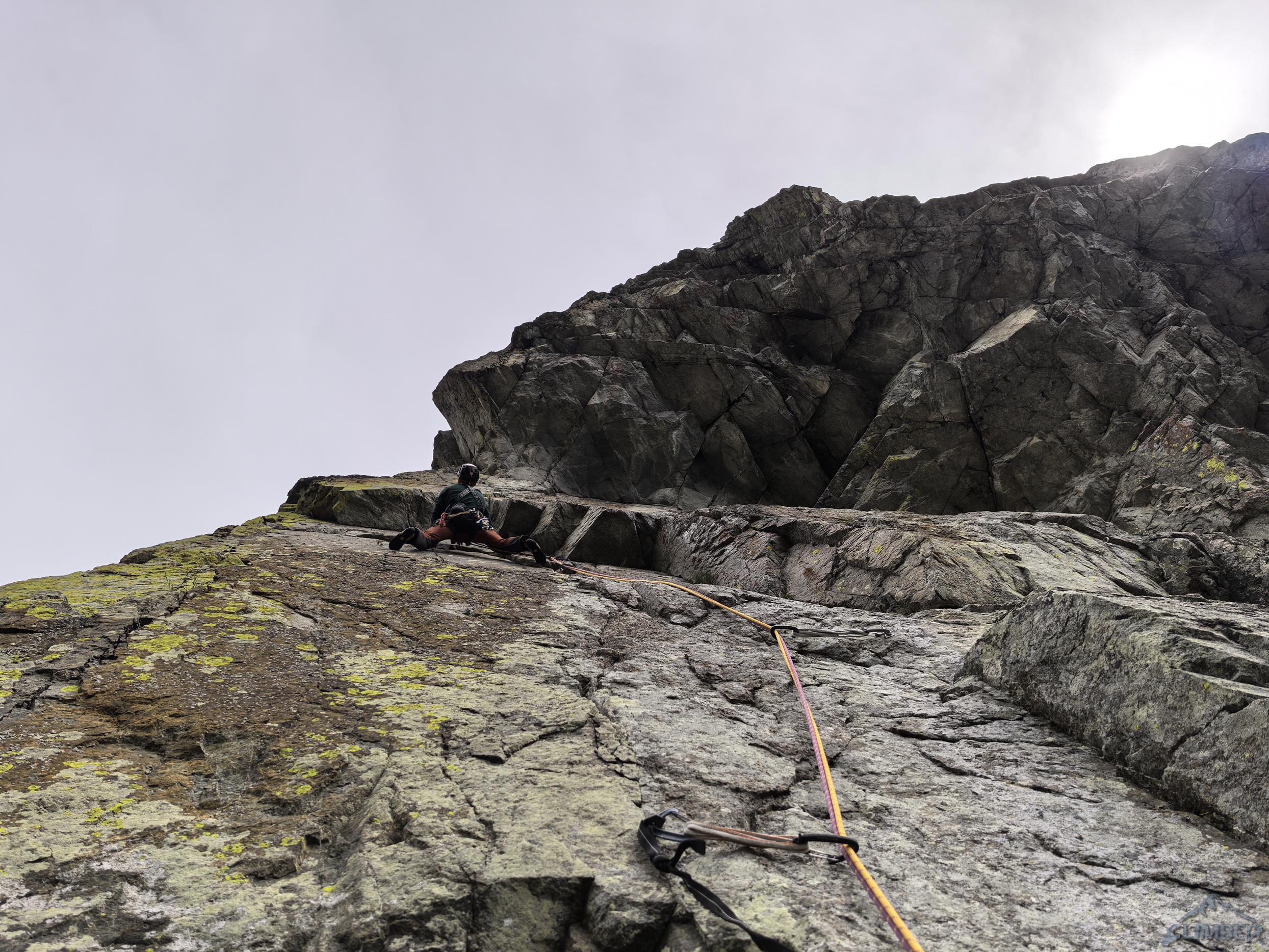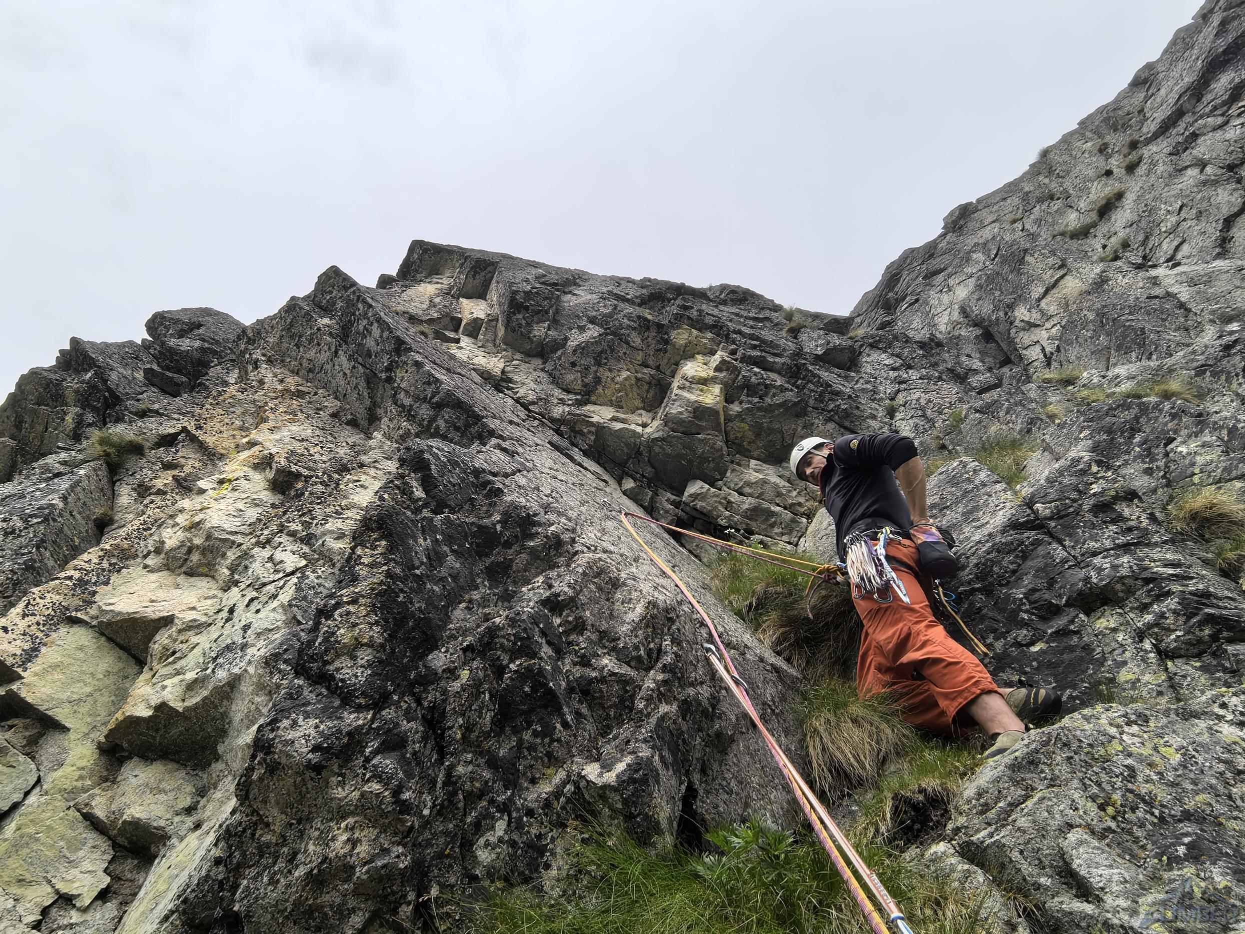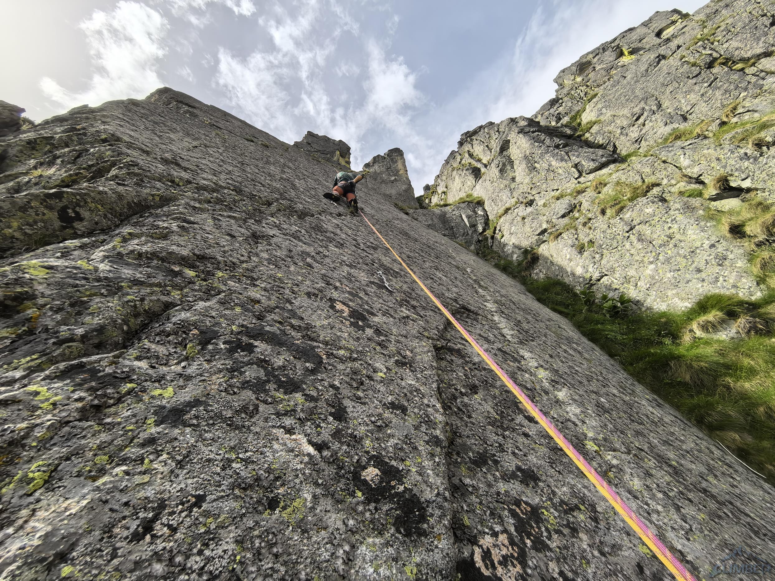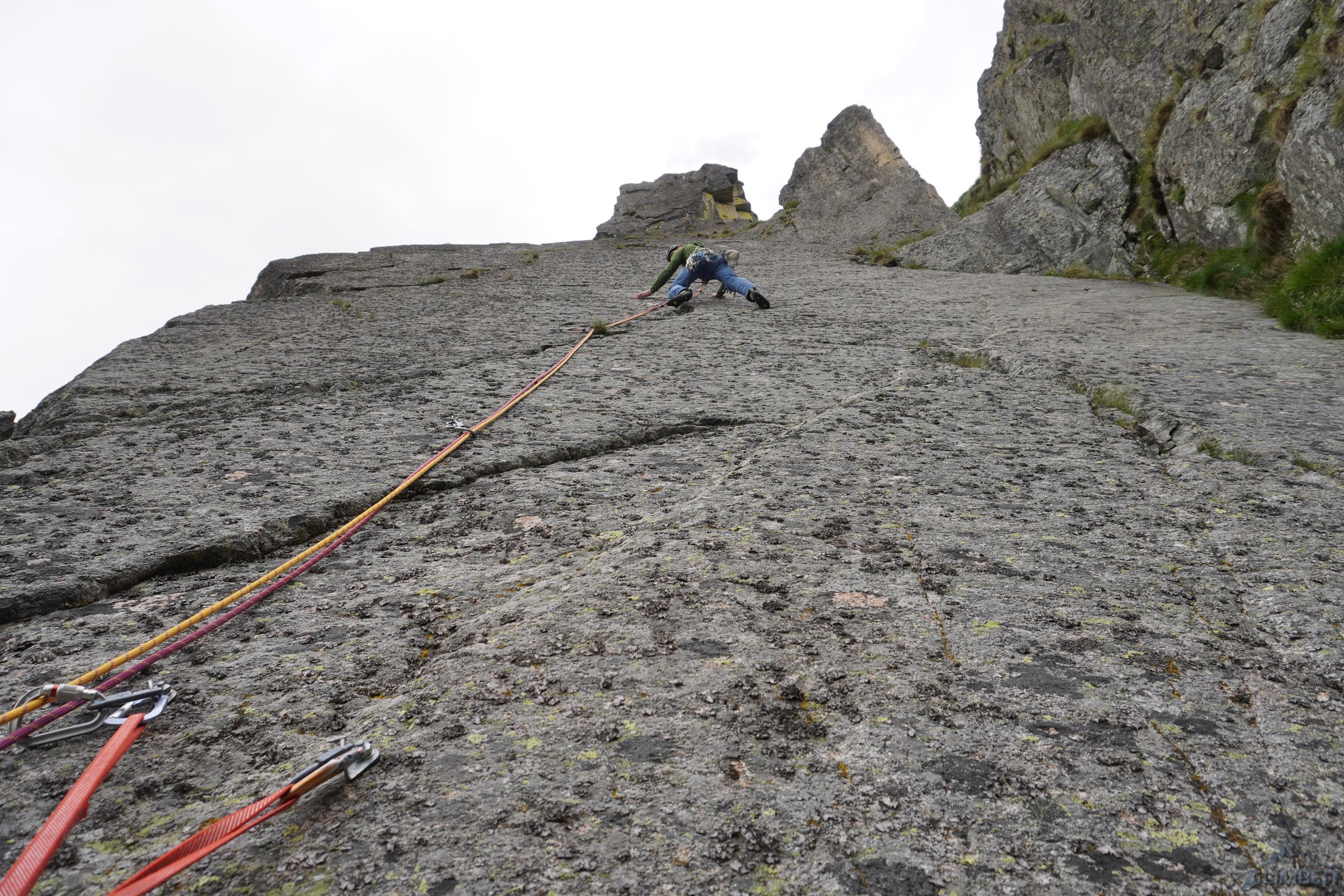 Po re-ekipacji jej autorzy sugerują połączenie kolejnych wyciągów w jeden, zdecydowanie lepiej jednak wspinać się zgodnie z pierwszym przejściem klasycznym. Nad stanowiskiem czeka bowiem wymagająca („słowackie” VI+) szeroka rysa na własnej, a tuż po niej wygodna półka ze spitem i hakiem, z której startujemy w główne trudności drogi. Choć ostrzę sobie zęby na kluczowy wyciąg, widząc iż Bartek świetnie radzi sobie z początkiem drogi namawiam go by spróbował – i w ten sposób kolega zalicza piękną tatrzańską życiówkę 😊. Zaczynamy od buldera po krawądkach (VIII-, hak i spit), po którym czeka spory run-out do drugiego stałego punktu (VI+) i podejście wzdłuż zacięcia do drugiego cruxa – wąskiego okapiku z ryską (VIII-, hak pod nim). Po wyjściu z trudności pozostają 2-3 metry do wiszącego stanowiska. Warto wspomnieć że pod okapikiem z lewej strony dochodzi inna piękna, ale trudniejsza już (VIII+) droga P.S. Hrana.