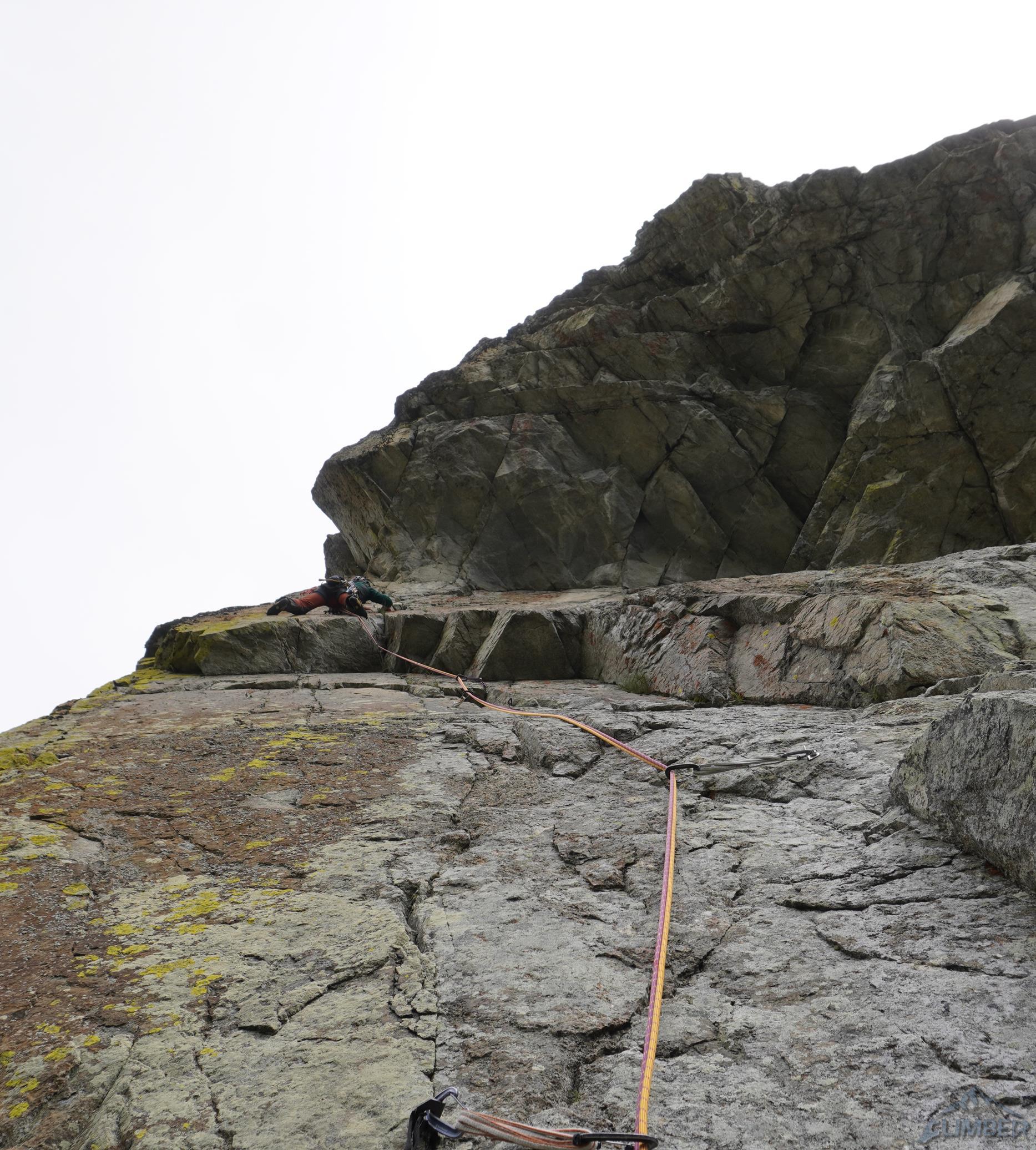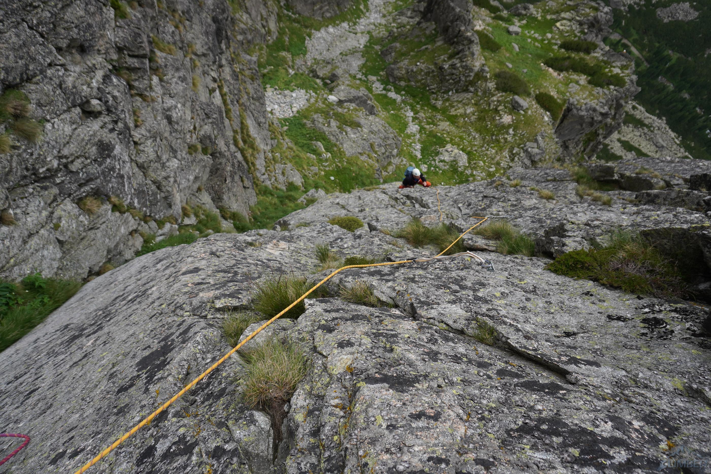 Ostatni wyciąg prowadzi Szymon – zaczynamy od krótkiej ścianki (VII, spit) i przewijamy się w niebanalny sposób w lewo za kancik. Spity do góry są z Hrany (wyciąg VIII, można rozważyć zakończenie wspinania w ten sposób), my oryginalnie trawersujemy dalej w lewo i docieramy do łatwiejszych zacięć (V), którymi kontynuujemy aż do ostatniego stanowiska (łańcuch).