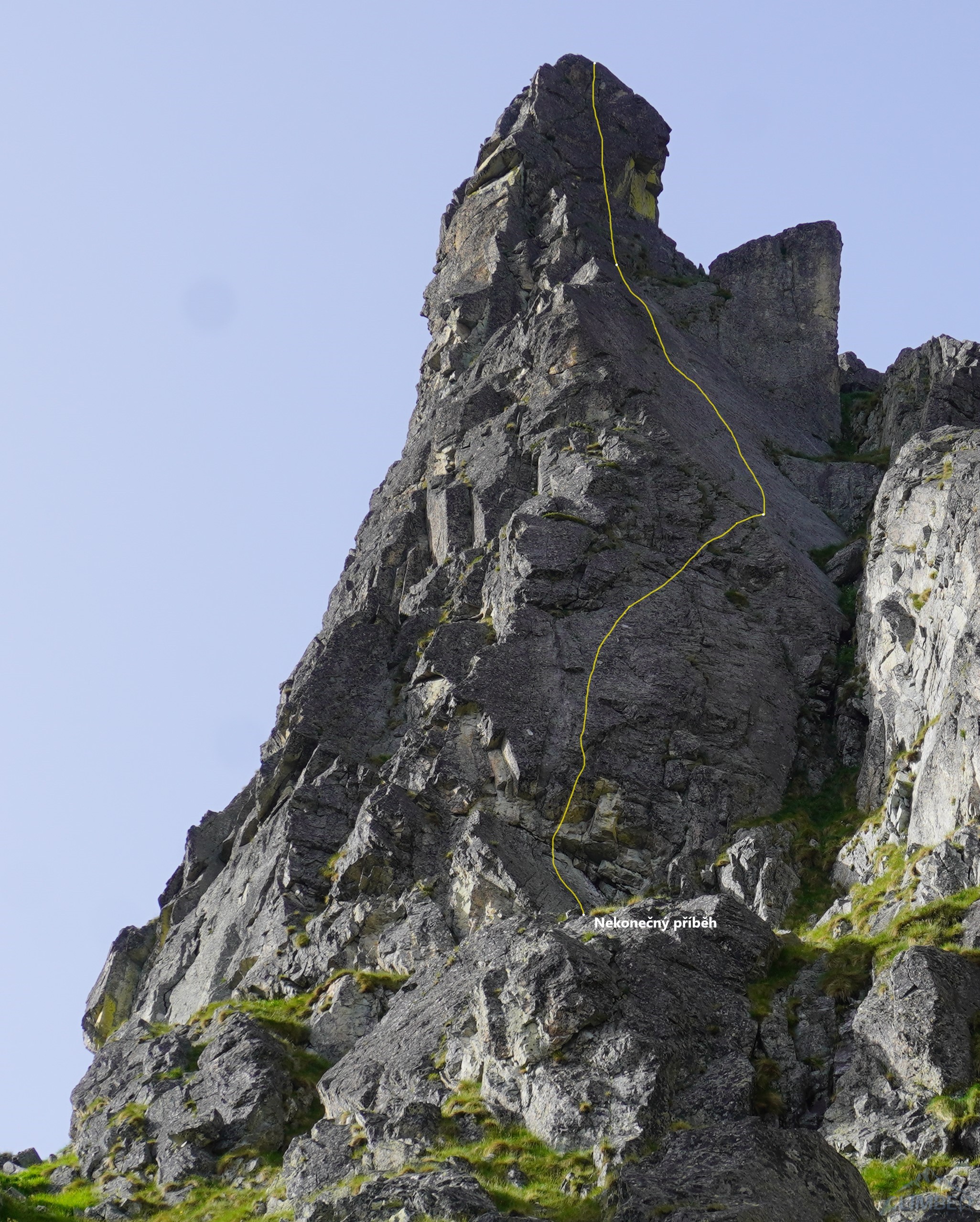 Po wyjściu ze ściany próbujemy zrealizować drugą część planu – przejść Nekonečný příběh (VIII+) czyli Niekończąca się opowieść na turni nad Basztą. Wizytówką drogi jest ogromna płyta, która od dawna rzucała mi się w oczy z podejścia do Terinki. Podchodzimy ok. 100 metrów trawami i zaczynamy wspinanie wzdłuż spitów (gęsto umieszczonych więc nie potrzeba własnego sprzętu). Pierwszy wyciąg to podejście połogiem do okapu, gdzie czekają trudności (VII) – Szymon nie trafia z sekwencją przy pierwszej próbie i zmienia go Bartek. Po przewinięciu idziemy ładnie urzeźbioną ścianą (ok. VI) do góry i skośnie w prawo do stanowiska pod daniem głównym, efektowną wielką płytą (VIII+) nazwaną przez nas lotniskiem.
