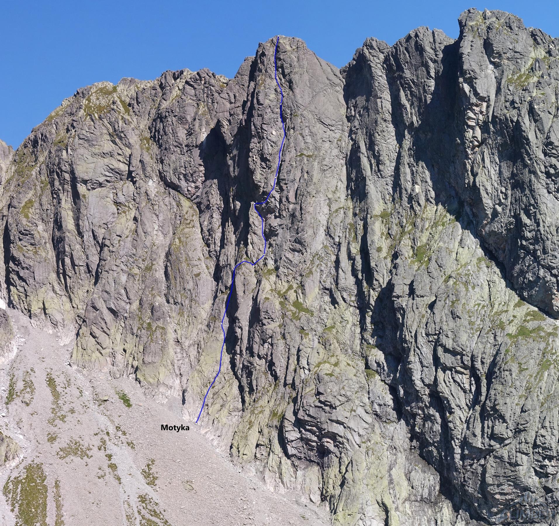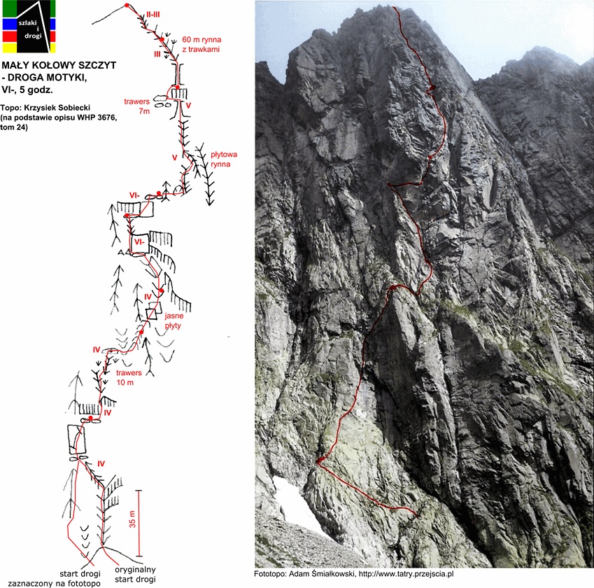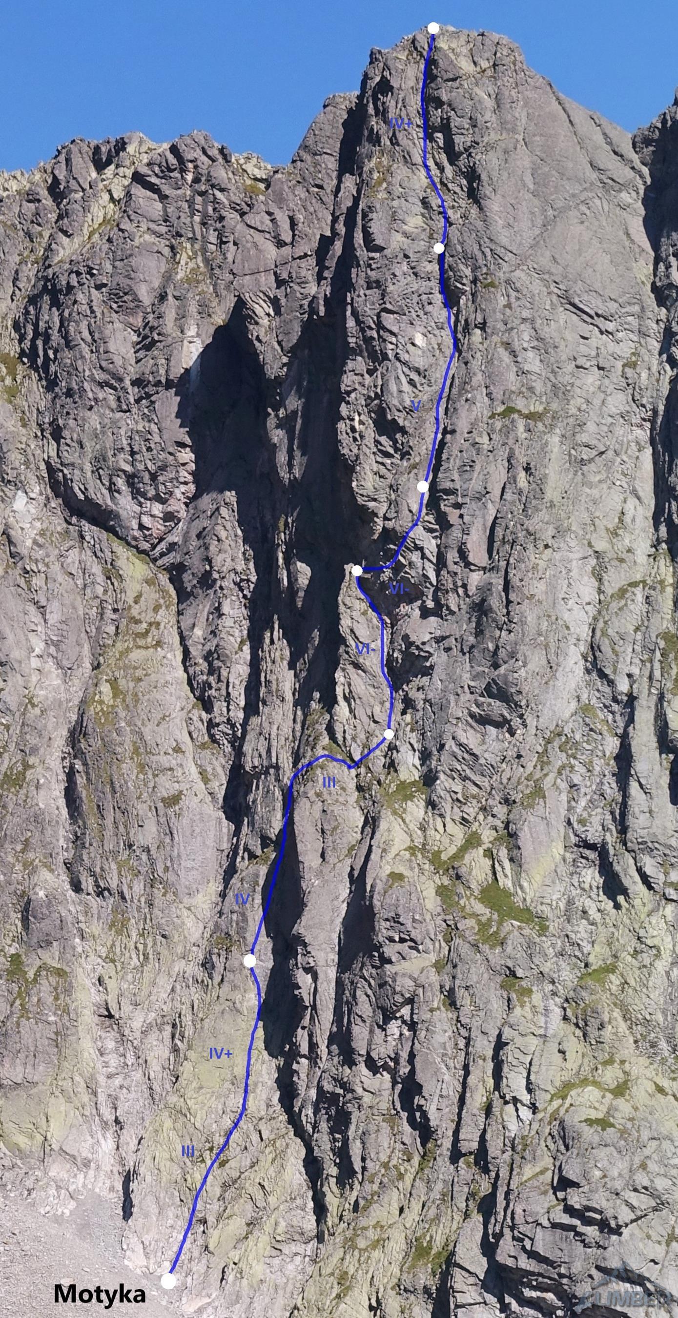 Droga Motyki (VI-) w dolnej części ściany mocno kluczy, a na wielu odcinkach prowadzi trawiastym lub kruchym terenem. Pierwszy wyciąg można robić płytami wprost (ok. IV+) lub łatwiej żeberkiem (III) po lewej stronie – wtedy pod koniec trawersujemy do dużej trawiastej półki z dwoma hakami. Tutaj koledzy puszczają nas przodem – drugi wyciąg zaczyna się zacięciem (IV), po którym czeka około 10 metrów nieprzyjemnego trawersu po trawach z obniżeniem w prawo i wejściem pod załupę opadającą spod przewieszek (jeden hak pod wejściem w trudności). Następny odcinek okazuje się jednym z bardziej stresujących jakie miałem okazję prowadzić w Tatrach – trochę z powodu mocno przegnitej i kruszącej się skały, trochę z powodu błędu jakim było zabranie jednego młotka. Mając dwie sztuki i kilka haków byłoby bezpieczniej, bez nich jest bardzo nieprzyjemnie – wcale nie łatwe wspinanie (VI-) przy iluzorycznej asekuracji (nieliczne stare skoby są w opłakanym stanie) w kruchej i mokrej skale dają psychiczny wycisk.