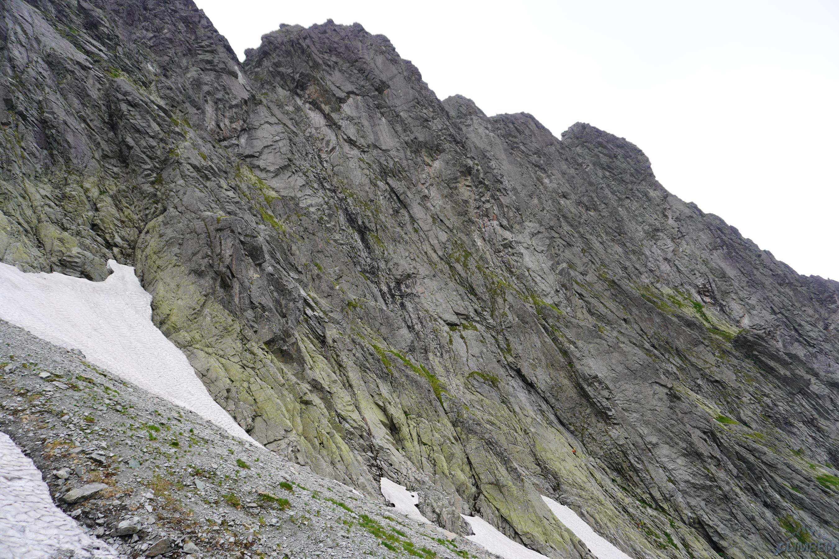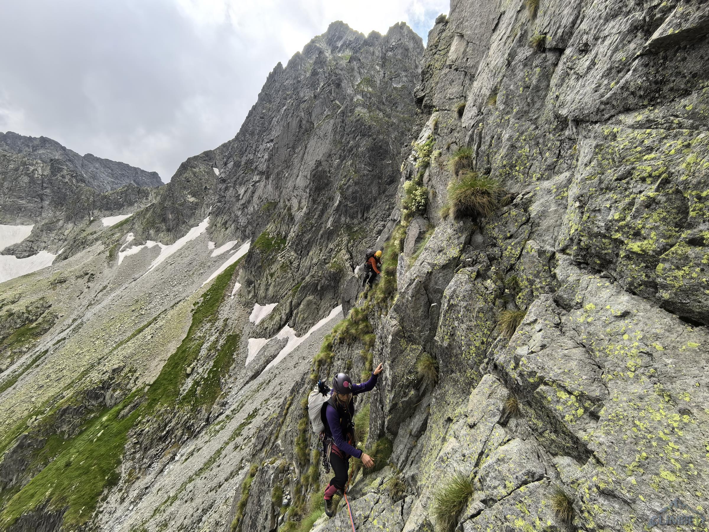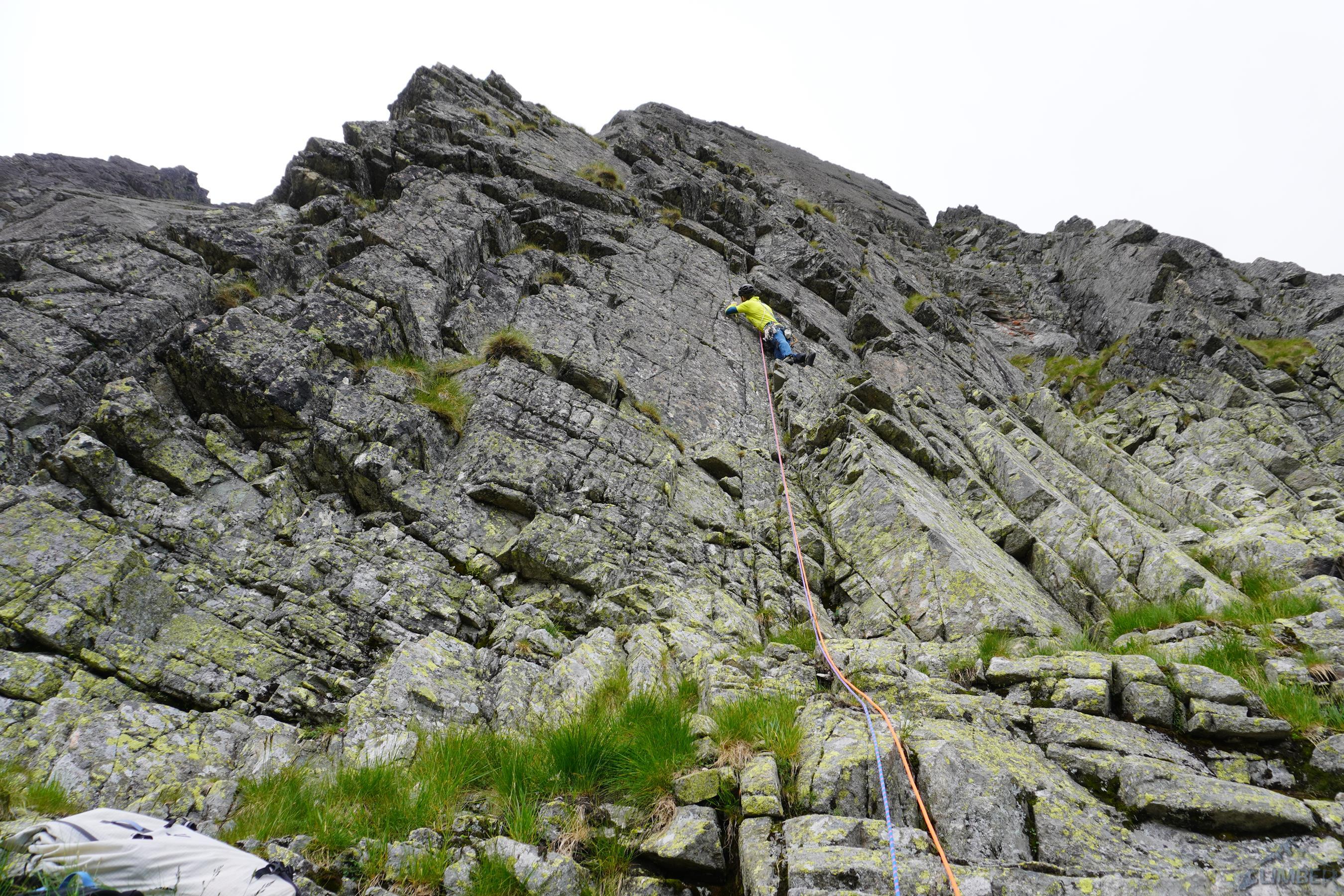 Droga Motyki (VI-) w dolnej części ściany mocno kluczy, a na wielu odcinkach prowadzi trawiastym lub kruchym terenem. Pierwszy wyciąg można robić płytami wprost (ok. IV+) lub łatwiej żeberkiem (III) po lewej stronie – wtedy pod koniec trawersujemy do dużej trawiastej półki z dwoma hakami. Tutaj koledzy puszczają nas przodem – drugi wyciąg zaczyna się zacięciem (IV), po którym czeka około 10 metrów nieprzyjemnego trawersu po trawach z obniżeniem w prawo i wejściem pod załupę opadającą spod przewieszek (jeden hak pod wejściem w trudności). Następny odcinek okazuje się jednym z bardziej stresujących jakie miałem okazję prowadzić w Tatrach – trochę z powodu mocno przegnitej i kruszącej się skały, trochę z powodu błędu jakim było zabranie jednego młotka. Mając dwie sztuki i kilka haków byłoby bezpieczniej, bez nich jest bardzo nieprzyjemnie – wcale nie łatwe wspinanie (VI-) przy iluzorycznej asekuracji (nieliczne stare skoby są w opłakanym stanie) w kruchej i mokrej skale dają psychiczny wycisk.