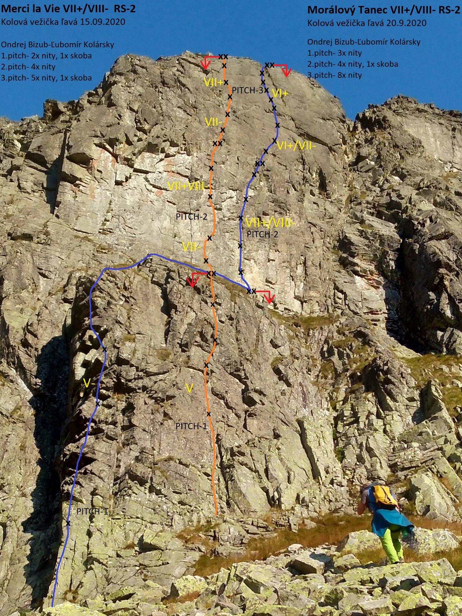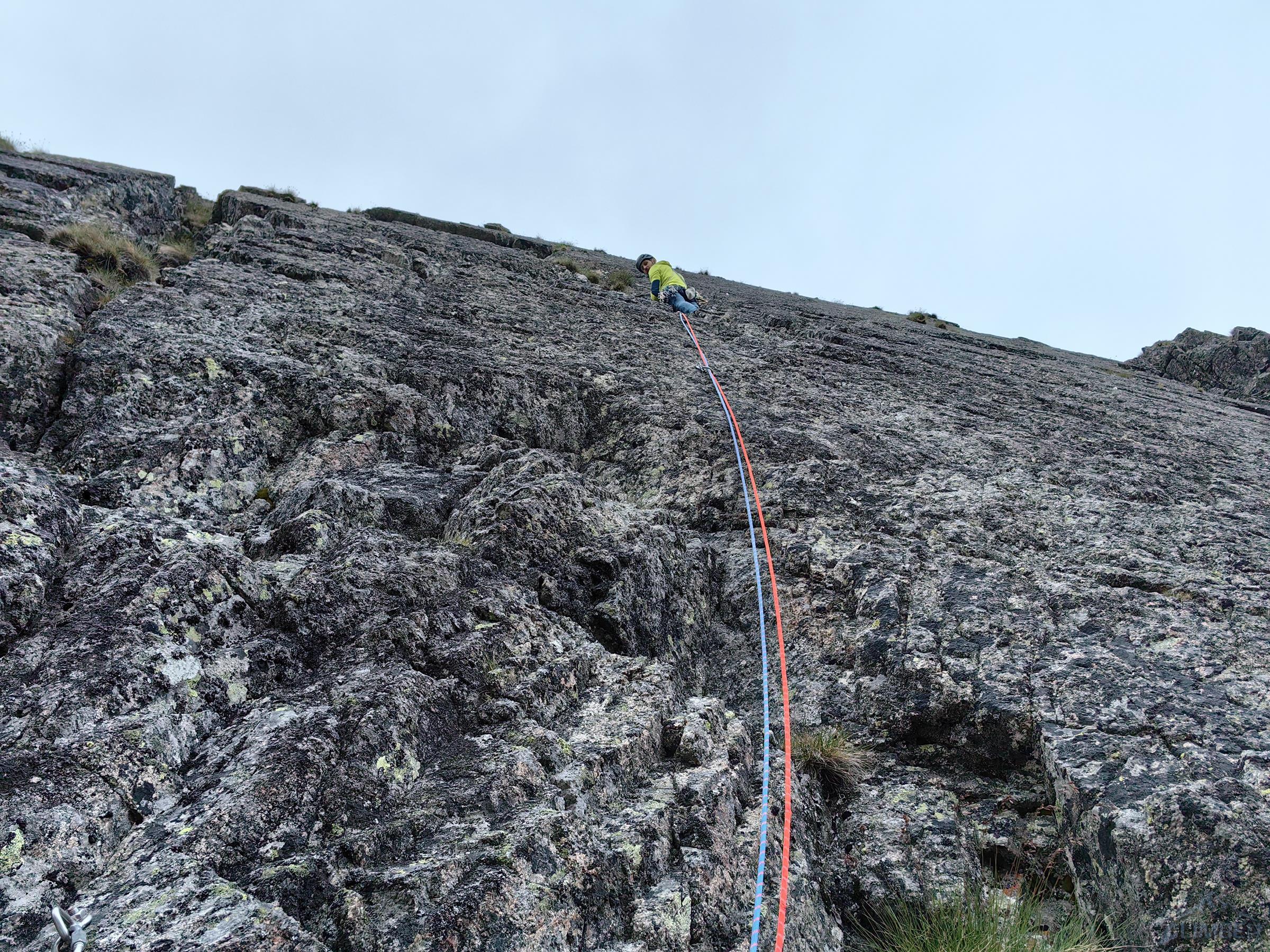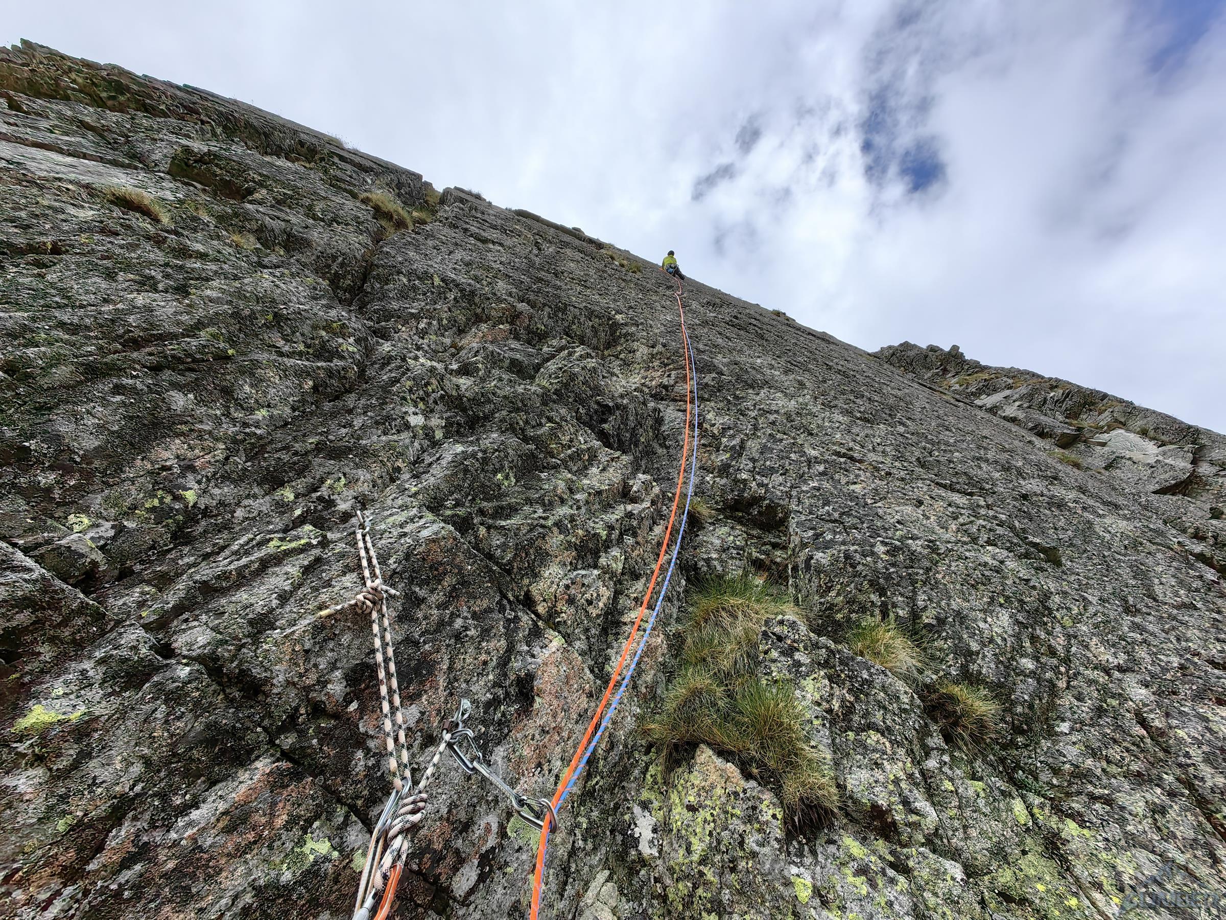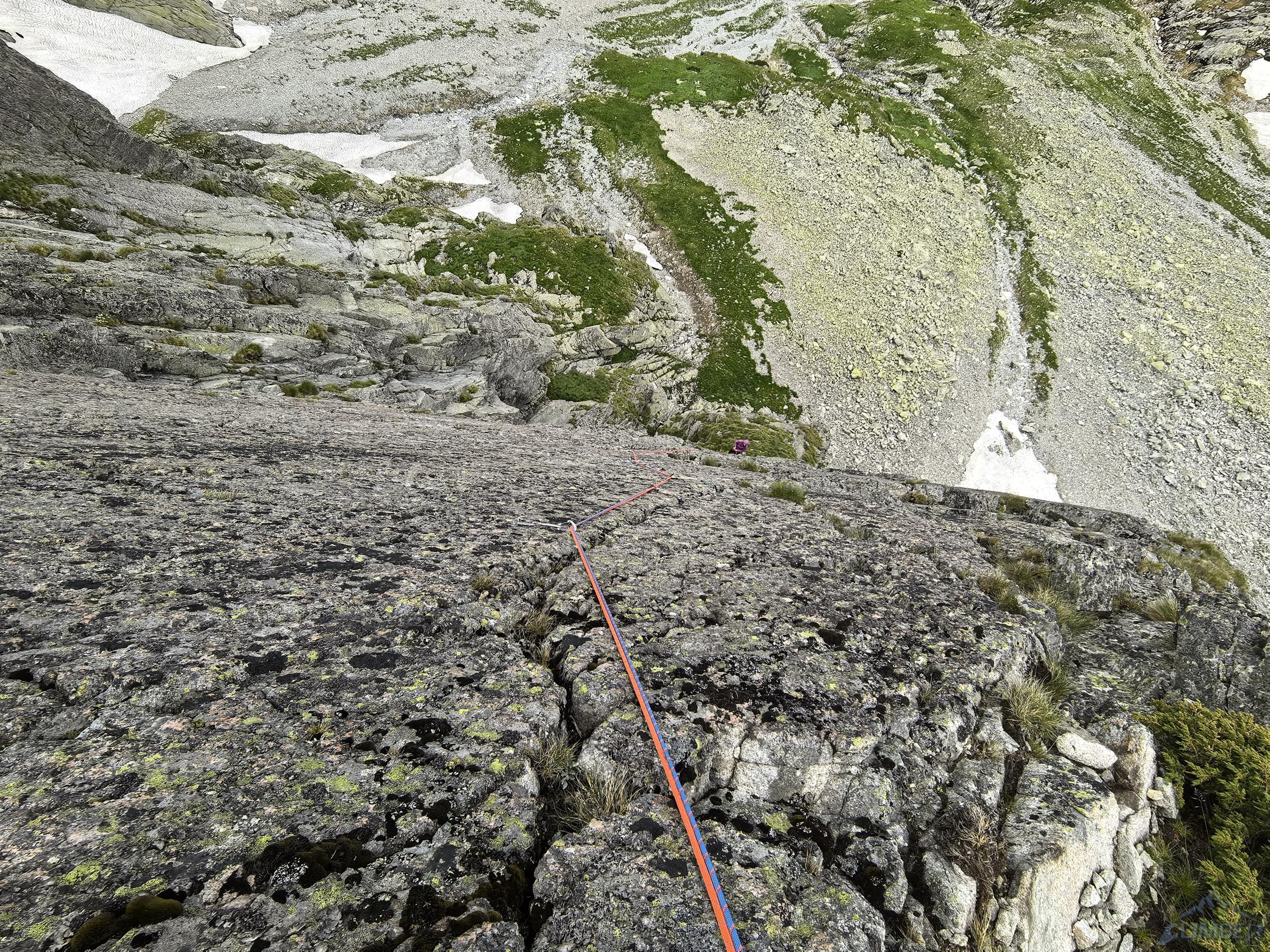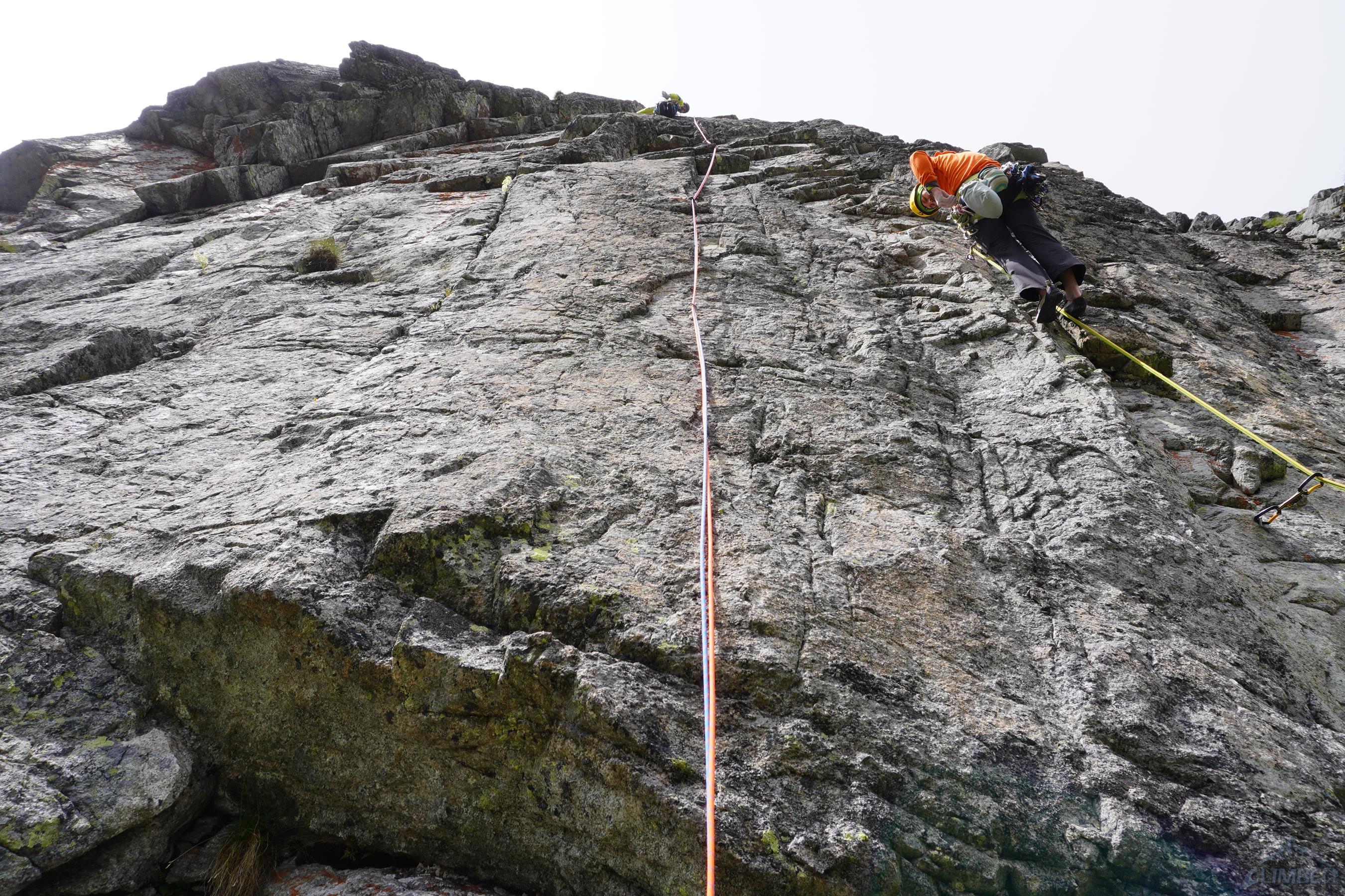 Po dotarciu do w miarę dobrego stanowiska na filarku (3 haki) czeka odcinek kluczowy – trawers między przewieszkami (VI-) z odważnym przewinięciem do zacięcia (V) którym dochodzimy do rynny opadającej spod szczytu. Tutaj droga łączy się ze znaną mi już Slamą (RELACJA) – zdecydowanie bardziej polecam ją ze względu na jakość skały i ciekawszy dół! Do końca pozostają dwa długie wyciągi z nadal wymagającą asekuracją, pierwszy z nich kończy się obejściem przewieszki (V, wprost VI), drugi płytowymi zacięciami (ok. IV+) wyprowadza wprost na wierzchołek. Gdy dociera do mnie Ania jej mina mówi wszystko – nie chciała iść na tą drogą obawiając się kruszyzny… Koledzy kończą dużo później po nas i mają podobne wrażenia, nawet po częściowym oczyszczeniu przez nas wielu kruchych stopni i chwytów nadal urywali kolejne…