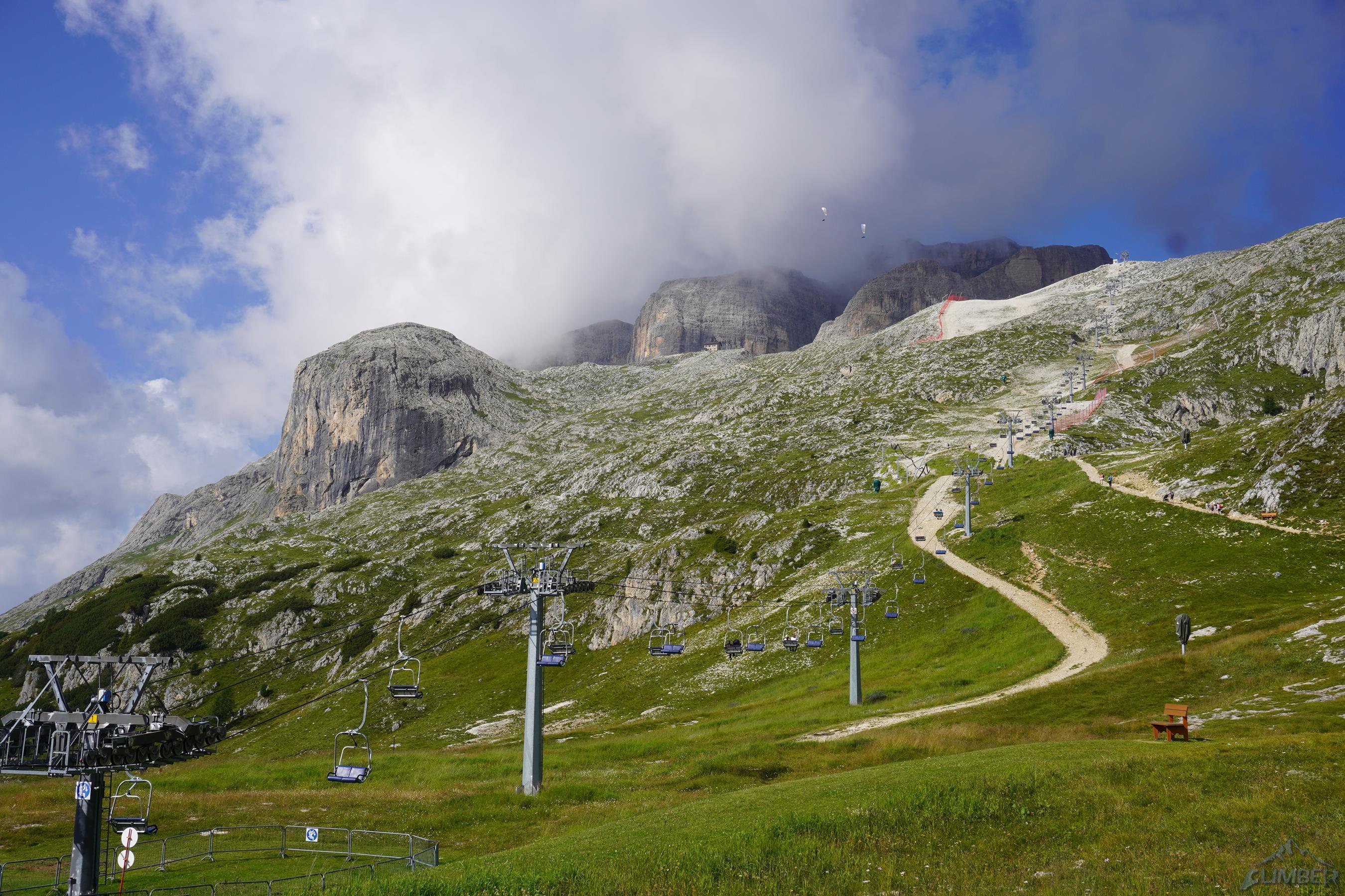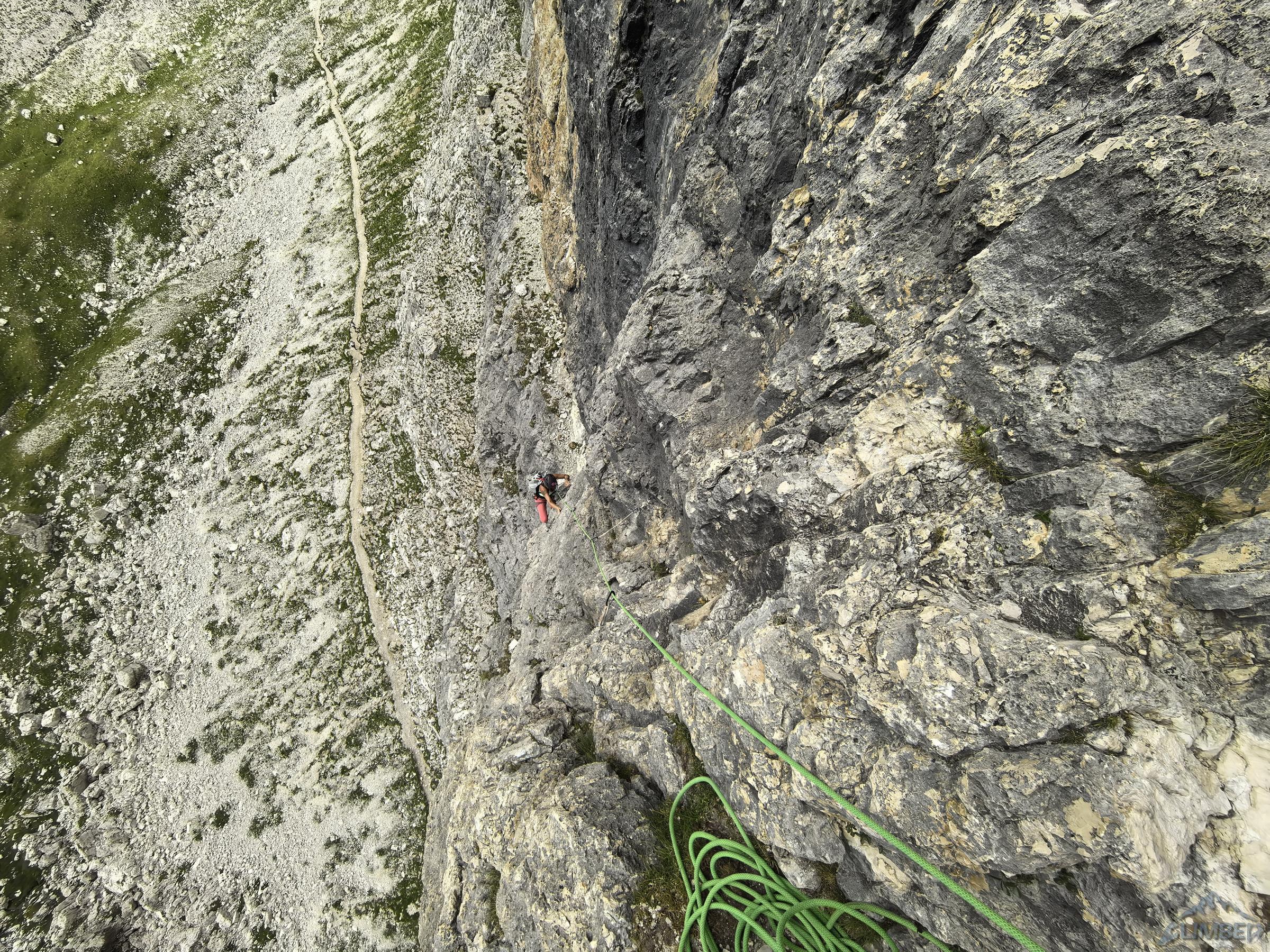 Dzień po przejściu świetnego Ottovolante (RELACJA) wyszukuję w naszej okolicy coś łatwiejszego dla rozmasowania przedramion 😊. Idealnie na tą okazję nadaje się jedna z ładniejszych obitych linii w tym stopniu trudności w Dolomitach – Gino Bellumat (6a+ 175m) na Pala delle Guide. Droga jest zaskakująco atrakcyjna i lita, a do przepięknej doliny Vallon warto wyjechać kolejką z Corvary chociażby dla samych widoków! Wspinania w niej zresztą nie brakuje – przy stacji pośredniej są drogi na Col de Stagn, na górze m.in. na Cima Vallon czy w efektownym amfiteatrze skalnym Sasso delle Nove-Sass delle Dieci-Piz da Lech (po rekomendacje odsyłam do listy polecanych dróg TUTAJ).