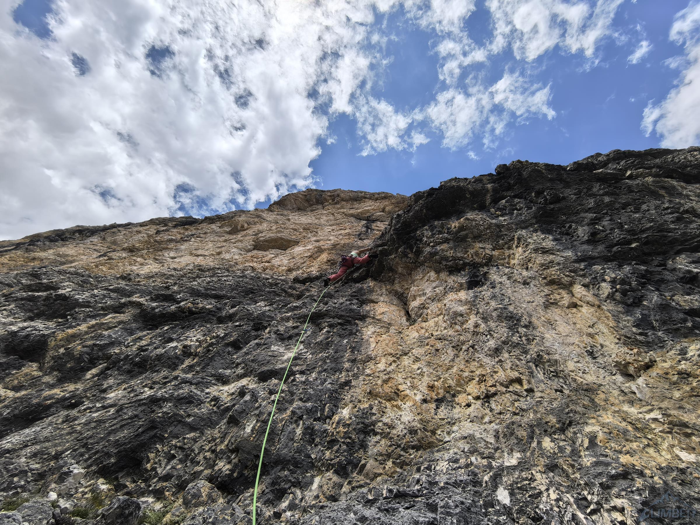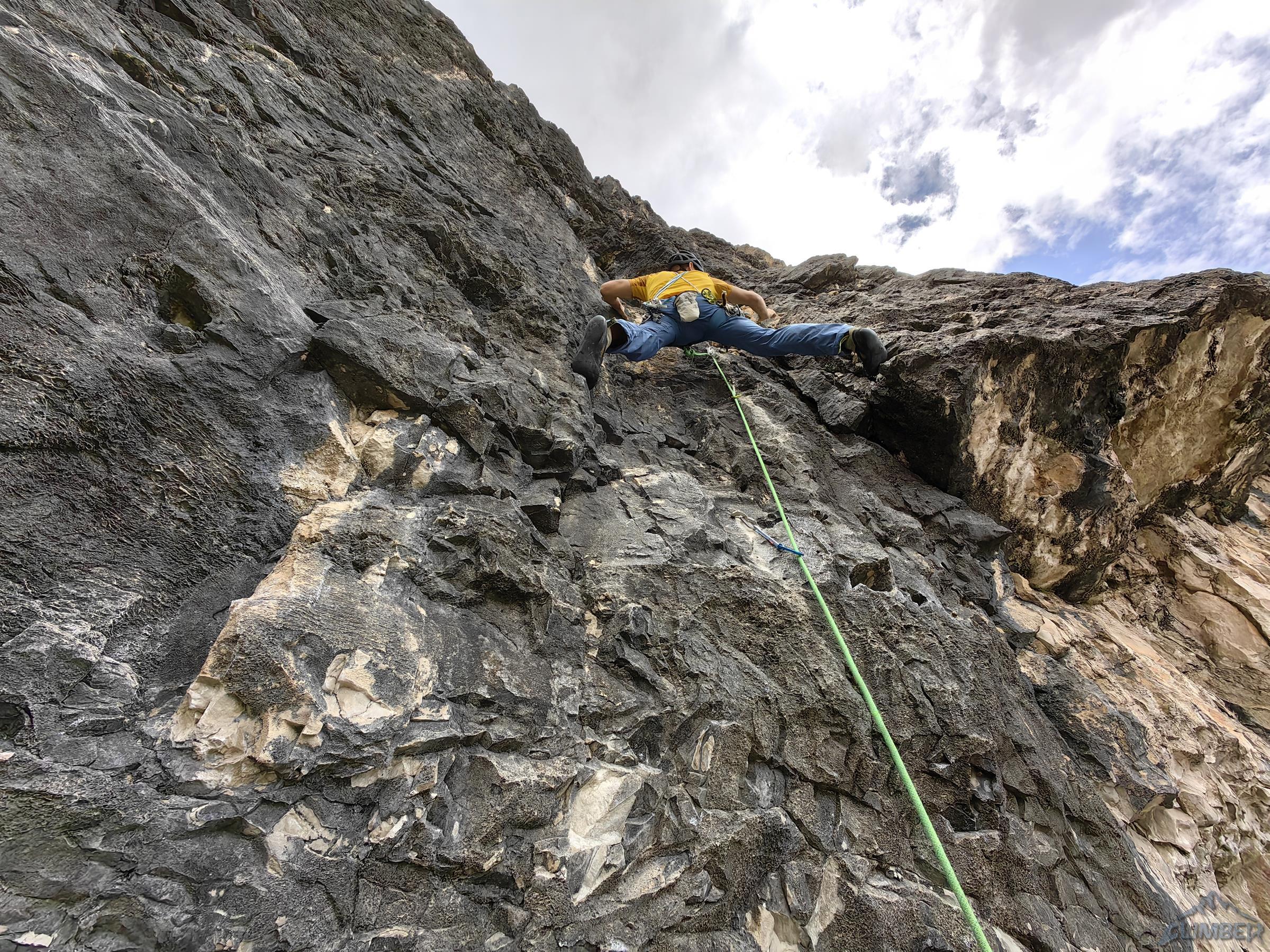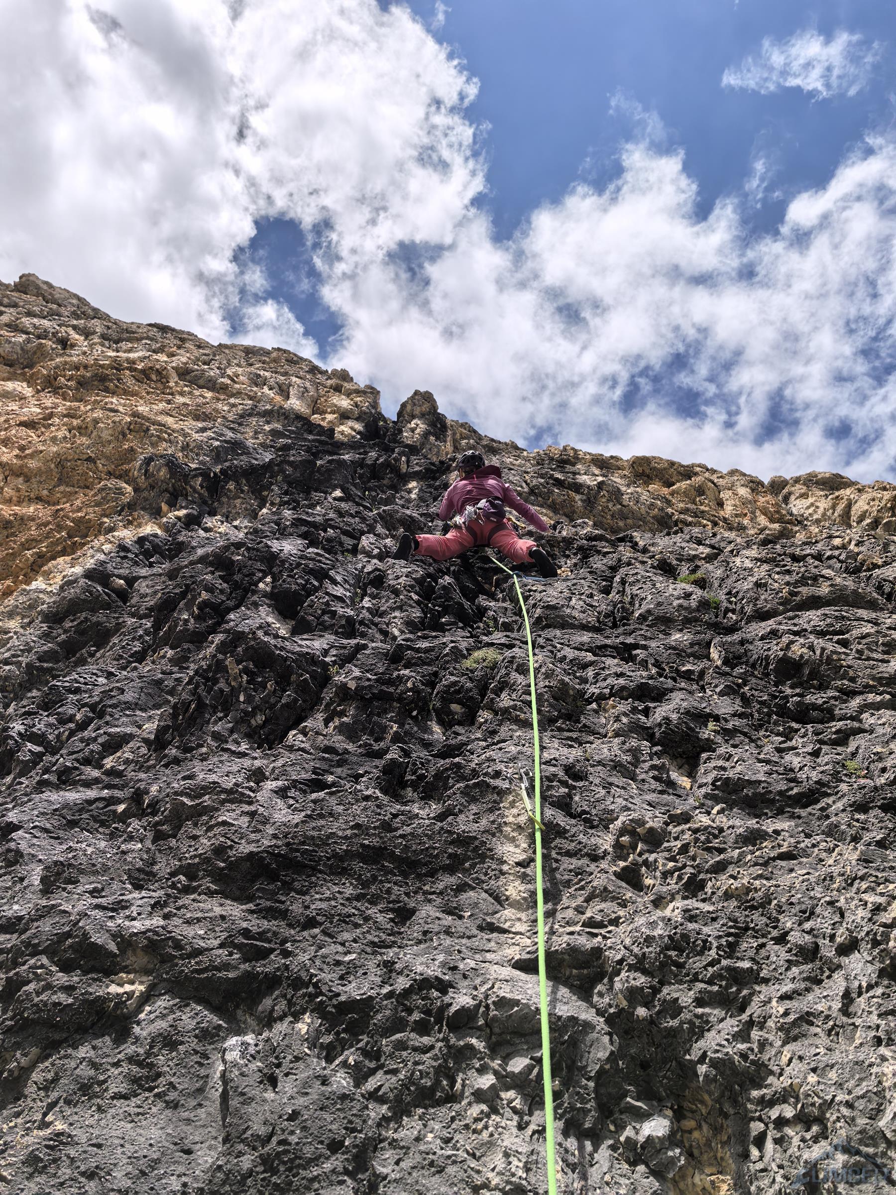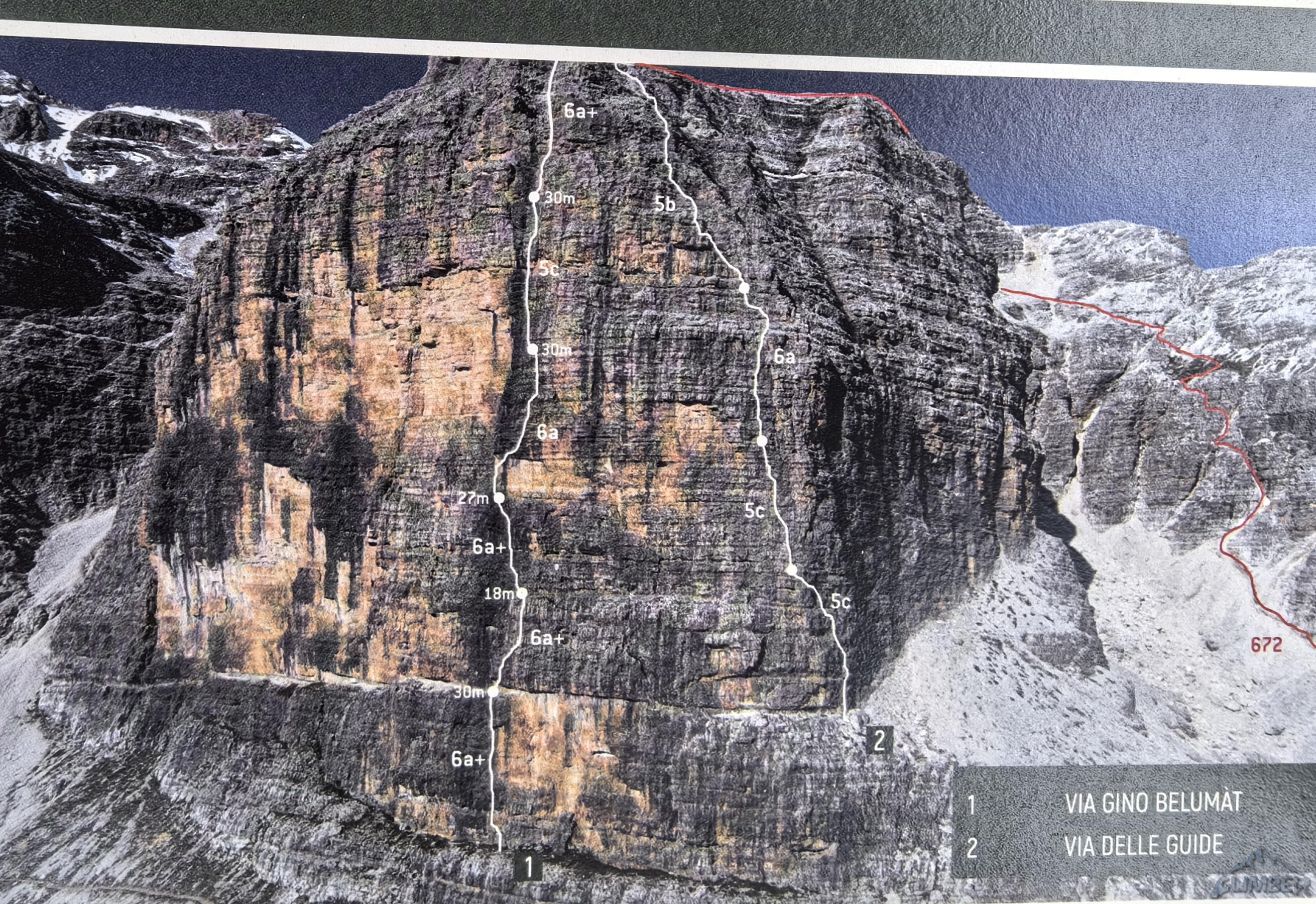 By dostać się pod Pala delle Guide idziemy spacerem ok. 15 minut – ściana zlokalizowana jest naprzeciwko schroniska Kostner, do którego wstąpimy po wspinaniu na obiad i piwo 😊. Gino Bellumat startuje z półki ok. 20m nad ścieżką i biegnie wyraźnym czarnym pasem litej skały na prawo od żółtej skały. Pierwszy wyciąg (6a) to trawers pod przewieszką w lewo, a następnie wspinanie wprost do góry estetyczną płytą i odbicie w prawo do stanowiska. Na starcie drugiego odcinka (6a/a+) czeka siłowy fragment, po którym idziemy skośnie w prawo do półki.
