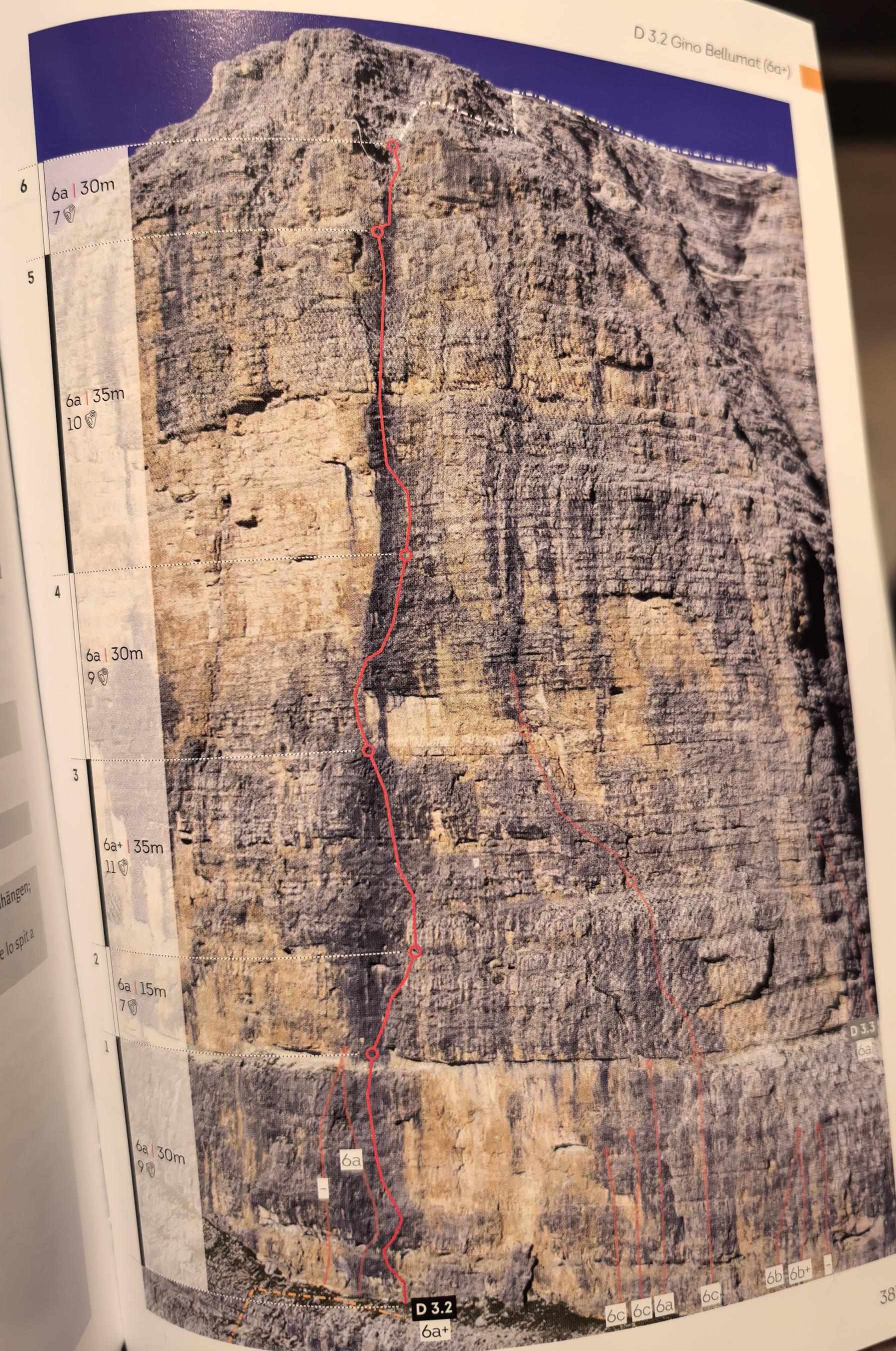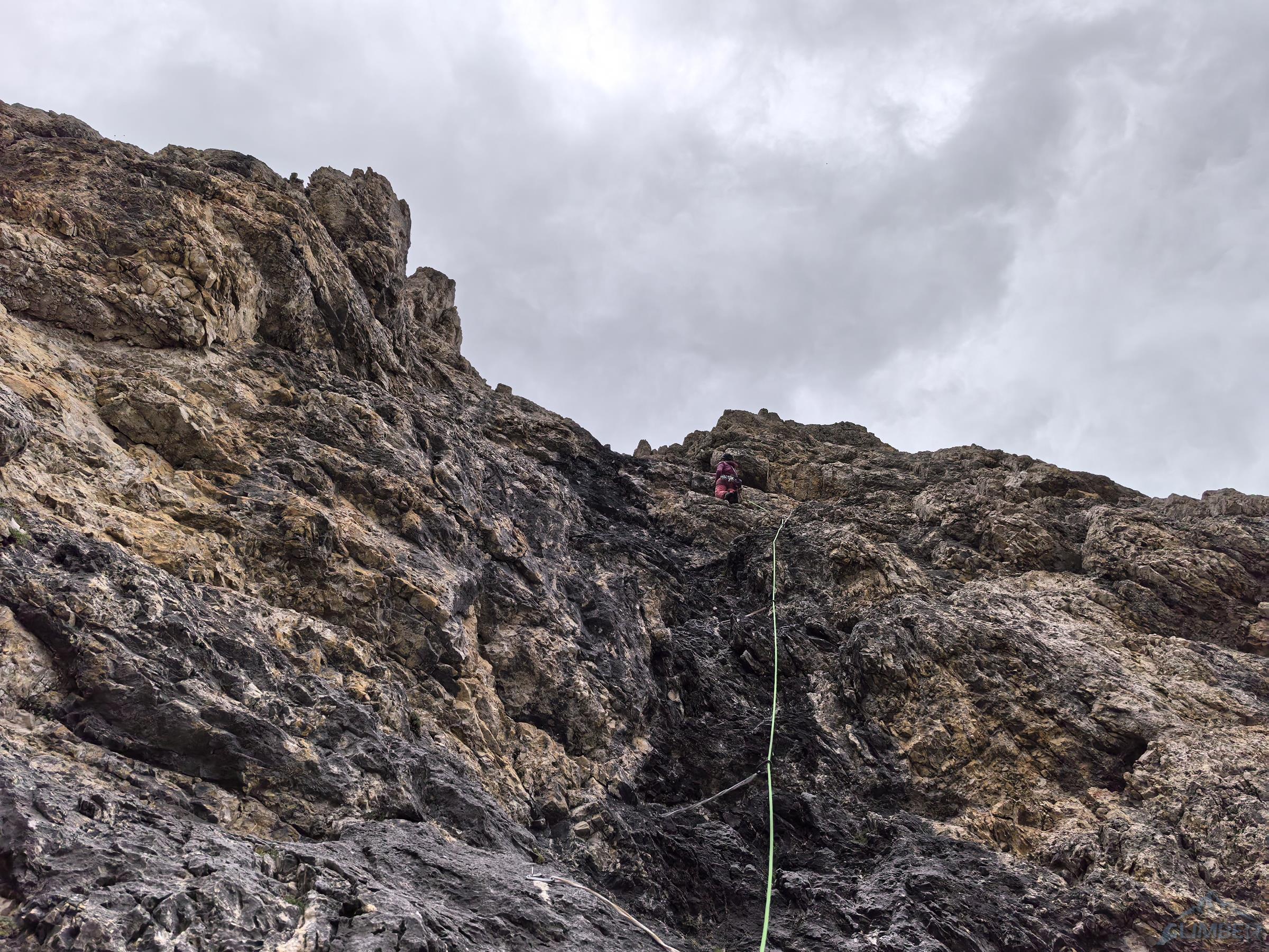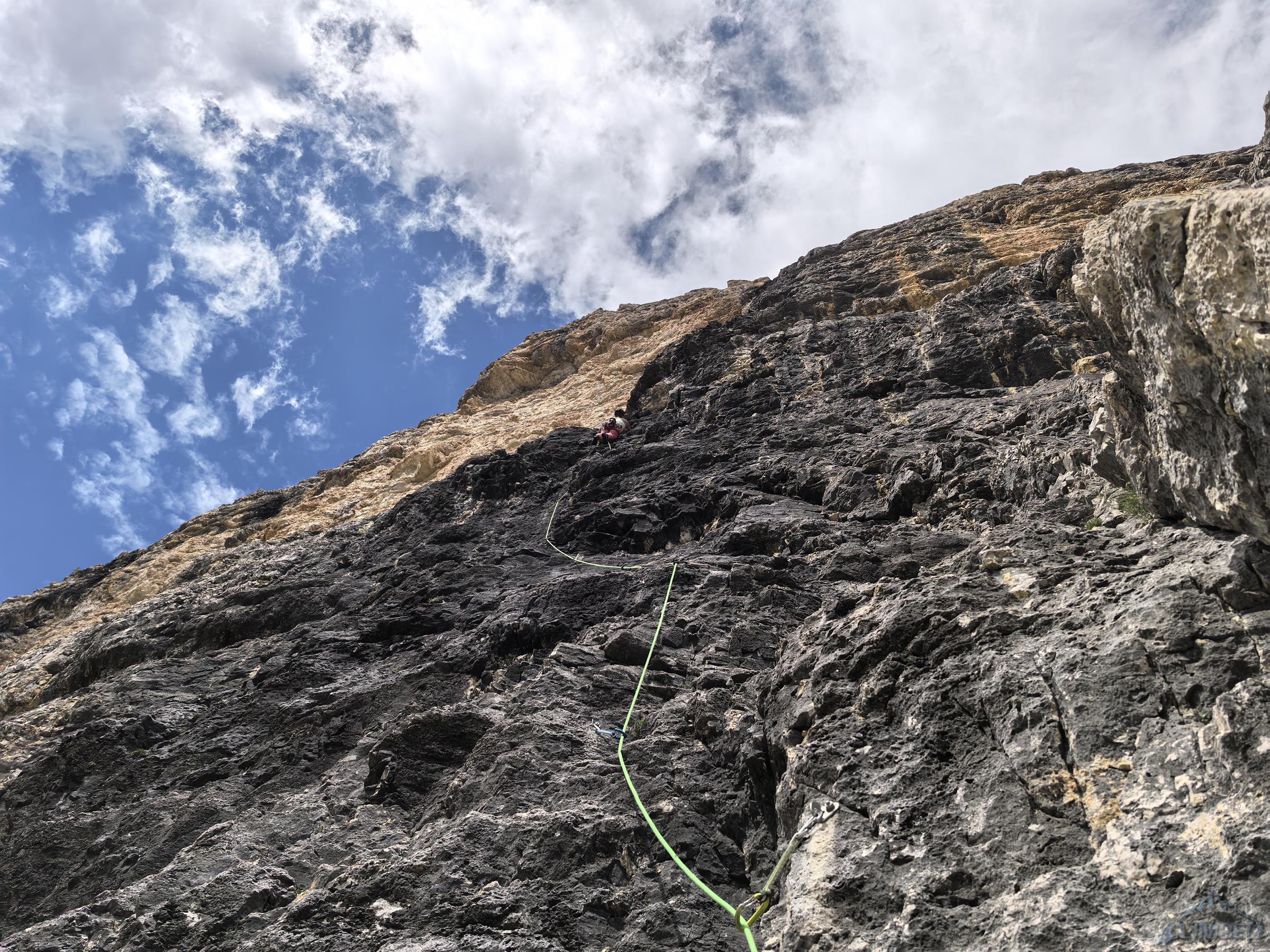 By dostać się pod Pala delle Guide idziemy spacerem ok. 15 minut – ściana zlokalizowana jest naprzeciwko schroniska Kostner, do którego wstąpimy po wspinaniu na obiad i piwo 😊. Gino Bellumat startuje z półki ok. 20m nad ścieżką i biegnie wyraźnym czarnym pasem litej skały na prawo od żółtej skały. Pierwszy wyciąg (6a) to trawers pod przewieszką w lewo, a następnie wspinanie wprost do góry estetyczną płytą i odbicie w prawo do stanowiska. Na starcie drugiego odcinka (6a/a+) czeka siłowy fragment, po którym idziemy skośnie w prawo do półki.