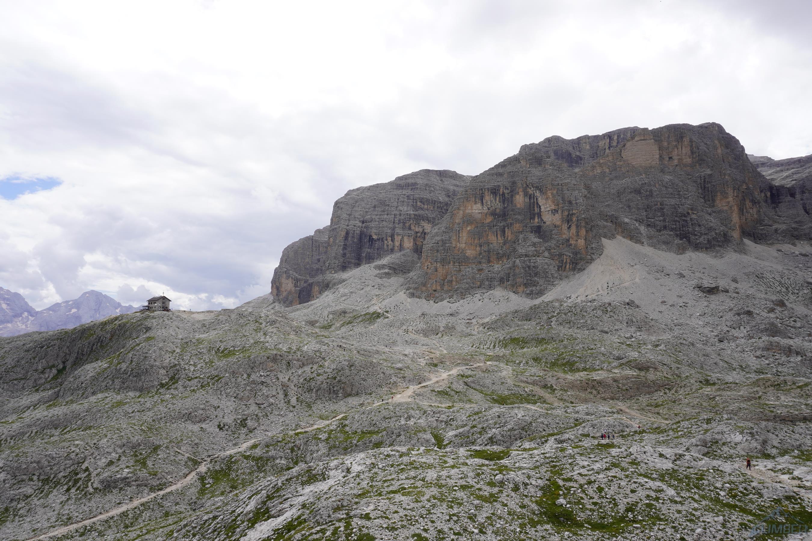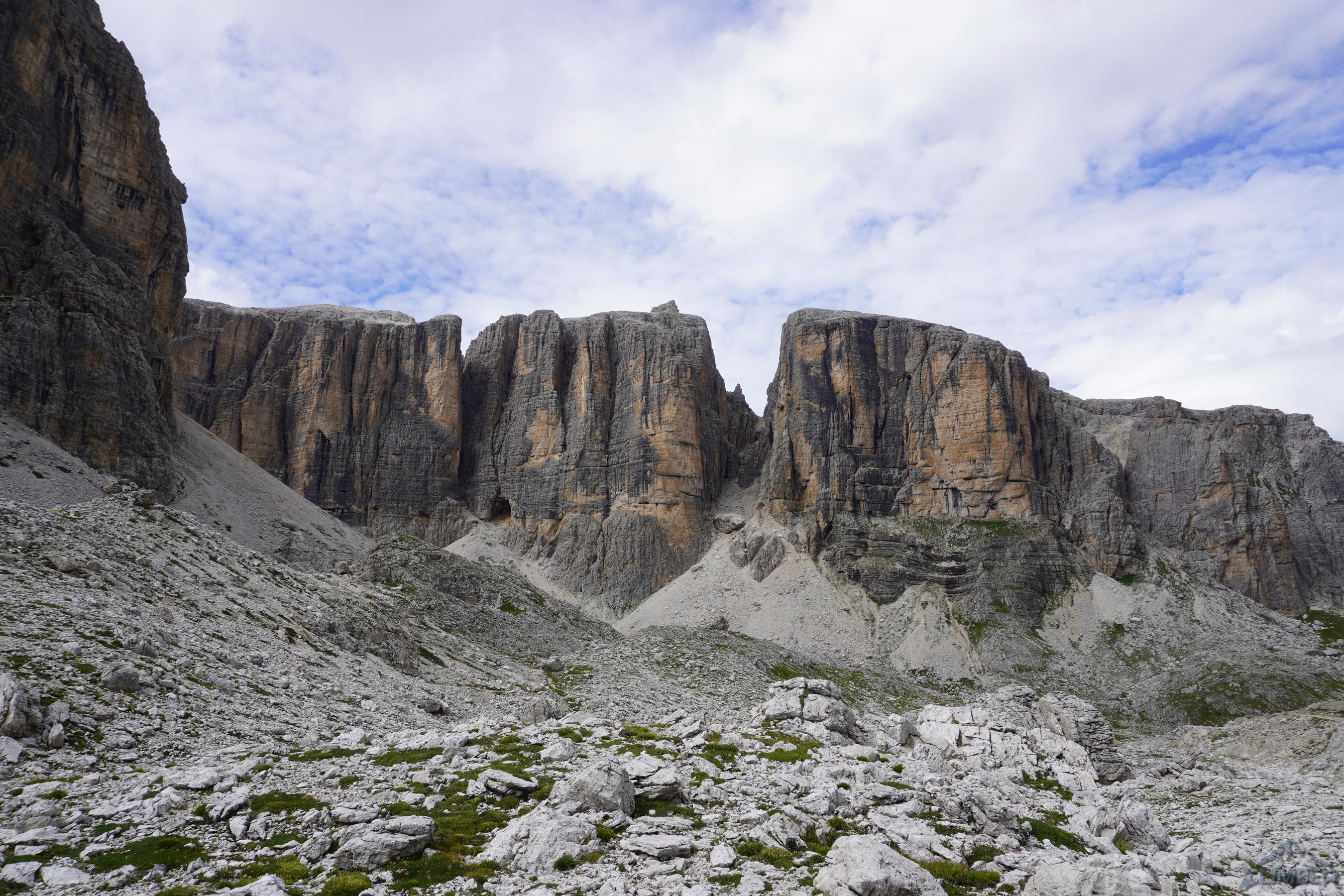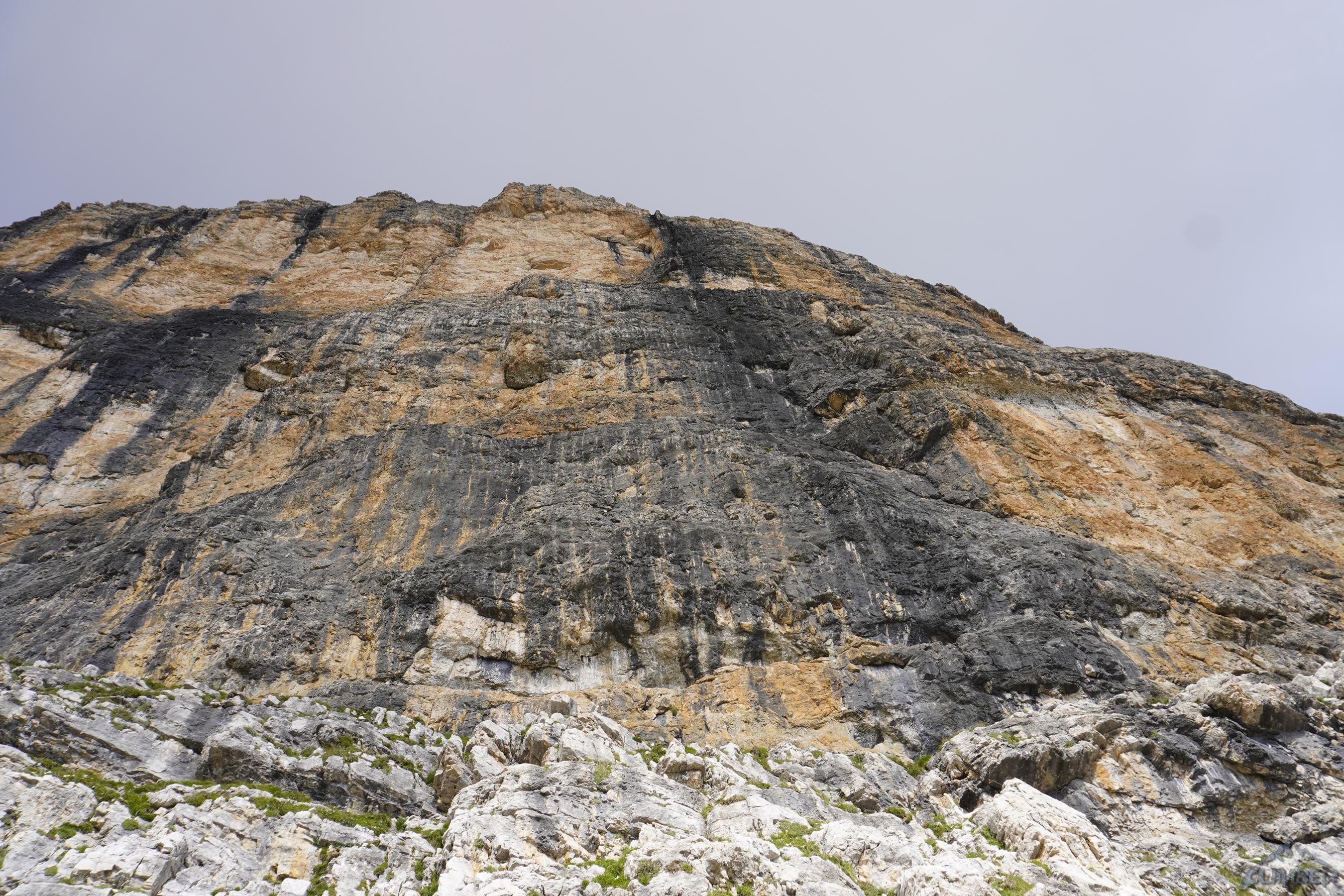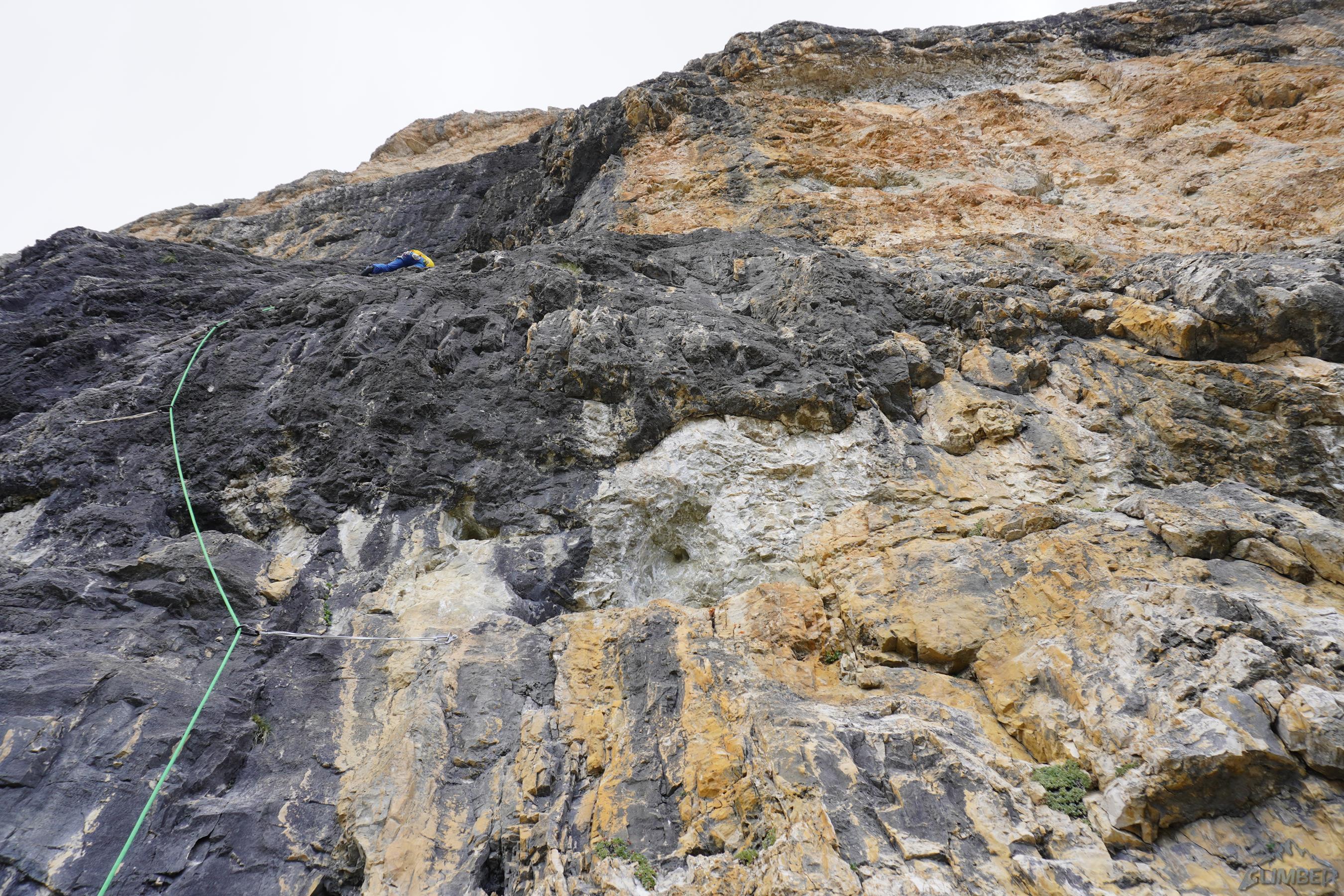 By dostać się pod Pala delle Guide idziemy spacerem ok. 15 minut – ściana zlokalizowana jest naprzeciwko schroniska Kostner, do którego wstąpimy po wspinaniu na obiad i piwo 😊. Gino Bellumat startuje z półki ok. 20m nad ścieżką i biegnie wyraźnym czarnym pasem litej skały na prawo od żółtej skały. Pierwszy wyciąg (6a) to trawers pod przewieszką w lewo, a następnie wspinanie wprost do góry estetyczną płytą i odbicie w prawo do stanowiska. Na starcie drugiego odcinka (6a/a+) czeka siłowy fragment, po którym idziemy skośnie w prawo do półki.