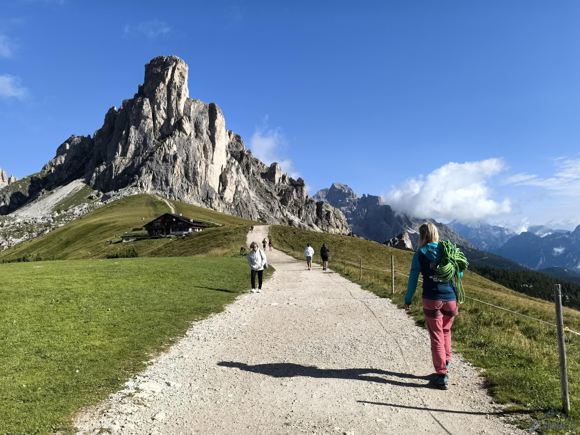 Po nocnej ulewie opóźniamy z Romkiem wyjście na główny cel obozu (Hasse Brandler na Cimie) o jeden dzień, mogę więc zrobić dodatkową drogę z Anią. Z listy najładniejszych dolomitowych wielowyciągów wyciągam coś na czym się nie "zajadę", a partnerka będzie miała wyzwanie. Mamma e Papà (6c+ 320m) tuż przy Passo Giau świetnie spełnia te założenia – krótkie podejście pod efektowną turnię, stała asekuracja i przyjemne wspinanie głównie do 6a z kilkumetrowym trudniejszym fragmentem (odczuwalnie raczej 6b+/6c). Polecam nie tylko dla przystępnej cyfry ale przede wszystkim dla naprawdę fajnego wspinania z pięknymi widokami!