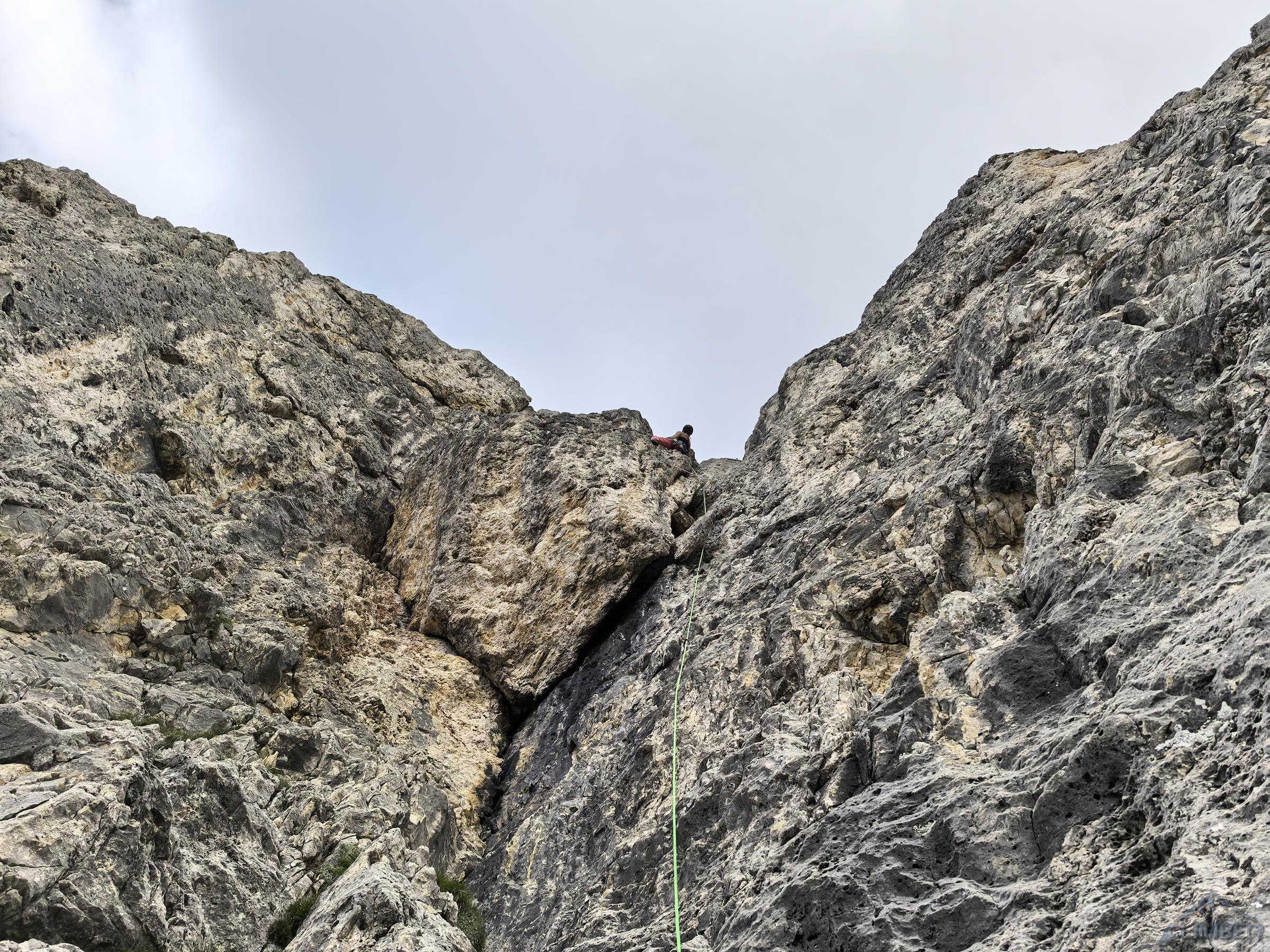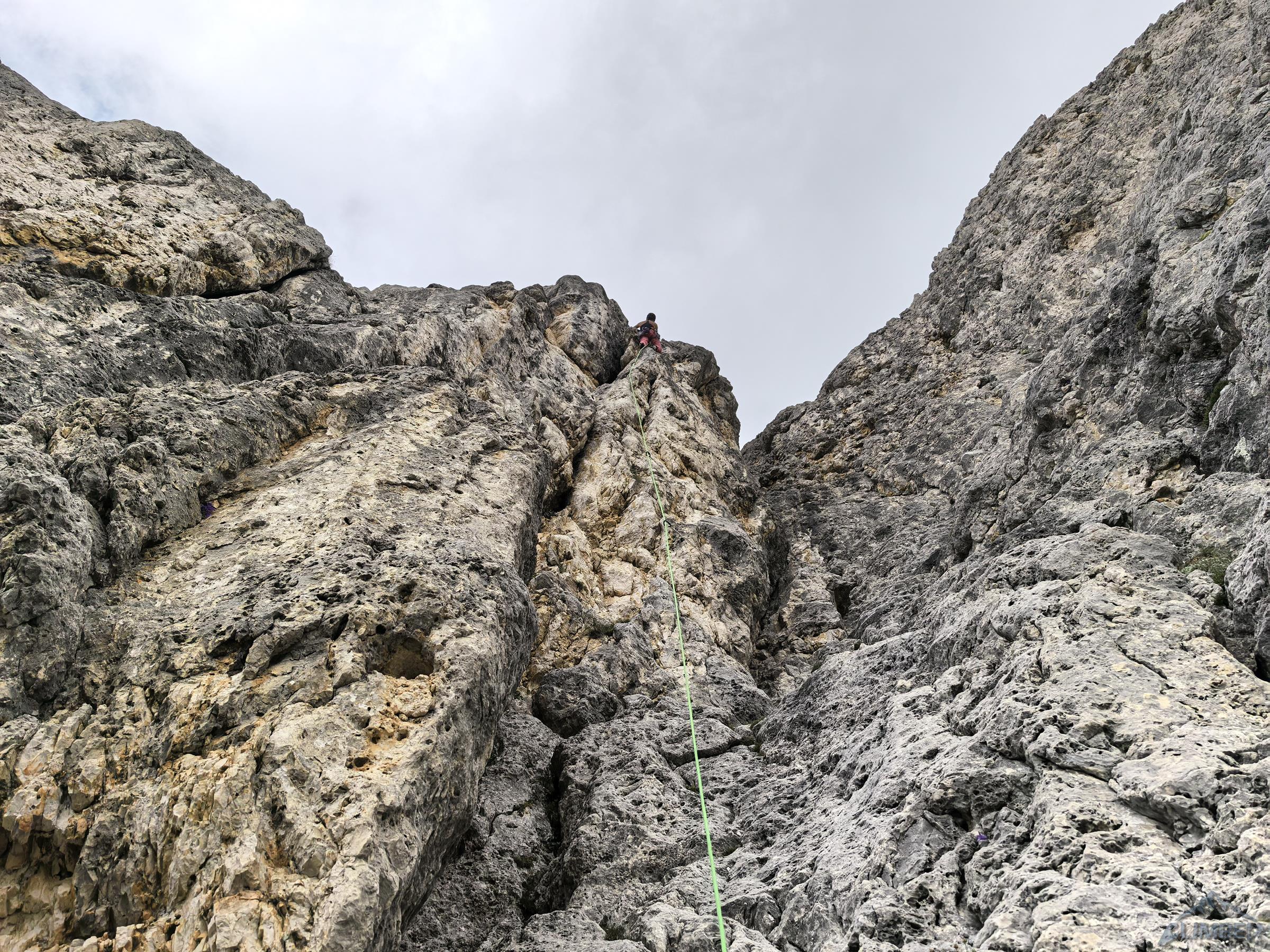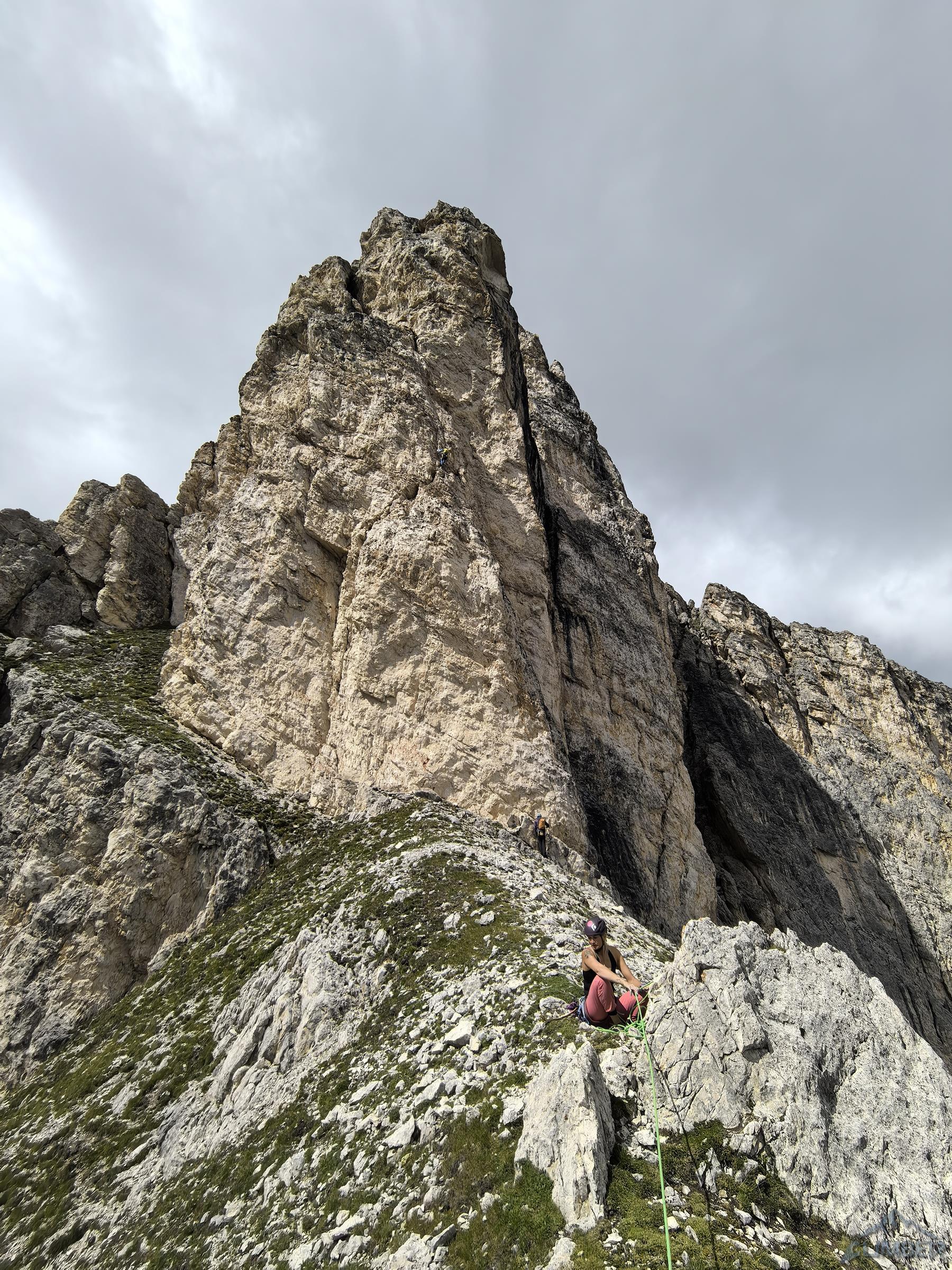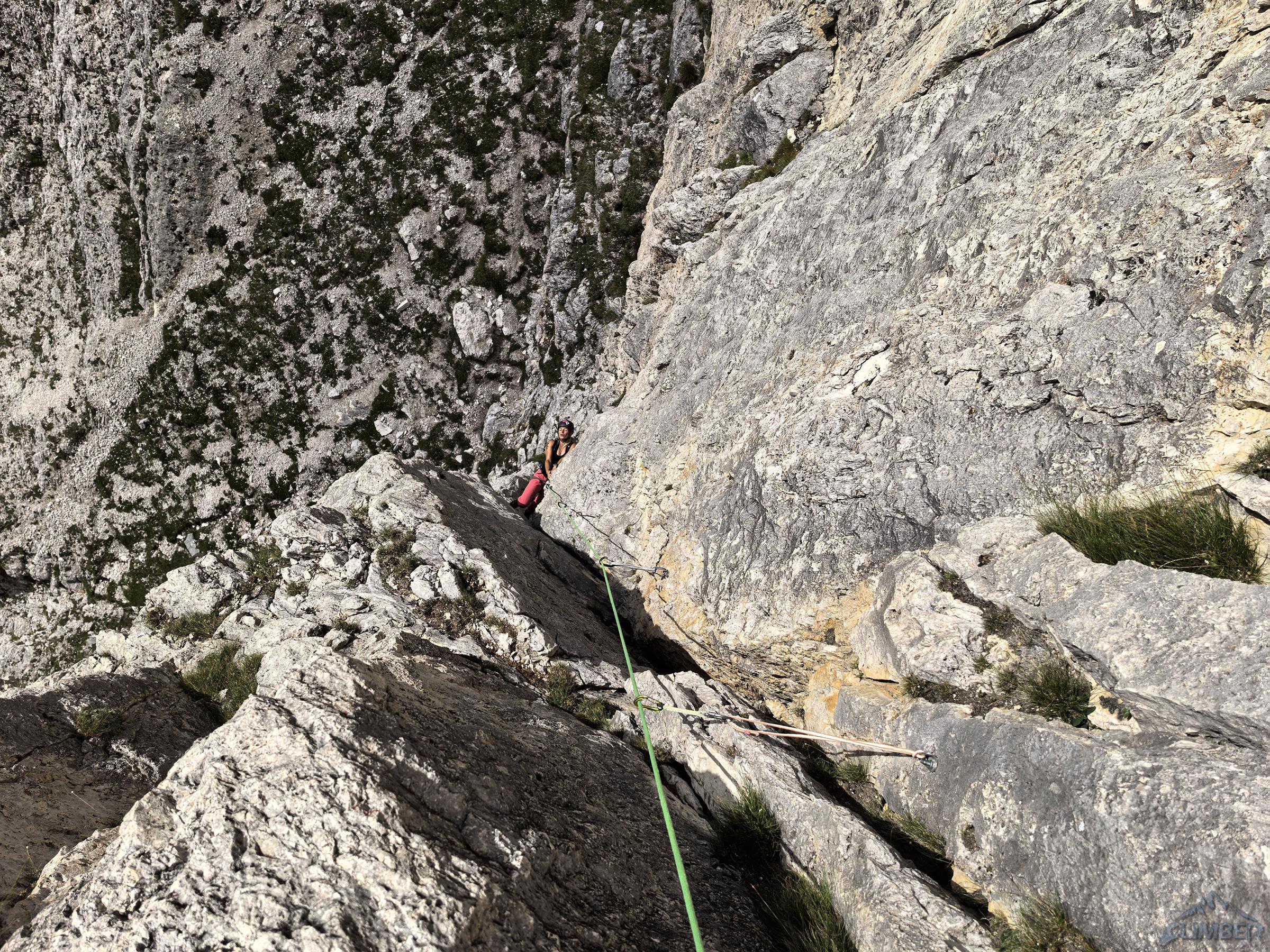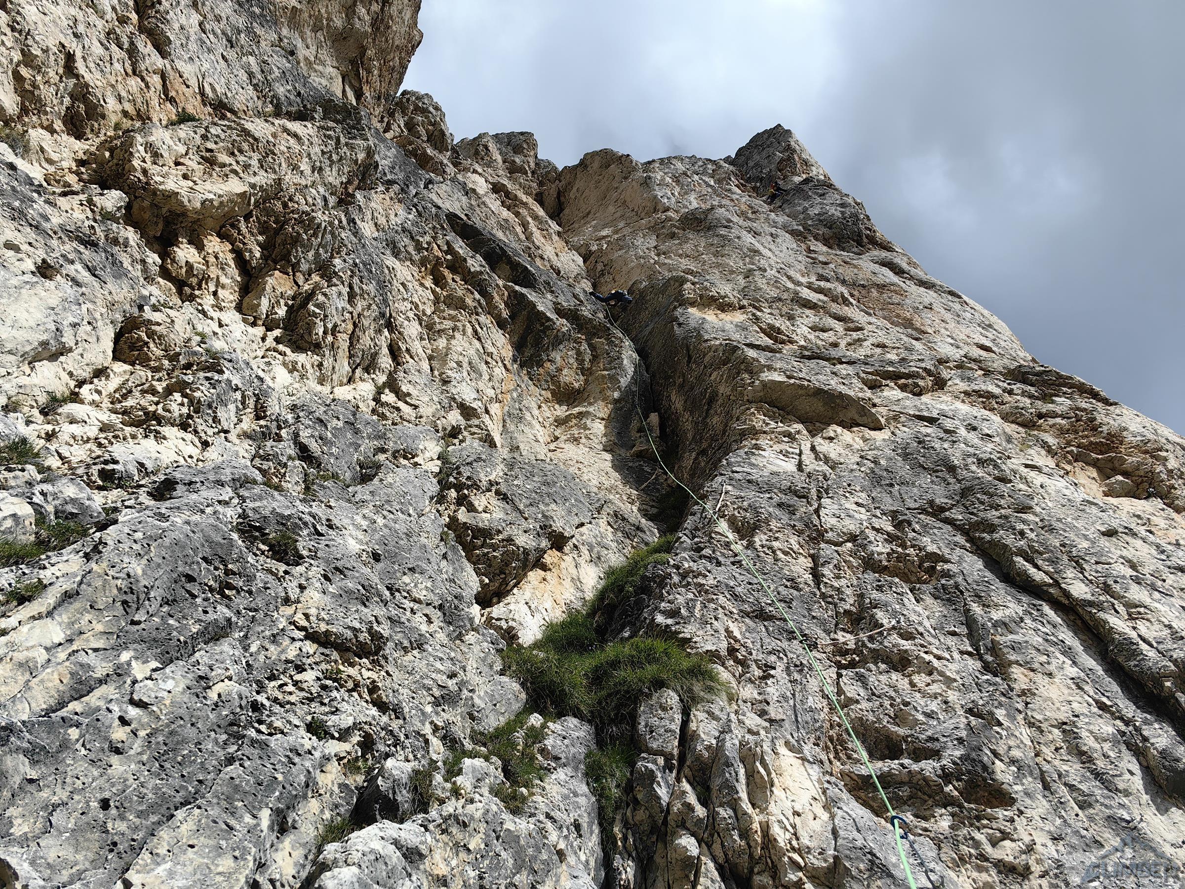 Pod prezentującą się świetnię „rakietę” Ra Gusela z parkingu na przełęczy czeka nas zaledwie 20-minutowy spacer, nawet nie pakujemy liny (pojedynczej) tylko bierzemy ją do ręki. By dostać się pod start drogi wychodzimy przez skalny próg na trawiastą rampę przecinającą podstawę imponującego żółtego filara, taką miniaturką Spigolo Giallo na Małej Cimie 😊. Pierwszy wyciąg (6a) prowadzi wyraźnym zacięciem z lewej strony – wypatrujemy spitów. Wygląda intensywnie, dlatego też Ania by rozgrzać się przed resztą drogi puszcza mnie przodem – okazuje się bardziej technicznie niż siłowo ale i całkiem zajmująco. Drugi odcinek (5b) jest już wyraźnie łatwiejszy, kontynuujemy wzdłuż zacięcia i trawersujemy mocno w prawo.