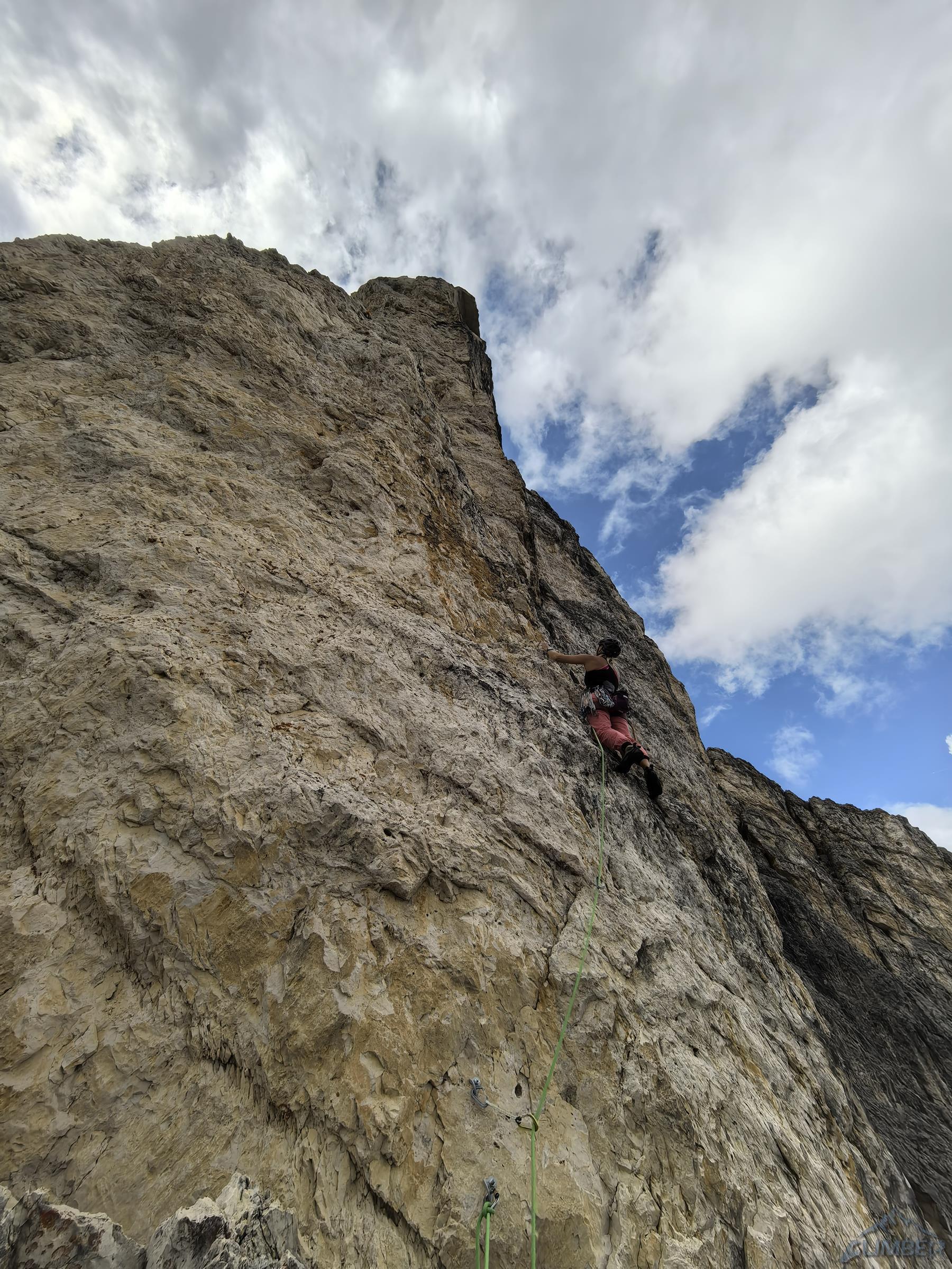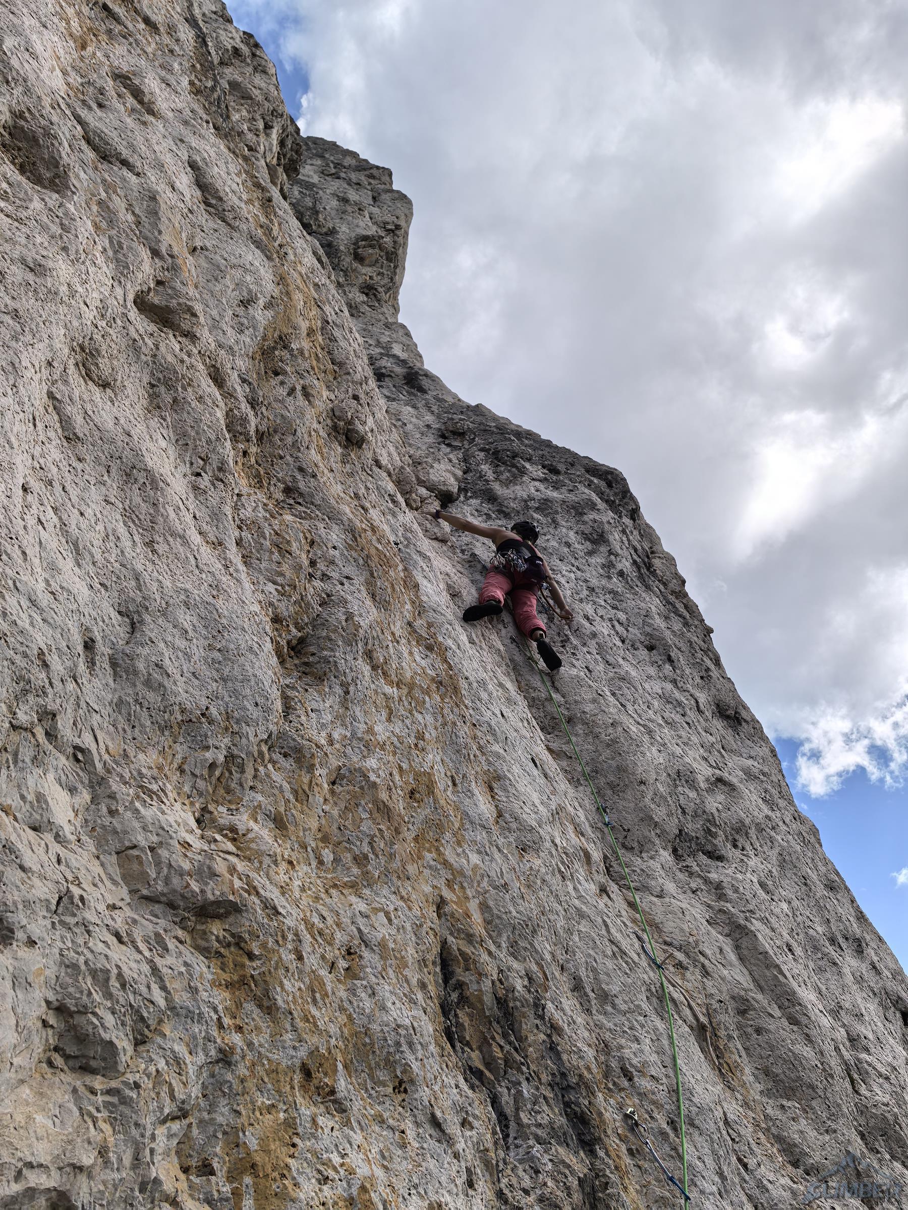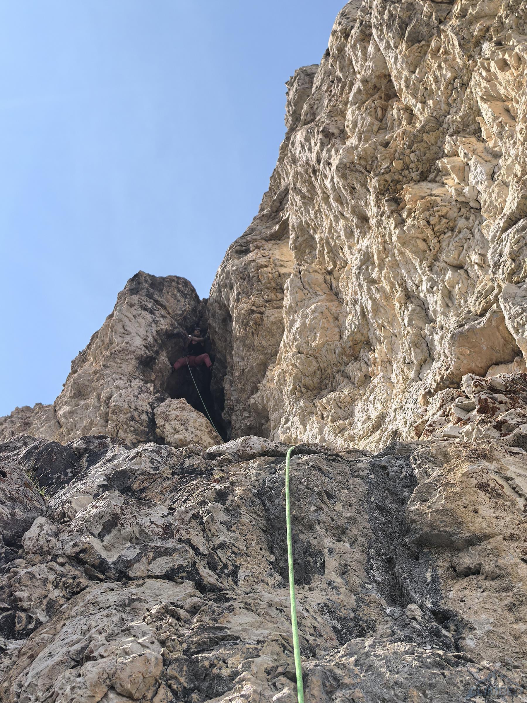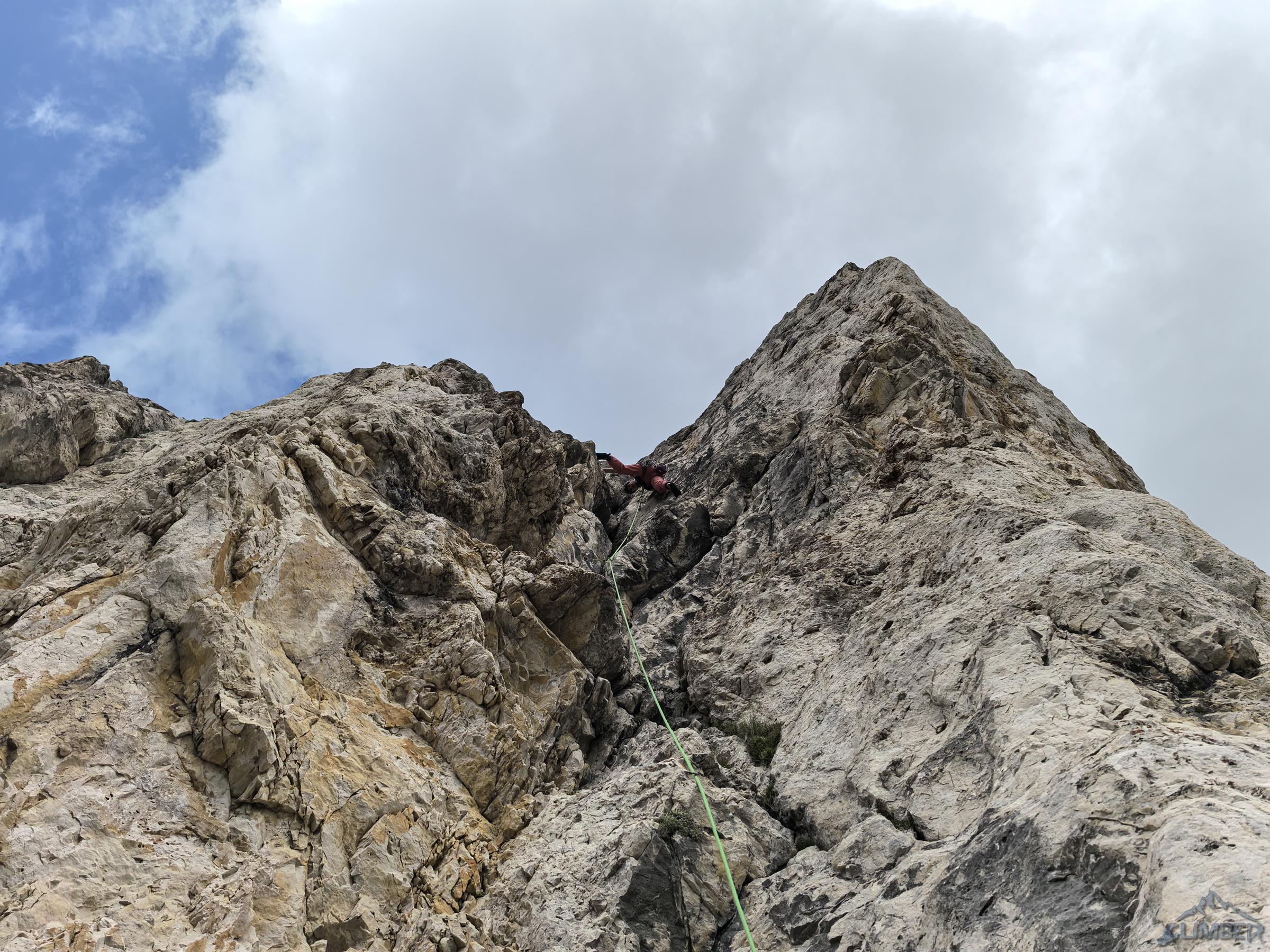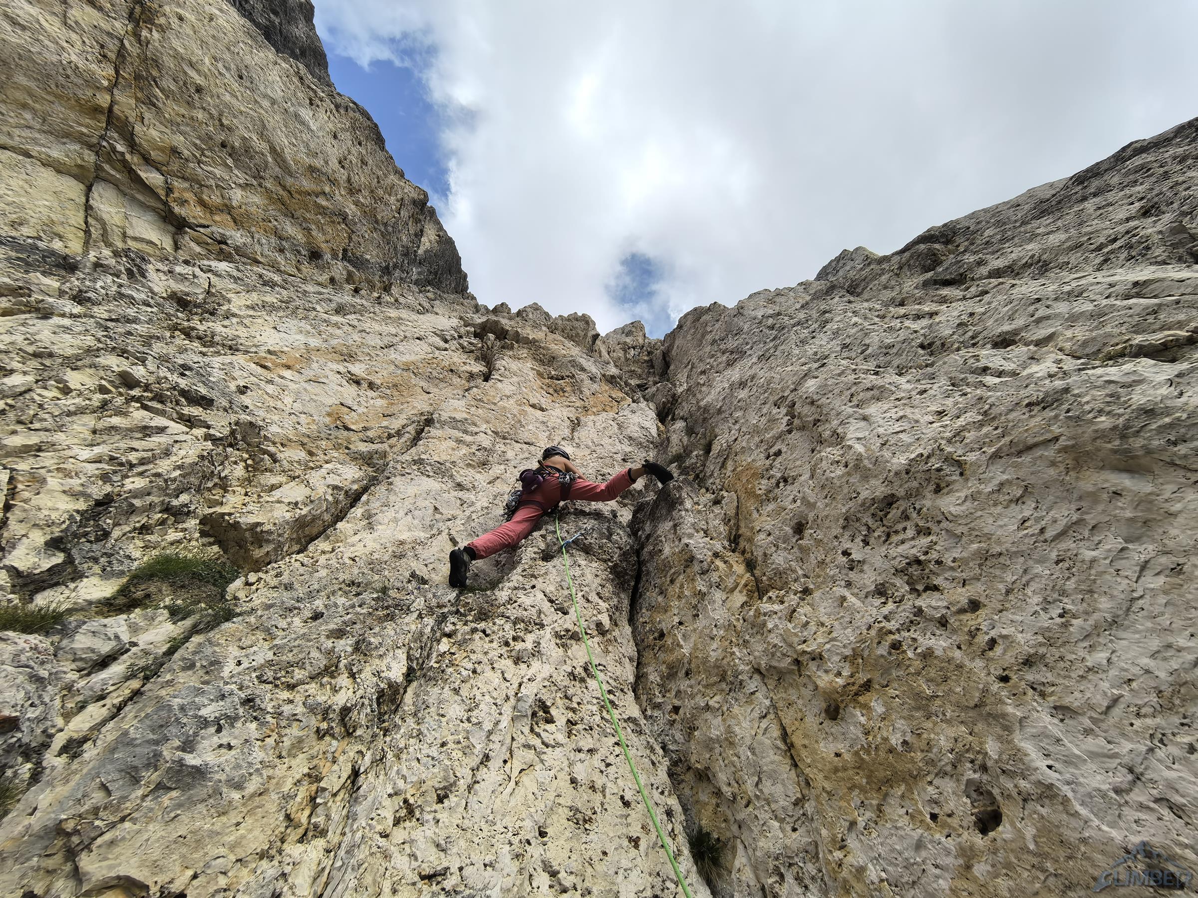 Pod prezentującą się świetnię „rakietę” Ra Gusela z parkingu na przełęczy czeka nas zaledwie 20-minutowy spacer, nawet nie pakujemy liny (pojedynczej) tylko bierzemy ją do ręki. By dostać się pod start drogi wychodzimy przez skalny próg na trawiastą rampę przecinającą podstawę imponującego żółtego filara, taką miniaturką Spigolo Giallo na Małej Cimie 😊. Pierwszy wyciąg (6a) prowadzi wyraźnym zacięciem z lewej strony – wypatrujemy spitów. Wygląda intensywnie, dlatego też Ania by rozgrzać się przed resztą drogi puszcza mnie przodem – okazuje się bardziej technicznie niż siłowo ale i całkiem zajmująco. Drugi odcinek (5b) jest już wyraźnie łatwiejszy, kontynuujemy wzdłuż zacięcia i trawersujemy mocno w prawo.