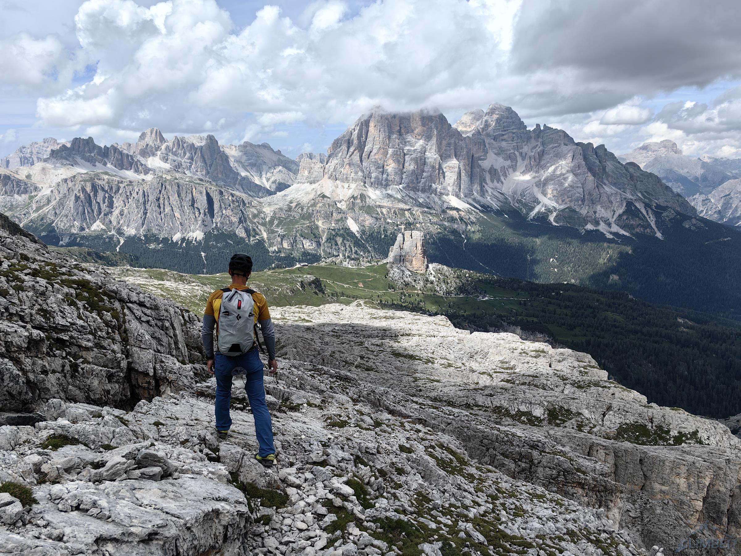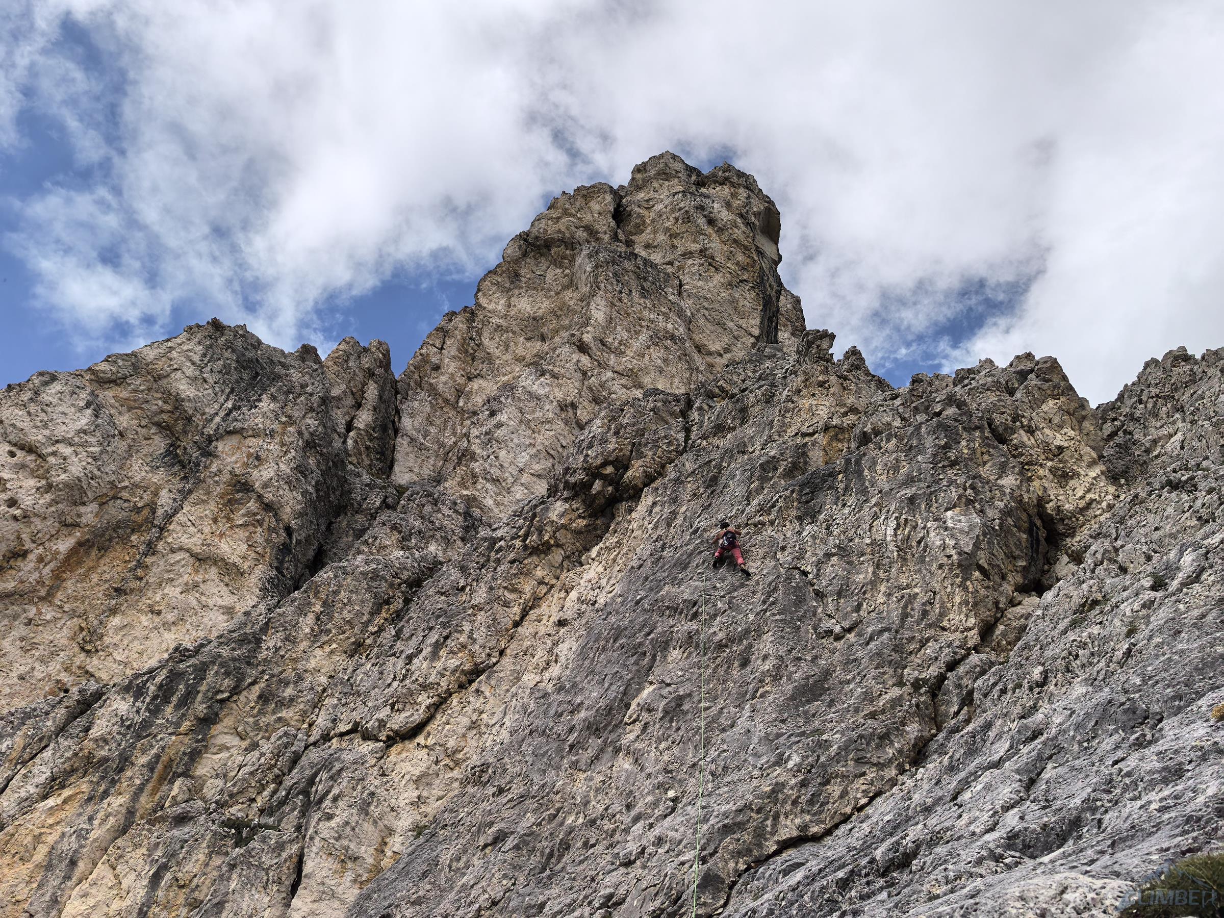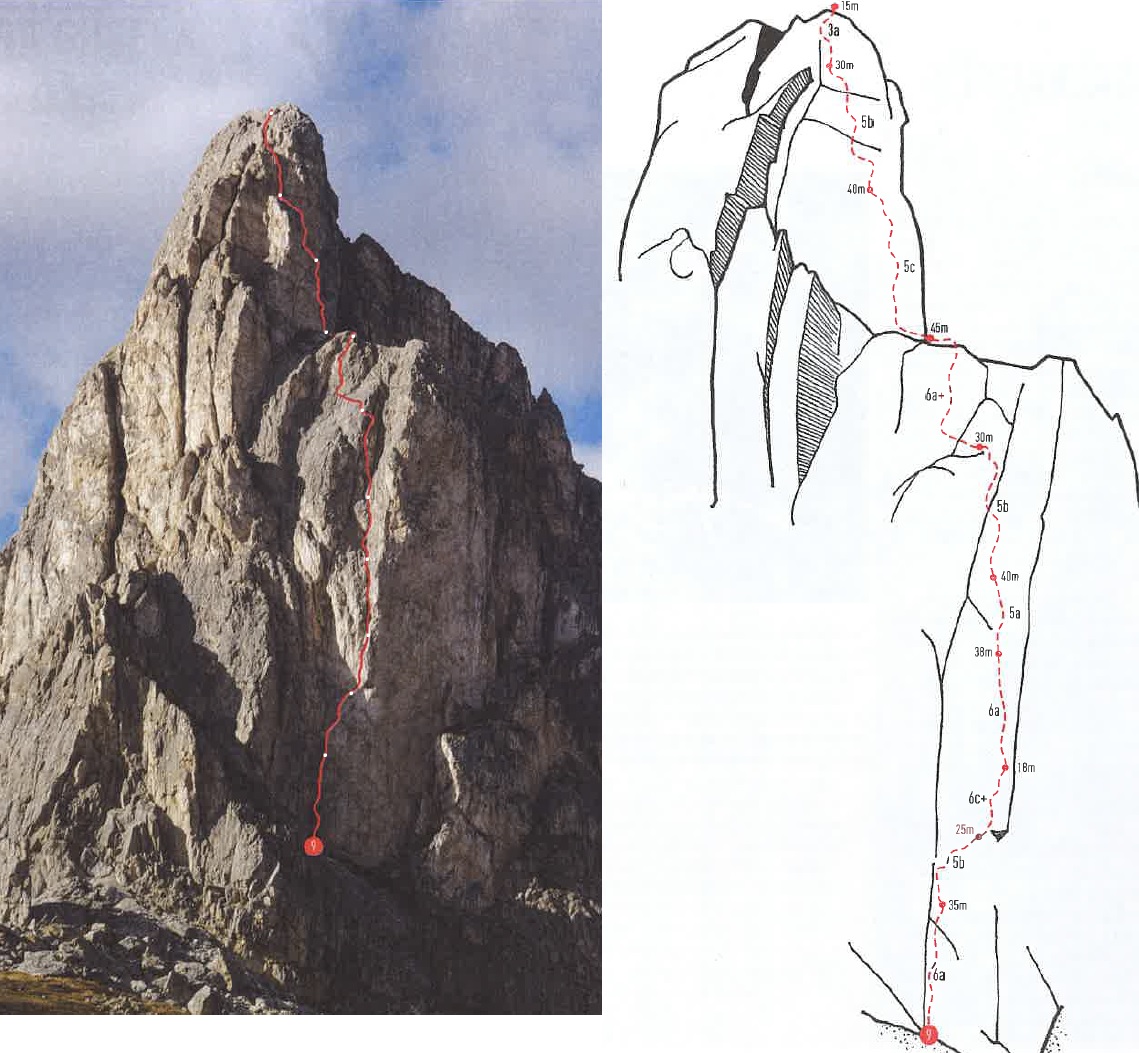 Wyciąg nad tarasem prowadzi kantem filara i oferuje zaskakująco intensywne wspinanie jak na 5c – 40m po małych chwytach w pionie. Na odcinku powyżej dla odmiany czeka groźnie wyglądający ale przystępny (5b) komin, po którym wychodzimy na półkę 15m pod szczytem – dobrze jednak nie łączyć tych fragmentów. Na wierzchołku czekają piękne widoki i łatwe zejście – początkowo idziemy w kierunku Cinque Torri, by później odbić na krótką feratkę i ścieżkę prowadzącą z powrotem na Passo Giau.