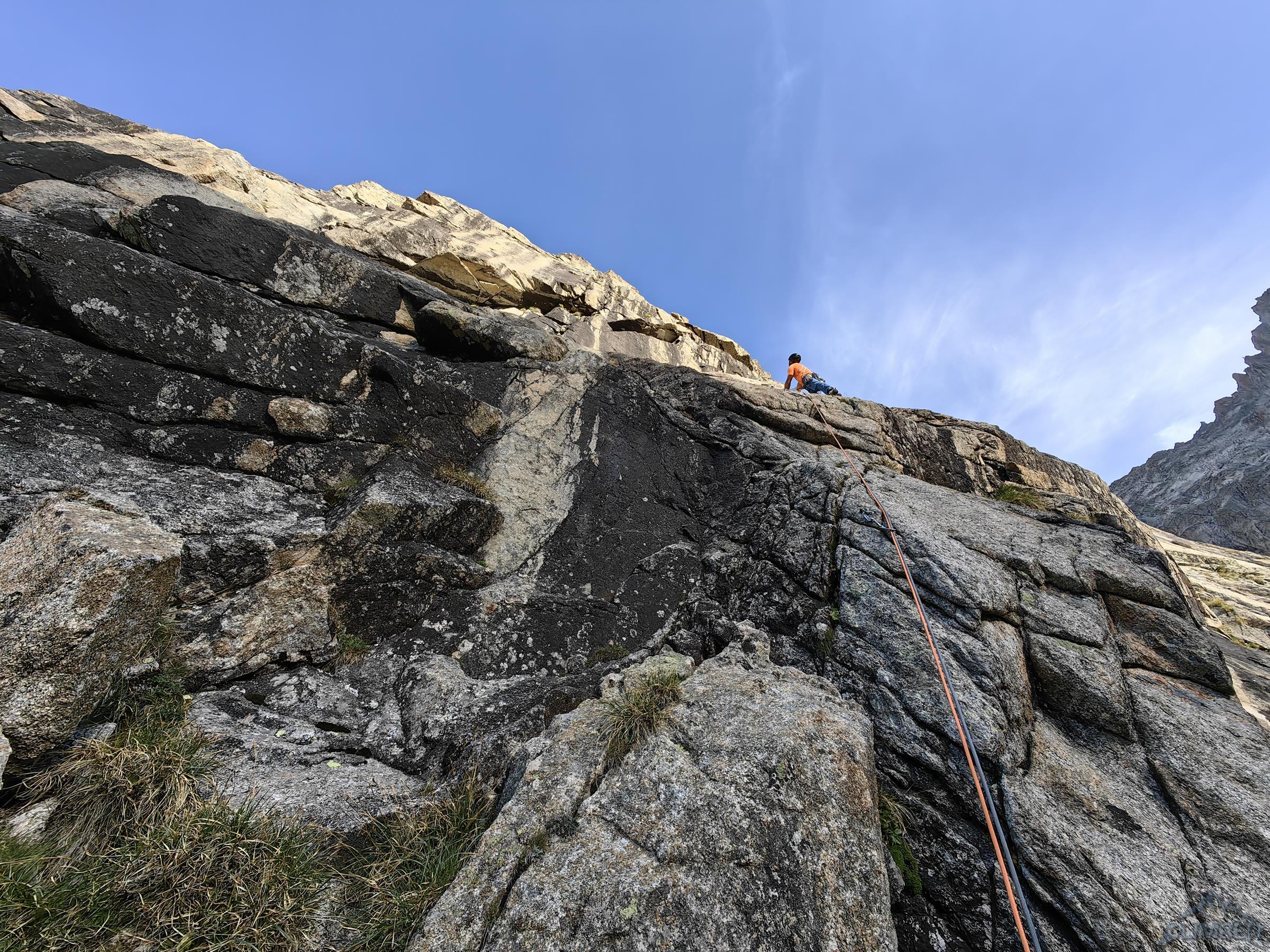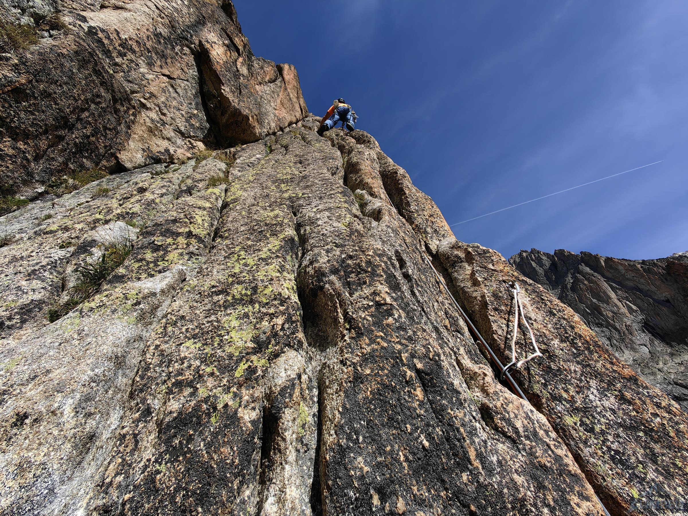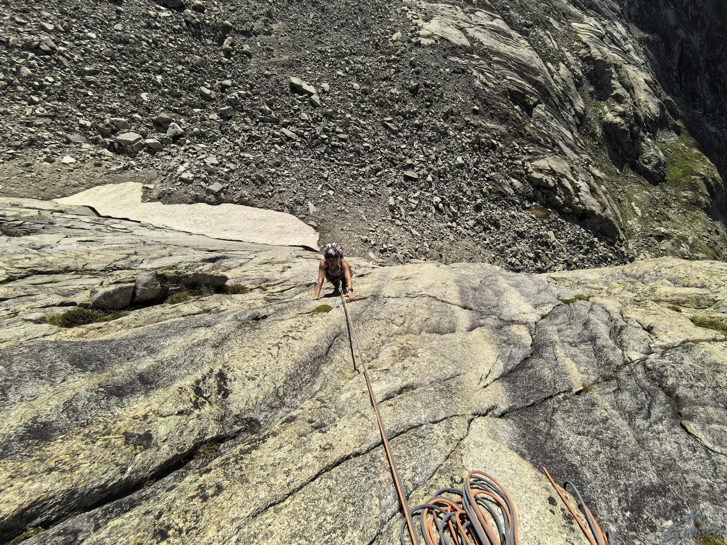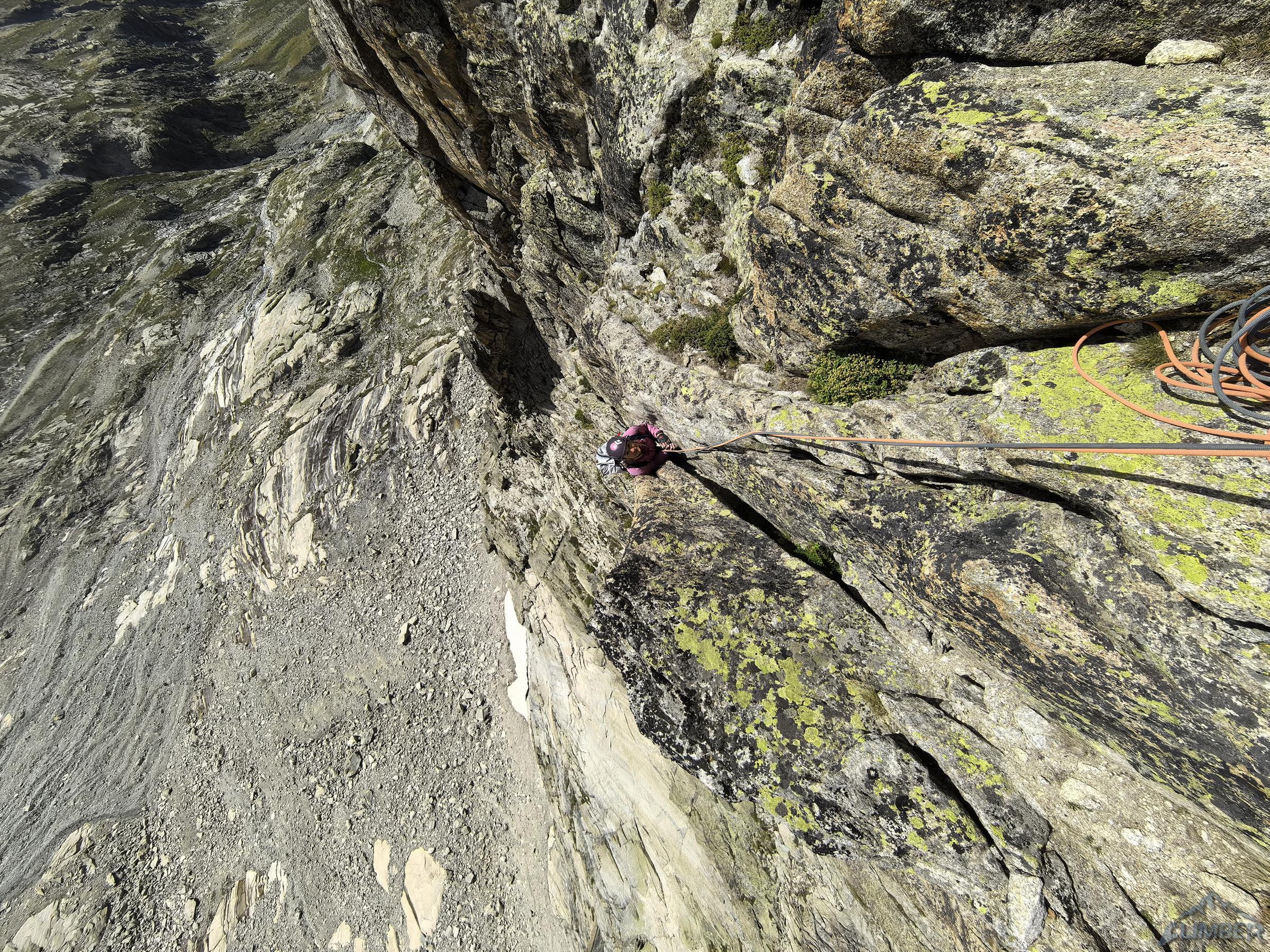 Po przejściu Physique (relacja TUTAJ) będącej jednym z głównych celów w sezonie, drugiego dnia można by odpocząć przed długim powrotem do kraju, ale mając tuż przy schronisku jedną z najlepszych turni w Alpach nie wchodzi to w grę 😊. Z powodu zmęczenia i przeziębienia Ani odpuszczamy przepiękną Lady Bonę (7a 450m, trzeba będzie wrócić!) i idziemy na łatwiejszego klasyka na ścianie wschodniej - Éthique de la Joie (6a+ 420m). Obiecuję, że będzie szybko, łatwo i przyjemnie ale tak nie jest – prowadzę wszystkie wyciągi i prawie każdy kolejny mimo niskiej wyceny daje lekki wycisk. Droga jest bardzo ładna ale i fizyczna, wymagająca świeżego ciała do dziesiątek dilferków i głowy do wychodzenia nad spity pomiędzy którymi często nic nie da się dołożyć.