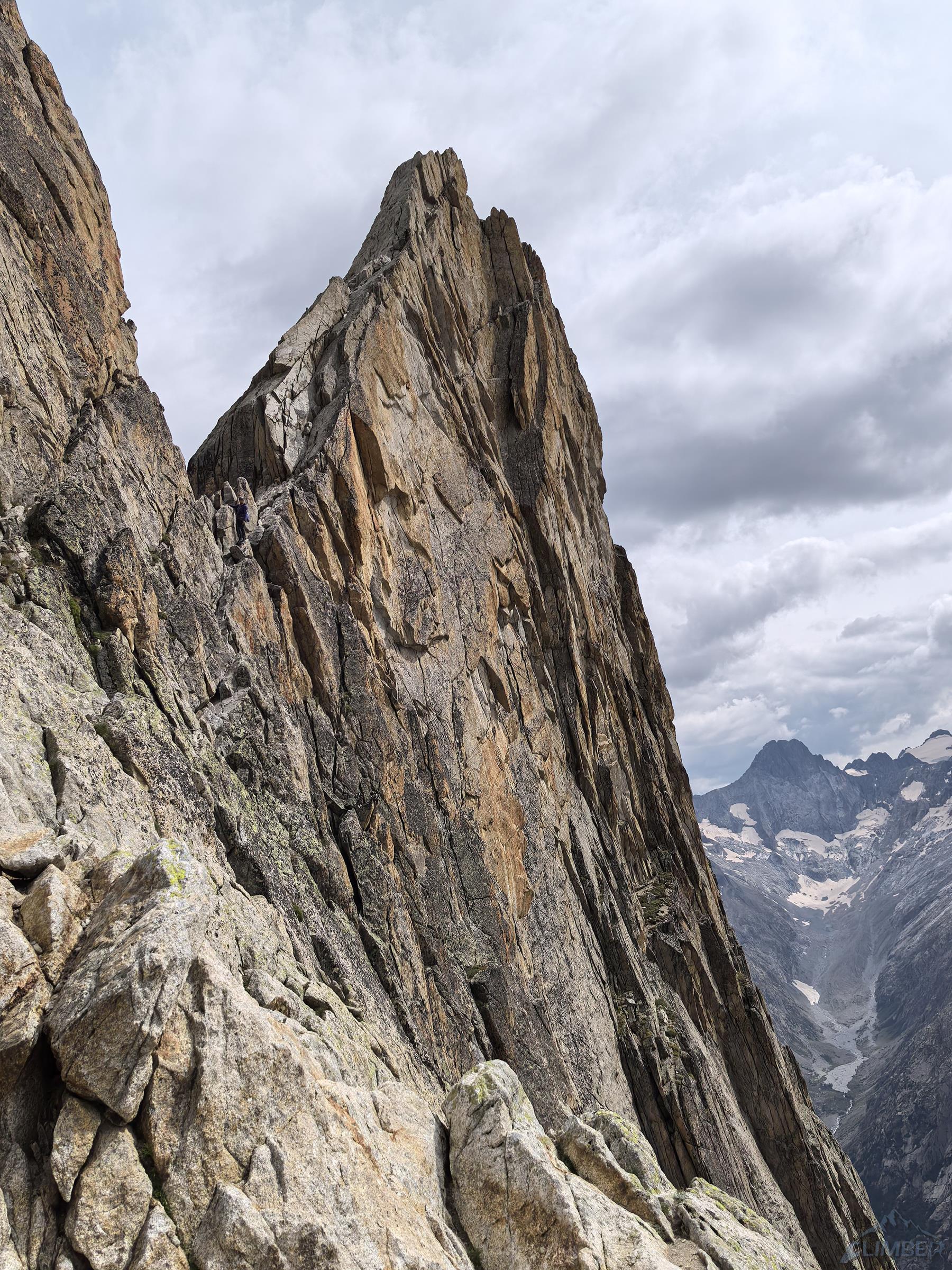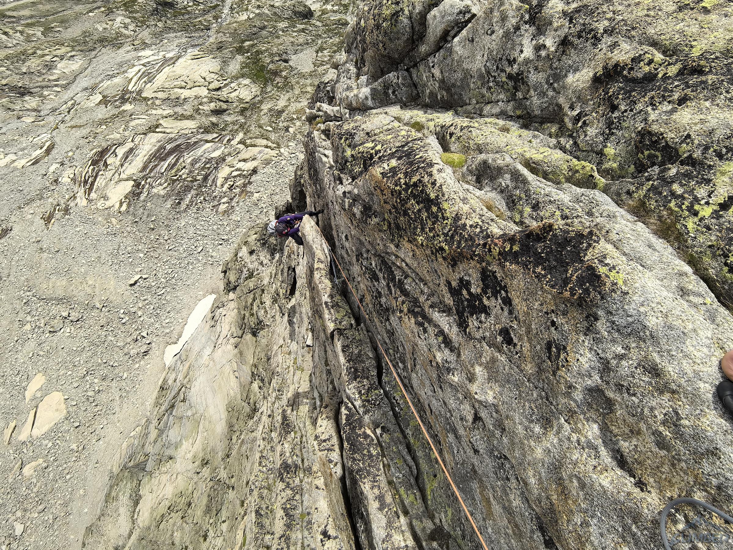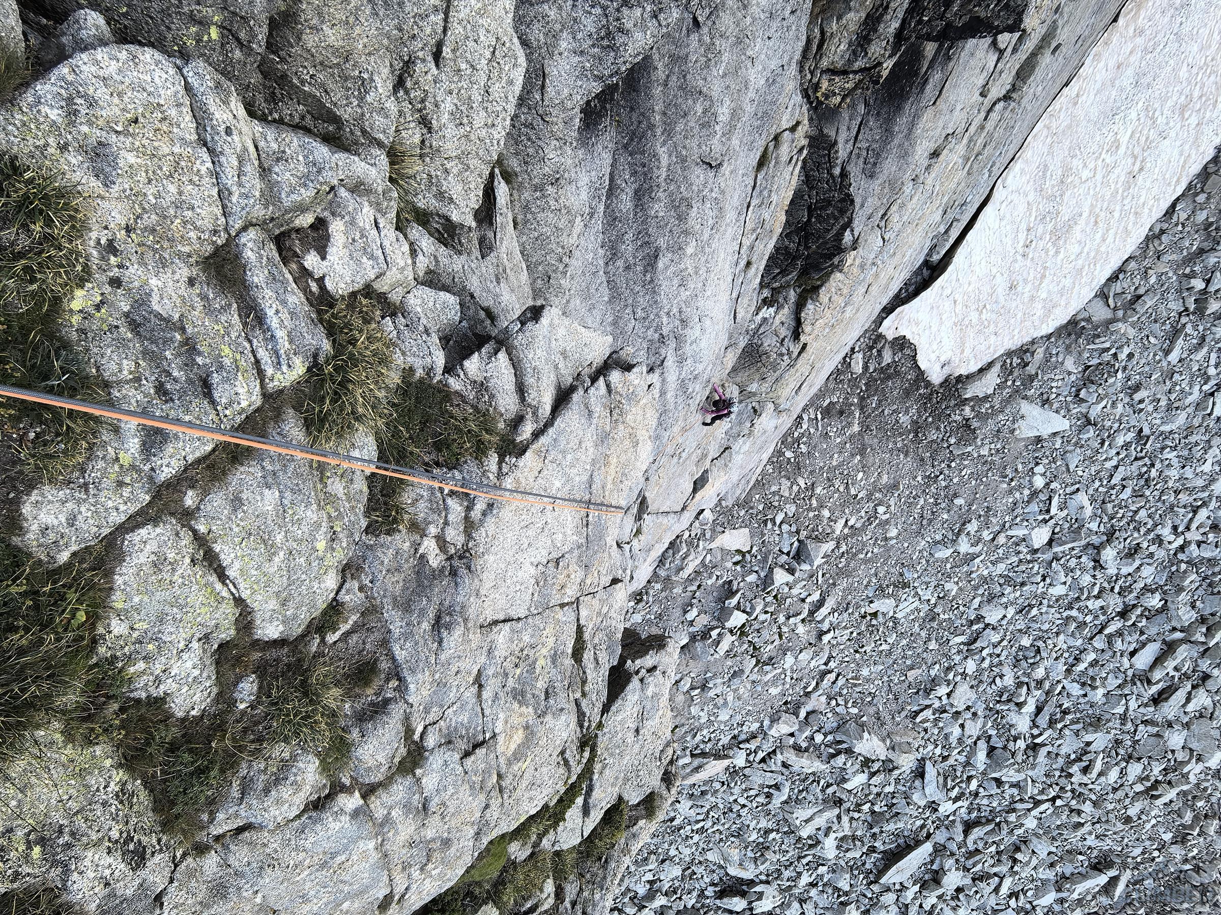 Wyciąg kolejny (5c) łatwo doprowadza pod grań, po lewej widać przewieszkę z Visit, my idziemy jednak za spitami w prawo – jeszcze tylko kilkudziesiątny dilferek i jesteśmy na grzbiecie. By już się nie katować odcinek na szczyt pokonujemy łatwą drogą klasyczną, choć będąc w normalnym stanie na pewno nie odpuściłbym przerysy z Visite po lewej (patrz zdjęcie), którą pokonywaliśmy w zeszłym roku. Gdy w końcu dociągamy do piku mam wspinania dość jak rzadko kiedy, a partnerce za włożoną w te dwa dni pracę i setki metrów w pionie obiecuję wizytę w sanatorium 😊. Ze szczytu zjeżdżamy granią na północ (2x25m i lepiej nie łączyć), po czym trawersujemy eksponowaną półką do ścieżki prowadzącą najpierw skałami, potem piargami aż do przełęczki nad schroniskiem. W nim nadal pustki (czemu pisałem w poprzedniej relacji), jemy ostatniego liofa i wypijamy odłożone na tą okazję piwo, po czym ruszamy w dół do Les Etages i niestety już w trasę powrotną do domu. Oby jeszcze dane było nam kiedyś dotknąć wyśmienitego granitu Dibony!