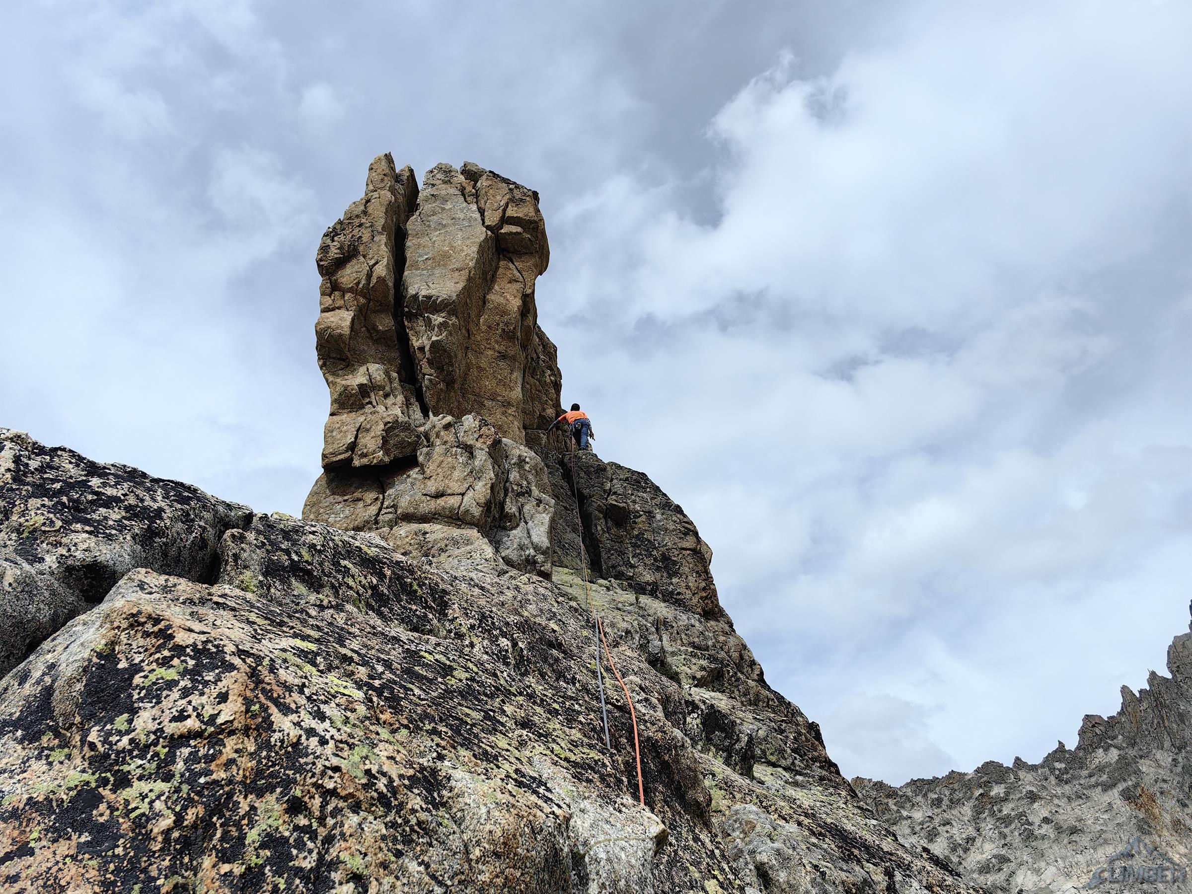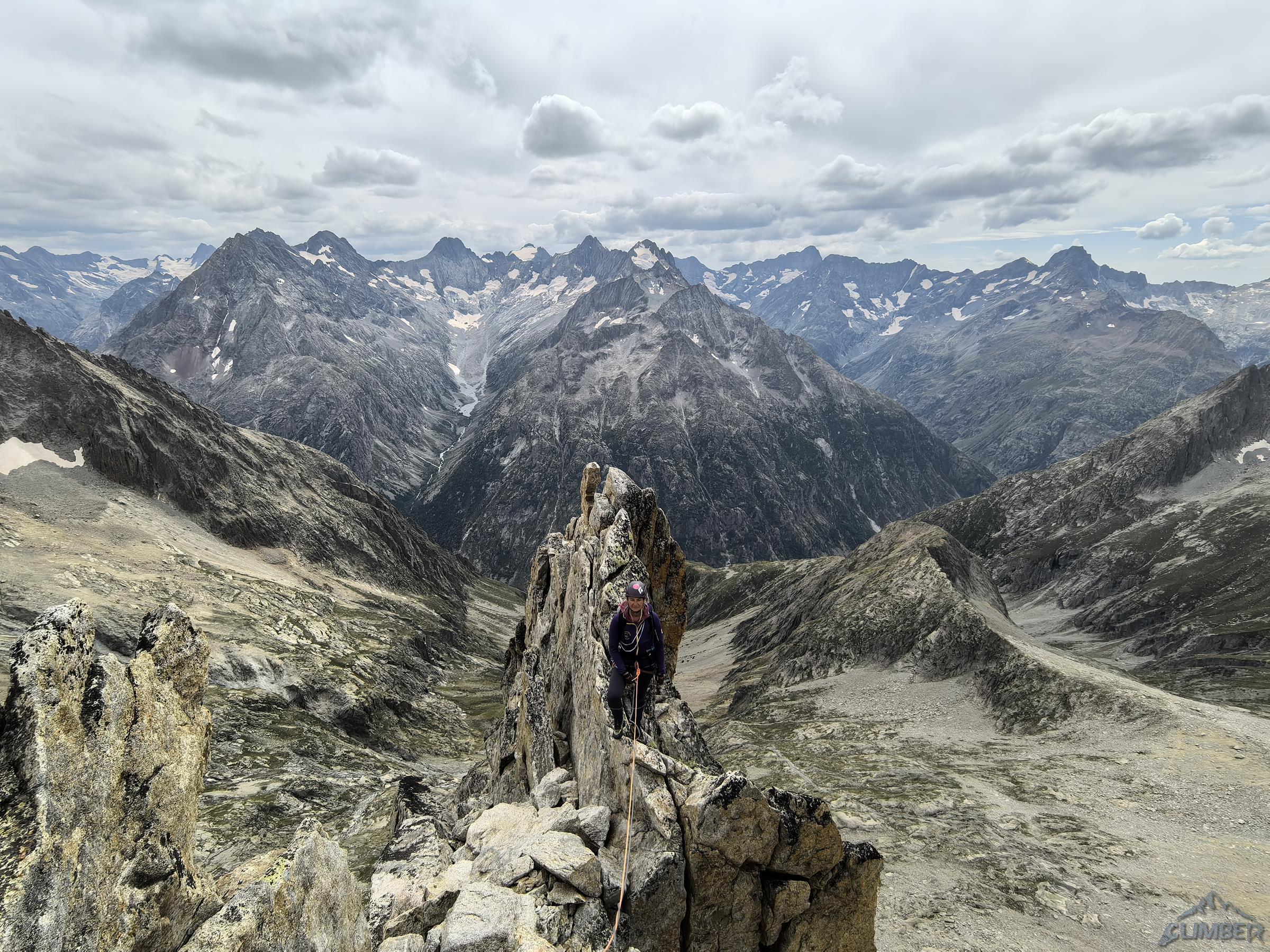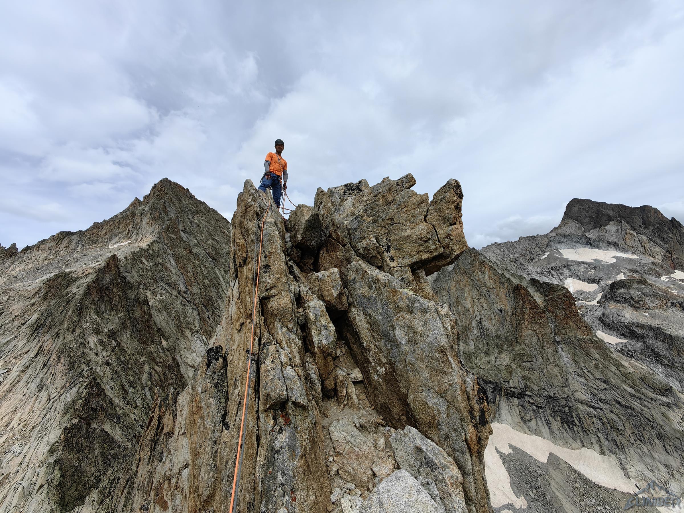 Wyciąg kolejny (5c) łatwo doprowadza pod grań, po lewej widać przewieszkę z Visit, my idziemy jednak za spitami w prawo – jeszcze tylko kilkudziesiątny dilferek i jesteśmy na grzbiecie. By już się nie katować odcinek na szczyt pokonujemy łatwą drogą klasyczną, choć będąc w normalnym stanie na pewno nie odpuściłbym przerysy z Visite po lewej (patrz zdjęcie), którą pokonywaliśmy w zeszłym roku. Gdy w końcu dociągamy do piku mam wspinania dość jak rzadko kiedy, a partnerce za włożoną w te dwa dni pracę i setki metrów w pionie obiecuję wizytę w sanatorium 😊. Ze szczytu zjeżdżamy granią na północ (2x25m i lepiej nie łączyć), po czym trawersujemy eksponowaną półką do ścieżki prowadzącą najpierw skałami, potem piargami aż do przełęczki nad schroniskiem. W nim nadal pustki (czemu pisałem w poprzedniej relacji), jemy ostatniego liofa i wypijamy odłożone na tą okazję piwo, po czym ruszamy w dół do Les Etages i niestety już w trasę powrotną do domu. Oby jeszcze dane było nam kiedyś dotknąć wyśmienitego granitu Dibony!