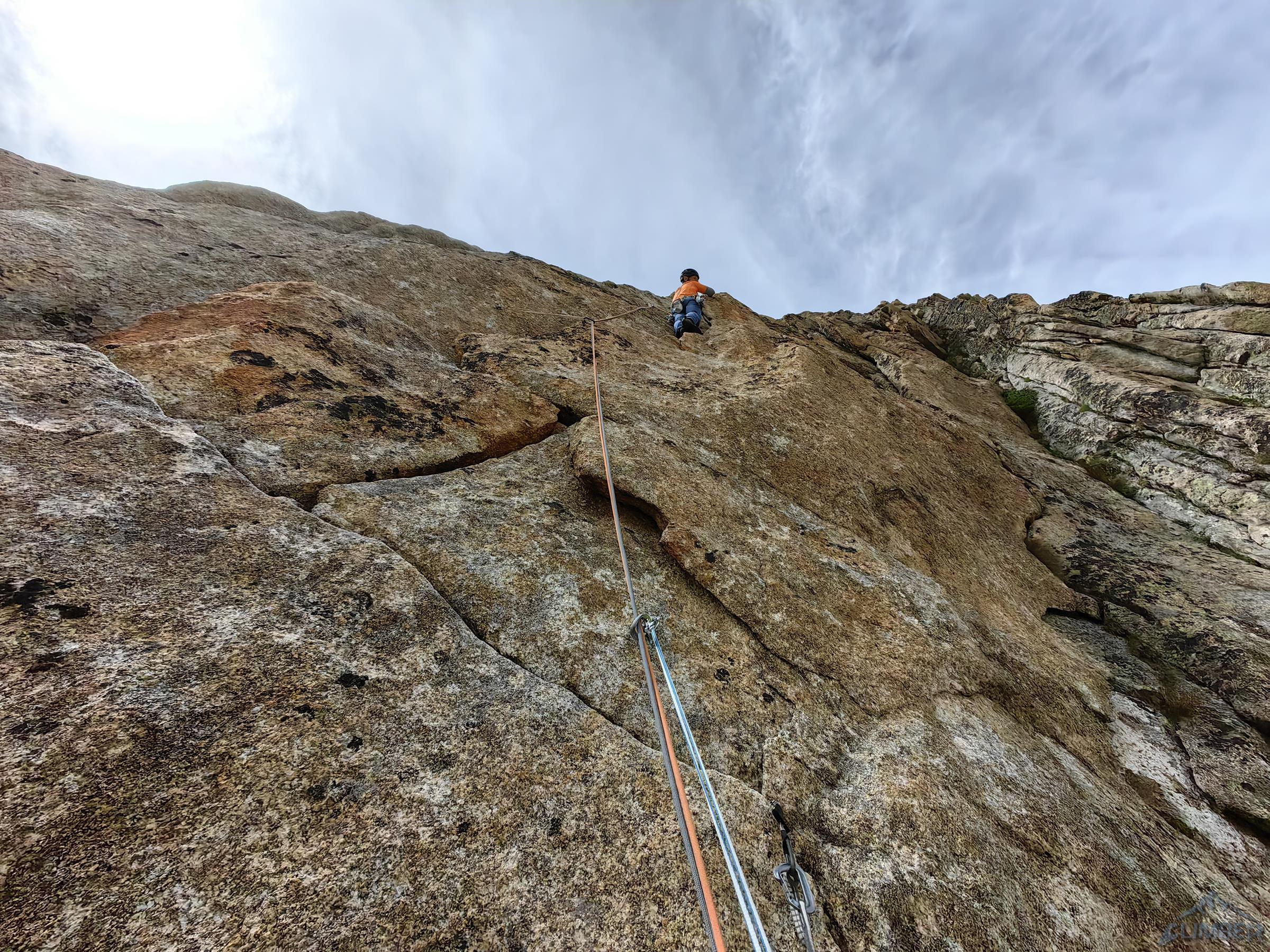 Po nieco dłuższym podejściu niż pod ścianę południową (całe 15 minut 😊) lokalizujemy start drogi i zaczynamy wspinanie. Pierwszy wyciąg (5c) jest mocno „górski”– wspinamy się zacięciami wypatrując kolejnych spitów i wychodzimy na wygodną półkę. Jak się zresztą okaże cała ściana ma odmienny charakter od głównej wystawy – jest mniej pionowych płyt, a więcej rys, odstrzelonych tafli i różnego rodzaju zacięć. Na początku drugiego wyciągu (6a+) czeka nas jednak odważny połóg, po którym pokonać trzeba niebanalną przewieszkę – przynajmniej taka mi się wydała. Trzeci wyciąg to pocięta ryskami płyta na pierwszych metrach (5c), po czym kolejny trikowy okapik (6a+) otwierający wyjście w łatwy teren – na kolejnym odcinku właściwie przenosimy stanowisko 50 metrów wyżej. Zaczyna do mnie docierać, że jestem po wczorajszej walce bardzo zmęczony, Ania też nie bardzo chce iść dalej – gdyby nie była to Dibona niewątpliwie pojechalibyśmy w dół…