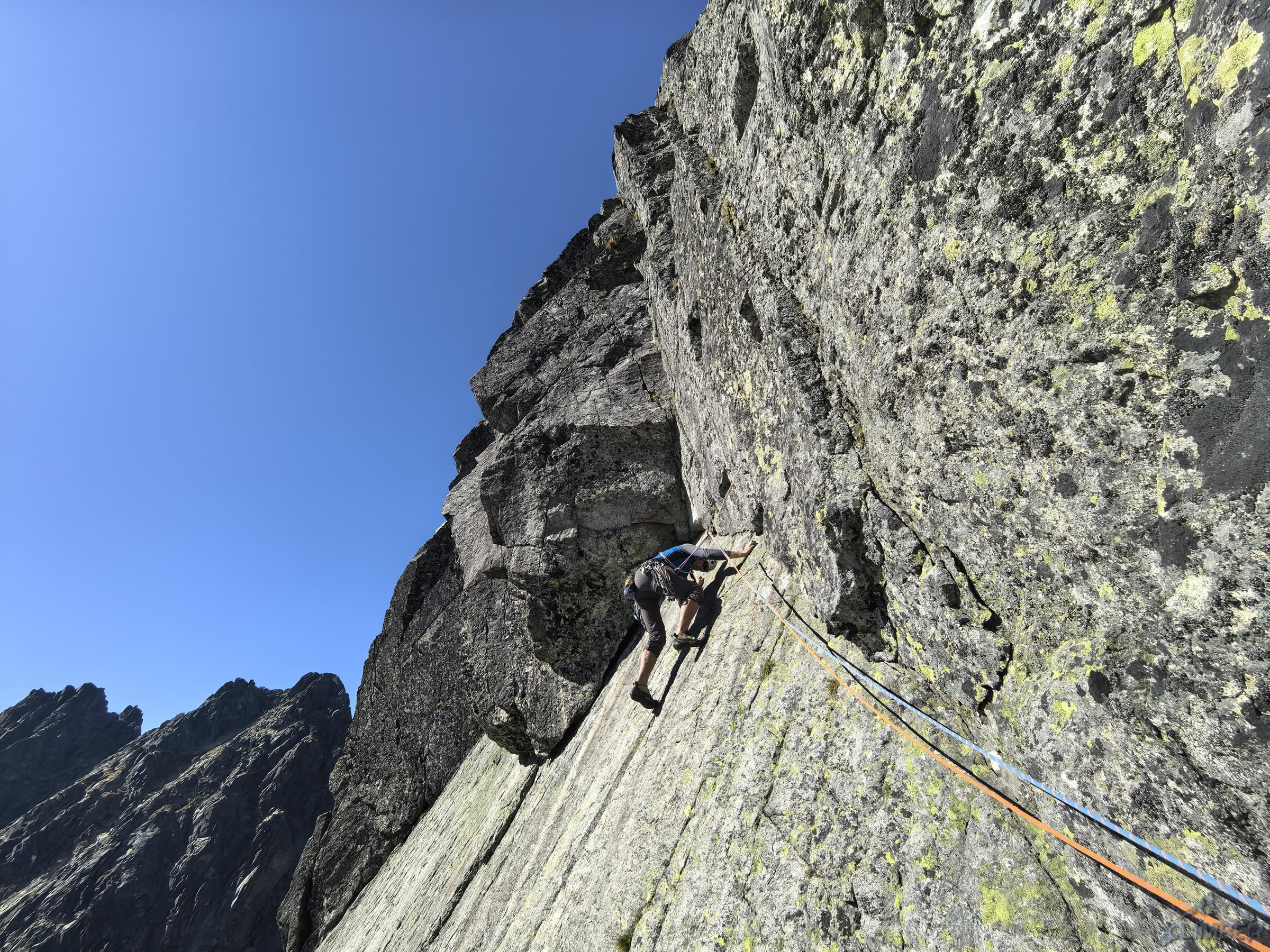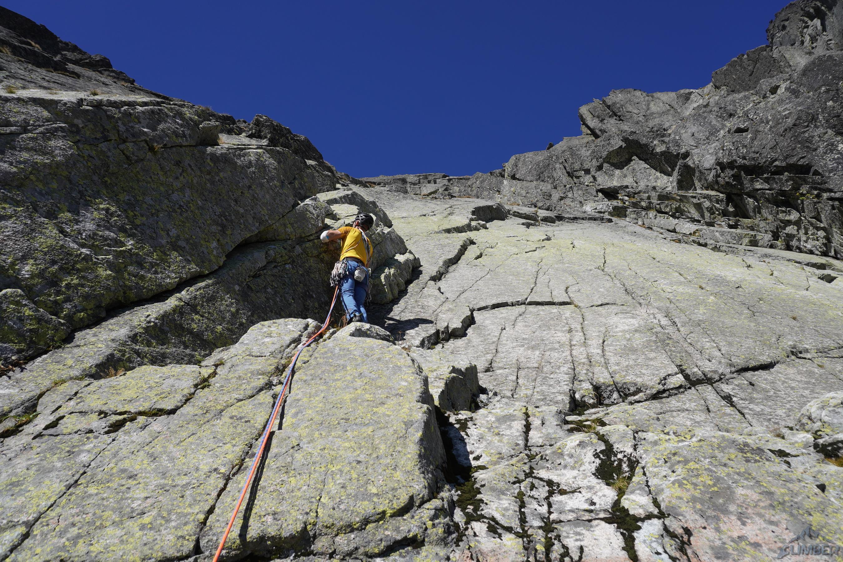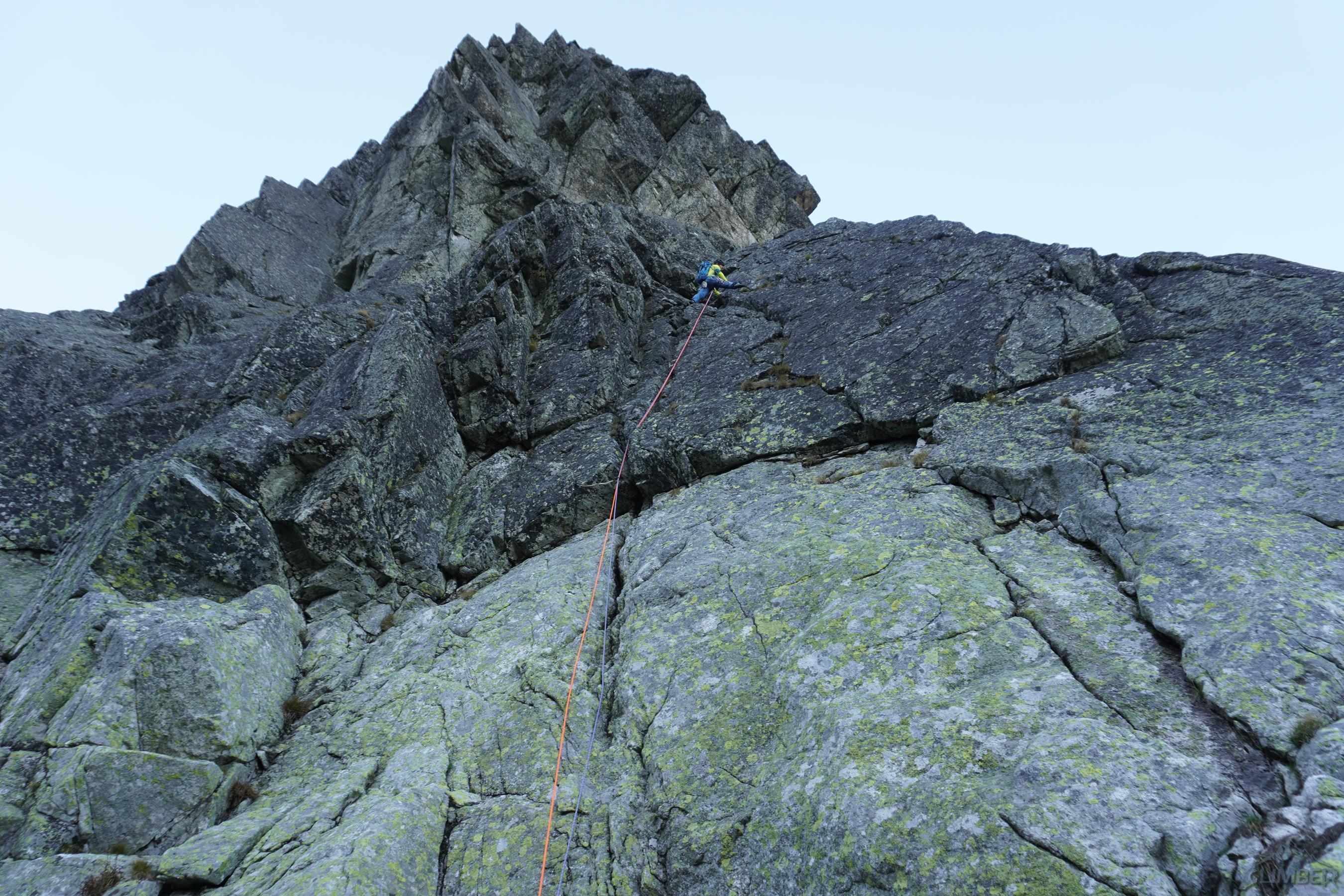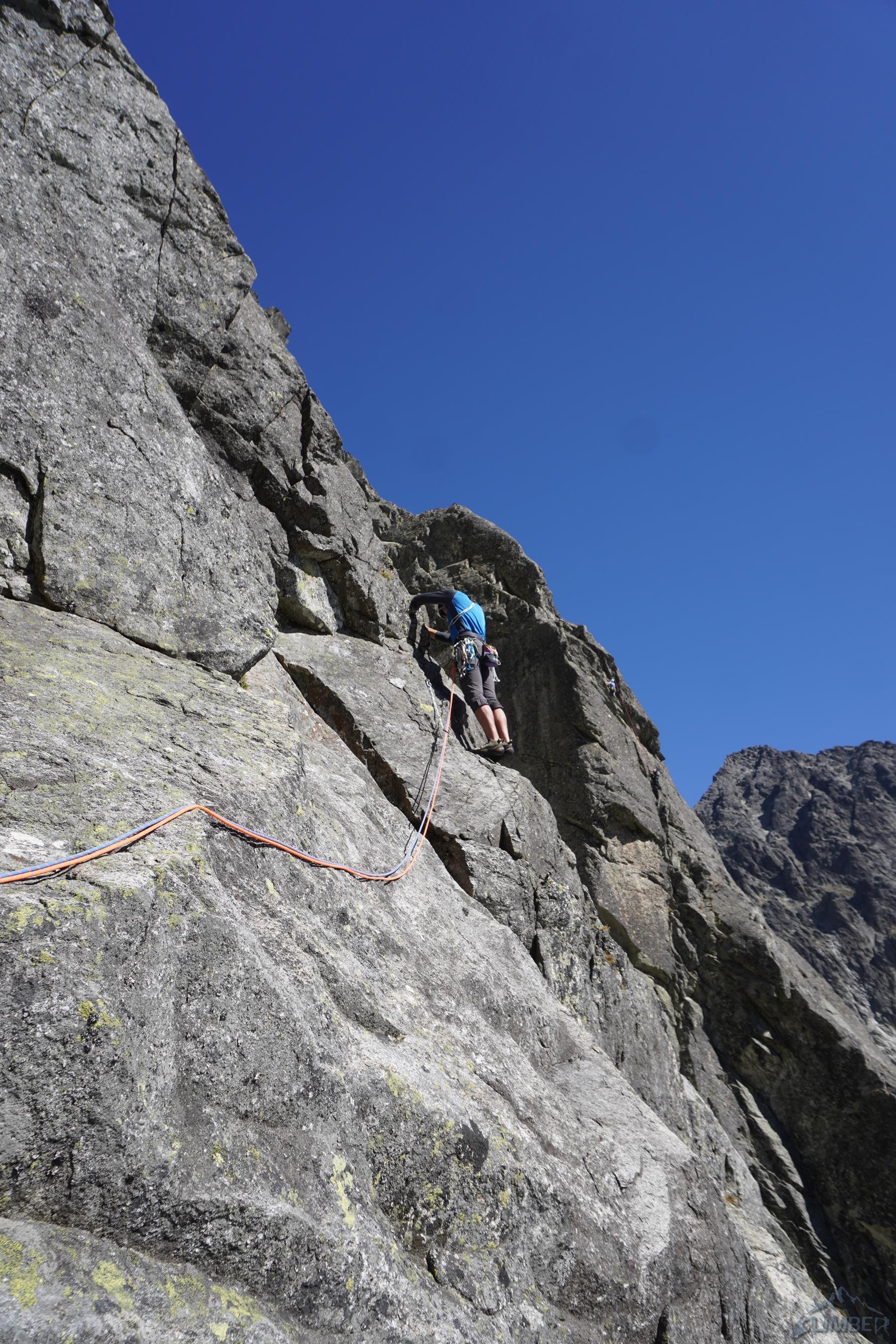 Późnym popołudniem przechodzimy na taras pod zachodnią ścianą Kościółka i zabieramy się za nasz drugi dzisiejszy cel, drogę Páleníčka. Linia jest co prawda jest krótka ale ze względu na turnię na którą wyprowadza oraz świetny drugi wyciąg, może aspirować do grona tatrzańskich perełek. Skała poza jednym odcinkiem jest zaskakująco lita i czysta, obyliśmy się bez młotka i swoich haków ale z powodu braku stanowisk warto je rozważyć. Dolną barierę przejść można na kilka sposobów, my wybraliśmy najbardziej ewidentny wyraźnym zacięciem i pęknięciami w płycie – ładne i przyjemne wspinanie z trudnościami IV-V oraz dobrą asekuracją. Po wyjściu na taras pod głównym spiętrzeniem ściany przechodzimy w lewo i zatrzymujemy się na jednej z półek, najlepiej na najwyższej - pod wejściem w trudności.