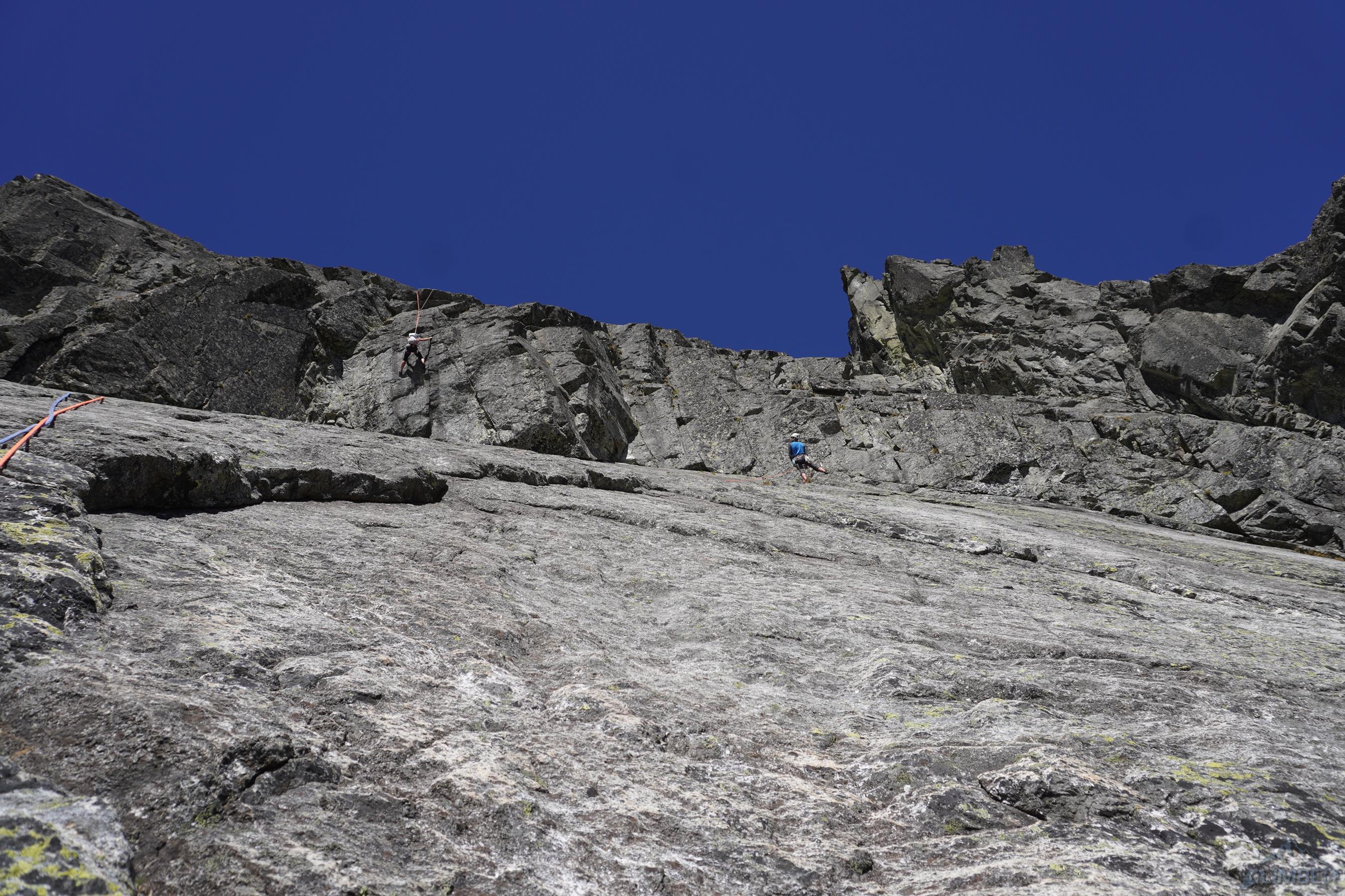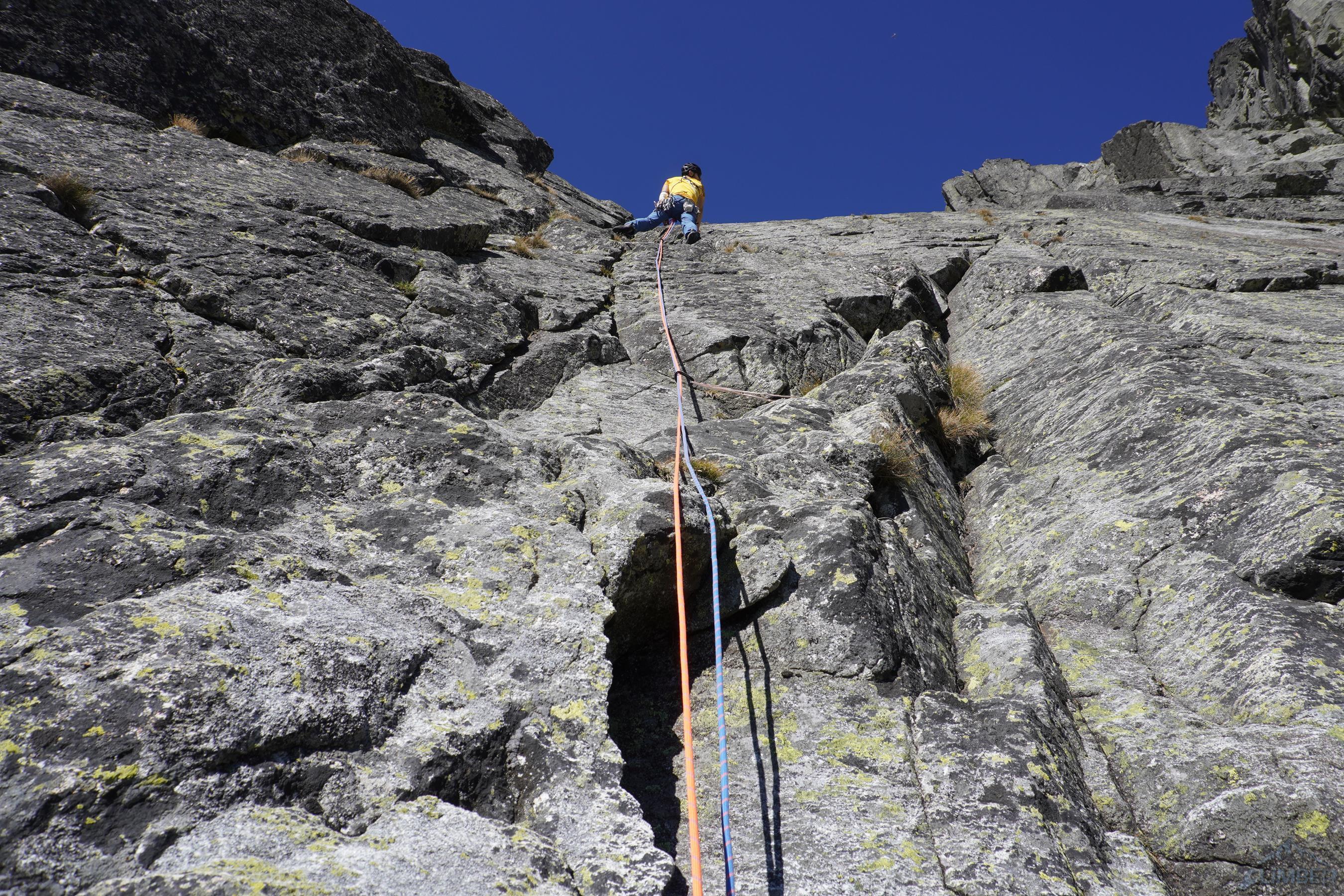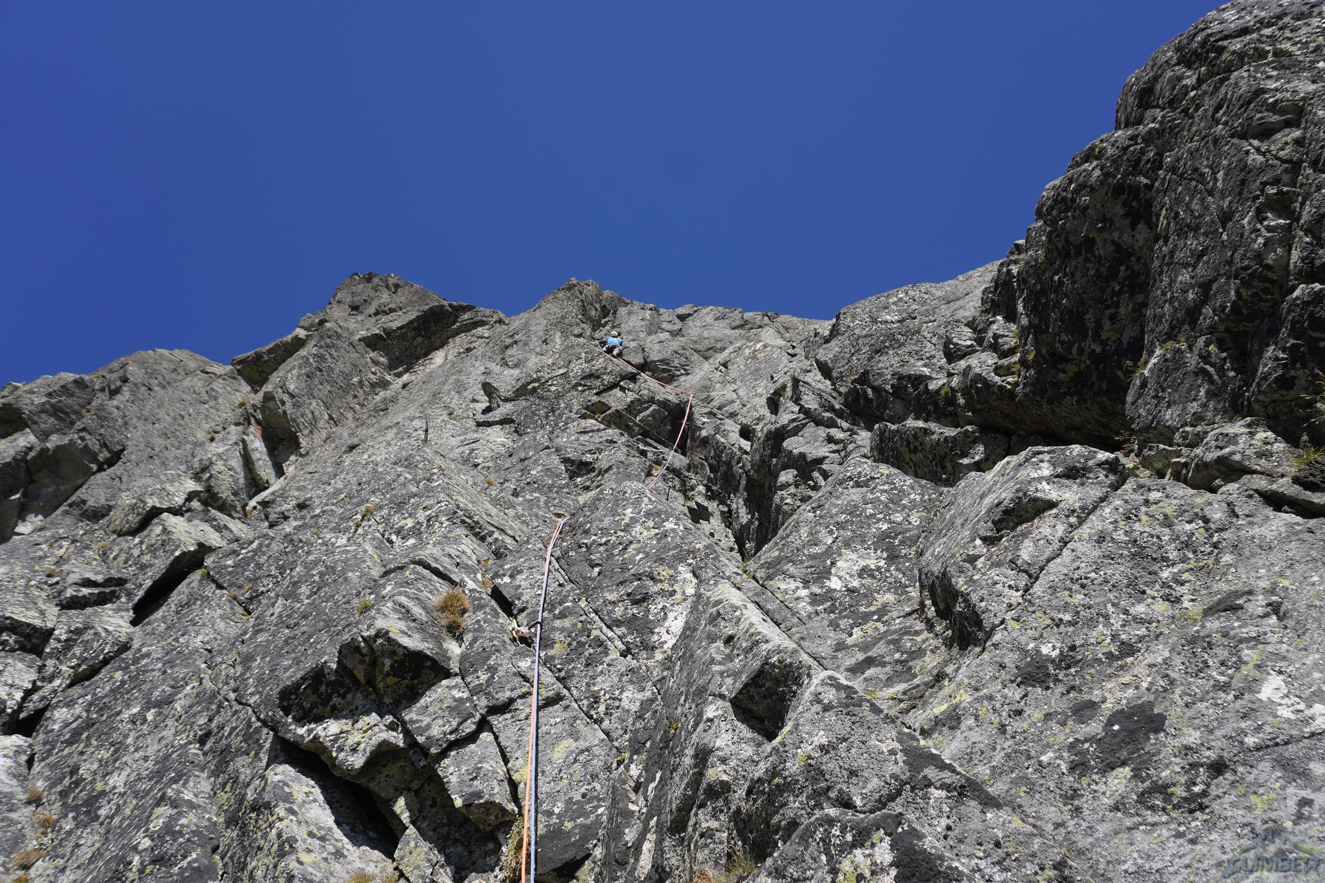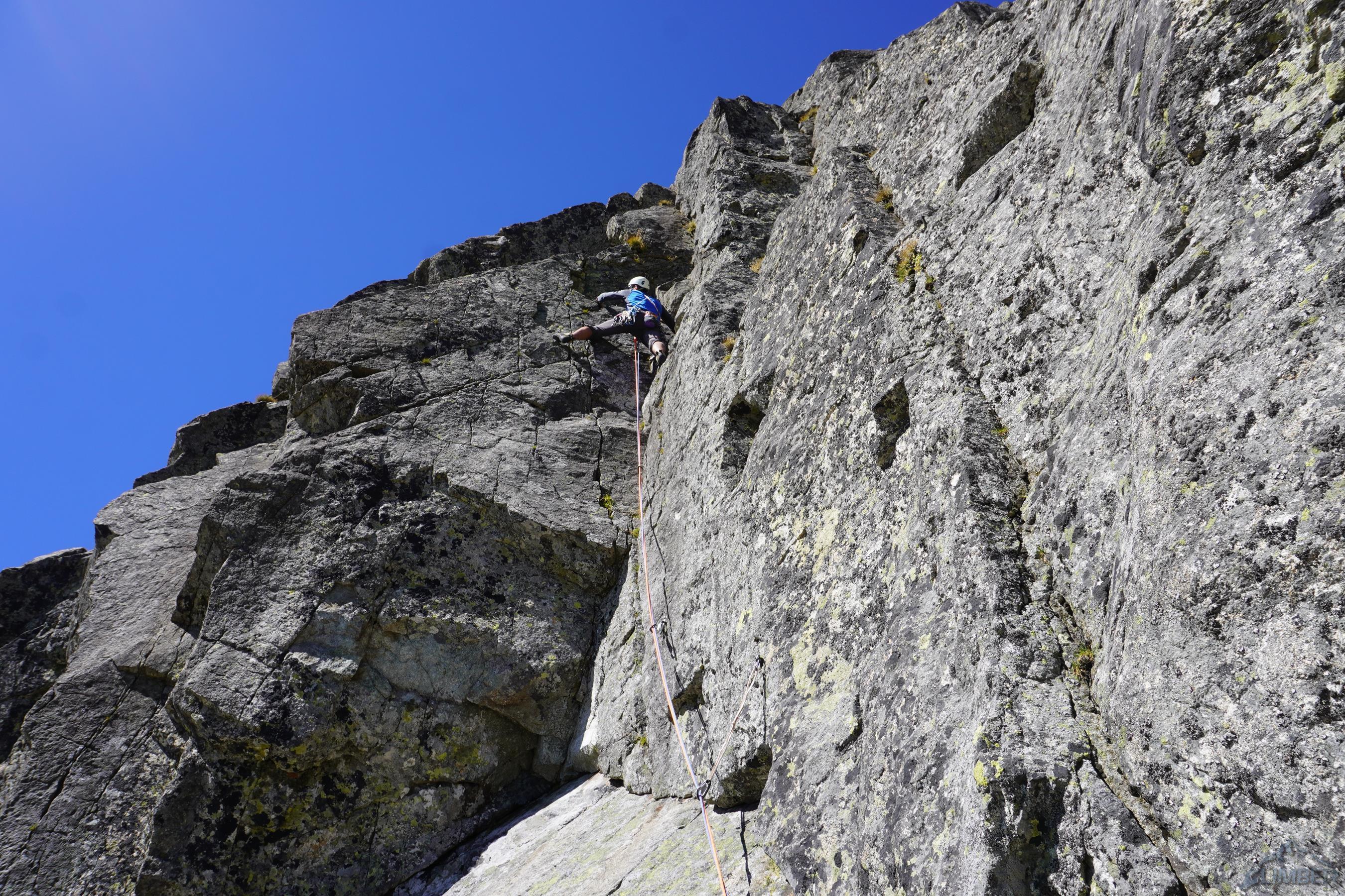 Późnym popołudniem przechodzimy na taras pod zachodnią ścianą Kościółka i zabieramy się za nasz drugi dzisiejszy cel, drogę Páleníčka. Linia jest co prawda jest krótka ale ze względu na turnię na którą wyprowadza oraz świetny drugi wyciąg, może aspirować do grona tatrzańskich perełek. Skała poza jednym odcinkiem jest zaskakująco lita i czysta, obyliśmy się bez młotka i swoich haków ale z powodu braku stanowisk warto je rozważyć. Dolną barierę przejść można na kilka sposobów, my wybraliśmy najbardziej ewidentny wyraźnym zacięciem i pęknięciami w płycie – ładne i przyjemne wspinanie z trudnościami IV-V oraz dobrą asekuracją. Po wyjściu na taras pod głównym spiętrzeniem ściany przechodzimy w lewo i zatrzymujemy się na jednej z półek, najlepiej na najwyższej - pod wejściem w trudności.