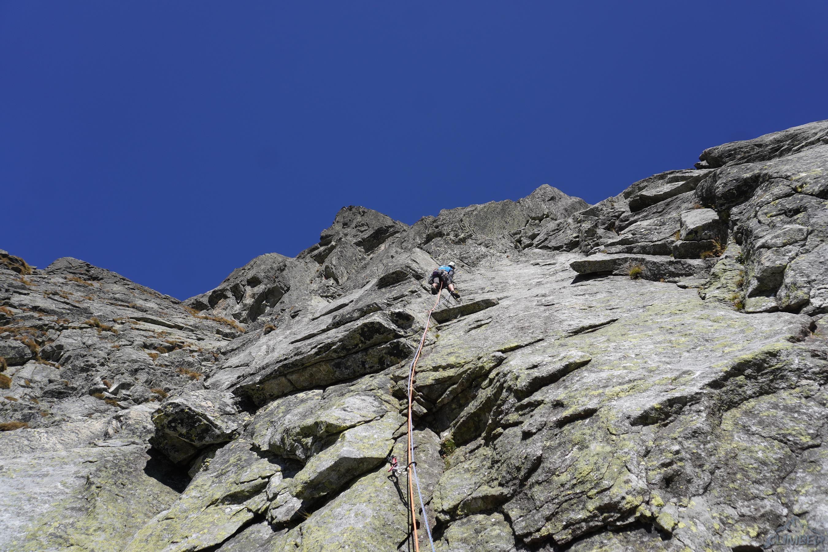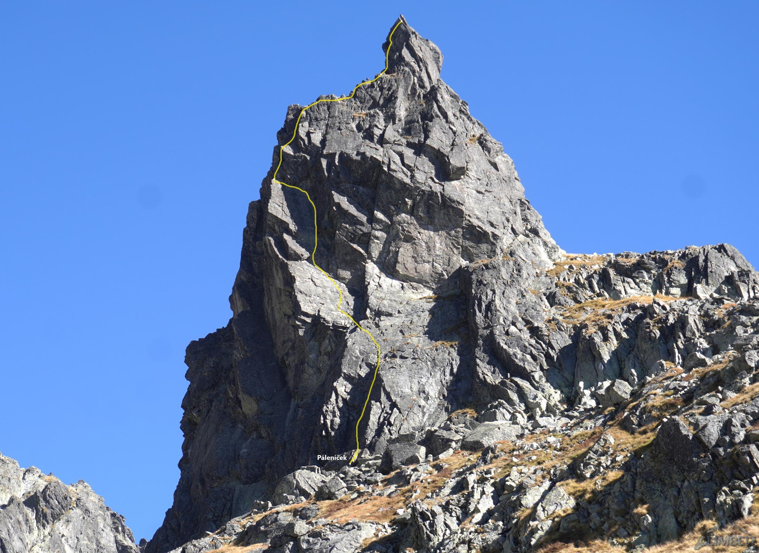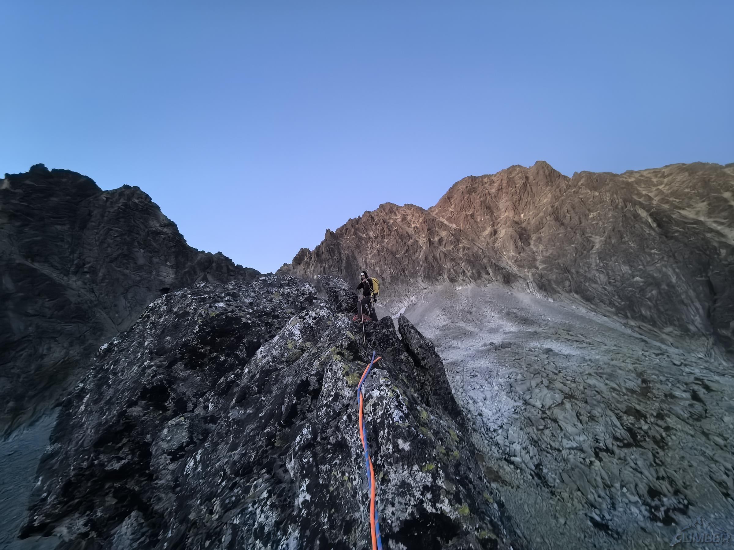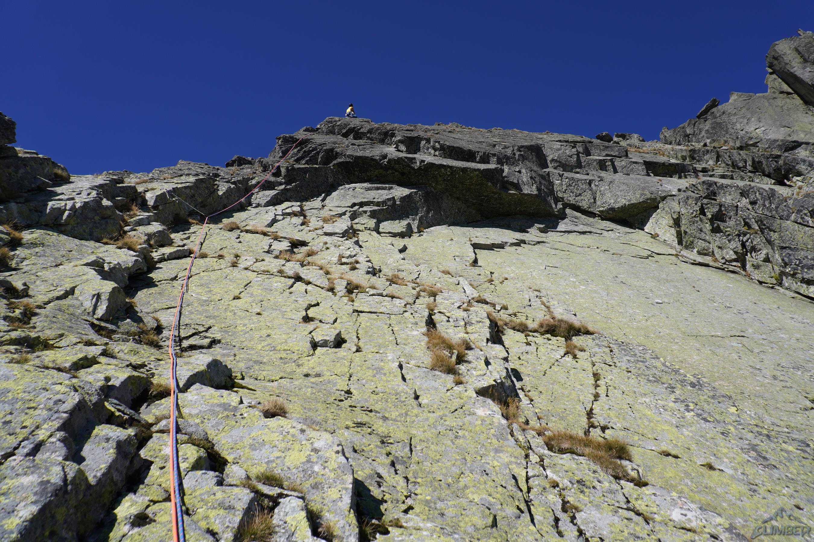 Późnym popołudniem przechodzimy na taras pod zachodnią ścianą Kościółka i zabieramy się za nasz drugi dzisiejszy cel, drogę Páleníčka. Linia jest co prawda jest krótka ale ze względu na turnię na którą wyprowadza oraz świetny drugi wyciąg, może aspirować do grona tatrzańskich perełek. Skała poza jednym odcinkiem jest zaskakująco lita i czysta, obyliśmy się bez młotka i swoich haków ale z powodu braku stanowisk warto je rozważyć. Dolną barierę przejść można na kilka sposobów, my wybraliśmy najbardziej ewidentny wyraźnym zacięciem i pęknięciami w płycie – ładne i przyjemne wspinanie z trudnościami IV-V oraz dobrą asekuracją. Po wyjściu na taras pod głównym spiętrzeniem ściany przechodzimy w lewo i zatrzymujemy się na jednej z półek, najlepiej na najwyższej - pod wejściem w trudności.