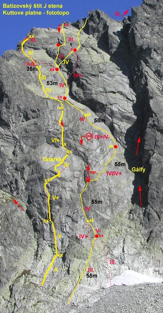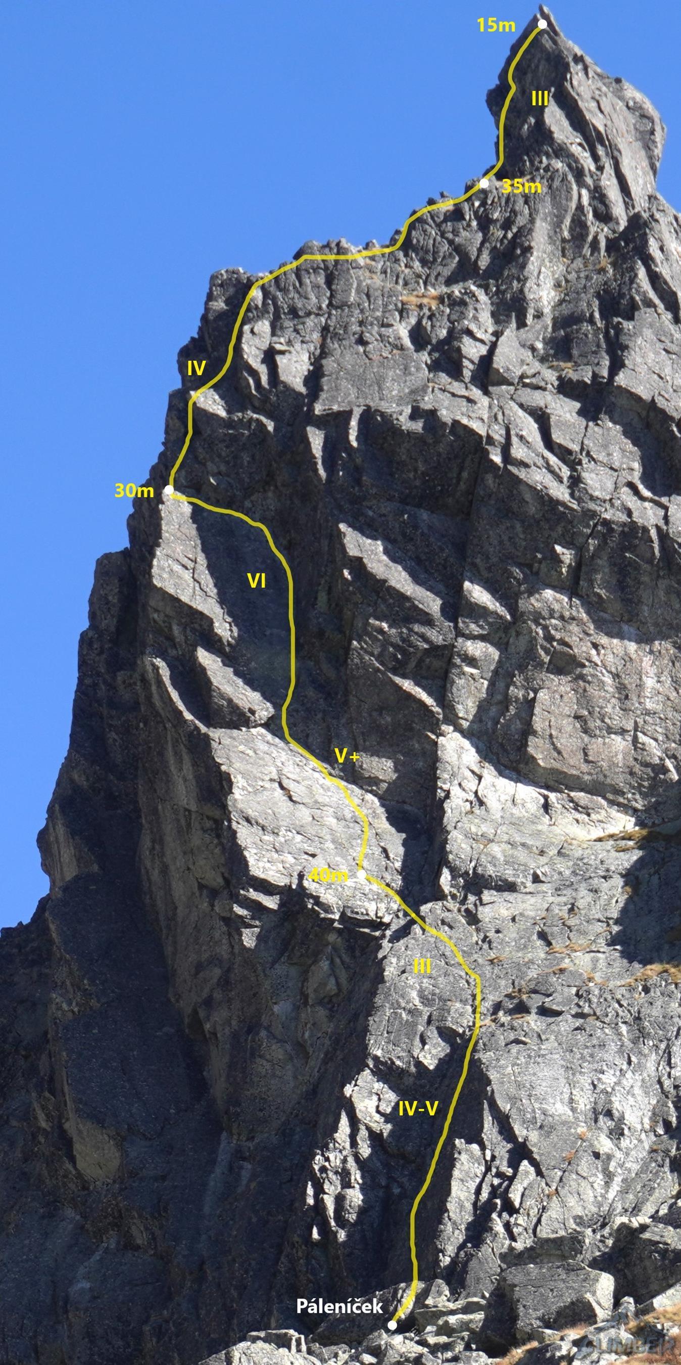 Początek czwartego wyciągu (IV) to trawers w prawo do spita i przewinięcie na wielką leżącą płytę – idziemy nią wzdłuż wyraźnego pęknięcia skośnie w prawo (do stanowiska po lewej dochodzi Pytlakov). Kluczowy wyciąg zaczynamy od tarciowego trawersu w lewo (ok. V+, hak), po którym czeka nas trikowe wejście do przewieszonego zacięcia (VI+, spit) – po kilku ruchach robi się łatwiej i kontynuujemy zacięciem w lewo do przewinięcia. Po nim kolega zatrzymał się niechcący na stanowisku z Pytlakova po lewej, prawidłowo idziemy wzdłuż pęknięć w płycie po prawej stronie do stanowiska zlokalizowanego ok. 10 metrów wyżej. W oby przypadkach wychodzimy z płyty (IV) na duży trawnik i kierujemy się do jego lewego skraju (spit). Na siódmym odcinku (IV) wspinamy się wzdłuż zacięć i rys wprost do góry, a z następnego stanowiska filarkiem po lewej (III) mijamy końcowy okap i trawersujemy w prawo do stanowiska. Stąd najlepiej iść łatwo skośnie w prawo do ostatniego stanowiska Kutty i zjechać wzdłuż linii tej drogi, ewentualnie na szczyt jeżeli zabraliśmy buty.