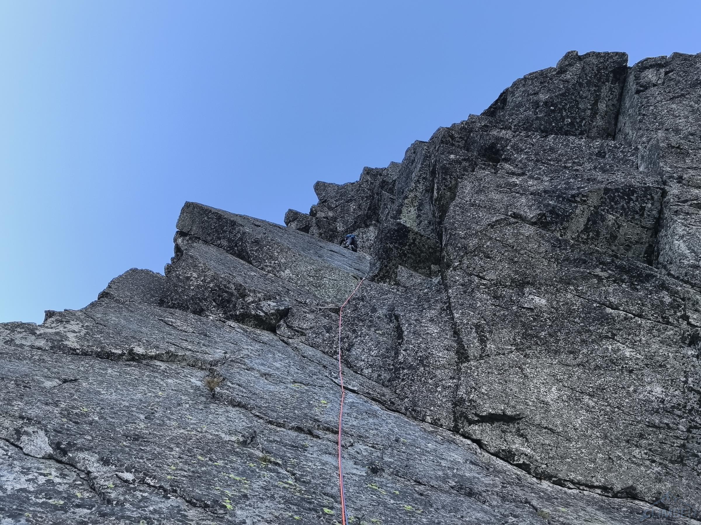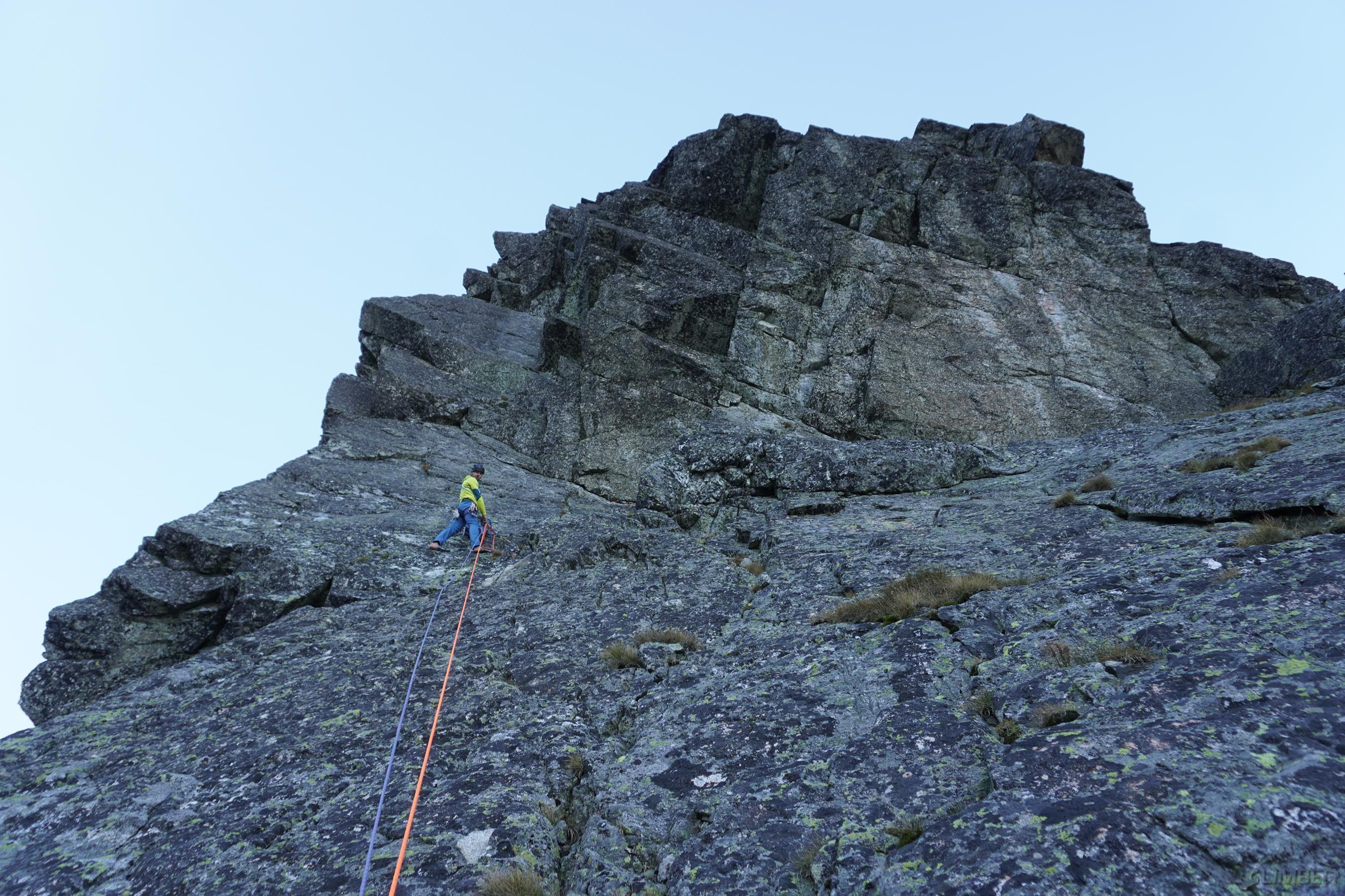 Kluczowy drugi wyciąg oferuje intensywne i różnorodne wspinanie – zaczynamy od dobrze urzeźbionej ścianki, pokonujemy dwa okapiki (ok. VI-) i kontynuujemy gładkim zacięciem (VI), z którego pod koniec trawersujemy płytą w lewo (ok. V+). Po drodze jest kilka słabych haków i zaklinowana kostka, po dołożeniu kilku friendów jest całkiem komfortowo, co ważne biorąc pod uwagę „delikatny” charakter wspinania. Po wyjściu z trudności na balkonik po lewej stronie robimy swoje stanowisko i ruszamy dalej – pokonujemy krótki kominek po prawej (IV) i wychodzimy na trawy pod spiętrzeniem szczytowym. Górny odcinek nie jest trudny (III-IV w zależności od wariantu) ale nie radzę robić go w ciągu – ledwo dociągnąłem do grani szczytowej, a i tak musieliśmy przejść nią 10 metrów dalej do wierzchołka. Tutaj znajdziemy zestaw pętli z mailonem – ponieważ robi się ciemno nie kombinujemy z zejściem tylko zjeżdżamy 50m na wschód skąd można już udać się w dowolną stronę. Nas czeka jeszcze zejście na parking i dojazd na nocleg – za kilka godzin umówiony jestem w Białej Wodzie, choć obawiam się że trzeba będzie zmienić plany bo łokieć bolał dziś coraz bardziej z każdym ruchem…