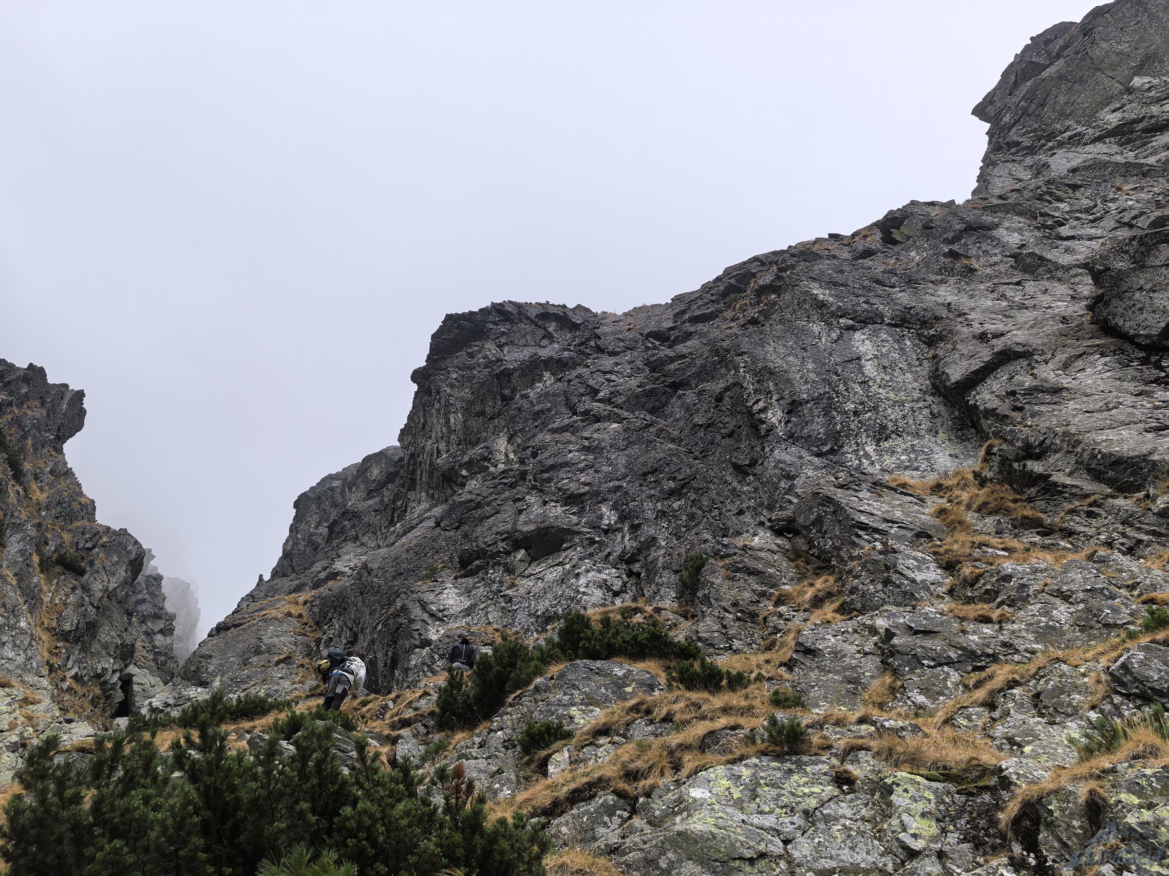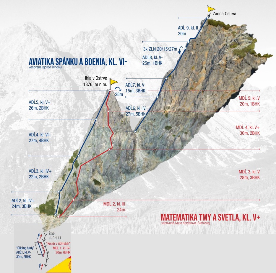 Pochmurny i wietrzny poranek w Dolinie Mięguszowieckiej powoduje, że rezygnujemy z Anią i Adrianem z wyjścia wysoko w góry i zostajemy nad Popradzkim Stawem. Trudniejsze drogi z moją niesprawną ręką odpadają, proponuję więc zdobycie Igły w Osterwie w bardziej wspinaczkowym stylu niż drogą normalną. Na jej południowo-zachodniej ścianie znajdziemy bowiem dwie prawie w całości obite linie, dodatkowo jedna z nich kontynuuje po zjeździe na Wyżnie Siodełko pod Igłą wprost na szczyt Zadniej Osterwy. To Aviatika spánku a bdenia, ma 8-9 wyciągów (4 na Igłę i 4 na Osterwę + 1 dodatkowy w żlebie) i trudności do VI-. By jeszcze dołożyć wspinania zaczynamy od pozostałej do kolekcji na ścianie północnej Zadniej Osterwy drogi Augustovej (V+, 5 wyciągów).