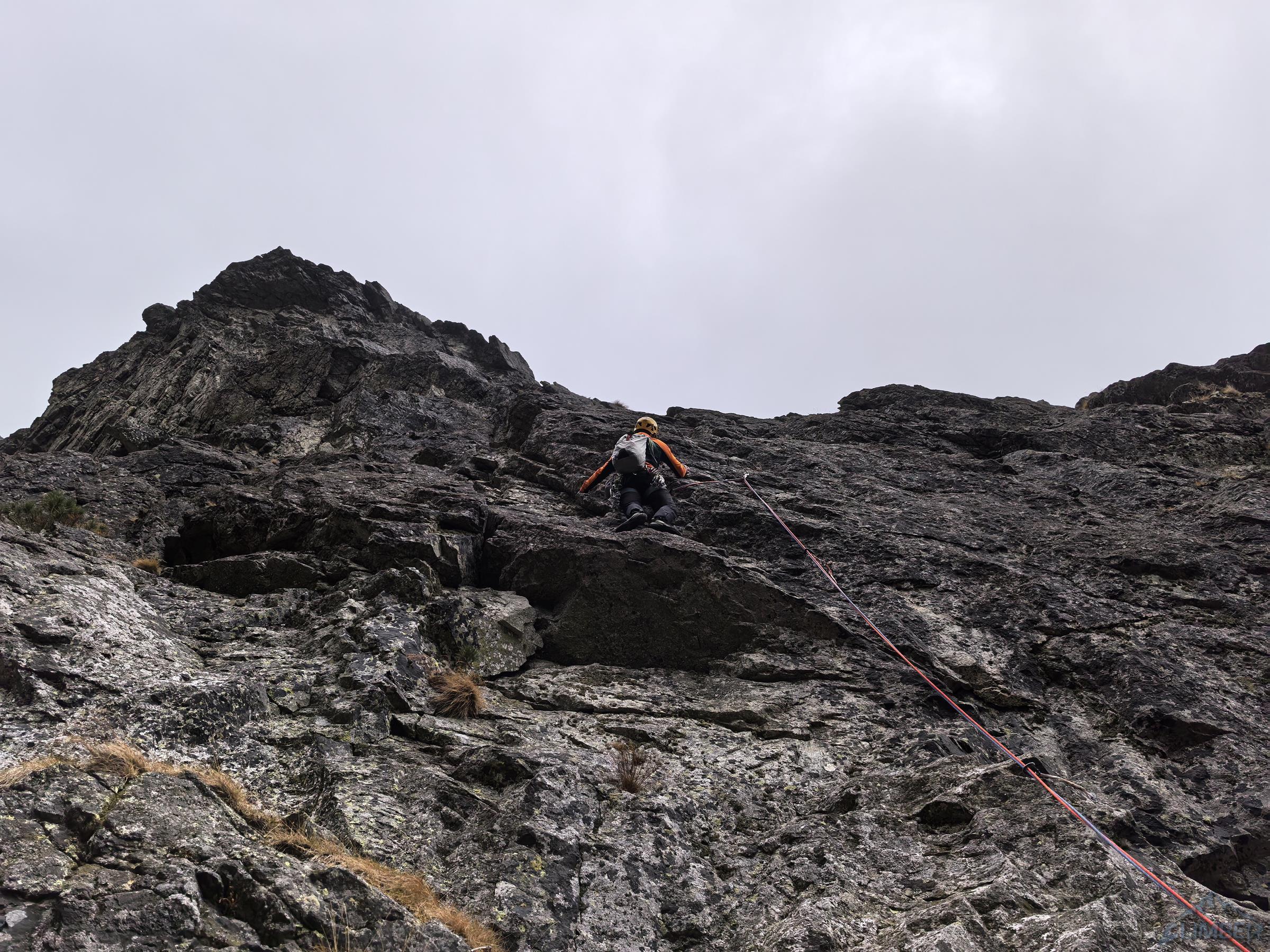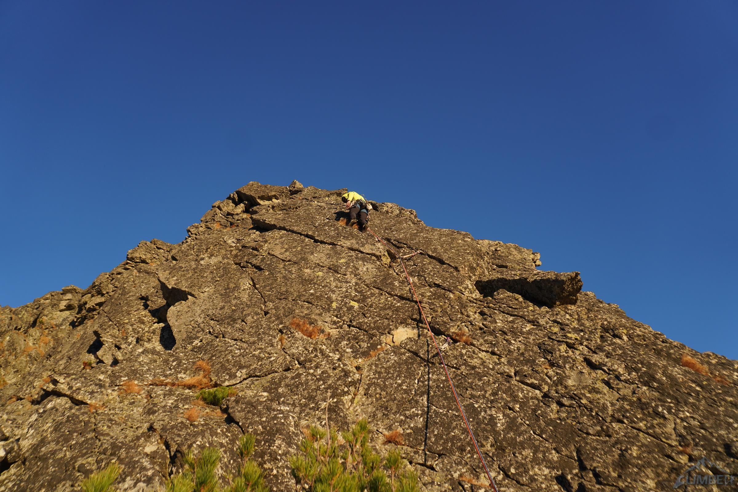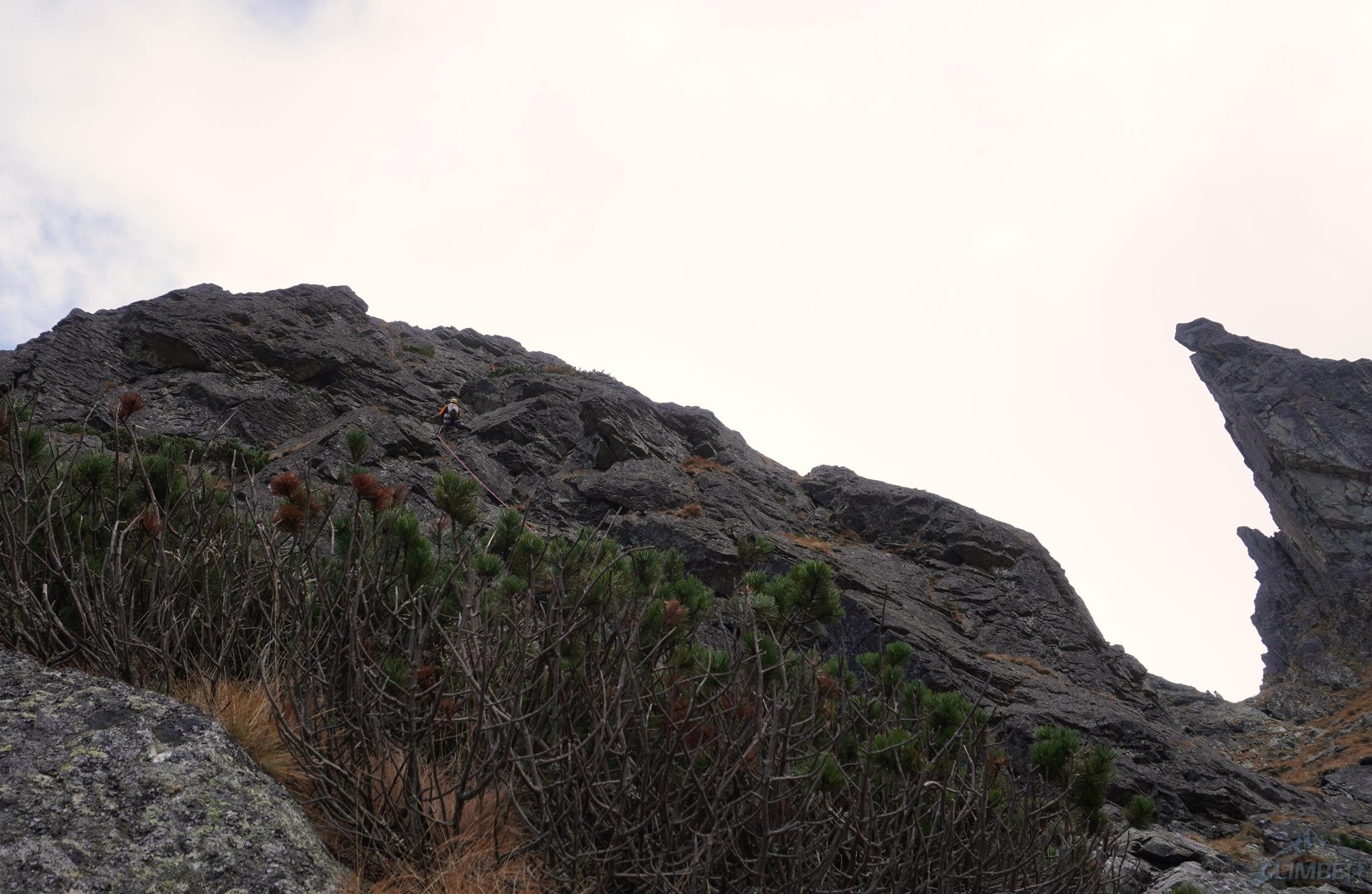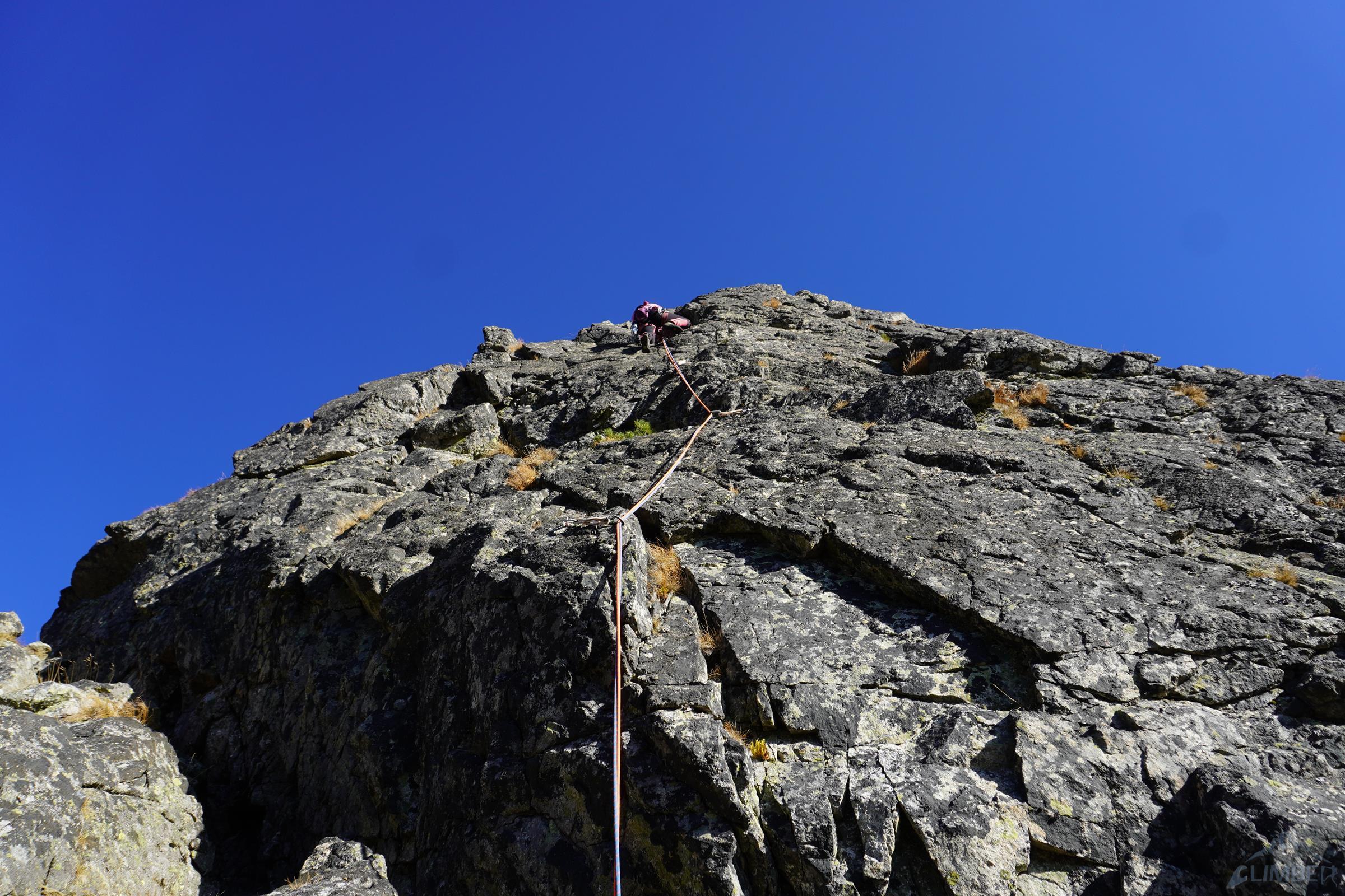 Drogę na Igłę prowadzi Ania – pierwszy wyciąg to fajna płytka (IV+) z trzema ringami, w razie potrzeby można coś dołożyć. Drugi odcinek (IV+, 2 ringi) jest nieco trawiasty – po kilku metrach odbijamy między kosówki w lewo i docieramy do górnego spiętrzenia ściany gdzie robi się dużo stromiej oraz bardziej lito. Kluczowy wyciąg (VI-, 4 ringi i dobrze coś dorzucić) to ładne wspinanie po dużych chwytach do góry, a następnie trawers w lewo do płyty ograniczonej z lewej strony kantem ściany, a z prawej ciasnym zacięciem. Ostatni odcinek (V+, 2 ringi + własna) idziemy rysą i zacięciem po prawej, po czym odbijamy lekko w lewo techniczną płytką wyprowadzającą wprost na wierzchołek Igły.
