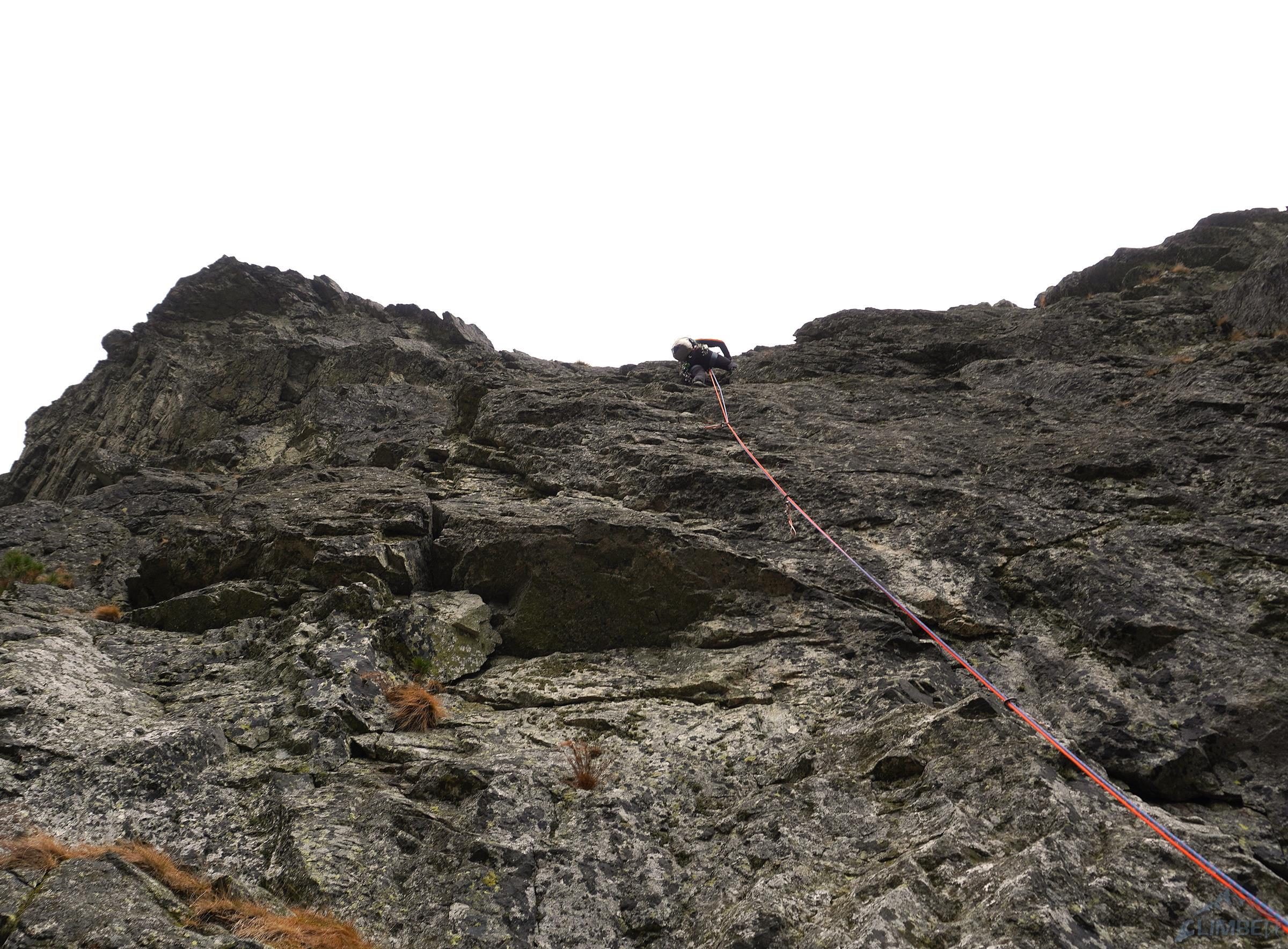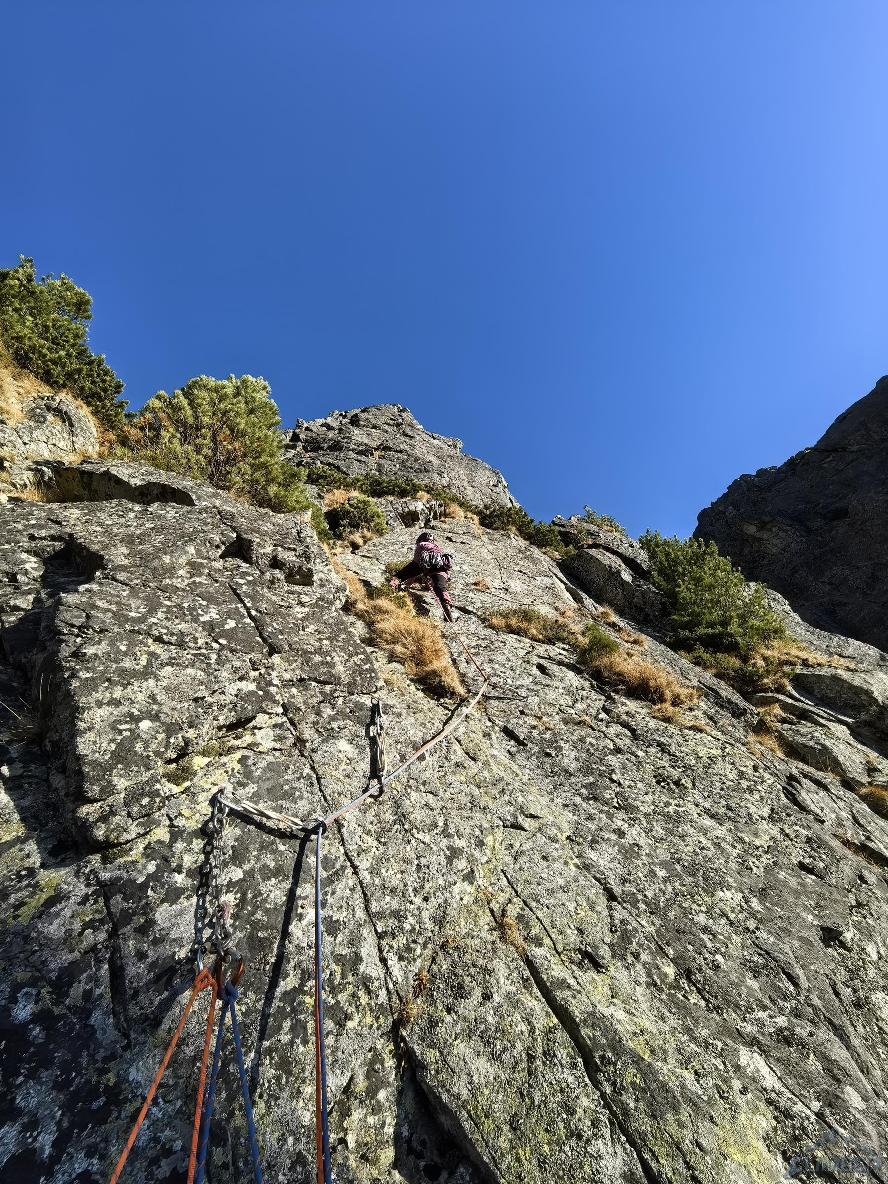 Po wyjściu na Zadnią Osterwę marudzimy nieco, że pogoda nas wykiwała – podczas gdy wysoko w górach chmury się rozeszły i zrobiło się pięknie, my siedzimy nisko w cieniu. Na szczęście na kolejnej drodze złapiemy nieco Słońca, do tego Ania i Adrian będą mieli w końcu okazję stanąć na Igle – trzeba więc szukać pozytywów 😊. By dostać się pod Aviatikę (oraz biegnącą obok Matematikę) najłatwiej wejść na ścieżkę biegnącą nad Galerią Osterwy, przetrawersować za jej skraj a następnie kierować się do góry żlebem (I-II). By urozmaicić sobie podejście można dodatkowo przejść jeden z dwóch wyciągów (IV- lub V-) na połogiej płycie w żlebie (patrz topo) – nas to jednak ominęło, pod Igłę dotarliśmy bowiem żlebem od góry. Dobrym pomysłem na łańcuchówkę będzie też przejście jednej z dróg kończących się na ostatniej turni nad żlebem pod ścianą Zadniej Osterwy (np. Majovej, Junovej, Julovej) i zjechanie z jej wierzchołka na taras z którego startują obie wspomniane drogi na południowo-zachodniej ścianie Igły. Schodząc od góry żlebem czeka nas jeden trudniejszy uskok – w naszym przypadku był śliski, zjechaliśmy więc z taśmy na kosówce. Matematika startuje z tarasu poniżej po prawej stronie (łańcuch), Aviatika przy ringu ok. 10 metrów na lewo.
