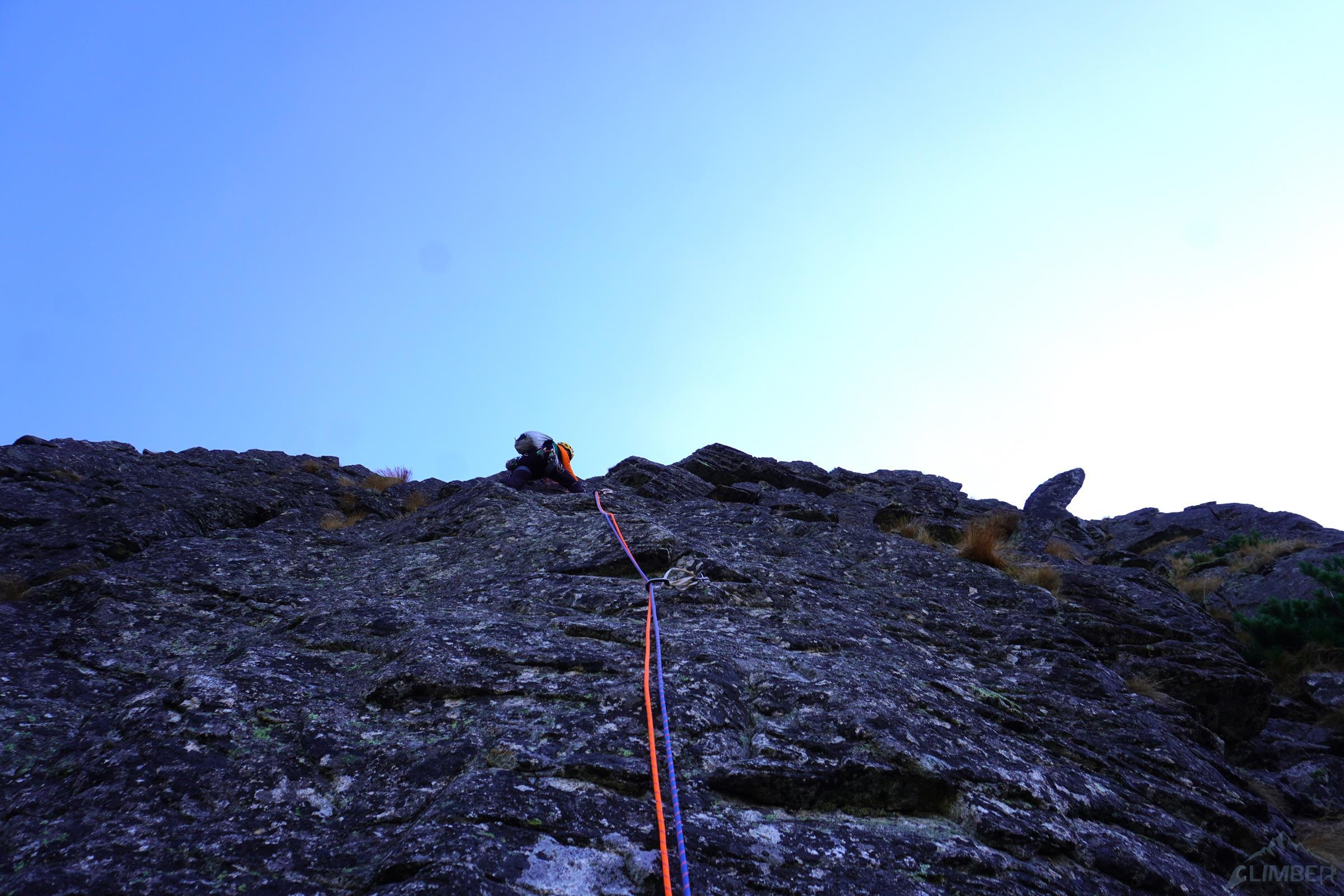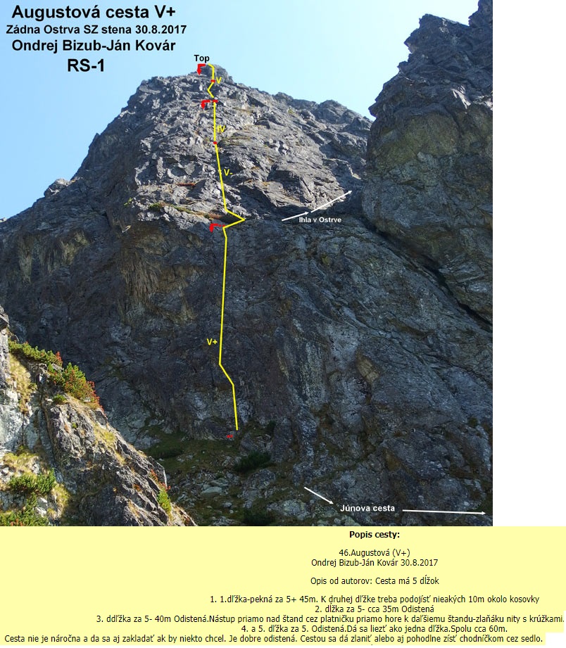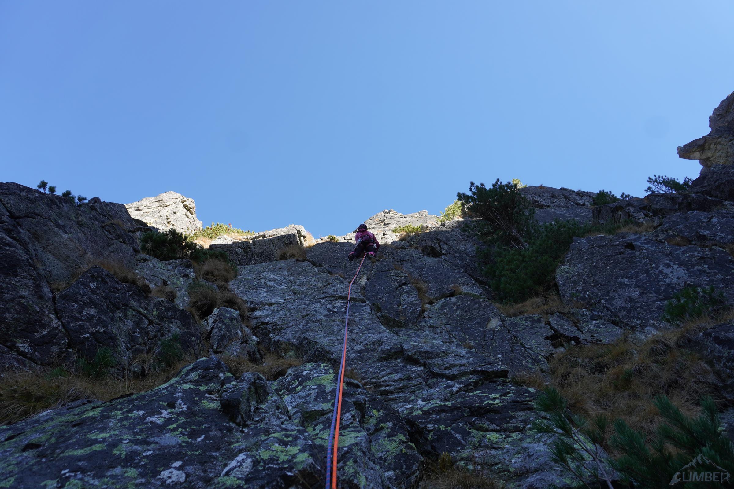 Po podejściu żlebem łatwo namierzamy start drogi i zaczynamy wspinanie. Skała jest zimna i wilgotna, Adrian traci więc sporo sił i nerwów przy pokonaniu trudności (V+), które czekają zaraz na początku. Po trikowym trawersie nad okapikiem pojawiają się większe chwyty, kolega łapie więc rytm i wspina się prosto do góry wzdłuż kolejnych spitów i dociera do stanowiska pod wielkim trawiastym tarasem, którym przejść można w prawo pod Igłę w Osterwie. Drugi wyciąg (V-) to minięcie kosówek, przejście tarasu i wspinanie ładnymi zacięciami wprost do góry. Na trzecim odcinku czeka dobrze urzeźbiona ścianka (V-), stopniowo tracąca stromość. Czwarty i piąty wyciąg (V) można bez problemu połączyć – zaczynamy zygzakiem między kolejnymi skalnymi progami, a po minięciu stanowiska pokonujemy stromą płytę wieńczącą ścianę. Cała droga jest dość dobrze wyposażona w spity, dodatkowe 2-3 średnie friendy mogą przydać się tylko na łatwiejszych odcinkach więc nie są niezbędne. W porównaniu do najlepszych „miesiącowych” dróg w sektorze wydaje mi się, że Augustova odstaje nieco urodą, choć wrażenia mogły być zaburzone przez sporą wilgoć.