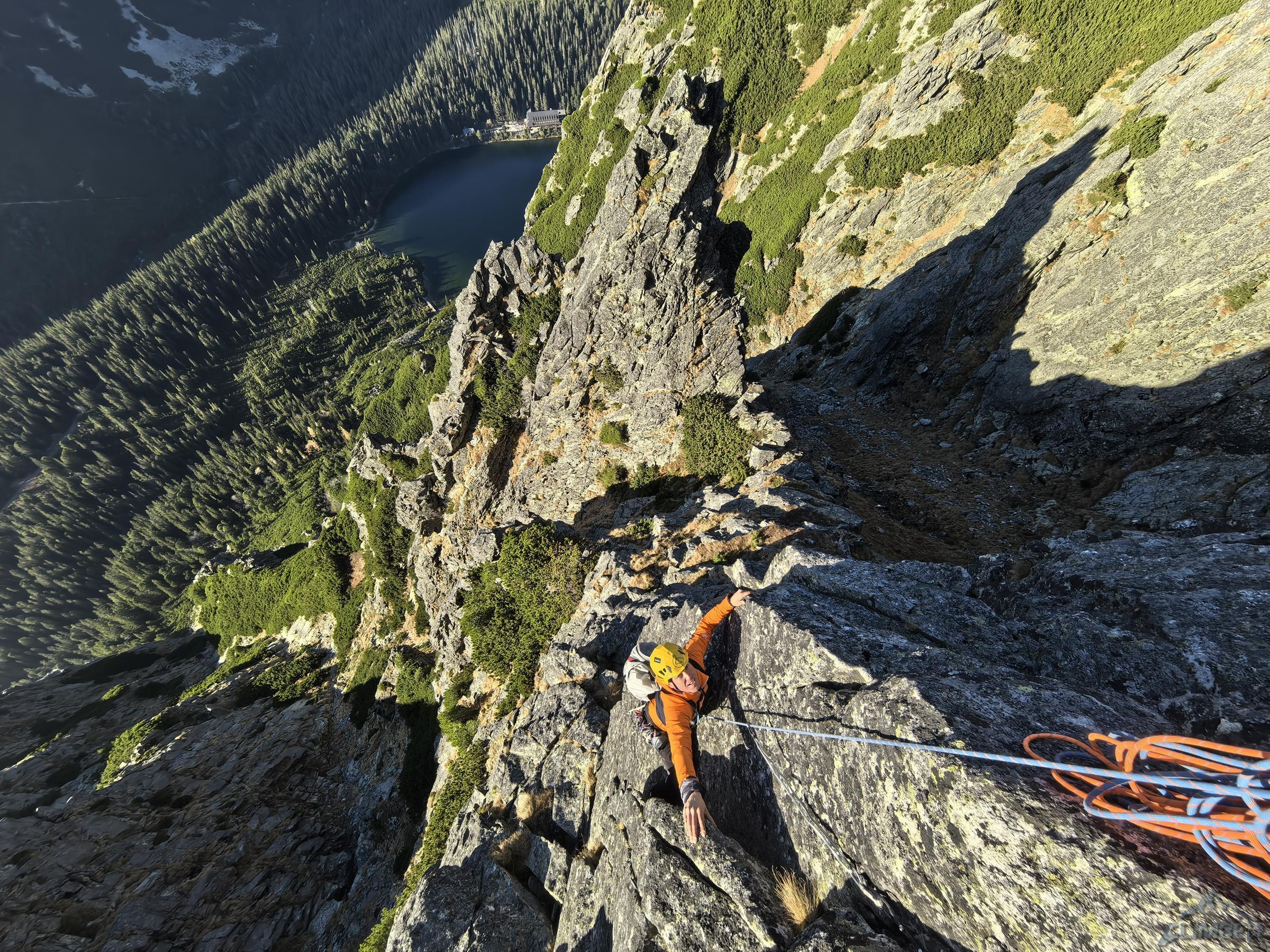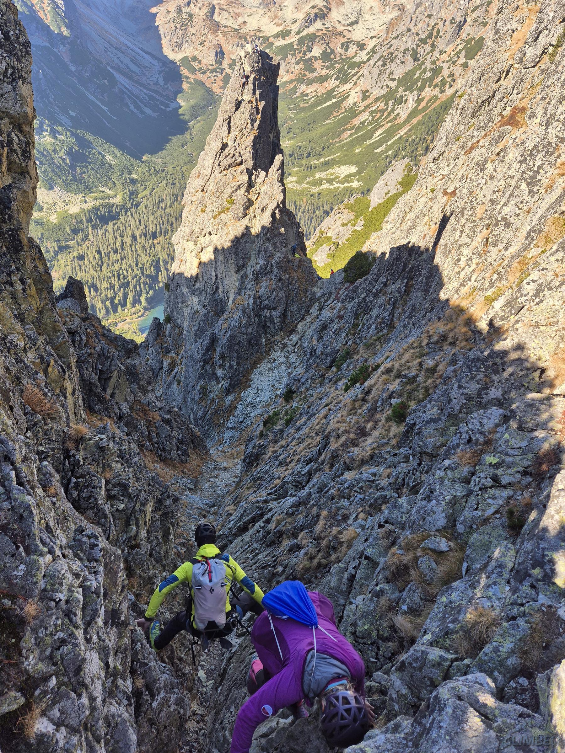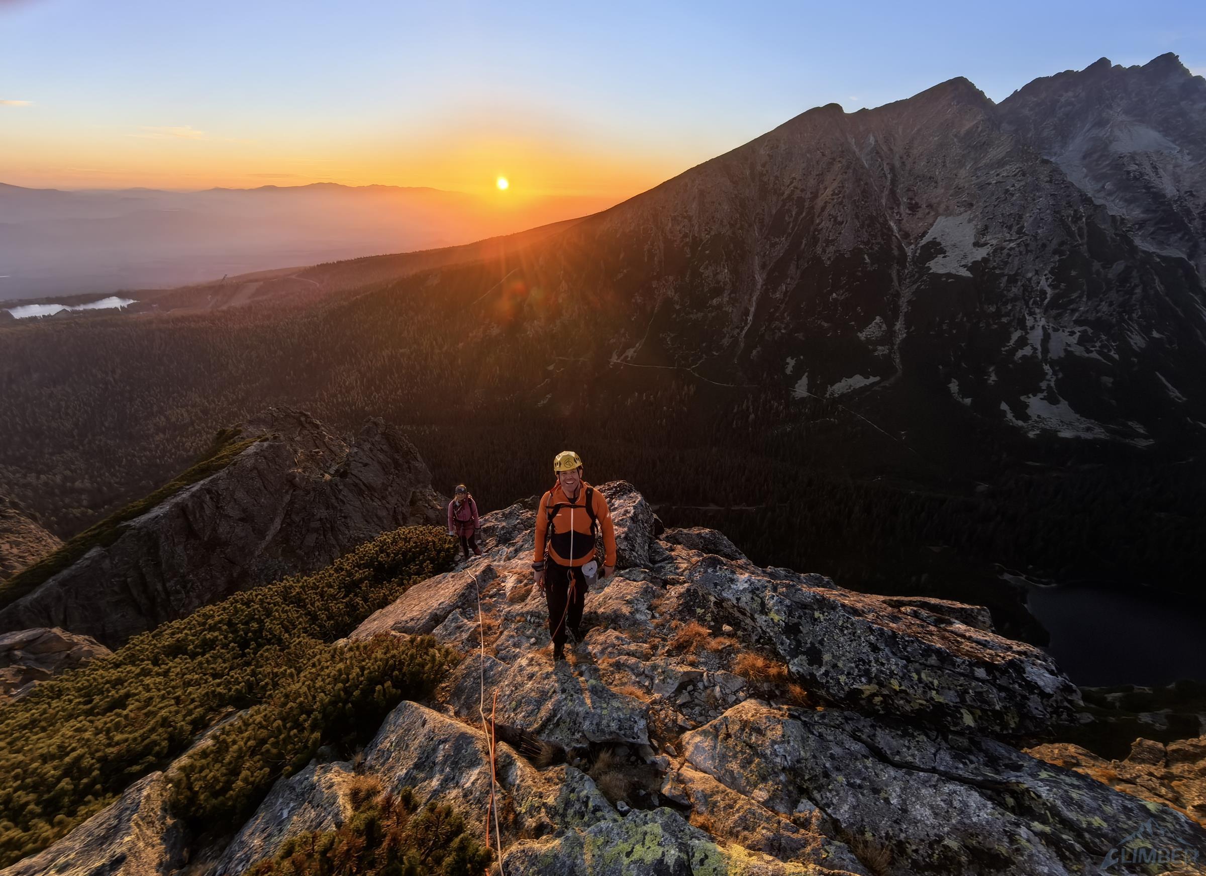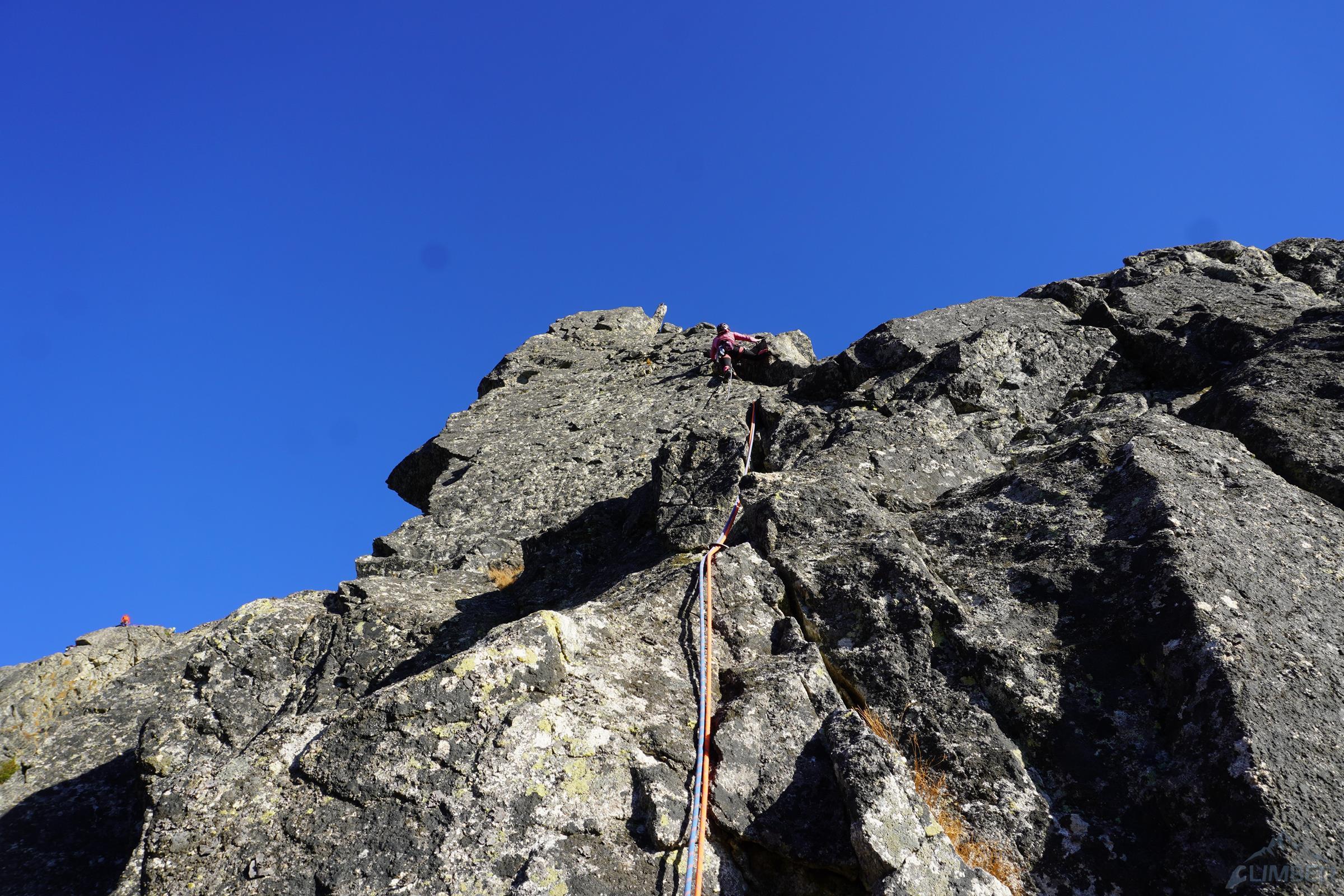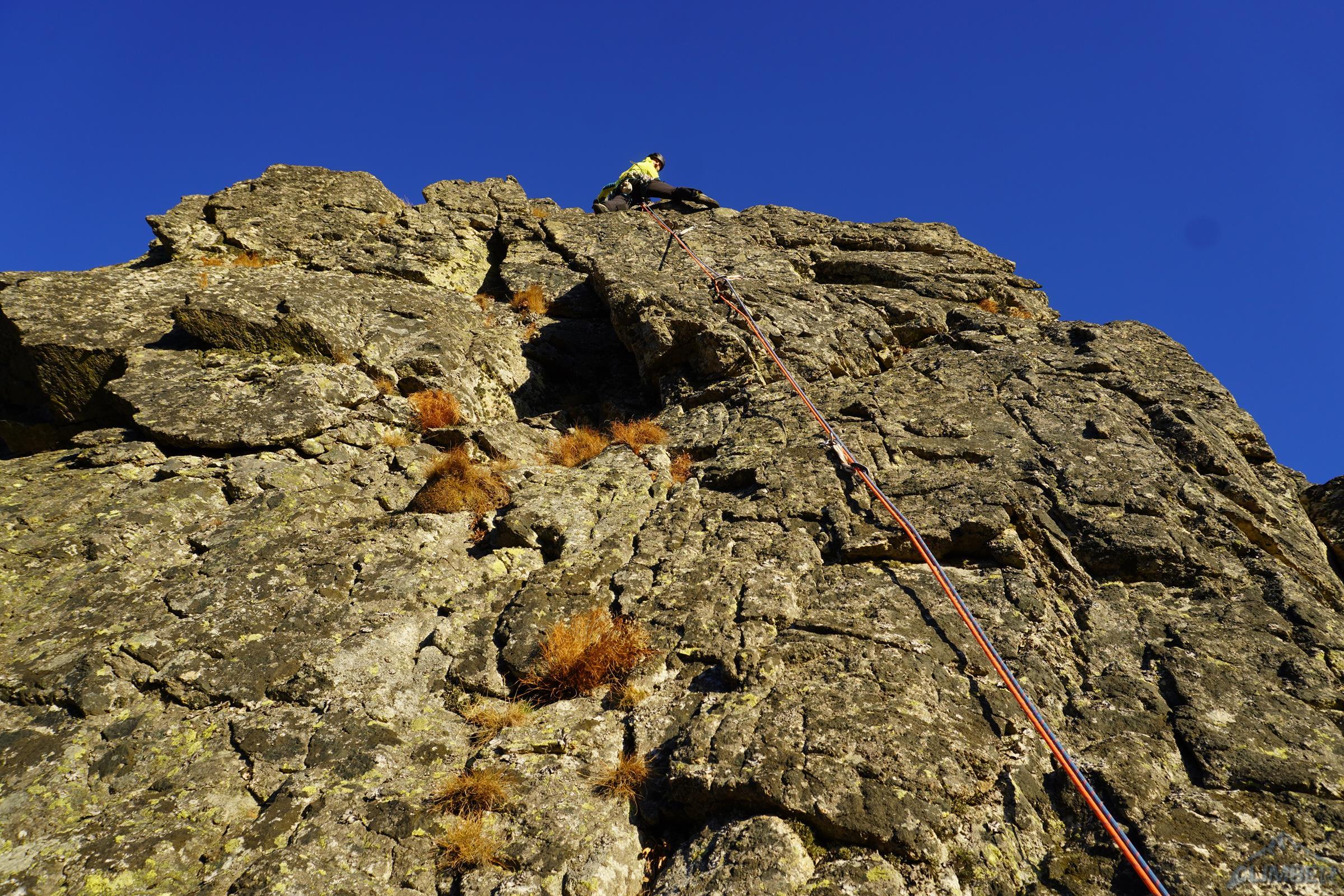 Po krótkiej przerwie (późno zaczęliśmy i mamy tylko nieco ponad godzinę do zachodu Słońca) zjeżdżamy 28 metrów do Wyżniego Siodełka pod Igłą i zaczynamy drugą część Aviatiki – wyprowadzającą na Zadnią Osterwę. Może to też być dobra opcją „wyjściową” po zdobyciu Igły drogą normalną i małym poligonem doświadczalnym dla początkujących taterników. Pierwszy odcinek (IV) jest całkiem ładny i komfortowo obity (5 ringów), połogimi płytami docieramy do pierwszego stanowiska z łańcuchem. Drugi wyciąg to krótka i dobrze urzeźbiona ścianka (V, 3 ringi). Kolejny odcinek dla odmiany wymaga zakładania asekuracji własnej – wspinamy się wzdłuż rys (V-) i docieramy do ostatniego łańcucha. Stąd teoretycznie można zjechać, droga kończy się jednak na szczycie – do pokonania mamy jeszcze krótkie zacięcie (IV, ring) i łatwą grań już bez punktów stałych. Na górze meldujemy się przy ostatnich promieniach Słońca, ale ponieważ zostawiliśmy kijki pod startem Augustovej nie schodzimy szlakiem, tylko ponownie żlebem pod Igłę i w prawo na taras nad pierwszym wyciągiem wspomnianej drogi. Można zjechać z jej stanowiska ścianą lub wygodniej z drugiego na skraju tarasu do żlebu – w obu przypadkach ok. 40m.
