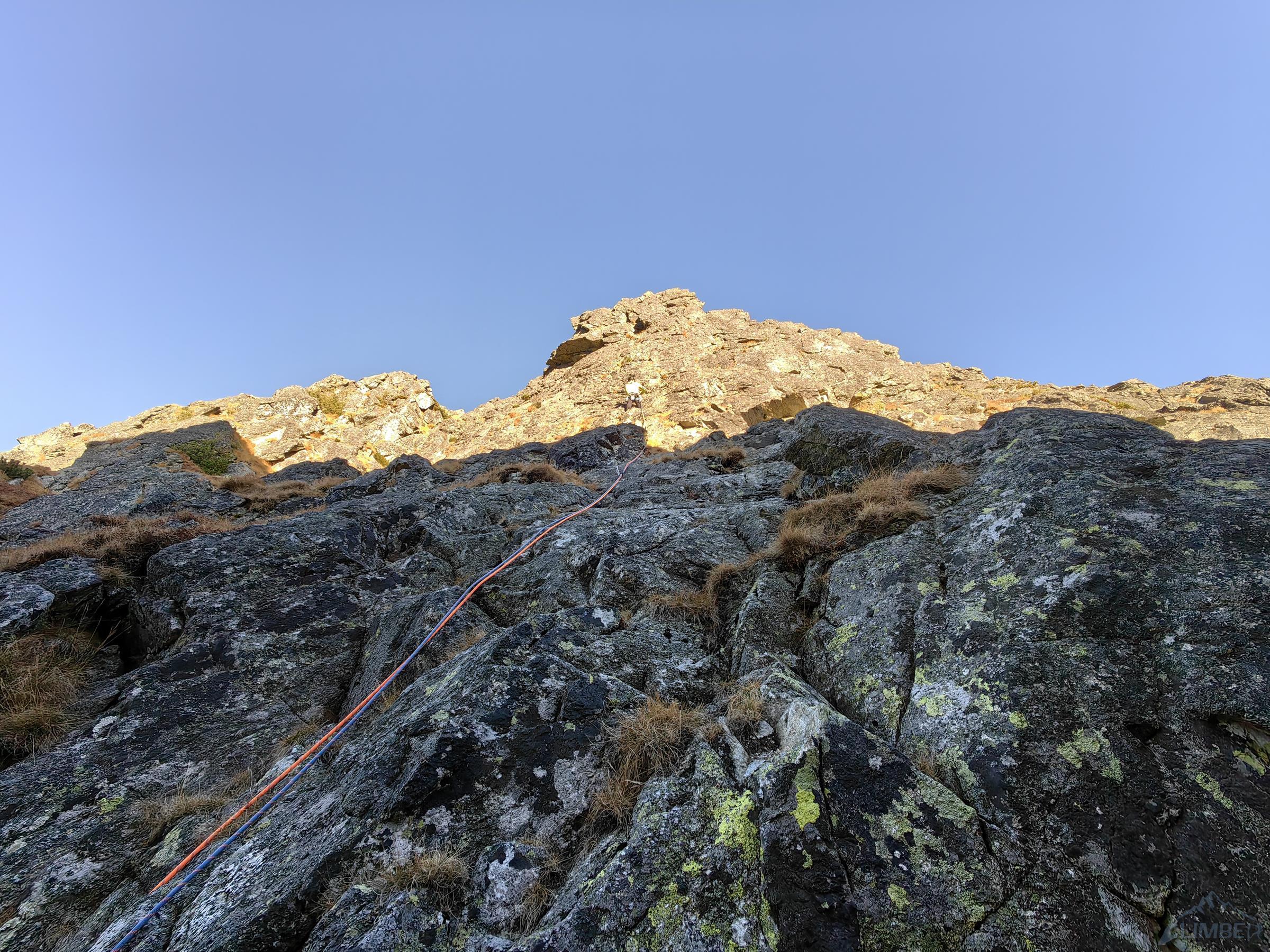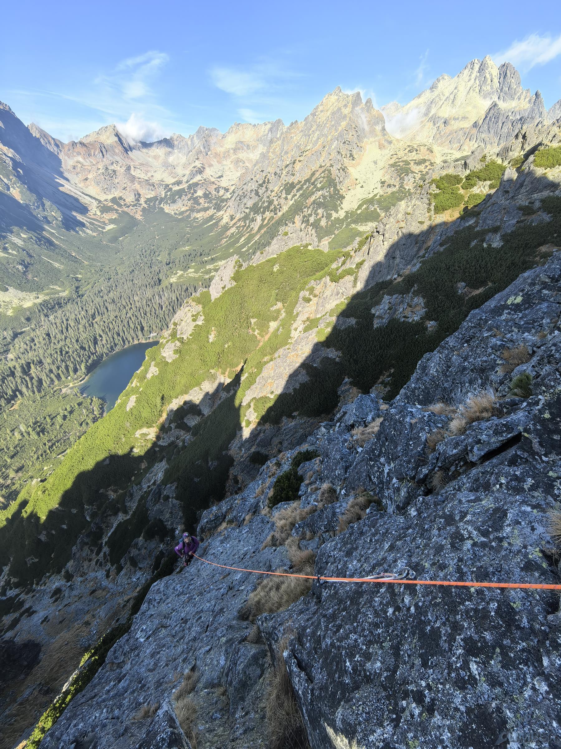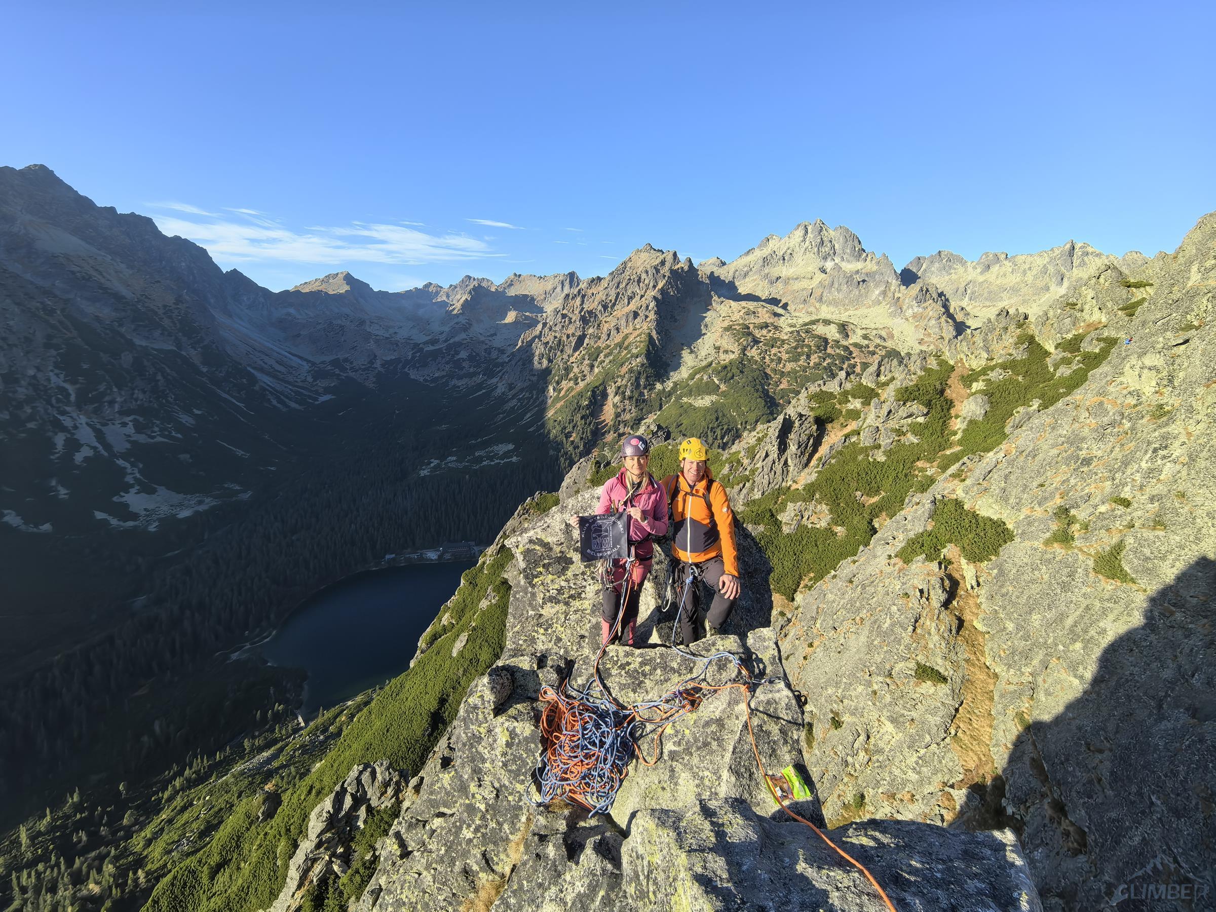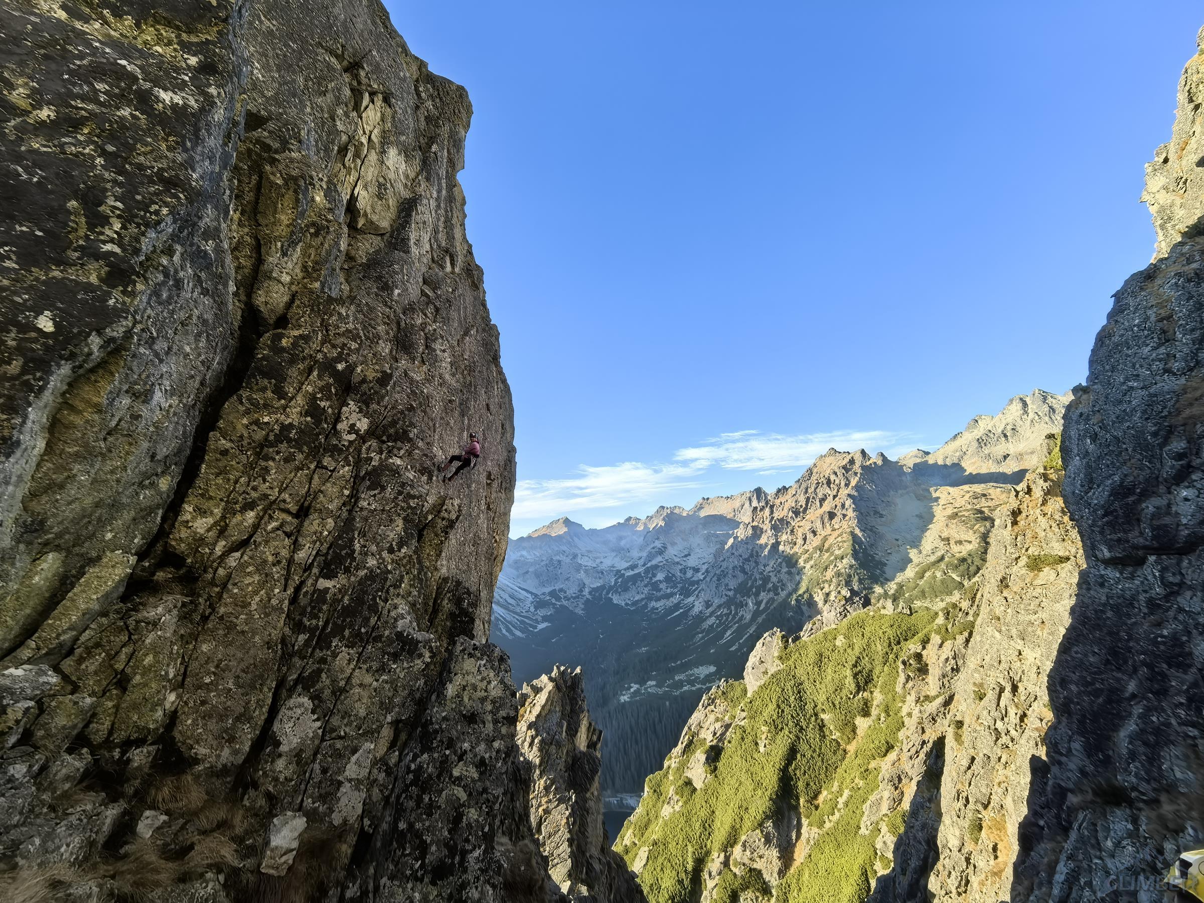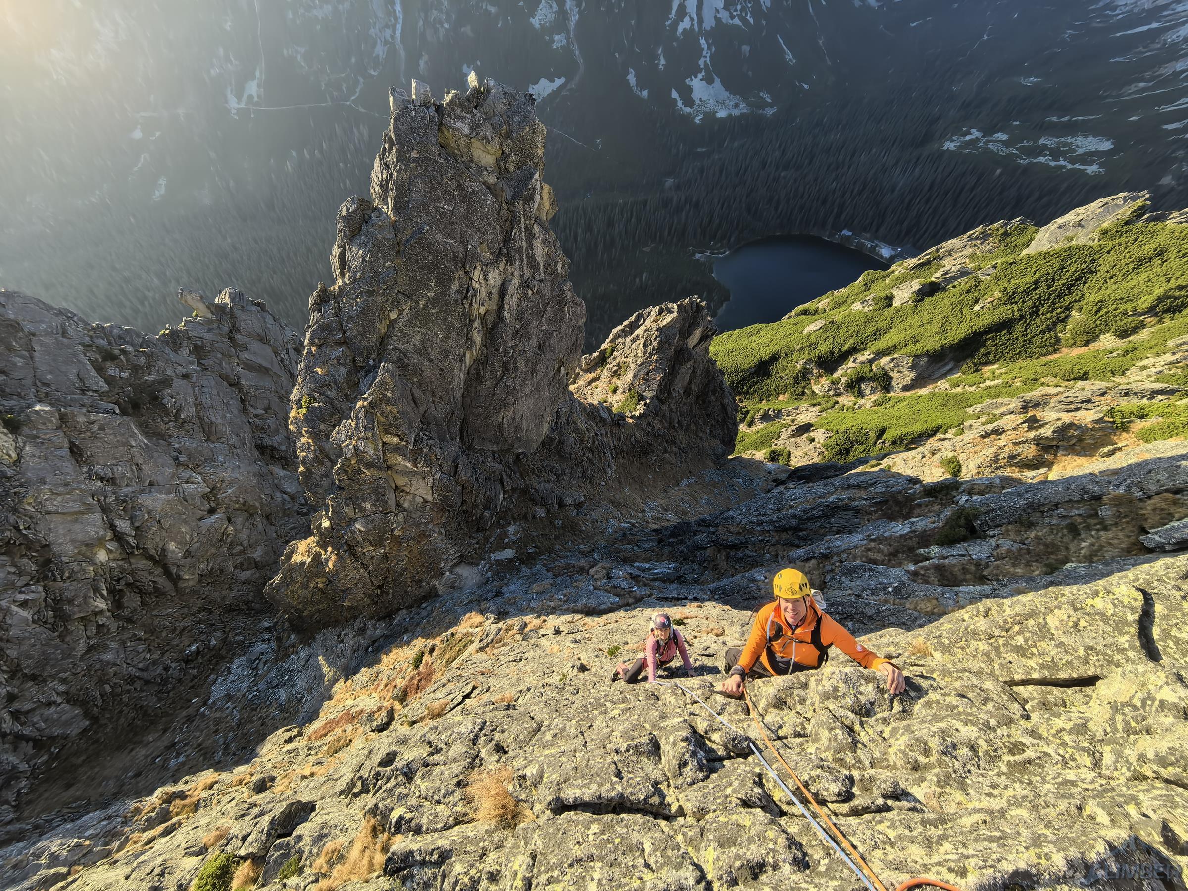Po krótkiej przerwie (późno zaczęliśmy i mamy tylko nieco ponad godzinę do zachodu Słońca) zjeżdżamy 28 metrów do Wyżniego Siodełka pod Igłą i zaczynamy drugą część Aviatiki – wyprowadzającą na Zadnią Osterwę. Może to też być dobra opcją „wyjściową” po zdobyciu Igły drogą normalną i małym poligonem doświadczalnym dla początkujących taterników. Pierwszy odcinek (IV) jest całkiem ładny i komfortowo obity (5 ringów), połogimi płytami docieramy do pierwszego stanowiska z łańcuchem. Drugi wyciąg to krótka i dobrze urzeźbiona ścianka (V, 3 ringi). Kolejny odcinek dla odmiany wymaga zakładania asekuracji własnej – wspinamy się wzdłuż rys (V-) i docieramy do ostatniego łańcucha. Stąd teoretycznie można zjechać, droga kończy się jednak na szczycie – do pokonania mamy jeszcze krótkie zacięcie (IV, ring) i łatwą grań już bez punktów stałych. Na górze meldujemy się przy ostatnich promieniach Słońca, ale ponieważ zostawiliśmy kijki pod startem Augustovej nie schodzimy szlakiem, tylko ponownie żlebem pod Igłę i w prawo na taras nad pierwszym wyciągiem wspomnianej drogi. Można zjechać z jej stanowiska ścianą lub wygodniej z drugiego na skraju tarasu do żlebu – w obu przypadkach ok. 40m.