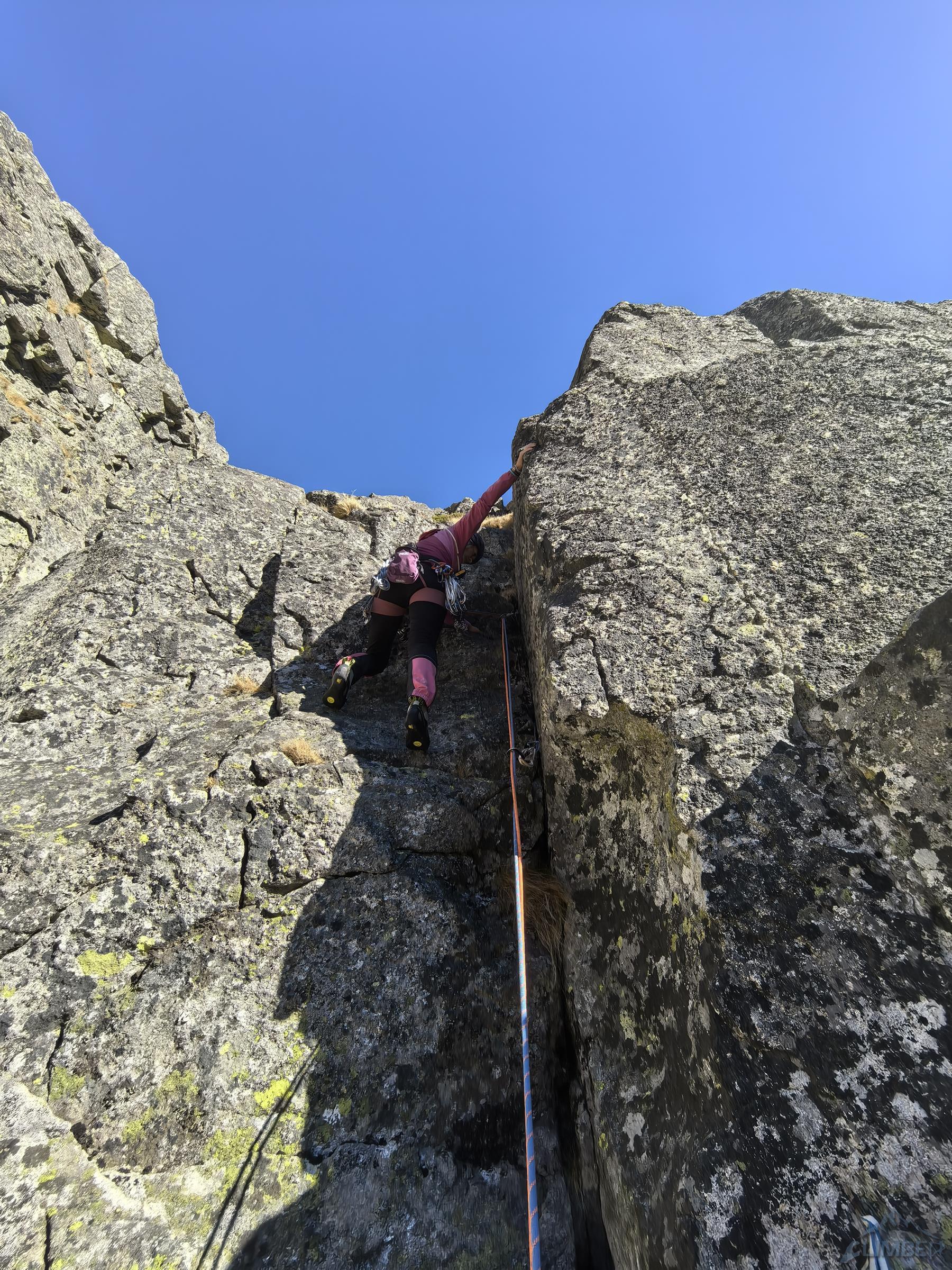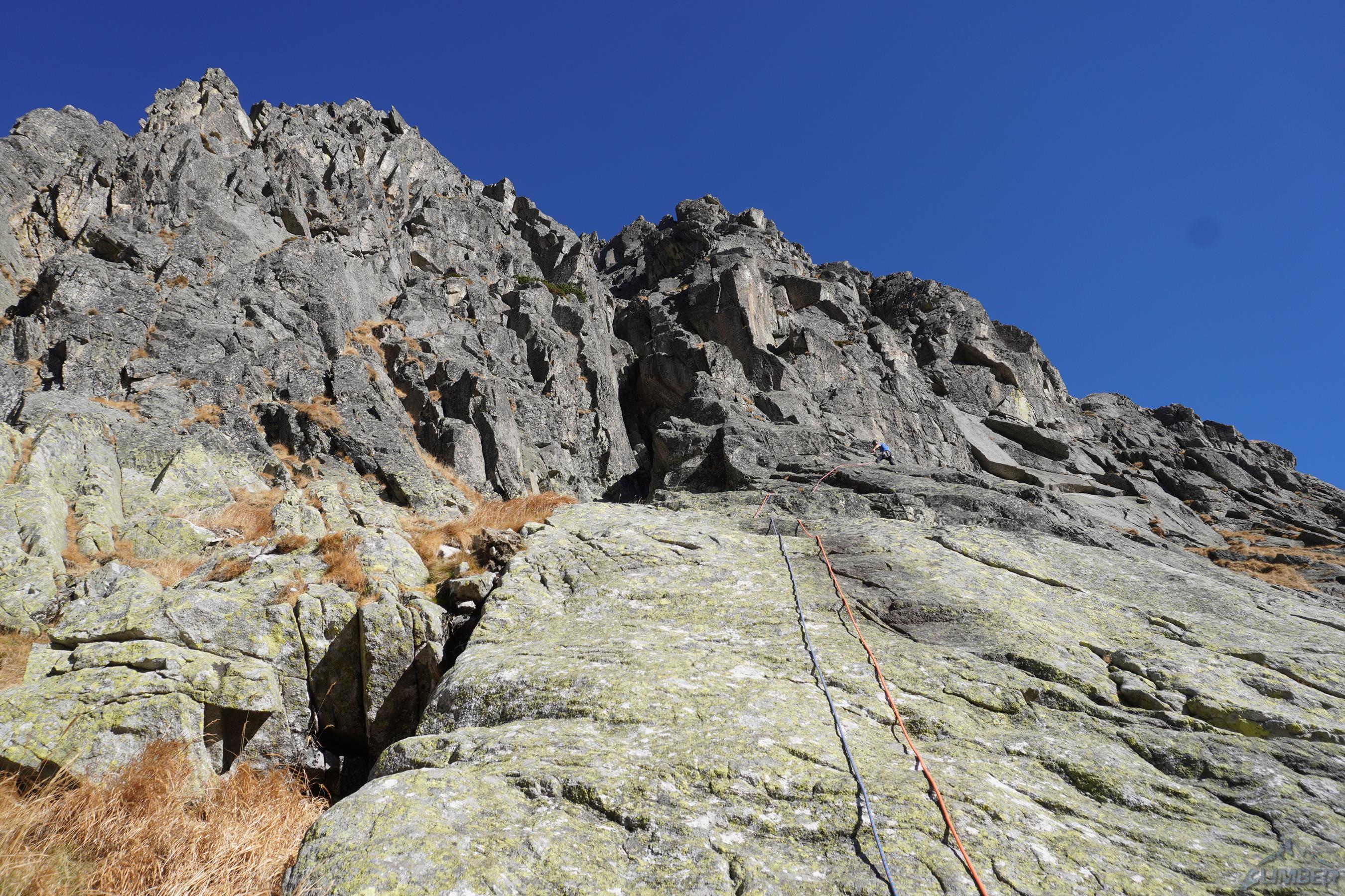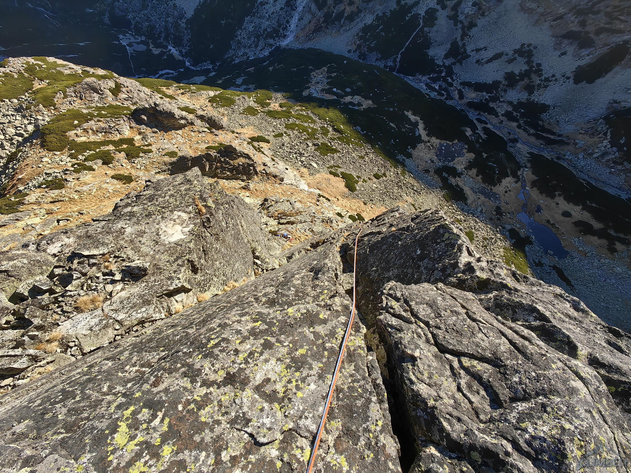 Wyciąg czwarty zaczynamy od wspinania depresją na lewo od dzioba (IV+), po czym łatwym terenem dostajemy się pod wielką nyżę – można ją łatwo obejść po lewej i wrócić na filar w prawo lub też wybrać ciekawszy wariant po prawej – ładną przerysą (V-) lub zacięciem (IV+). Z siodełka przenosimy stanowisko ok. 15 metrów w prawo – pod piękną stromą płytę ograniczoną z prawej strony zacięciem z drogi Kut v platni (klasyk!). Płytą wspinamy się wzdłuż rys skośnie w lewo (V) do szerokiego pęknięcia na skraju filara, opcjonalnie środkiem w podobnych trudnościach – to jednak linia drogi Misia. Po wyjściu z trudności możemy przejść w lewo do stanowiska na przełączce i dalej kontynuować na szczyt na lotnej (ok. 120m, II-III z miejscem IV) lub zatrzymać się przy stanowisku zjazdowym po prawej z Misji i zjechać wzdłuż jej linii. My chcąc zdążyć zrobić jeszcze drugą drogę wybieramy to rozwiązanie i szybko przechodzimy pod lewą część ściany – do zachodu Słońca pozostaje nam tylko półtora godziny.