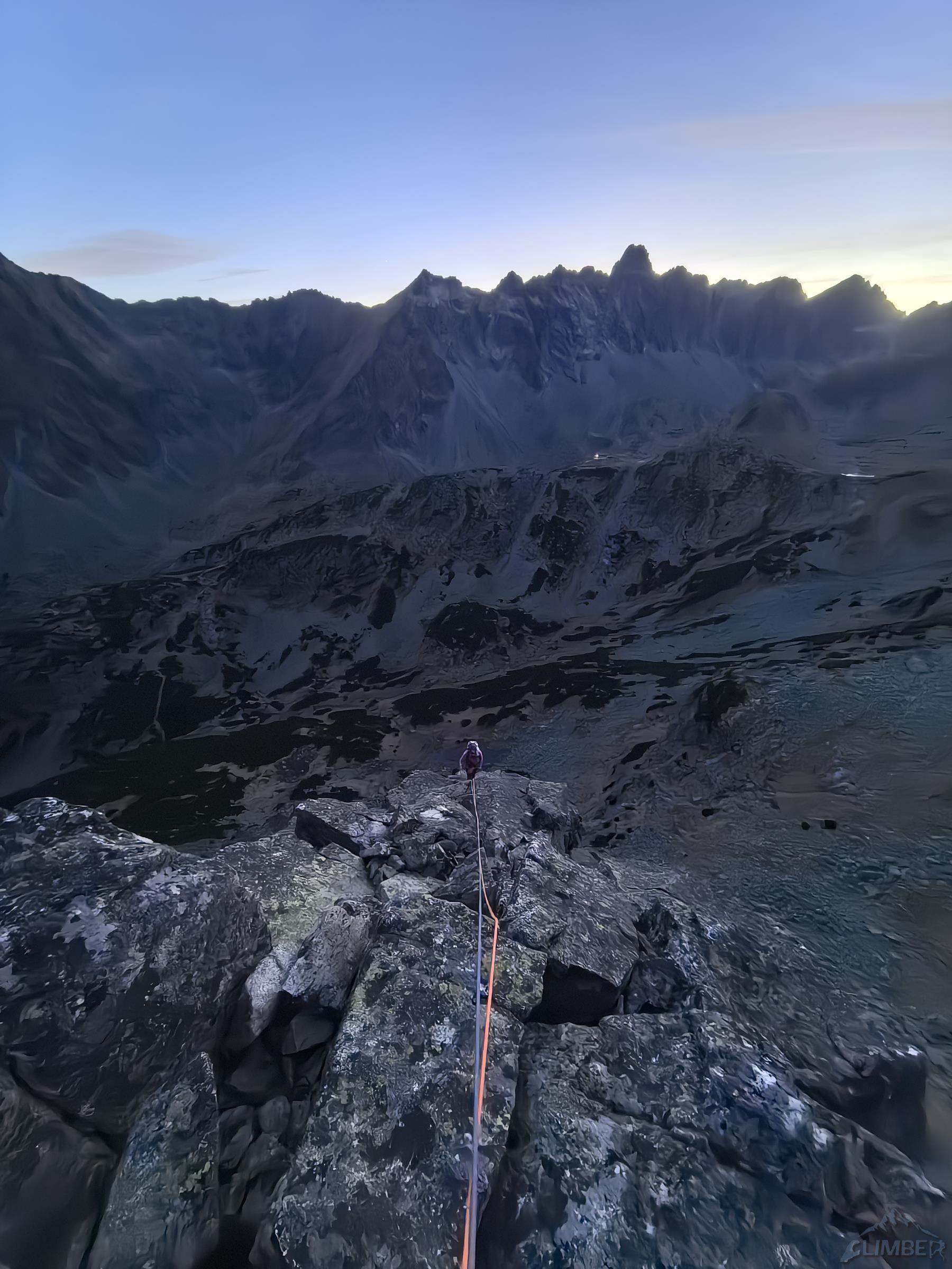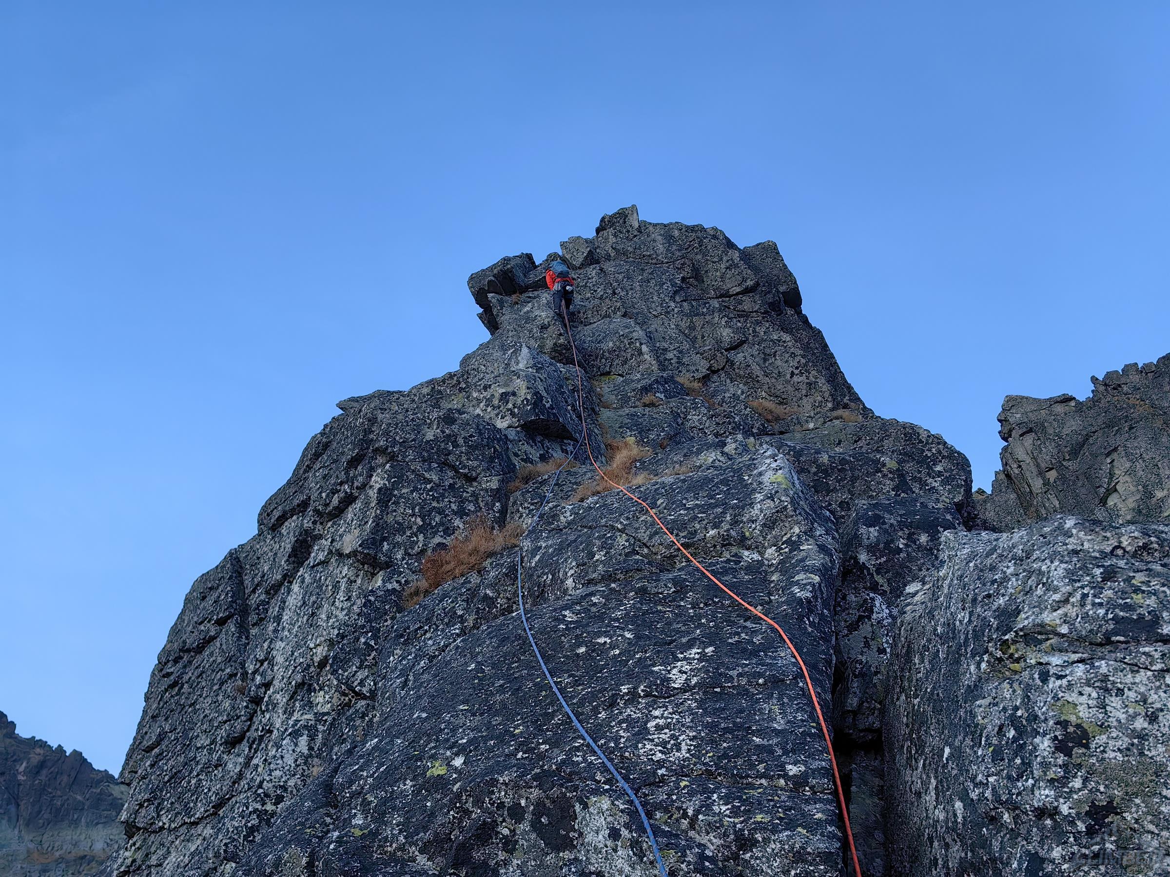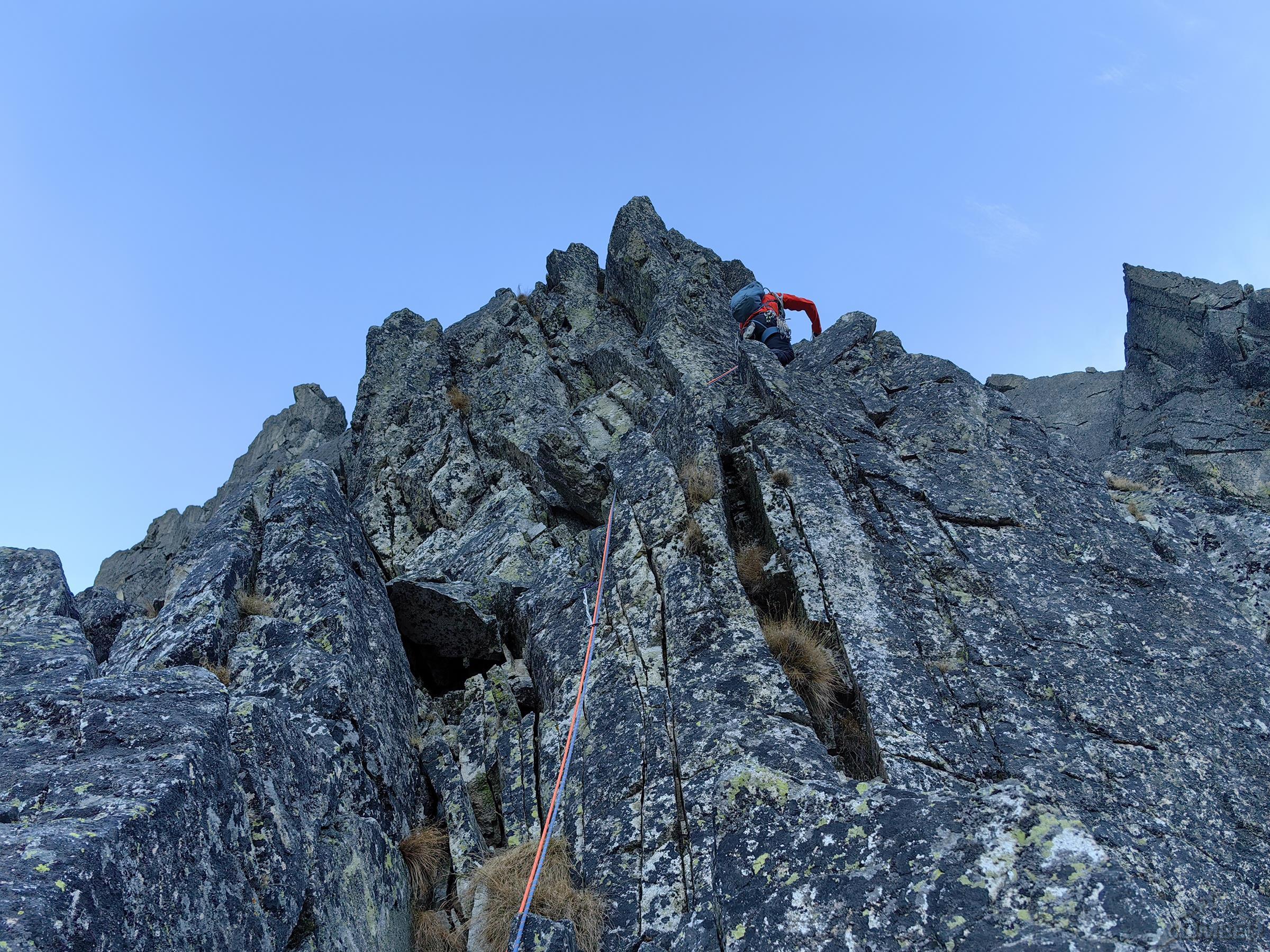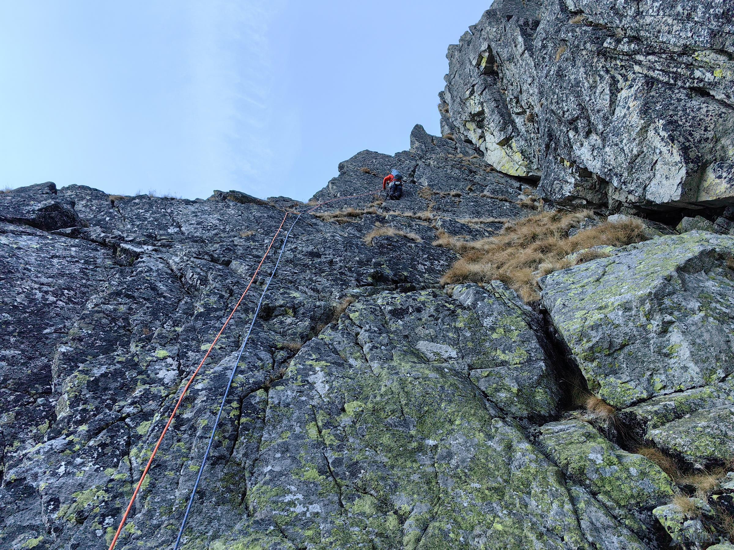Pierwszy wyciąg na Lewym Filarze zaczyna się płytą ok. 10 metrów od kantu ściany – pokonujemy dobrze urzeźbioną ściankę (IV), kontynuujemy rysami i docieramy do łańcucha na balkoniku. Stąd przewijamy się przez nieco kruchy kant do kominka (IV) i wychodzimy w łatwy teren, gdzie czeka kolejne stanowisko. Trzeci odcinek (III) jest łatwy i prowadzi połogim ostrzem filara, na kolejnym czeka nas jednak kluczowy fragment drogi – przewieszone zacięcie z rysą, które pokonujemy płytą po prawej (ok. V-, spit). Ze stanowiska powyżej idziemy trawami w lewo przez siodełko w filarze i po kilku metrach odbijamy w prawo nieco porośniętym zacięciem (ok. III+) wyprowadzającym z powrotem na ostrze, gdzie znajdziemy kolejne ringi. Od tego miejsca filar przyjmuje charakter grani – do przejścia mamy ok. 120 metrów terenu II-III, po drodze są dwa spity przy których w razie konieczności można się zatrzymać, na koniec czeka zejście w dół i ostatni uskok. Na szczyt docieramy w idealnym momencie – robi się ciemno, a zapomnieliśmy drugiej czołówki 😊. Sama droga po wyposażeniu w stanowiska może sporo zyskać na popularności, zarówno jako cel sam w sobie lub skrót na podejściu pod Mały Lodowy czy Ostry Szczyt. Warto nadmienić, że oryginalna wycena IV dotyczy oryginalnego przebiegu, omijającego środkową część filara trawami po prawej – rzadko wybieranym, a po wyposażeniu w stałe punkty wariantu prostującego mało sensownym.