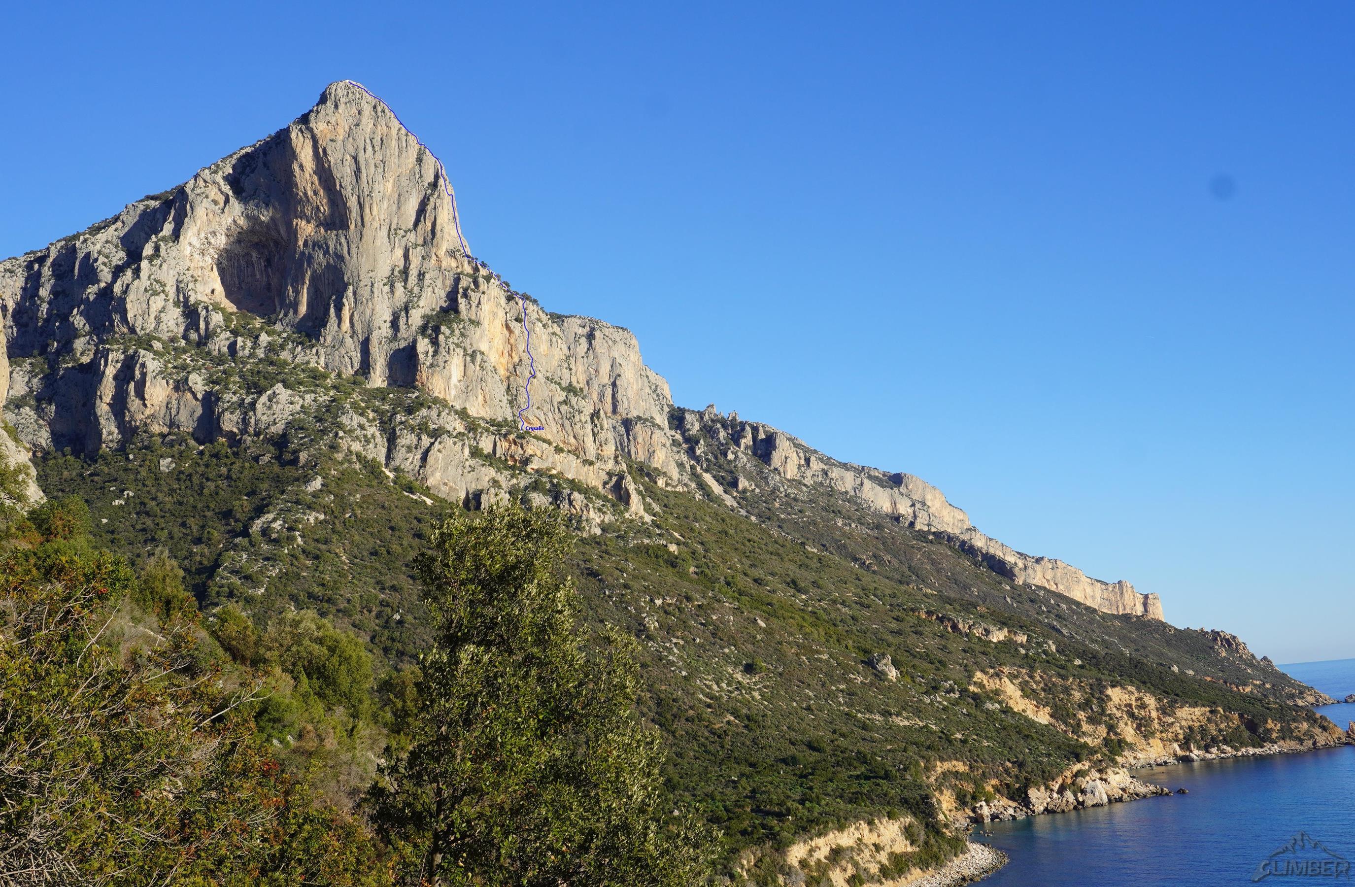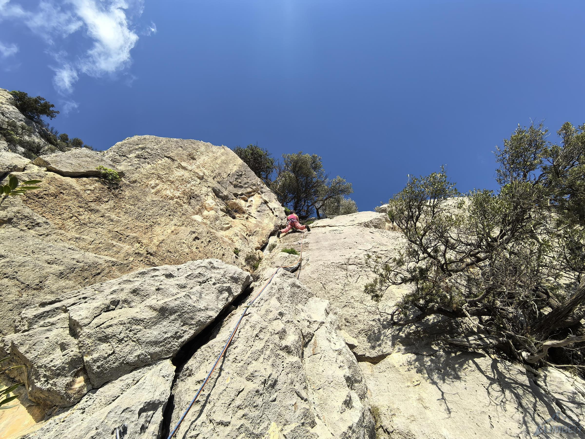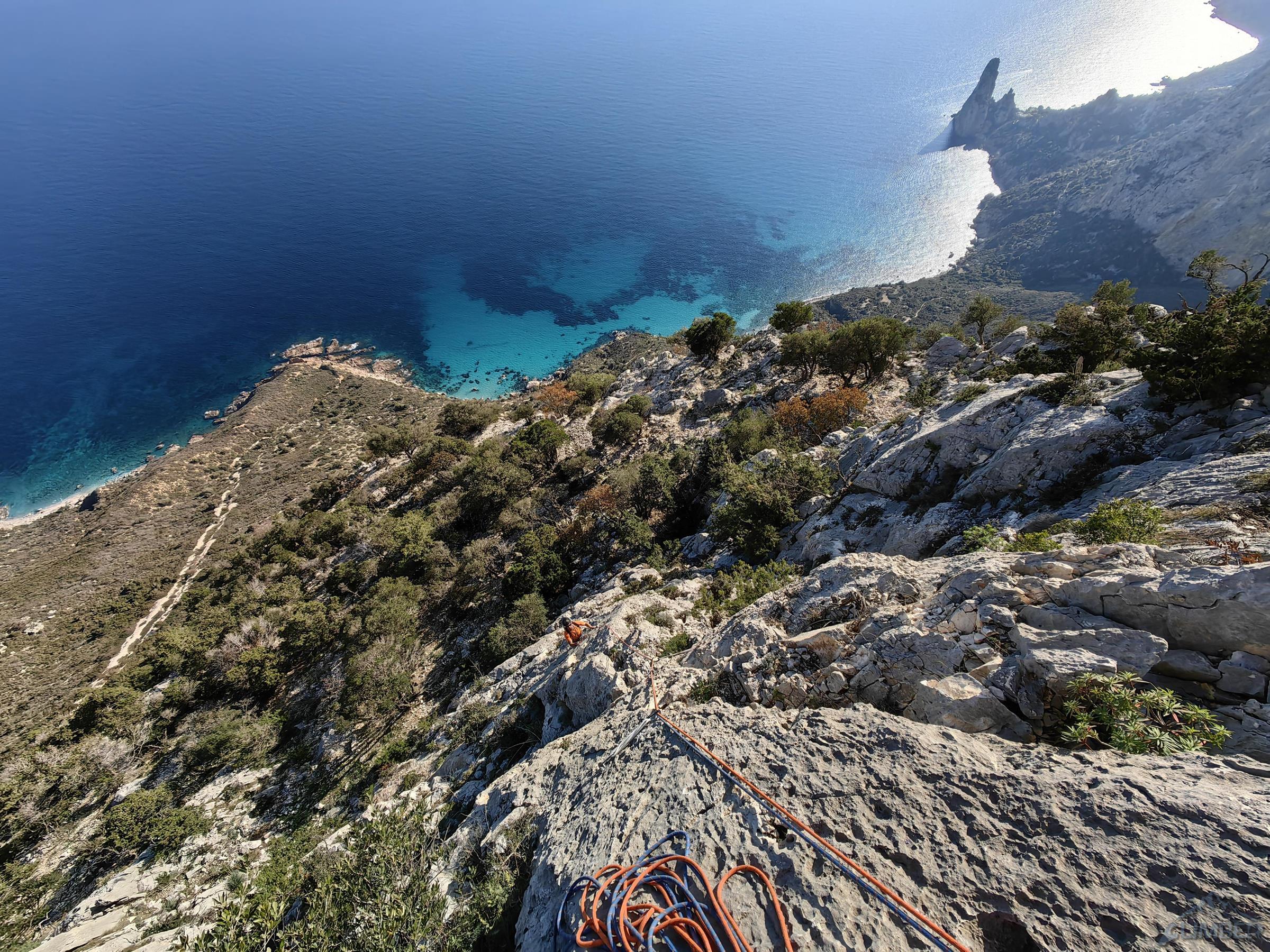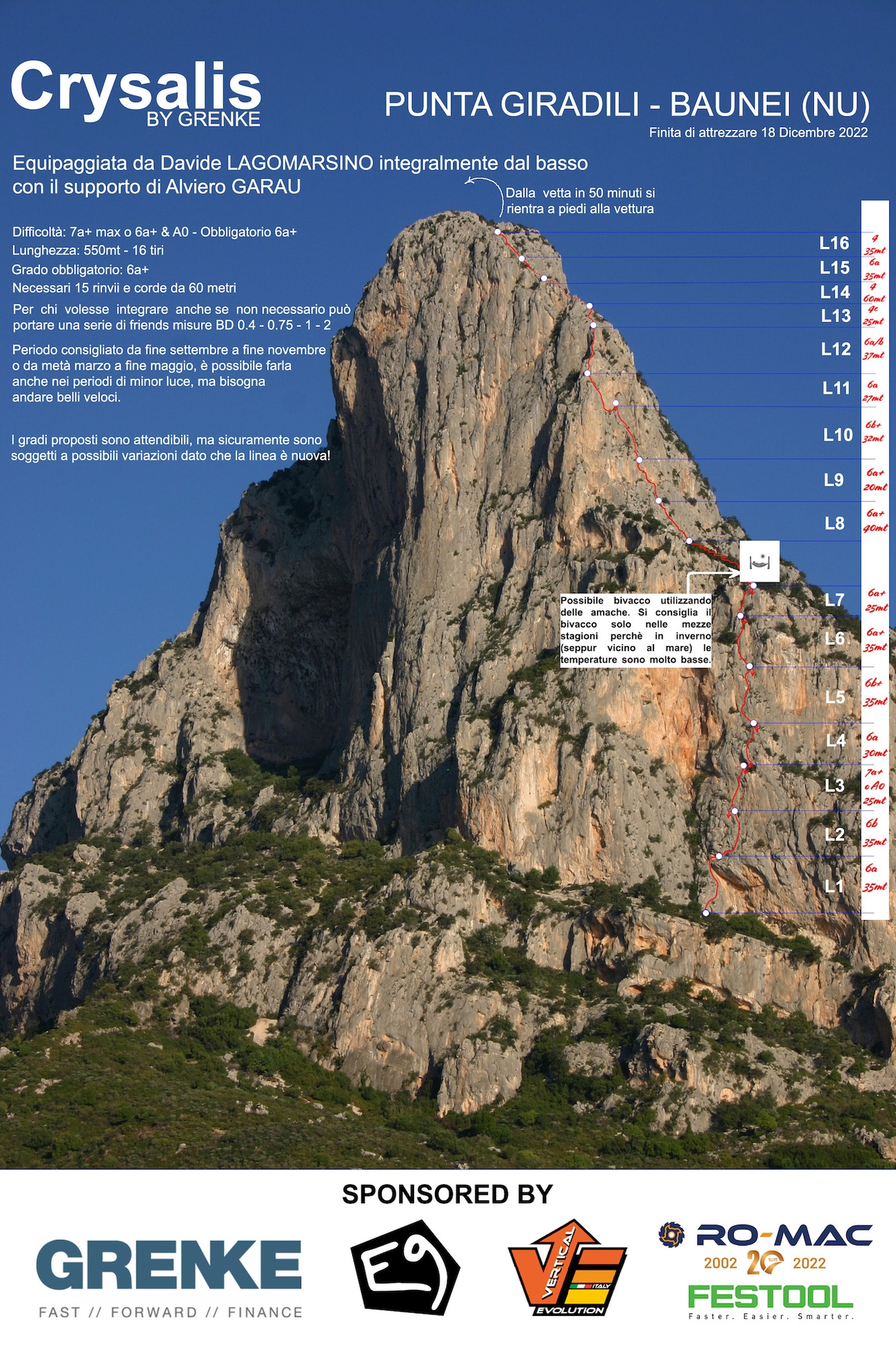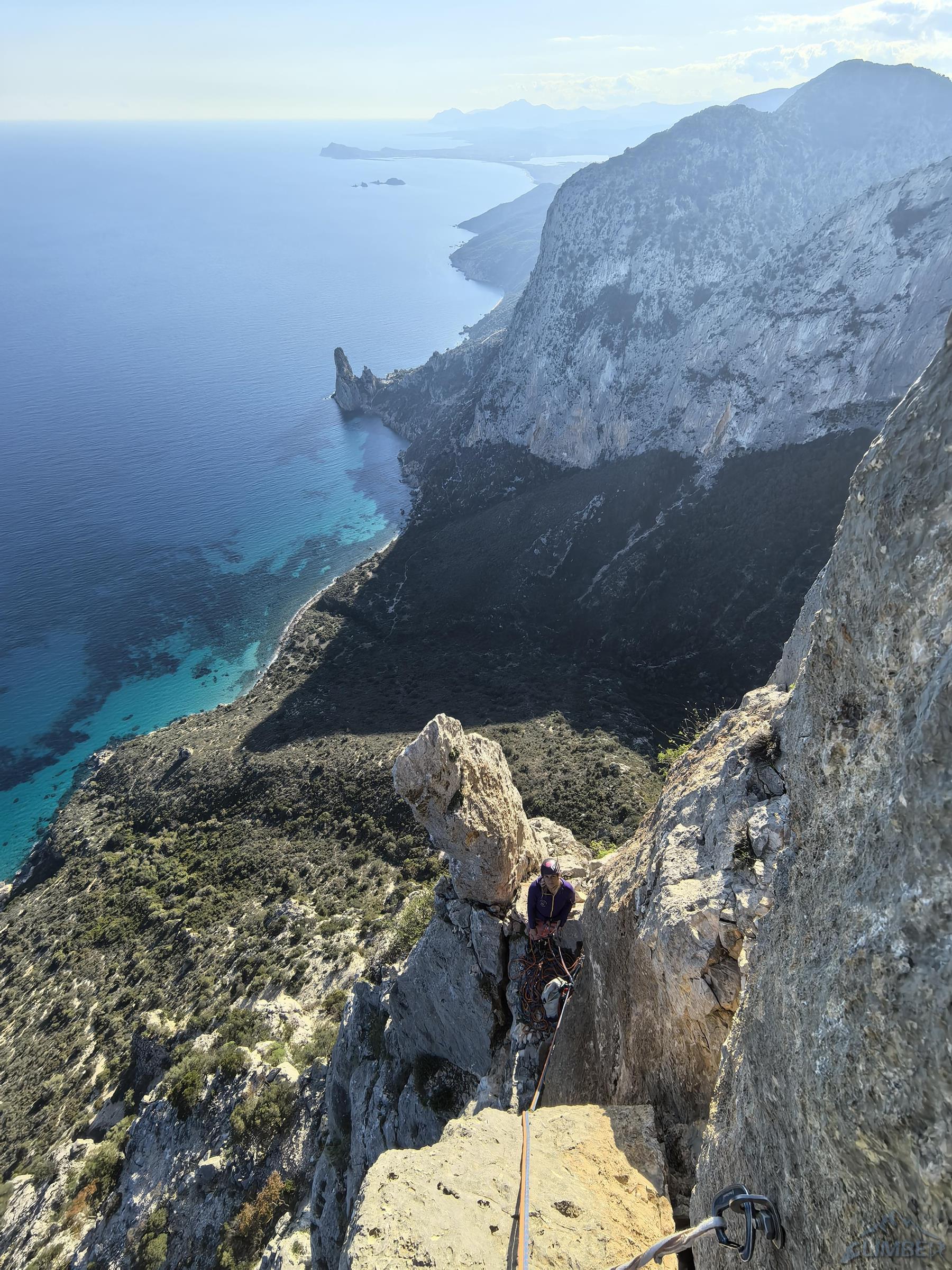 Podczas pobytu w rejonie Baunei nie mogło oczywiście zabraknąć wizyty na „Królowej Wybrzeża” czyli słynnej Punta Giradili. Po dwóch świetnych klasykach robionych w poprzednich latach (Mediterraneo 7a+ 240m niestety z A0 oraz Wolfgangu Güllichu 7a 390m) marzyła mi się podobno jeszcze piękniejsza Sette Anni di Solitudine (6c+ 390m). Z powodu dużego nagromadzenia trudności prowadzenie całości z niedoleczoną kontuzją nie wchodzi jednak w grę, a że nie dojeżdża z okolicy kolega na którego liczyłem 😉 decydujemy się na dużo przystępniejszą (jak wiadomo w górach nie jeden wyciąg decyduje o całości) Crysalis by Grenke (7a+ 550m/16 wyciągów).