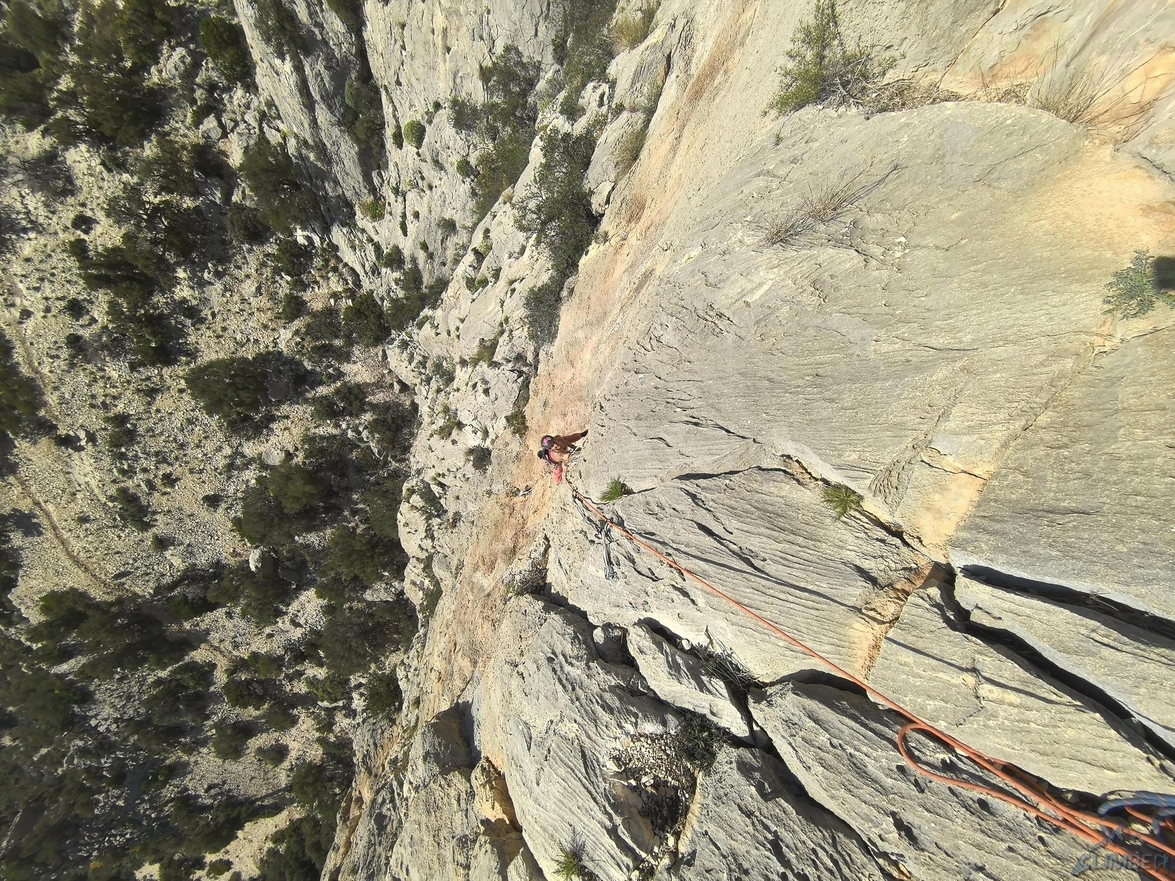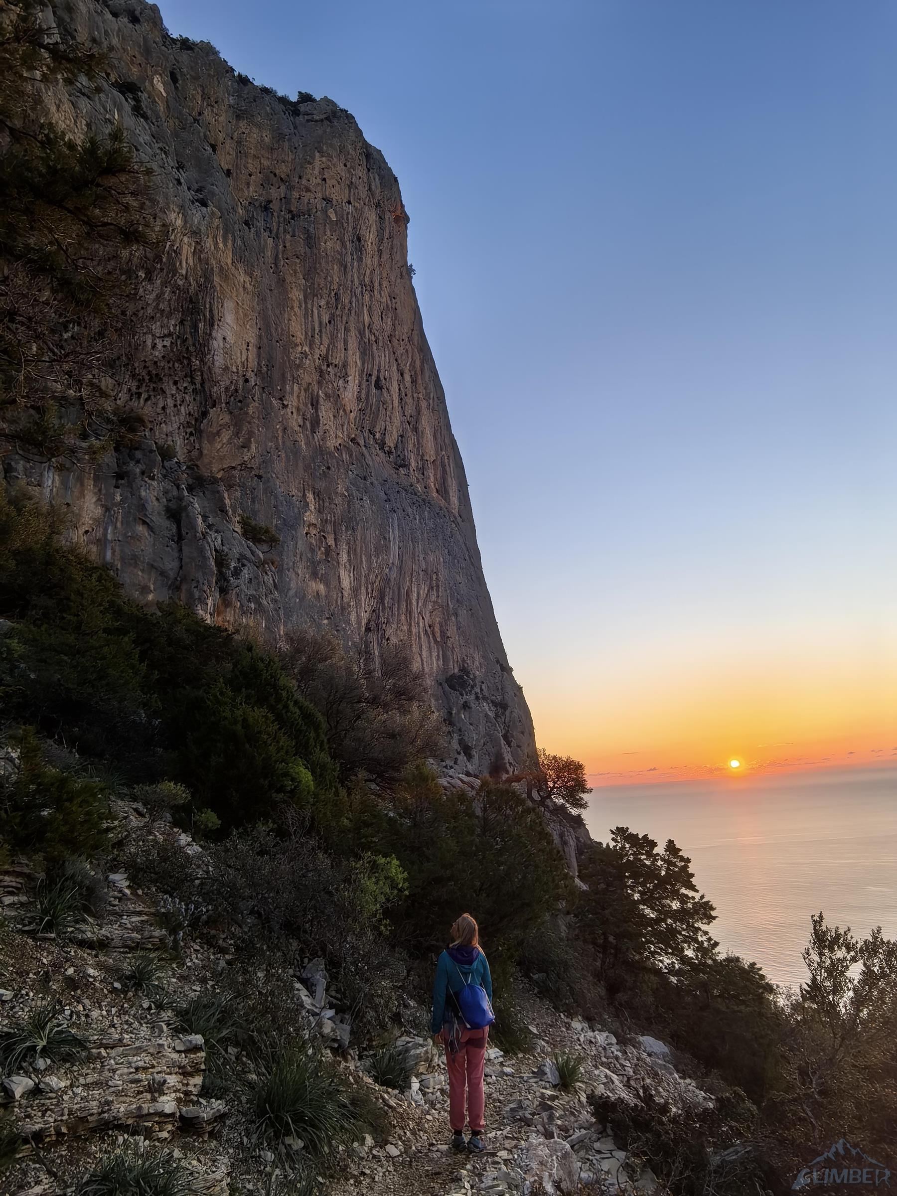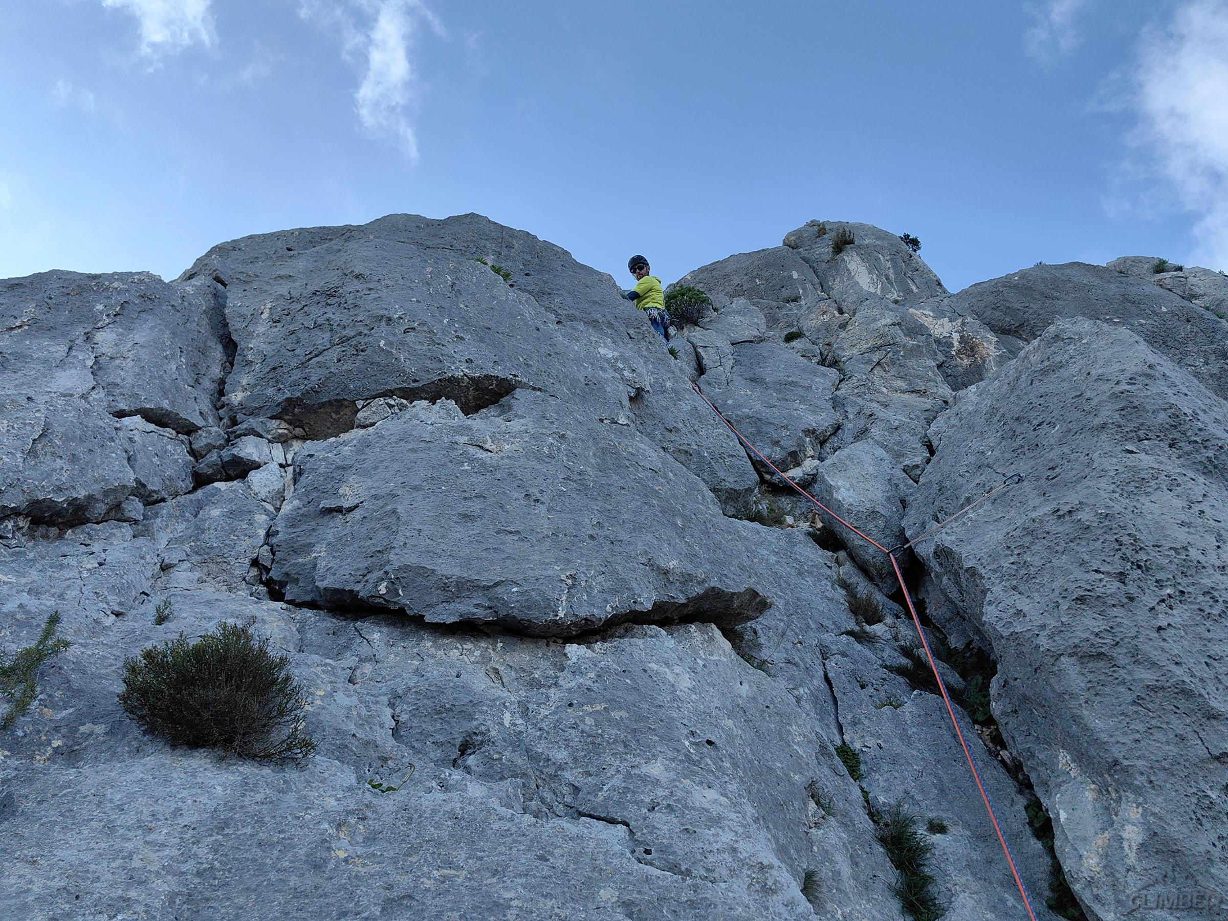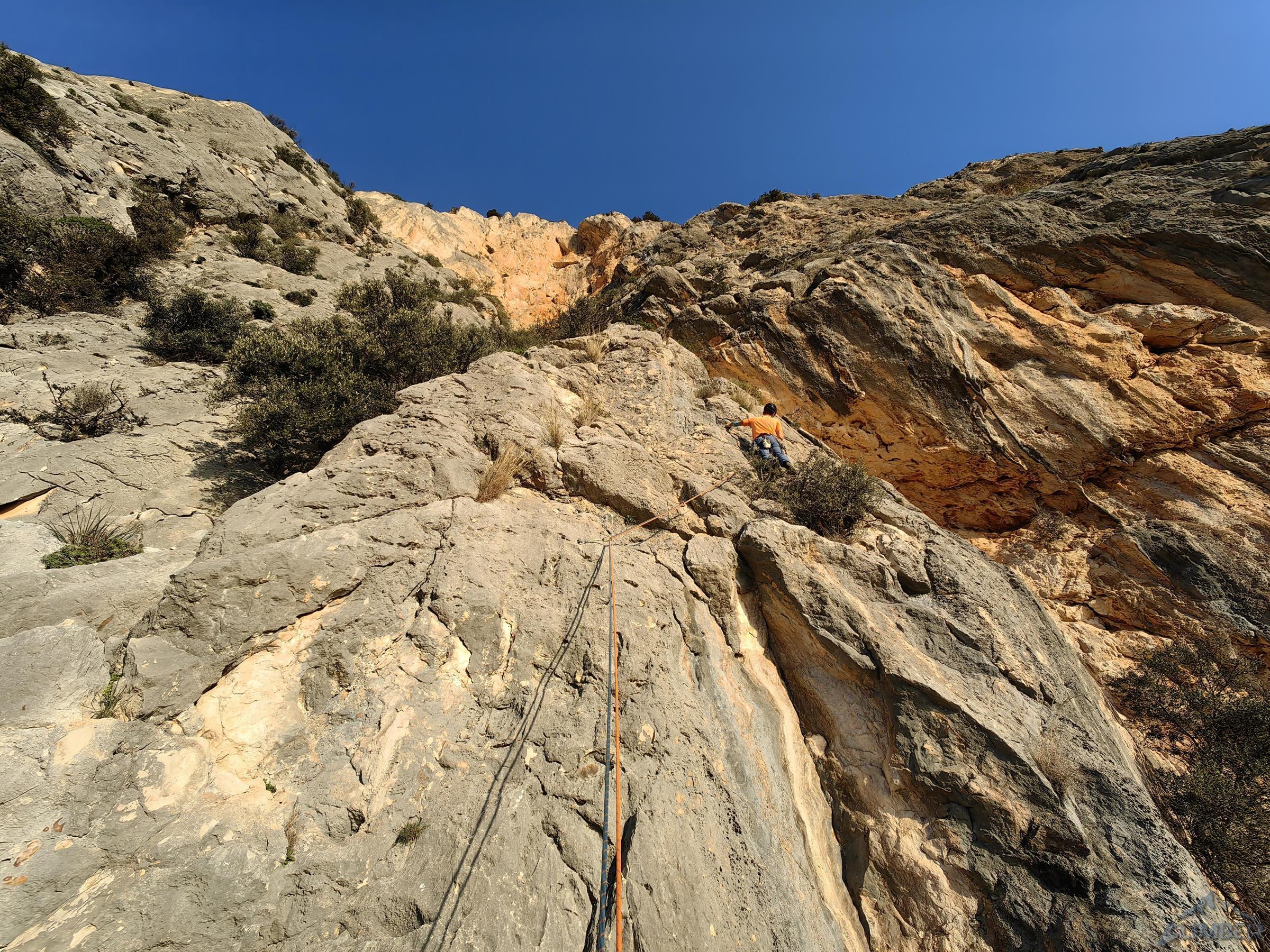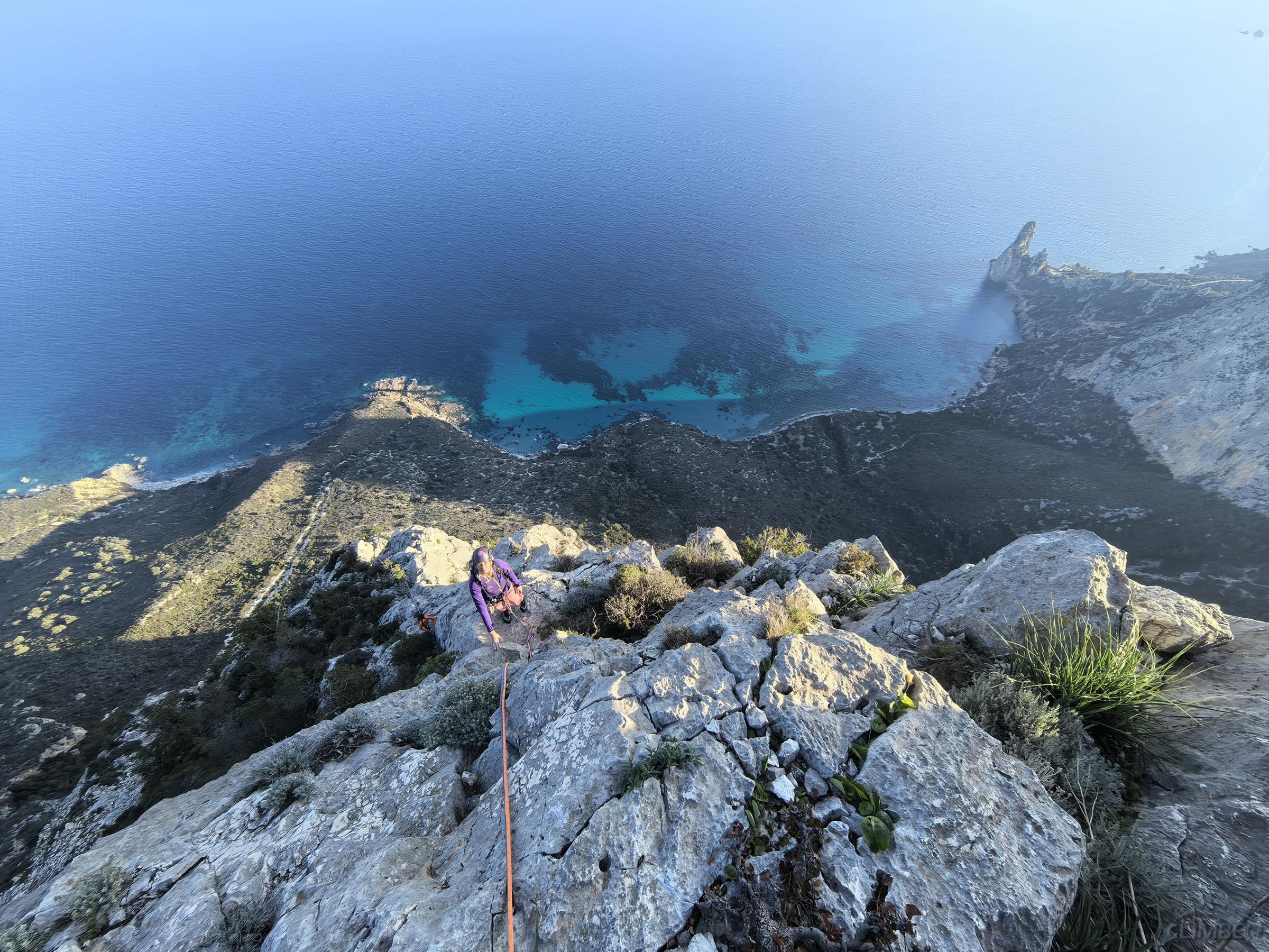 Podczas pobytu w rejonie Baunei nie mogło oczywiście zabraknąć wizyty na „Królowej Wybrzeża” czyli słynnej Punta Giradili. Po dwóch świetnych klasykach robionych w poprzednich latach (Mediterraneo 7a+ 240m niestety z A0 oraz Wolfgangu Güllichu 7a 390m) marzyła mi się podobno jeszcze piękniejsza Sette Anni di Solitudine (6c+ 390m). Z powodu dużego nagromadzenia trudności prowadzenie całości z niedoleczoną kontuzją nie wchodzi jednak w grę, a że nie dojeżdża z okolicy kolega na którego liczyłem 😉 decydujemy się na dużo przystępniejszą (jak wiadomo w górach nie jeden wyciąg decyduje o całości) Crysalis by Grenke (7a+ 550m/16 wyciągów).