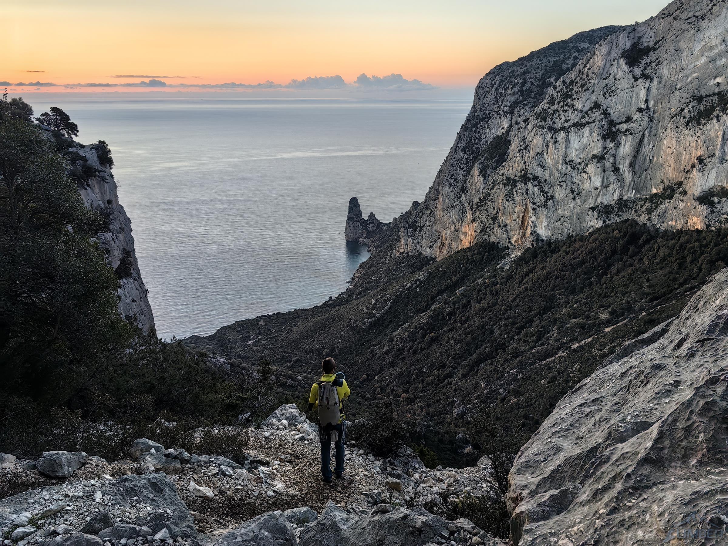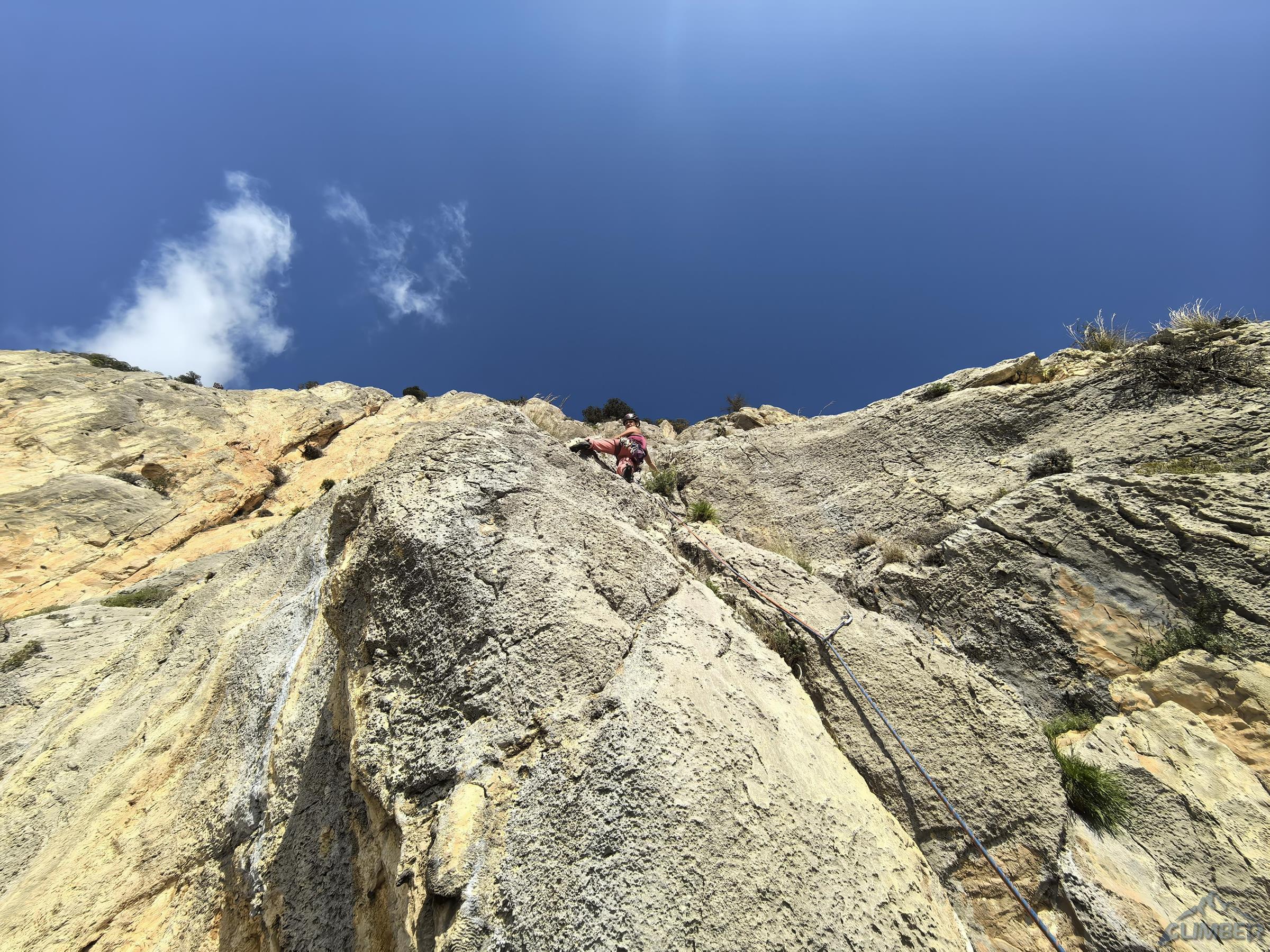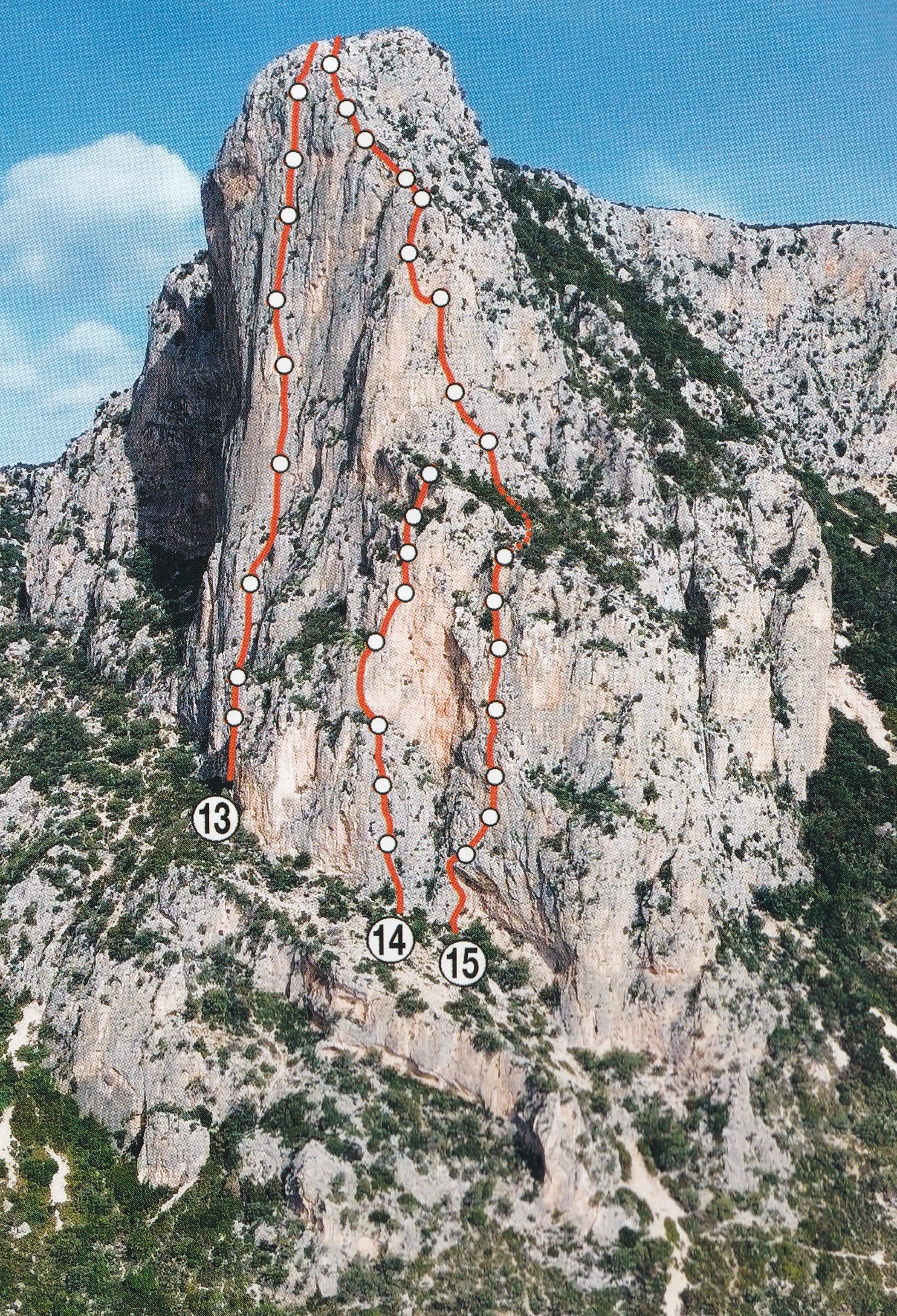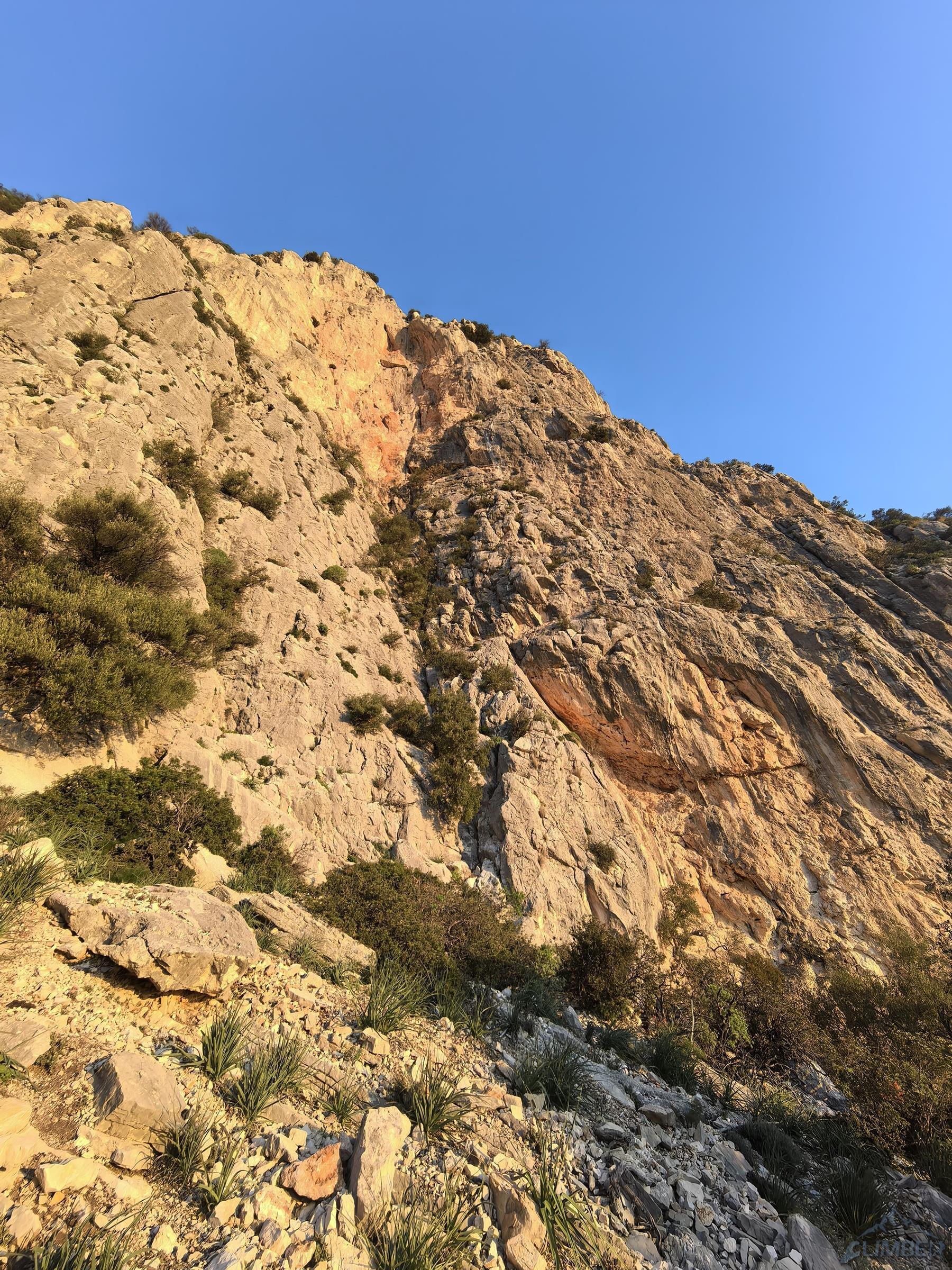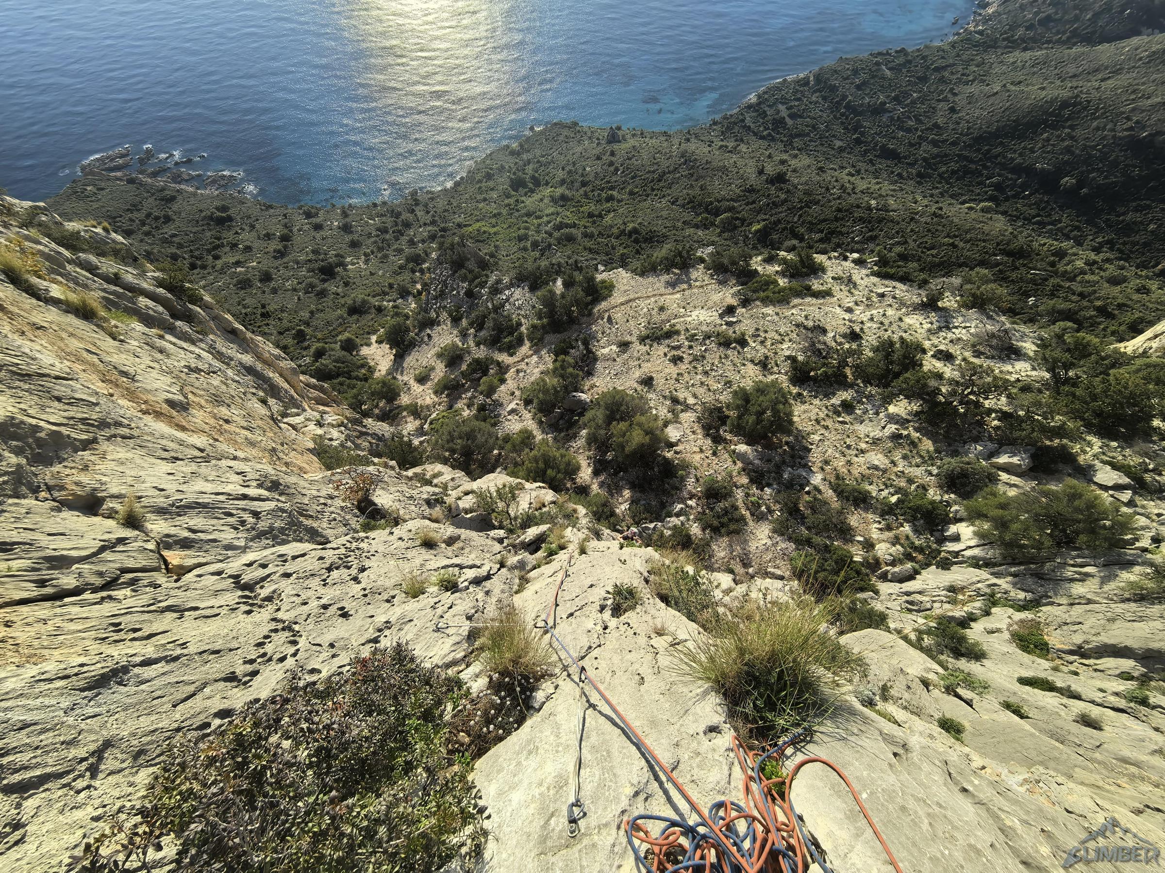 Podczas pobytu w rejonie Baunei nie mogło oczywiście zabraknąć wizyty na „Królowej Wybrzeża” czyli słynnej Punta Giradili. Po dwóch świetnych klasykach robionych w poprzednich latach (Mediterraneo 7a+ 240m niestety z A0 oraz Wolfgangu Güllichu 7a 390m) marzyła mi się podobno jeszcze piękniejsza Sette Anni di Solitudine (6c+ 390m). Z powodu dużego nagromadzenia trudności prowadzenie całości z niedoleczoną kontuzją nie wchodzi jednak w grę, a że nie dojeżdża z okolicy kolega na którego liczyłem 😉 decydujemy się na dużo przystępniejszą (jak wiadomo w górach nie jeden wyciąg decyduje o całości) Crysalis by Grenke (7a+ 550m/16 wyciągów).