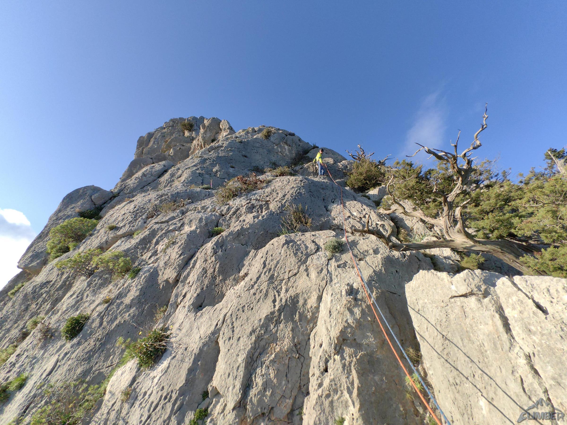 Jedenasty wyciąg (6a) zaczyna się trawersem z obniżeniem, po którym wspinamy się do góry piękną uklamioną rysą  i wychodzimy na widokowy balkonik z turniczką. Od tego miejsca wspinamy się już wzdłuż filara przechodzącego w grań – początkowo ładnym zacięciem (6a), potem żeberkiem. Na ostatnich czterech wyciągach spity umieszczone są tylko dla orientacji – idziemy od stanowiska do stanowiska terenem głównie czwórkowym, czasami nieco na siłę szukając trudności (jedna ścianka wg topo za 6a). Po zakończeniu wspinania ale jeszcze pod szczytem znajduje się zeszyt pamiątkowy – odnajdujemy swój stary wpis i robimy nowy 😊. Całość mimo moich powtórek w trudnościach poszła nam na tyle sprawnie, że kończymy po godzinie 15-tej więc spokojnie wyrabiamy się z powrotem do samochodu przed zachodem Słońca i jedziemy na zasłużoną pizzę.