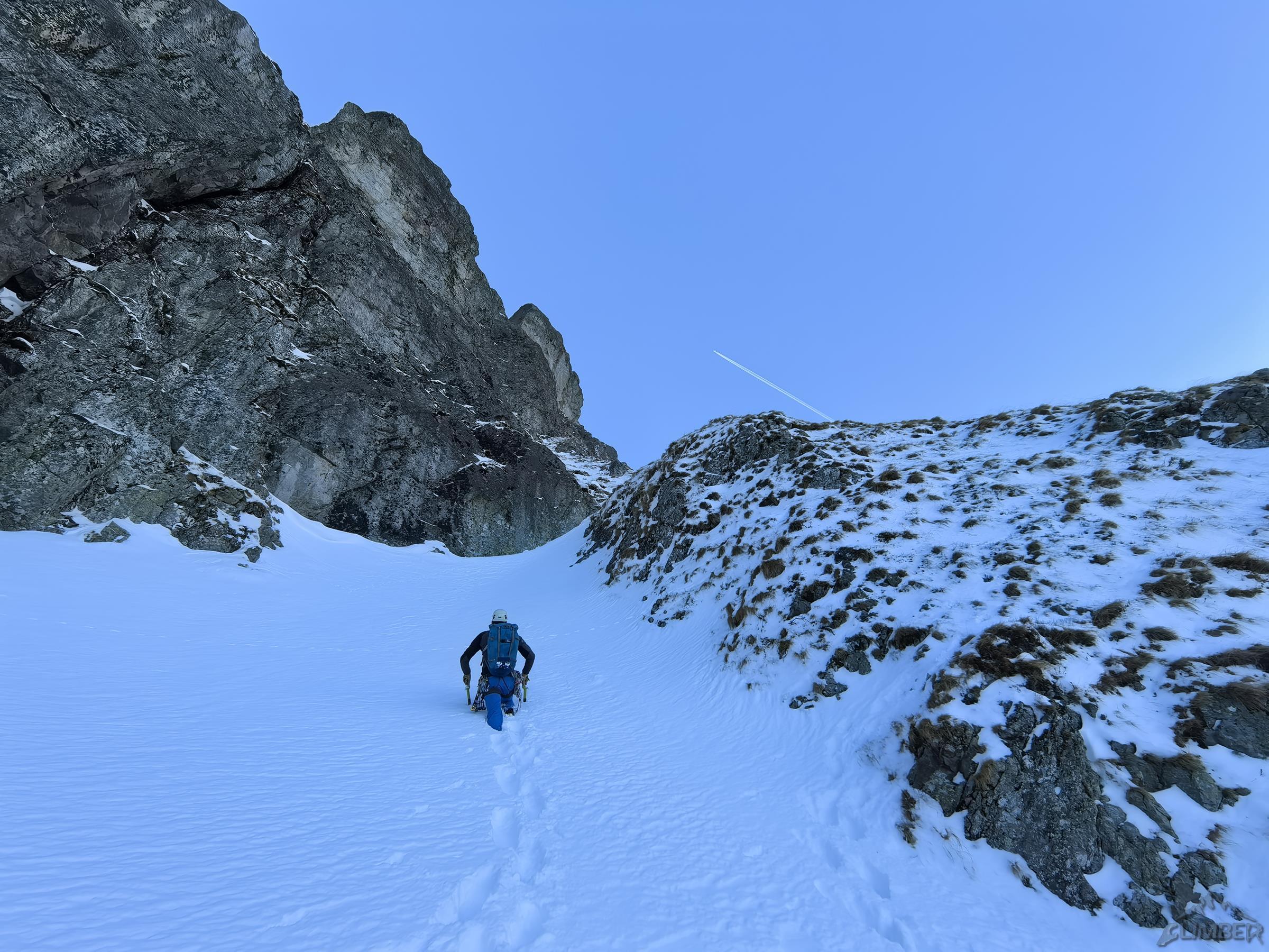 Po zejściu na wypłszczenie trawersujemy aż do żlebu którym schodzi się w zimie z Baraniej Przełęczy i dopiero wtedy kierujemy się w dół (do Butelki), odbijając za wcześnie dojdziemy do poderwanego żlebu zakończonego Zavojovym Lodospadem.