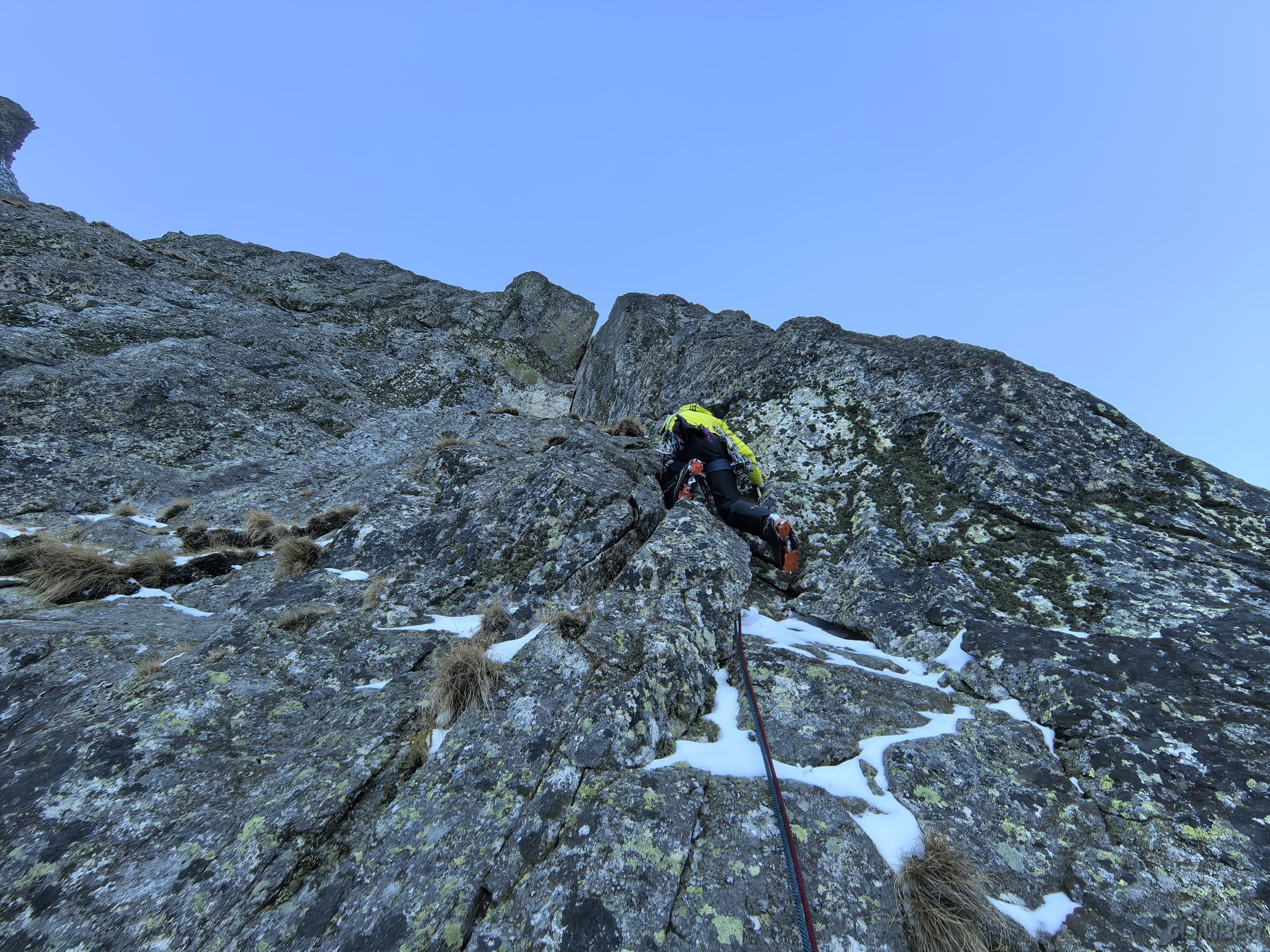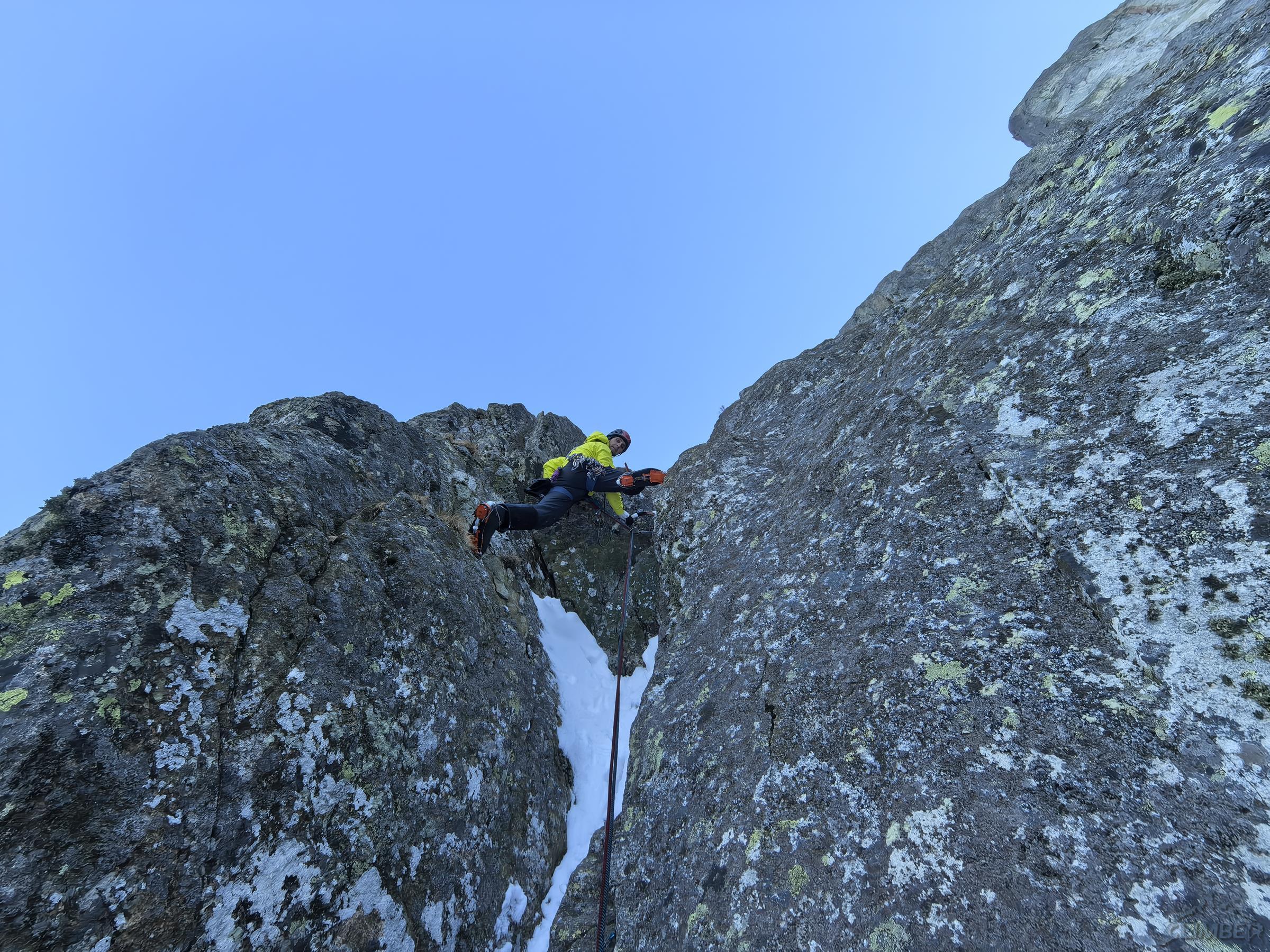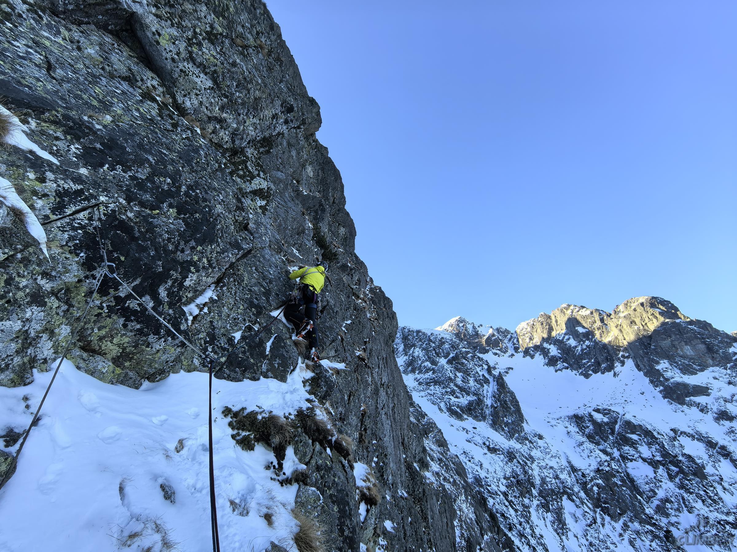 Po powrocie ze wspinania w ciepłym wapieniu na Sardynii ciężko przestawić się na tatrzańskie zimowe ściany, połowa stycznia to już jednak najwyższa pora 😊. Wraz Michałem i Szymonem wybieram się więc na weekend do Doliny Kieżmarskiej by schować się przed odwilżą w cieniu północnej ściany Małego Kieżmarskiego Szczytu, oferującej zaskakująco dobre warunki. Pierwszego dnia towarzyszę rozwspinanym już kolegom na drodze Elegancia (M7) na Wielkiej Złotej Kazalnicy. Oferuje ona całkiem sporo ładnego i zajmującego wspinania – po najbardziej wymagającym i ciągowym pierwszym wyciągu do przejścia mamy jeszcze dwa mocne, czysto drytoolowe odcinki oraz kilka łatwiejszych o mikstowym charakterze.